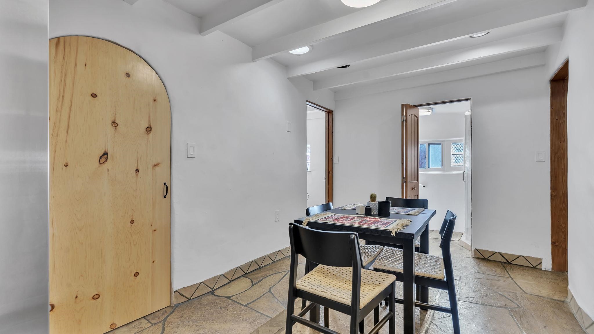 True Taos Charm on Montoya Street Near Taos Plaza ~ This authentic, beautifully remodeled adobe home is a downtown Taos masterpiece, blending historic character with modern luxury. Located just a short stroll from the Taos Plaza, this 1940s-era property features a main house with 3 bedrooms and 2 baths, plus a valuable detached upstairs studio apartment perfect for rental income or a private guest space. Inside the main home, the renovation is meticulous. High-end fixtures complement classic Southwestern style, including elegant oiled pine beams and corbels on the ceilings, and flagstone and wood-inspired tile floors. The kitchen is a chefs desire with stainless steel appliances, thoughtful space, and ample storage. The central living space with extra high ceilings is where you make year-round memories with family and friends. Spacious bedrooms are bathed in natural sunlight, and two offer direct access to the lush, shaded outdoor patios. The home sits on a large, landscaped lot that borders Couse Pasture, providing a fenced backyard ideal for pets to roam and children to play. These spaces, along with the thoughtful layout of the home are designed for entertaining guest for all the holidays and Park Concerts. At this location you are also close to the chic and newly restored Hotel Willa where you will experience some of the finest hospitality and dining in the Southwest. This property is a rare "Old Taos" gem, offering the ultimate walkability and privacy. Owning a home here means immersing yourself in the many special features of Taos, New Mexico. Nestled against the dramatic backdrop of the Sangre de Cristo Mountains, Taos is renowned for its vibrant art scene, with world-class galleries and museums around every corner. It's a haven for outdoor enthusiasts, offering year-round recreation from skiing and snowboarding at Taos Ski Valley to hiking, mountain biking, hunting, fishing, and whitewater rafting on the Rio Grande. The town is rich with history and culture, and offers a unique blend of Native American, Hispanic, and Anglo traditions. In Taos you'll find a community that values both the high desert's serene beauty and a lively, independent spirit. At this home you will find the comfort and peace you've been looking for in our majestic high desert