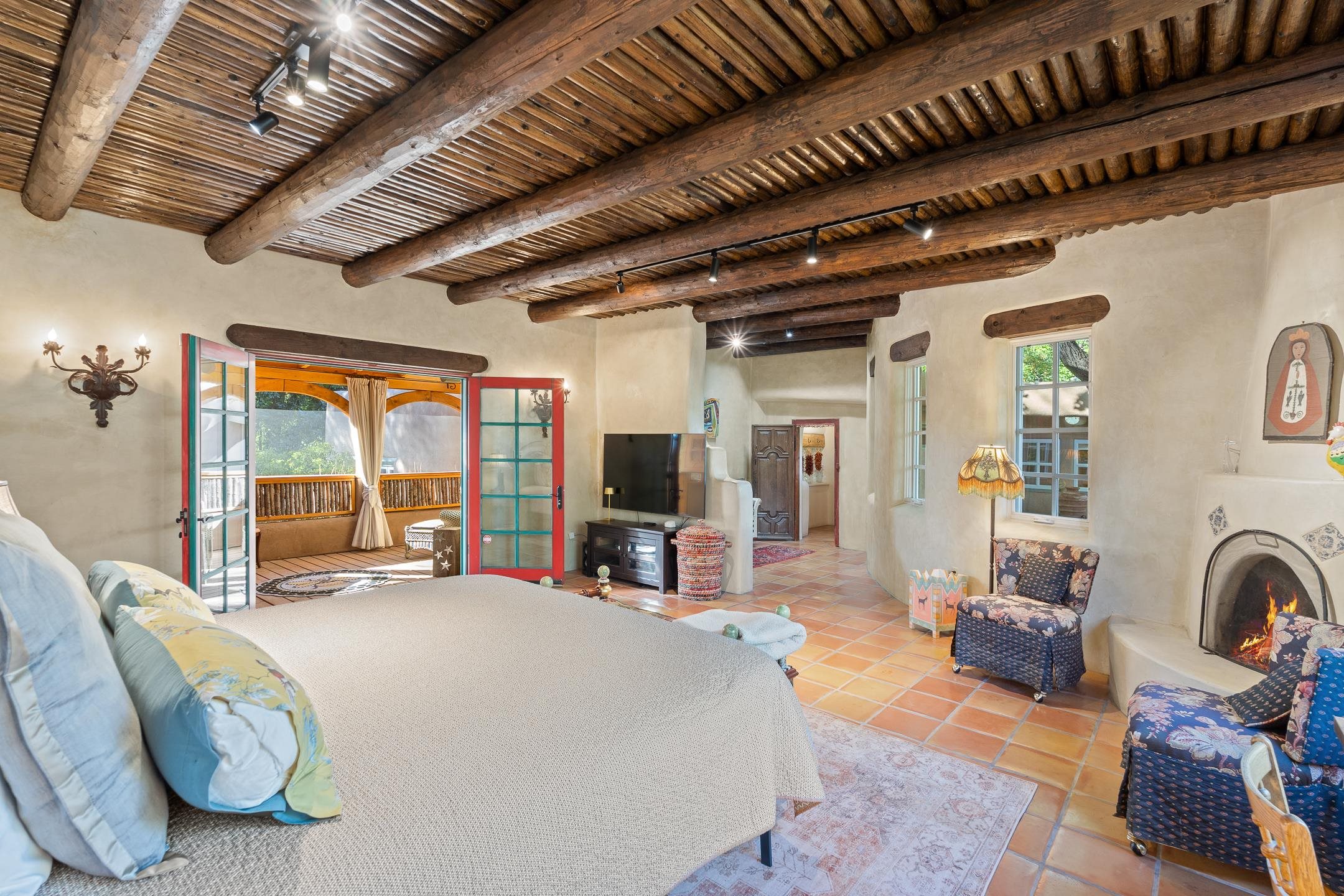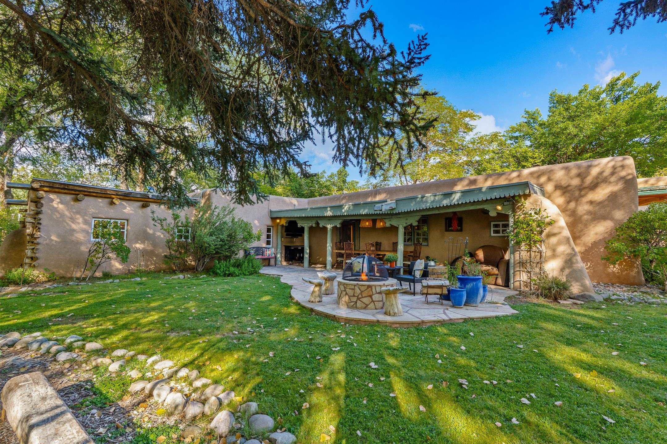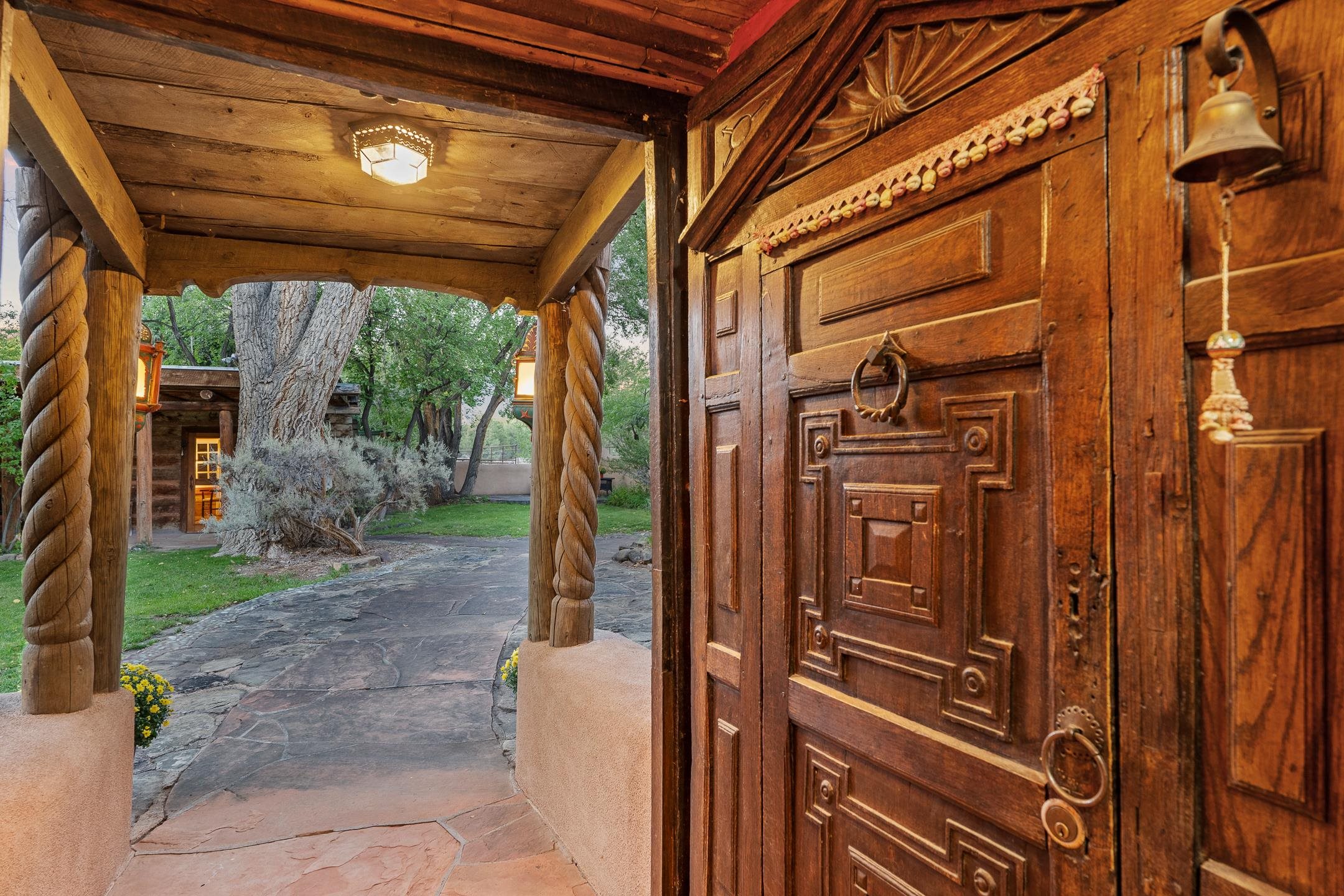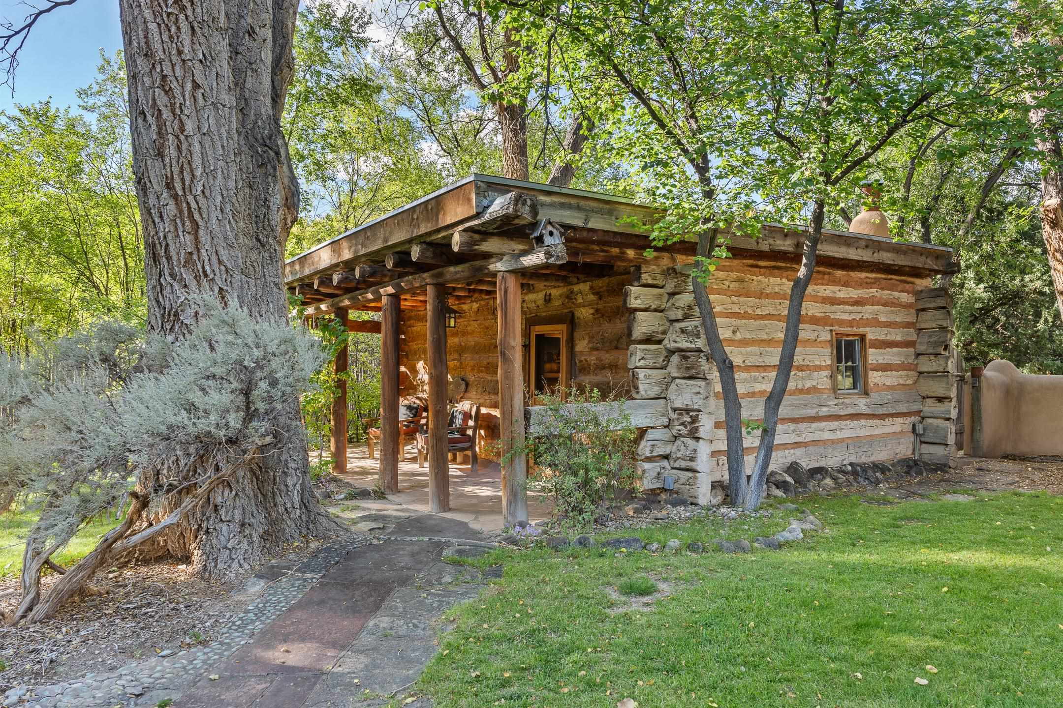 Historic John Young-Hunter Home & Artist’s Compound, Taos, New Mexico Private and secluded yet just minutes from town, this rare historic compound is one of Taos’ true treasures. Set on 5.17 serene acres with towering shade trees, inviting courtyards, and lush gardens, the property includes a gracious main residence and two guest cottages—a sanctuary for those who value heritage, artistry, and timeless New Mexico beauty. The acreage is fully fenced and thoughtfully designed to welcome four-legged companions—bring your horses, goats, mini-donkeys, or dogs. A charming 3-stall barn with walkouts makes the property ideal for equestrian or hobby-farm living. The John Young-Hunter House began in the early 1880's as simple adobe rooms and a log cabin, expanded and lived in over two centuries by a succession of owners, most notably John Young-Hunter, the celebrated Scottish portrait artist who called Taos home for more than fifty years. Part of the legendary circle of artists, writers, and visionaries drawn to Taos beginning in the mid-19th century, Young-Hunter was a close friend of Mabel Dodge and Tony Luhan, who helped him find this two-hundred-year-old adobe soon after his arrival in 1917. Young-Hunter transformed the property with the help of fellow artists: Nicolai Fechin carved decorative doors, lintels, and columns; Leon Gaspard designed and forged the distinctive ironwork and gates; and Henry Mercer, founder of the Moravian Pottery in Pennsylvania, contributed prototype tiles that are still visible today. Young-Hunter himself added painted details, including the Scottish thistle and family coat of arms on the west portal. Fully restored to provide modern amenities while retaining its historic soul, the home offers rich character and artistic provenance rarely found in today’s market. The small south side studio, believed to be Young-Hunter’s original workspace, has been sensitively modernized. Historic estates of this significance are seldom offered for sale. This is a remarkable opportunity for the discerning buyer seeking a home deeply woven into the artistic legacy of Taos—a cabin built in approximately 1850. NOTE: Fires in fireplaces and outdoor fire pits are virtually staged. Main House: https://my.matterport.com/show/?m=Sy6j4ZYbcSK Cabin: https://my.matterport.com/show/?m=HZqao1Bo1hL Casita: https://my.matterport.com/show/?m=NnDkGxeumMv