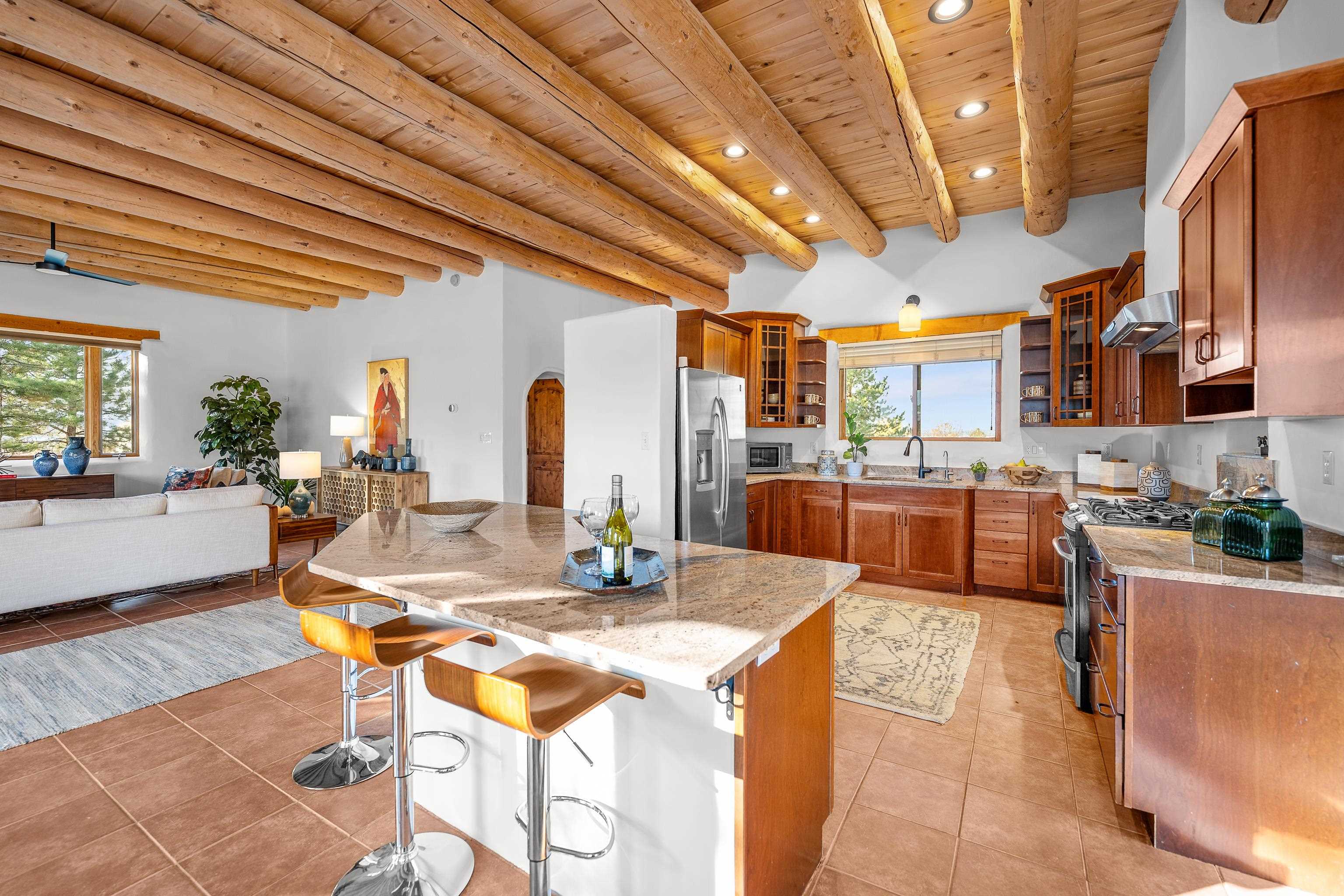 Nestled between Taos Mountain and the sweeping mesa, this inviting adobe-style home blends classic Northern New Mexico craftsmanship with modern comfort. Viga beam ceilings, Saltillo tile floors, and plaster walls create a warm, grounded atmosphere throughout the light-filled interior. The open-concept living area features a southwestern-style fireplace and picture windows that frame stunning mountain views, while the adjoining kitchen offers granite countertops, stainless steel appliances, and generous workspace for everyday living or entertaining. Two spacious bedroom suites—one upstairs, one down—provide privacy and flexibility for guests, remote work, or multi-generational living. The third bedroom and full bath complete the thoughtful layout. Step out to the covered patio or upper deck to watch the sunrise over Taos Mountain and set across the high desert sky. The fenced acre includes mature trees, open space for gardens or pets, and the security of a private well and acequia water rights. Located just a mile from Arroyo Seco’s cafés and market, and fifteen minutes from Taos Ski Valley or the Taos Plaza, this property offers both serenity and convenience—an authentic Northern New Mexico retreat built to stand the test of time.