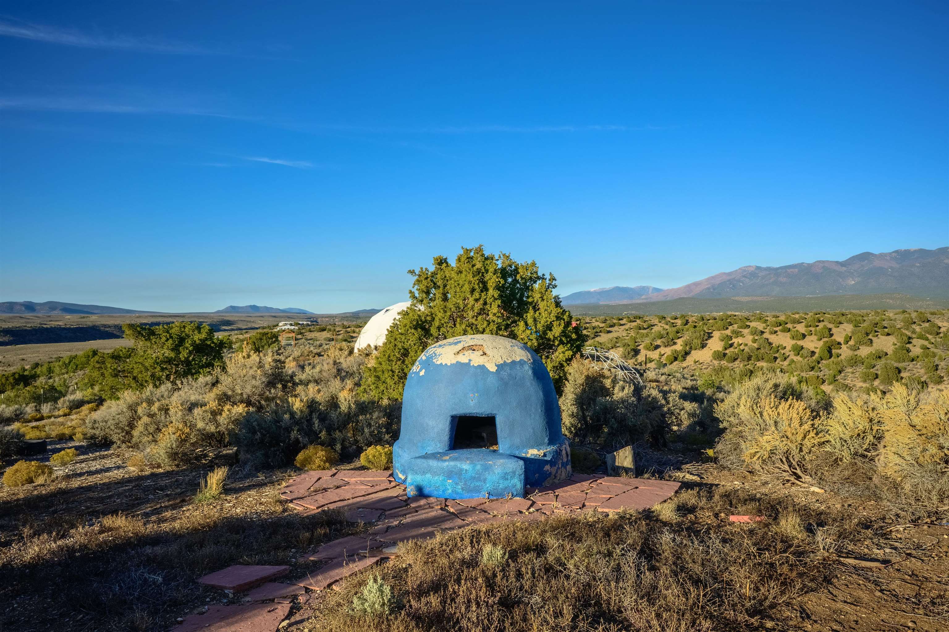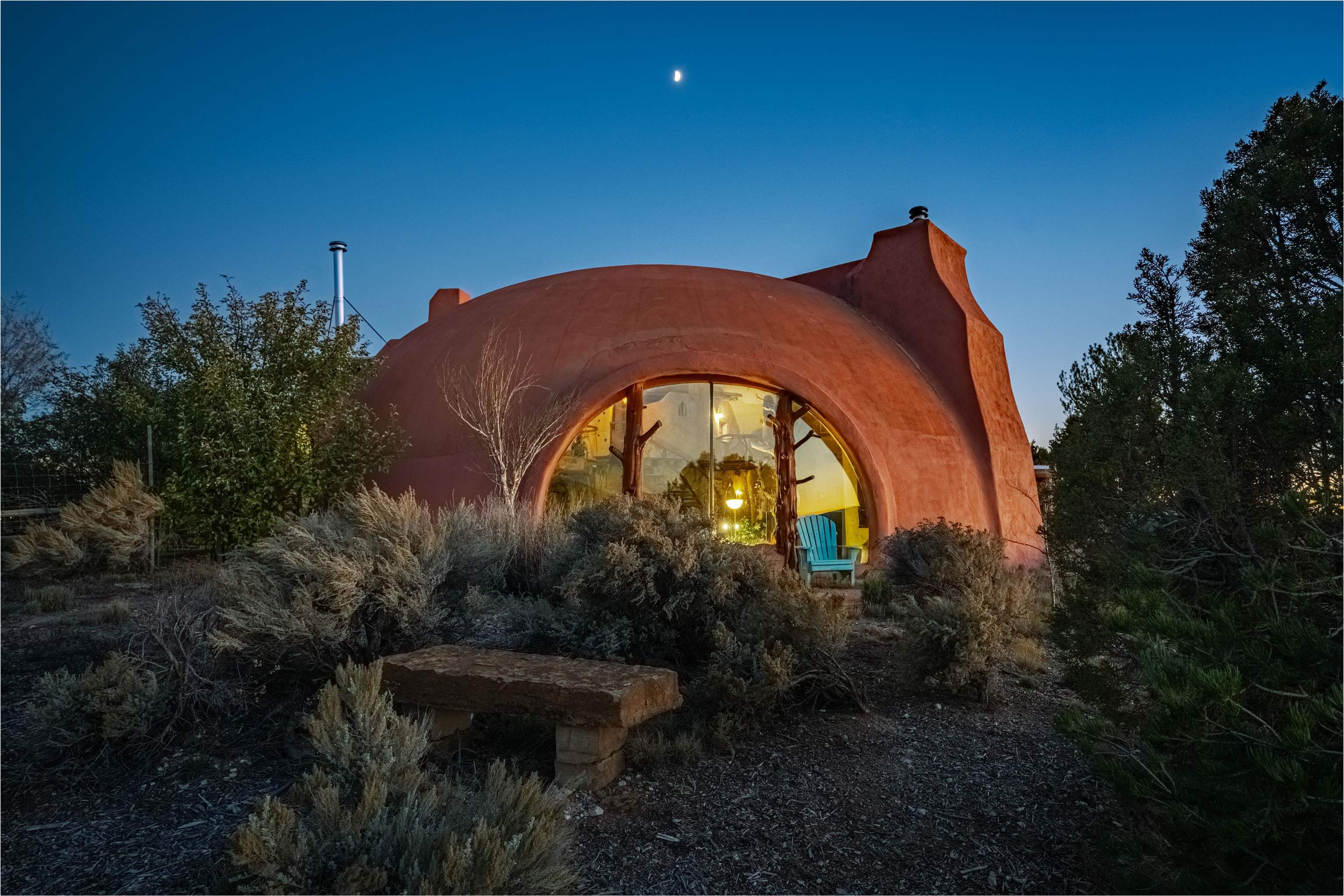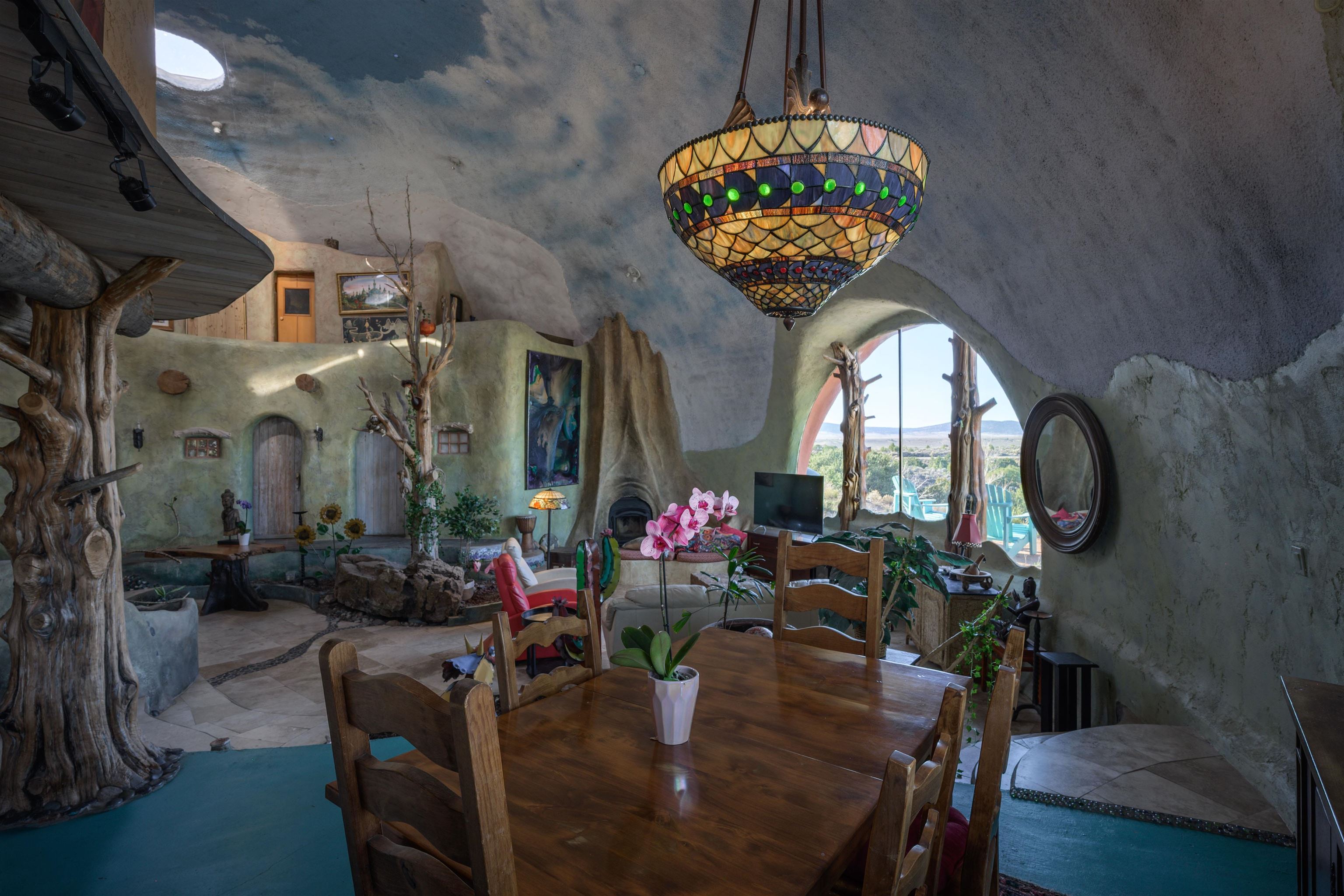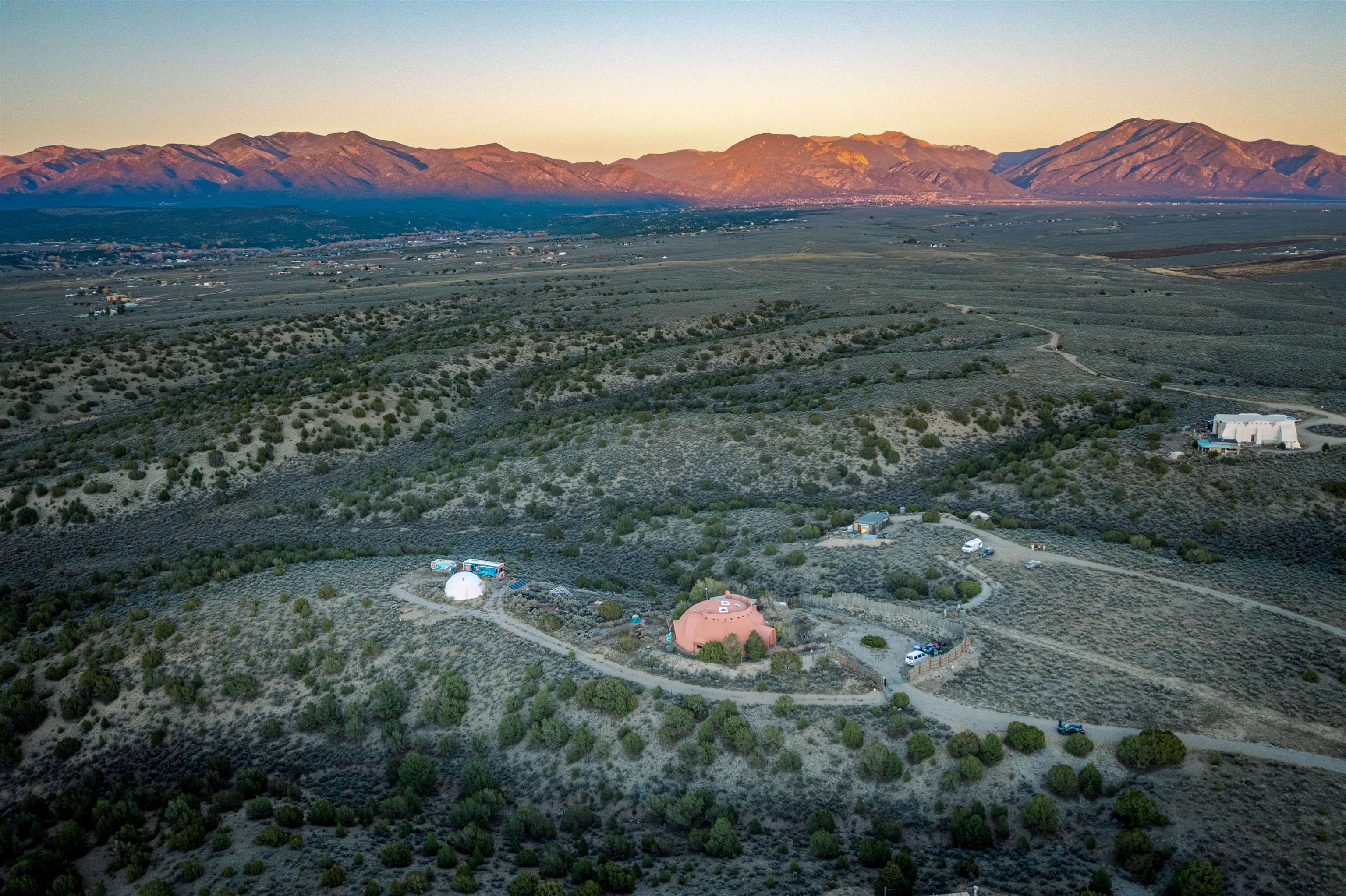 A Dreamy & Wondrous Masterpiece in Taos, New Mexico ~ Perched on five-plus pristine and private high-desert acres at the end of Tune Drive, you will discover "The Dreaming Dome," a dreamy and wondrous architectural masterpiece. Truly whimsical and delightfully outlandish in all the best ways, this structure—as featured on HGTV and in Parade Magazine as "The Most Beautiful House in America"—is more of a sculpture than your standard residence. Inspired by the rainforests of Costa Rica and the New Mexico alpine high-desert, this sustainable, monolithic designed dome includes a yoga hut in the backyard, engulfed by the most stunning views the region has to offer. Upon stepping inside this architectural wonder, you are greeted by a visual dreamland defined by 35-foot ceilings, hand-finished adobe-style walls in rich earth tones, hand-carved doors, travertine tile, luxurious stained-glass chandeliers, and high-end CUSTOM finish-work throughout. The spacious interior features vibrant mosaic paths, hand-painted murals, cedar trunk columns with hanging monkeys, toucans, and sloths, beside a romantic mystic tree wood-burning fireplace in the den with a black river rock bancito, and a dramatic painted sky ceiling flooded with circular skylights. The extra-large, half-moon juniper-framed window is as special as can be, offering equally incredible views and providing natural warmth and light from Mother Sun to compliment the radiant heated floors. The functional and stylish kitchen, just beyond the pond (now an atrium), includes Taos turquoise floors, soft green cabinets with marble countertops embedded with stainless steel appliances, a central island bar, beneath the traditional vigas beam ceiling. The adjacent dining room comfortably fits the family and offers another charming gathering area. The home provides ample and elegant space, possessing three distinctive bedrooms with three and a half eclectic bathrooms, including a private second-story primary ensuite straight out of a Disney movie, complete with a fireplace, and accessed by a dazzling sculpted vine staircase that leads up through your bedroom to a walk-in shower and access to a private hot tub deck—perfect for stargazing under the big NM sky. Outside, you will enjoy all of your time taking in the Land of Enchantment, tending to the garden under the cottonwood trees, and entertaining and bewildering your guests en su casa. Some of life's sweetest memories will be created here, while kids and furry friends roam freely in one of the fenced yards, accessible through a convenient double-doggie-door. Fresh H2O from your own 900-foot private well from the aquifer below is a major plus for day-to-day living, providing some of the best-tasting water you will find. As for the location, it is simply unbeatable for adventure and relaxation, situated close to the Rio Grande River, near natural hot springs, a jaunt from Taos Airport, and not far from the Historic Taos Plaza, world-class skiing and snowboarding at Taos Ski Valley, and endless hiking, biking, fishing, and bird watching trails. Even the wildlife will find their way to this magical wonderland while you lead a yoga class or mold pottery in the Yoga Dome, make bread in the blue horno, drink your morning coffee or evening wine, and experience the sweetest sunsets on our planet; and don't be surprised if an occasional hot air balloon emerges from the Gorge during a dreamy sunrise. This is custom luxury, eco-friendly, and fantasy, while submerged in nature, right here in Taos, New Mexico. Does it get any better? The answer very well might be no, so don't waste any time making this wonder of Taos, New Mexico your very own Reality.