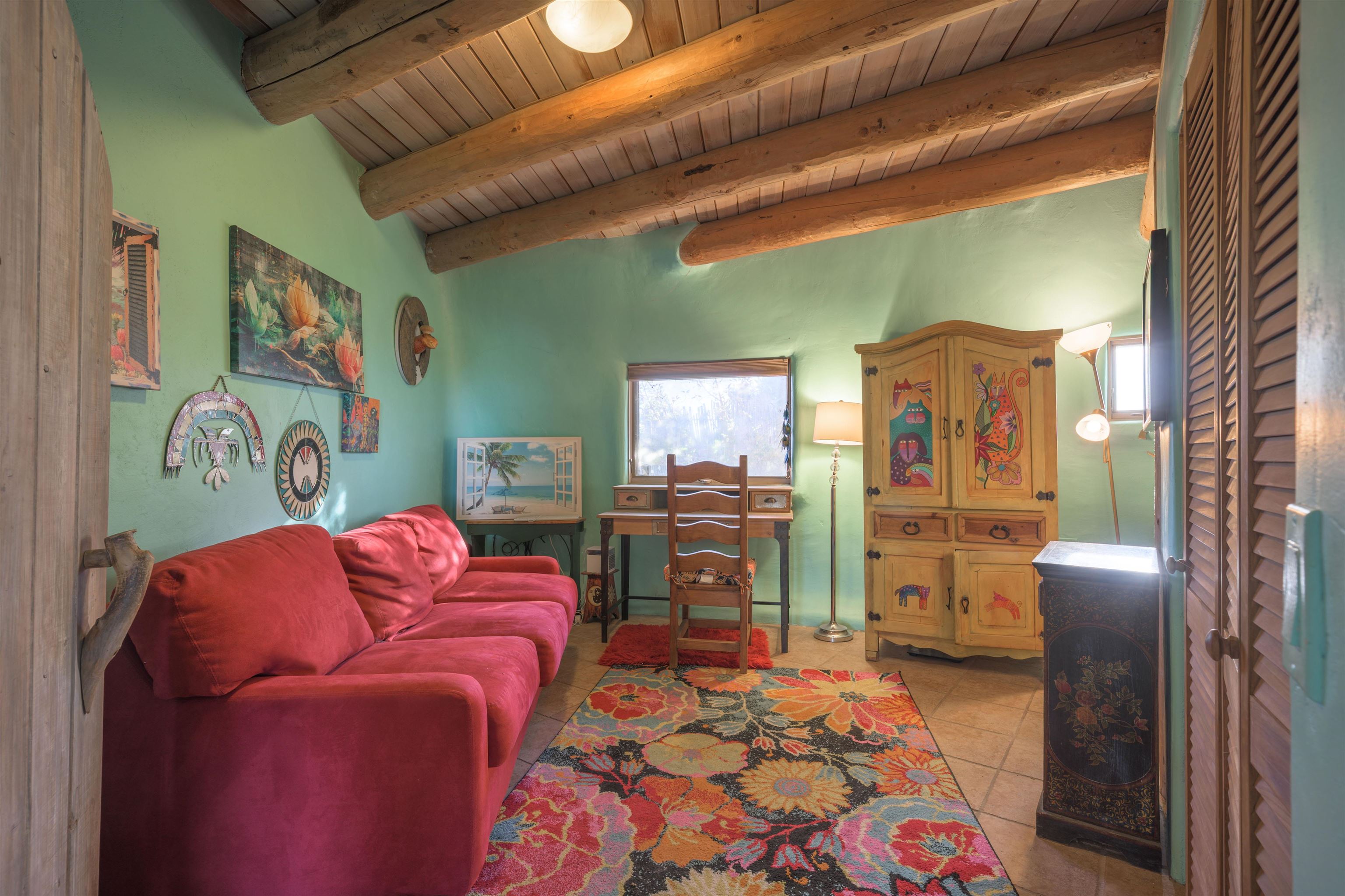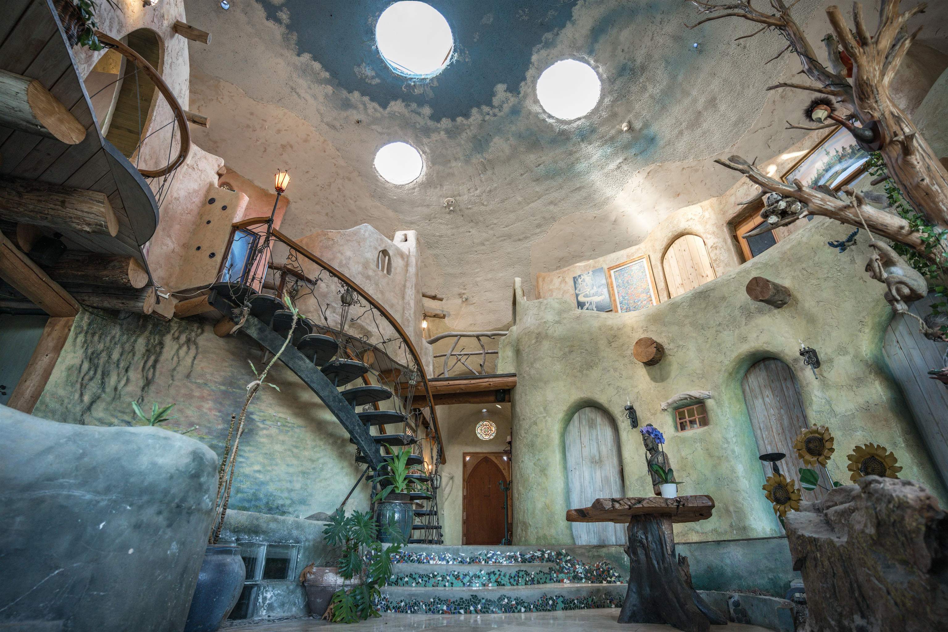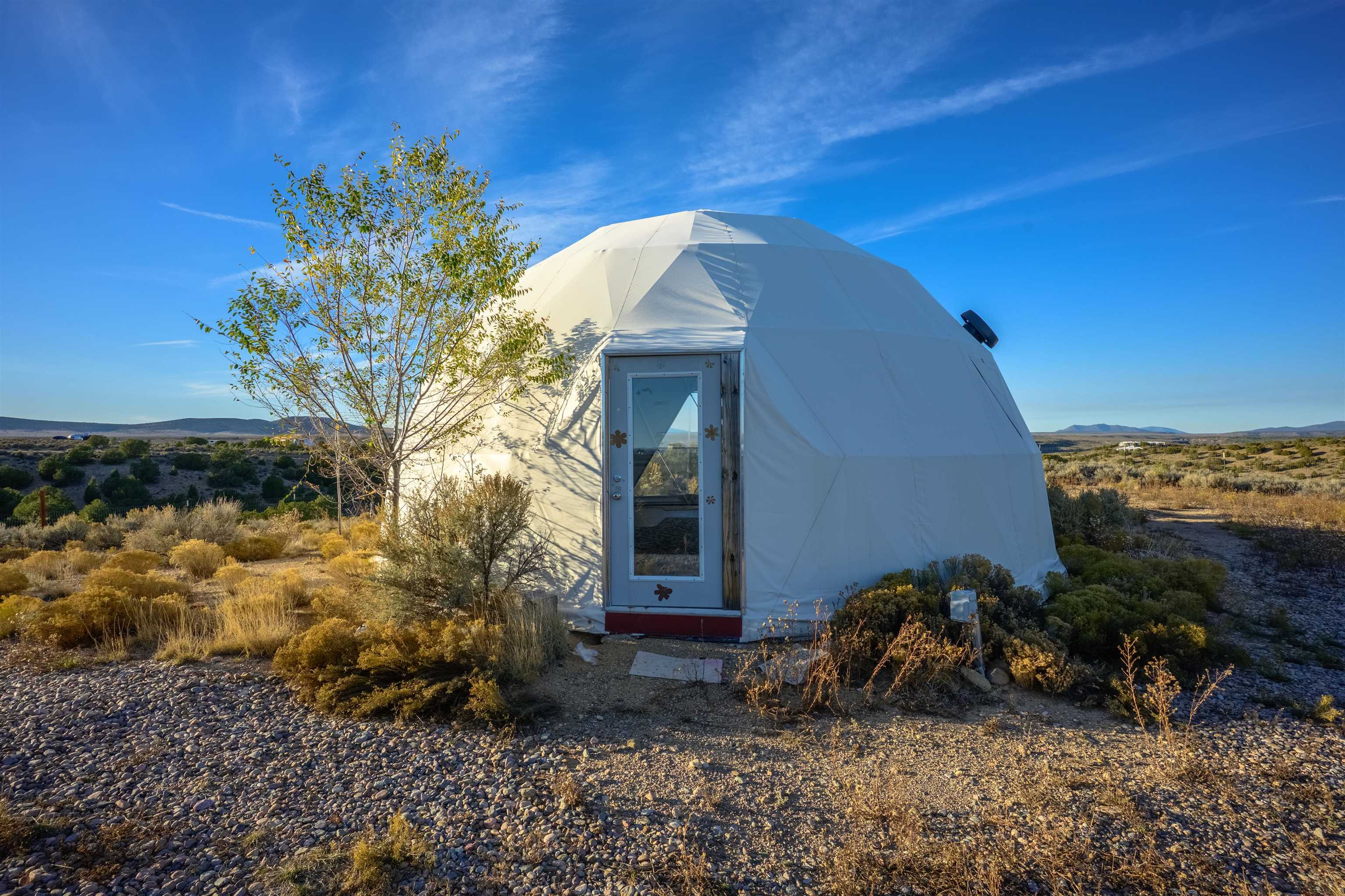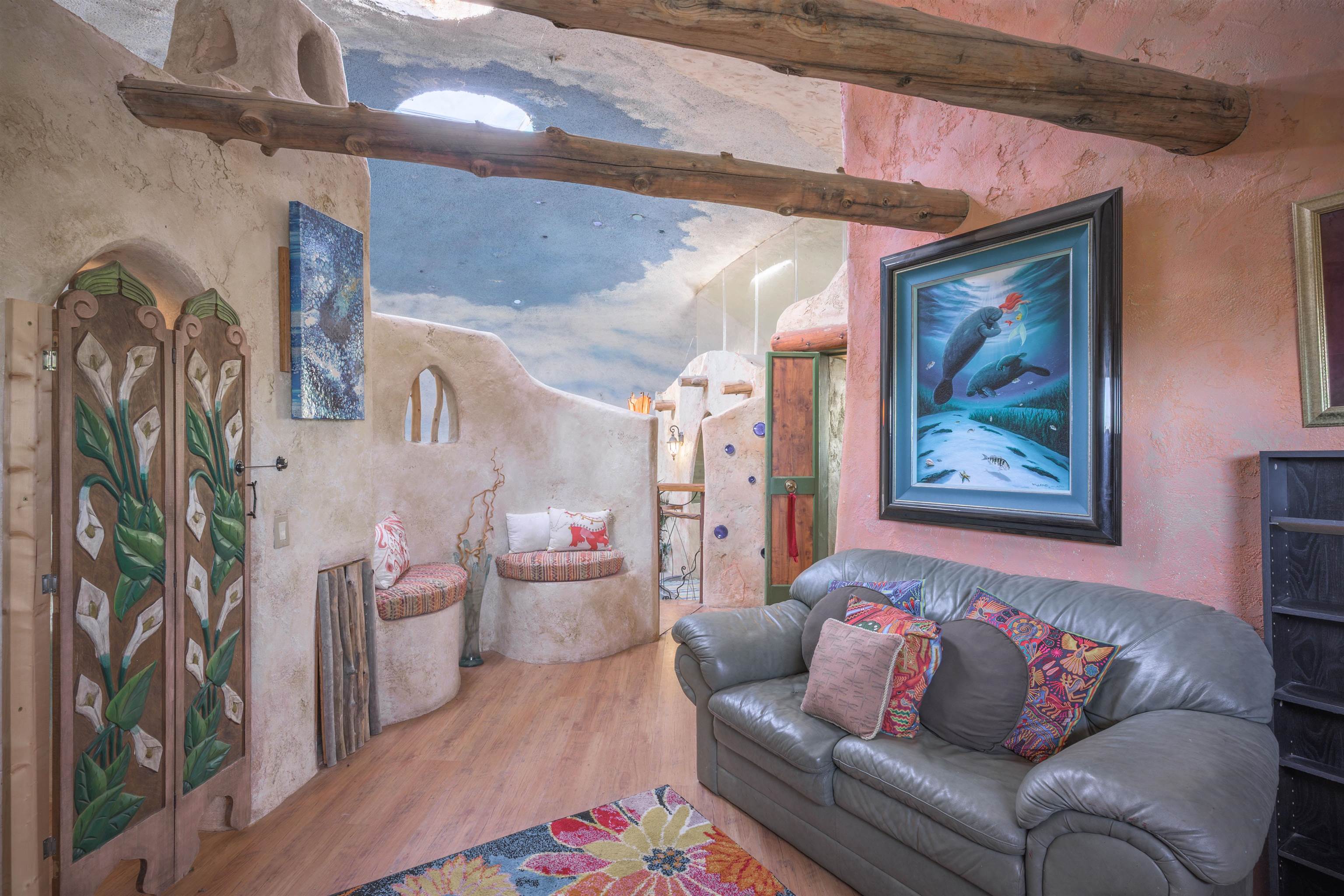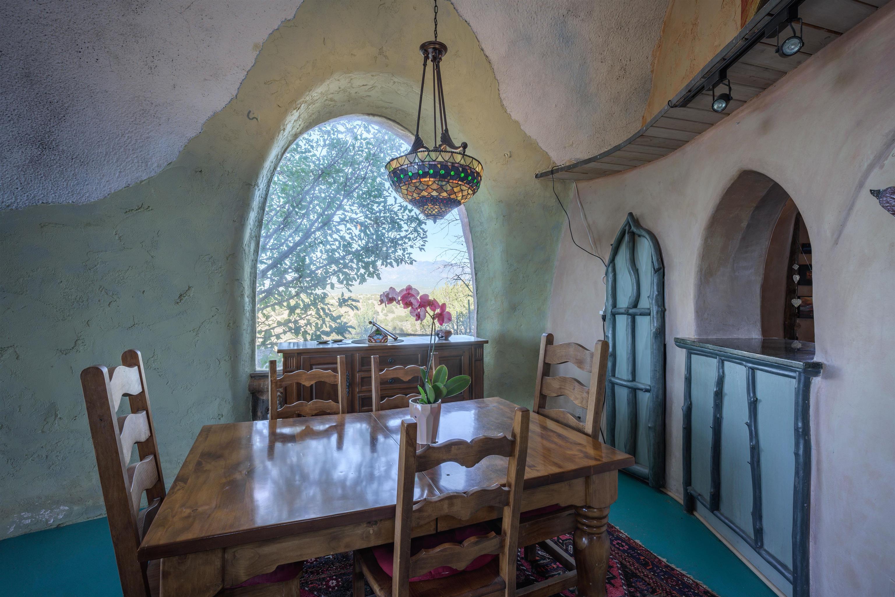 A Dreamy & Wondrous Masterpiece in Taos, New Mexico ~ Perched on five-plus pristine and private high-desert acres at the end of Tune Drive, you will discover "The Dreaming Dome," a dreamy and wondrous architectural masterpiece. Truly whimsical and delightfully outlandish in all the best ways, this structure—as featured on HGTV and in Parade Magazine as "The Most Beautiful House in America"—is more of a sculpture than your standard residence. Inspired by the rainforests of Costa Rica and the New Mexico alpine high-desert, this sustainable, monolithic designed dome includes a yoga hut in the backyard, engulfed by the most stunning views the region has to offer. Upon stepping inside this architectural wonder, you are greeted by a visual dreamland defined by 35-foot ceilings, hand-finished adobe-style walls in rich earth tones, hand-carved doors, travertine tile, luxurious stained-glass chandeliers, and high-end CUSTOM finish-work throughout. The spacious interior features vibrant mosaic paths, hand-painted murals, cedar trunk columns with hanging monkeys, toucans, and sloths, beside a romantic mystic tree wood-burning fireplace in the den with a black river rock bancito, and a dramatic painted sky ceiling flooded with circular skylights. The extra-large, half-moon juniper-framed window is as special as can be, offering equally incredible views and providing natural warmth and light from Mother Sun to compliment the radiant heated floors. The functional and stylish kitchen, just beyond the pond (now an atrium), includes Taos turquoise floors, soft green cabinets with marble countertops embedded with stainless steel appliances, a central island bar, beneath the traditional vigas beam ceiling. The adjacent dining room comfortably fits the family and offers another charming gathering area. The home provides ample and elegant space, possessing three distinctive bedrooms with three and a half eclectic bathrooms, including a private second-story primary ensuite straight out of a Disney movie, complete with a fireplace, and accessed by a dazzling sculpted vine staircase that leads up through your bedroom to a walk-in shower and access to a private hot tub deck—perfect for stargazing under the big NM sky. Outside, you will enjoy all of your time taking in the Land of Enchantment, tending to the garden under the cottonwood trees, and entertaining and bewildering your guests en su casa. Some of life's sweetest memories will be created here, while kids and furry friends roam freely in one of the fenced yards, accessible through a convenient double-doggie-door. Fresh H2O from your own 900-foot private well from the aquifer below is a major plus for day-to-day living, providing some of the best-tasting water you will find. As for the location, it is simply unbeatable for adventure and relaxation, situated close to the Rio Grande River, near natural hot springs, a jaunt from Taos Airport, and not far from the Historic Taos Plaza, world-class skiing and snowboarding at Taos Ski Valley, and endless hiking, biking, fishing, and bird watching trails. Even the wildlife will find their way to this magical wonderland while you lead a yoga class or mold pottery in the Yoga Dome, make bread in the blue horno, drink your morning coffee or evening wine, and experience the sweetest sunsets on our planet; and don't be surprised if an occasional hot air balloon emerges from the Gorge during a dreamy sunrise. This is custom luxury, eco-friendly, and fantasy, while submerged in nature, right here in Taos, New Mexico. Does it get any better? The answer very well might be no, so don't waste any time making this wonder of Taos, New Mexico your very own Reality.