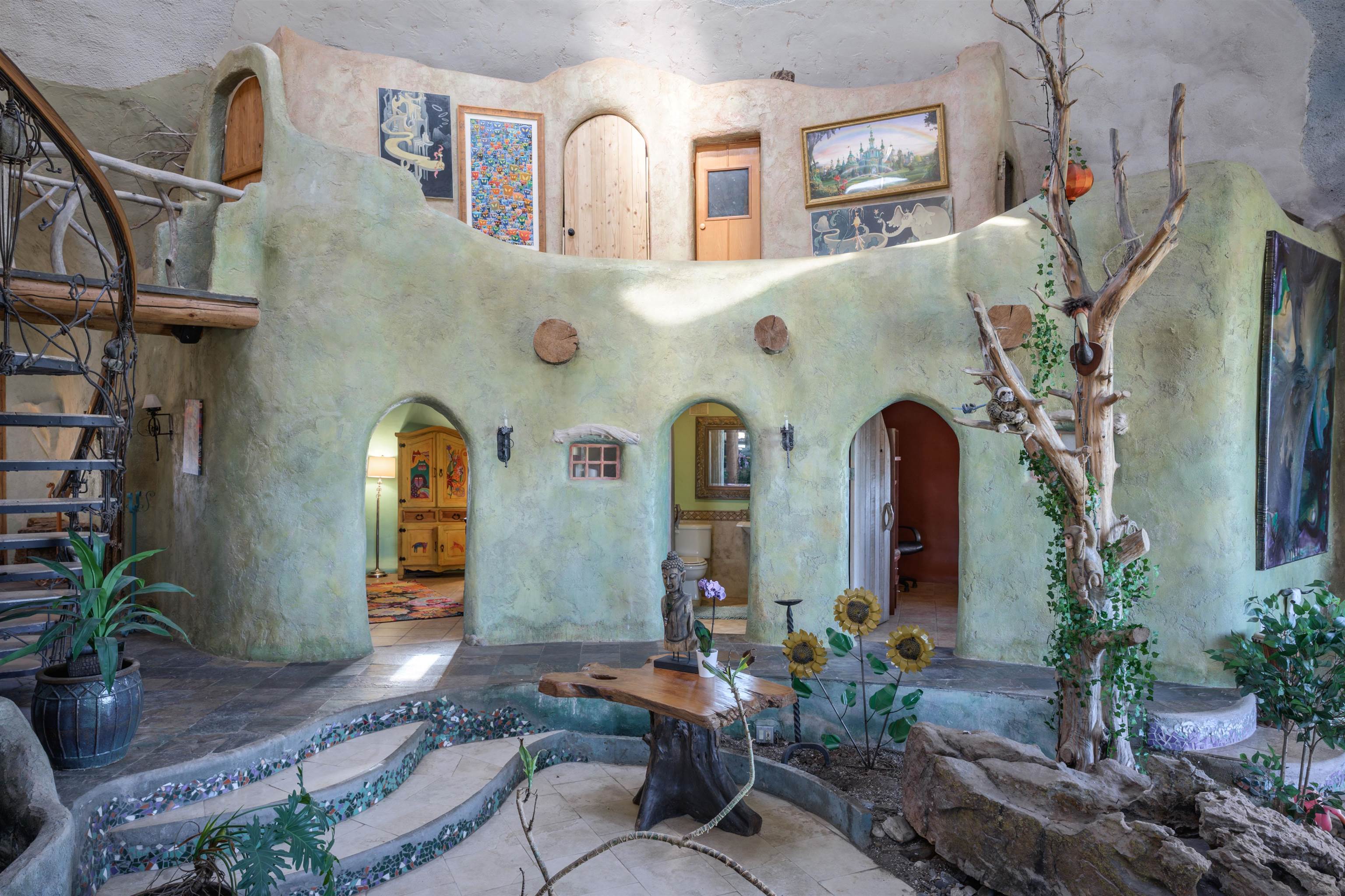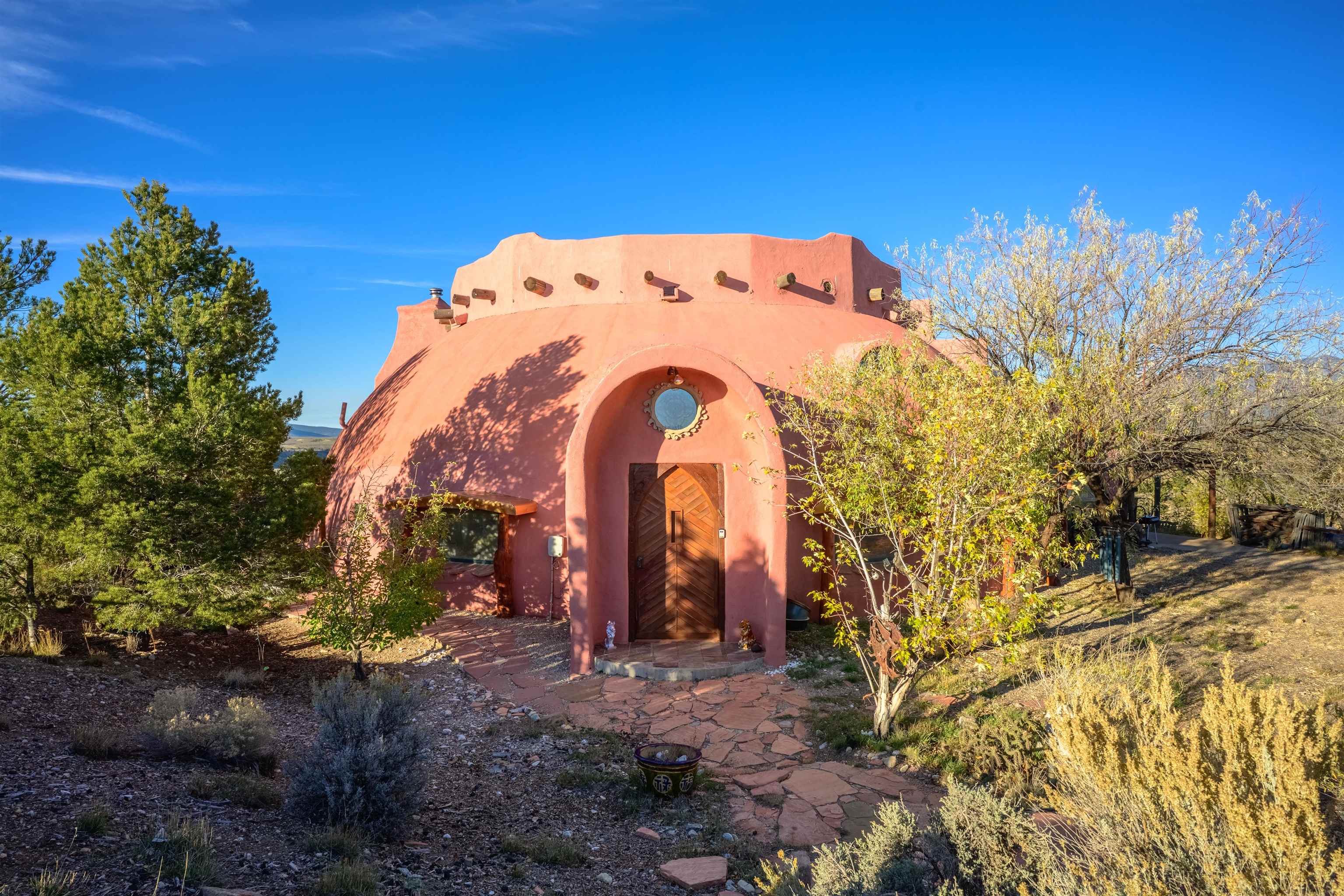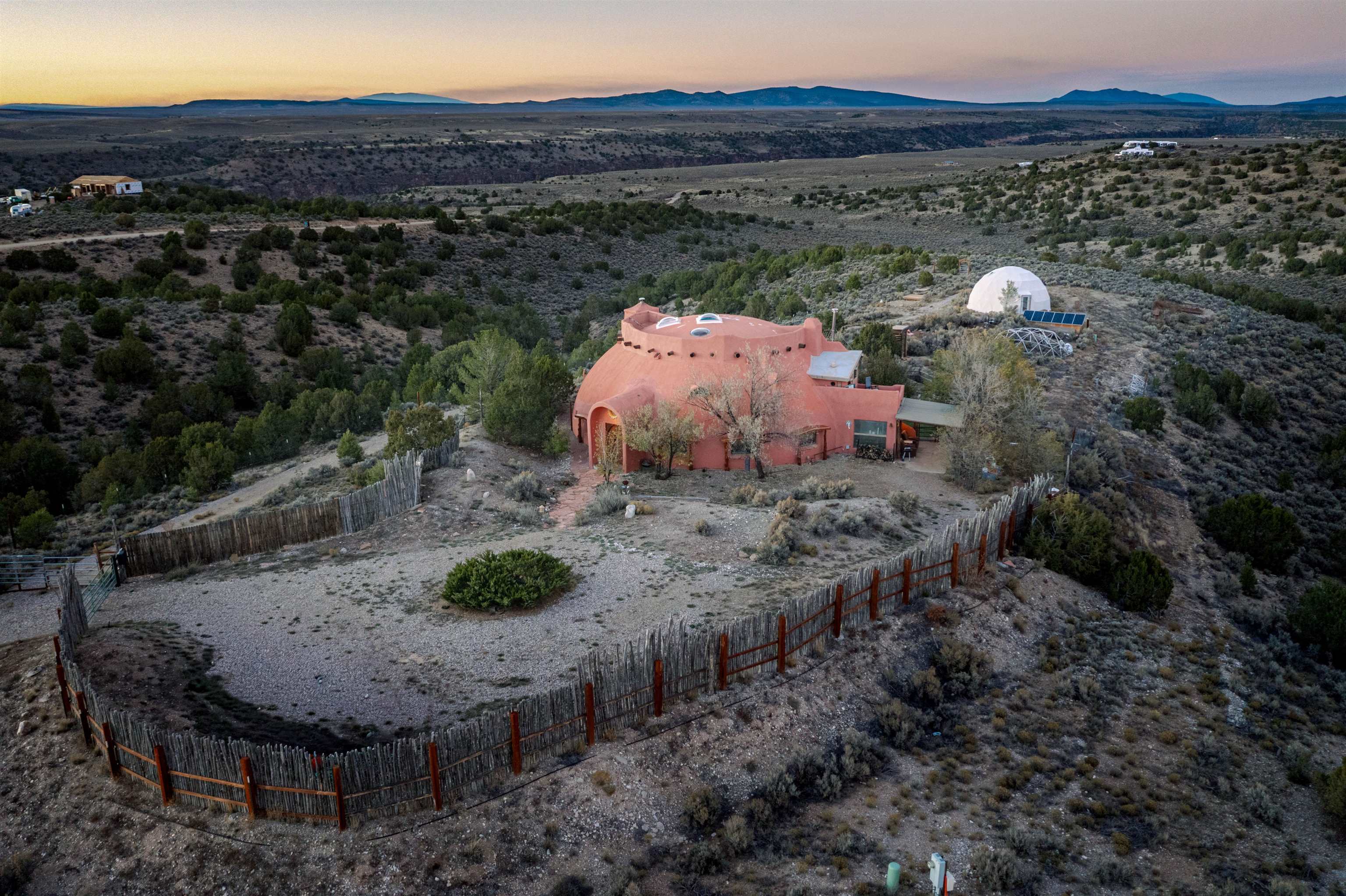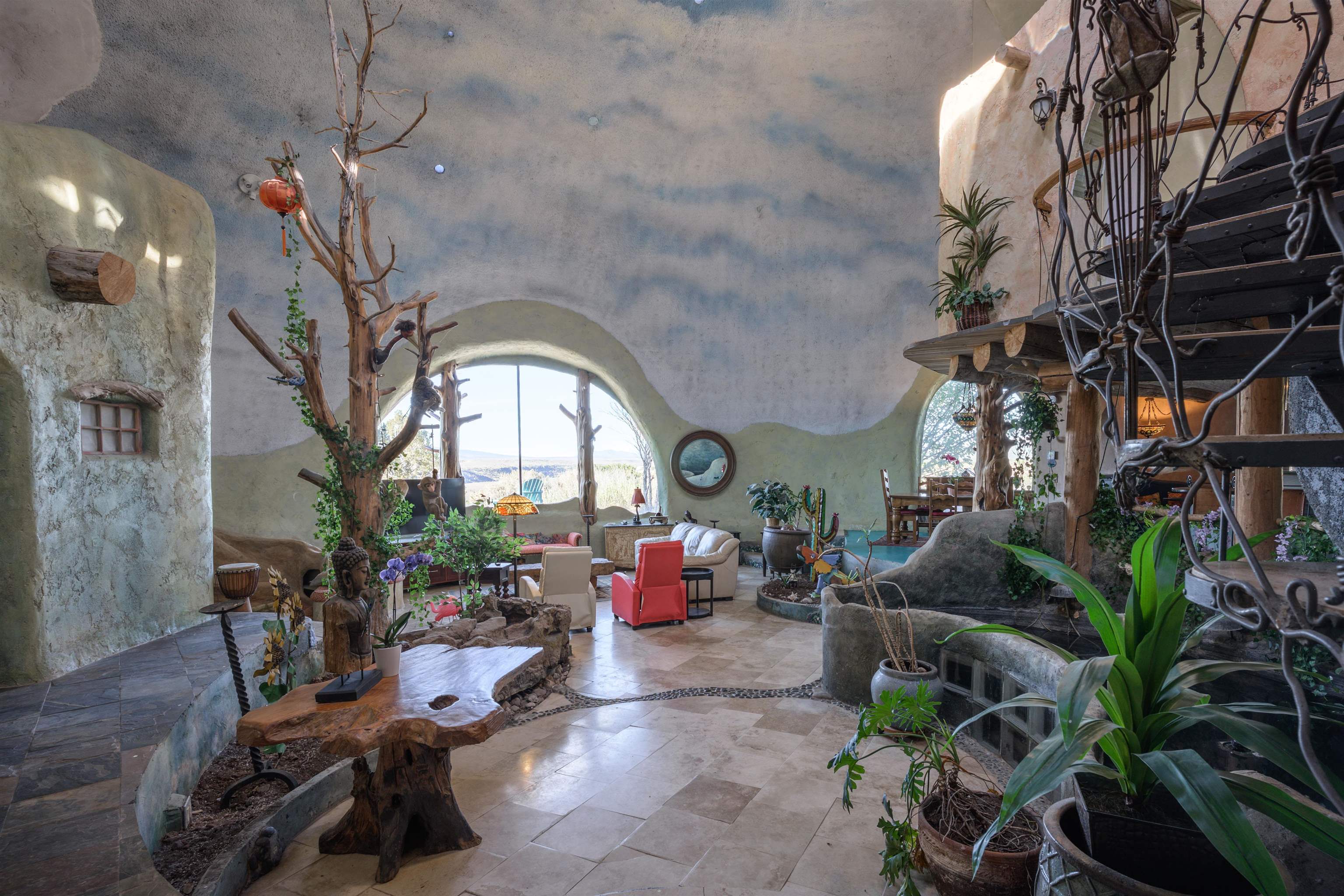 A Dreamy & Wondrous Masterpiece in Taos, New Mexico as Featured in Dwell Magazine, Homes.com, and more...Perched on five-plus pristine and private high-desert acres at the end of Tune Drive, you will discover "The Dreaming Dome," a dreamy and wondrous architectural masterpiece. Truly whimsical and delightfully outlandish in all the best ways, this structure—as featured on HGTV and in Parade Magazine as "The Most Beautiful House in America"—is more of a sculpture than your standard residence. Inspired by the rainforests of Costa Rica and the New Mexico alpine high-desert, this sustainable, monolithic designed dome includes a yoga hut in the backyard, engulfed by the most stunning views the region has to offer. Upon stepping inside this architectural wonder, you are greeted by a visual dreamland defined by 35-foot ceilings, hand-finished adobe-style walls in rich earth tones, hand-carved doors, travertine tile, luxurious stained-glass chandeliers, and high-end CUSTOM finish-work throughout. The spacious interior features vibrant mosaic paths, hand-painted murals, cedar trunk columns with hanging monkeys, toucans, and sloths, beside a romantic mystic tree wood-burning fireplace in the den with a black river rock bancito, and a dramatic painted sky ceiling flooded with circular skylights. The extra-large, half-moon juniper-framed window is as special as can be, offering equally incredible views and providing natural warmth and light from Mother Sun to compliment the radiant heated floors. The functional and stylish kitchen, just beyond the pond (now an atrium), includes Taos turquoise floors, soft green cabinets with marble countertops embedded with stainless steel appliances, a central island bar, beneath the traditional vigas beam ceiling. The adjacent dining room comfortably fits the family and offers another charming gathering area. The home provides ample and elegant space, possessing three distinctive bedrooms with three and a half eclectic bathrooms, including a private second-story primary ensuite straight out of a Disney movie, complete with a fireplace, and accessed by a dazzling sculpted vine staircase that leads up through your bedroom to a walk-in shower and access to a private hot tub deck—perfect for stargazing under the big NM sky. Outside, you will enjoy all of your time taking in the Land of Enchantment, tending to the garden under the cottonwood trees, and entertaining and bewildering your guests en su casa. Some of life's sweetest memories will be created here, while kids and furry friends roam freely in one of the fenced yards, accessible through a convenient double-doggie-door. Fresh H2O from your own 900-foot private well from the aquifer below is a major plus for day-to-day living, providing some of the best-tasting water you will find. As for the location, it is simply unbeatable for adventure and relaxation, situated close to the Rio Grande River, near natural hot springs, a jaunt from Taos Airport, and not far from the Historic Taos Plaza, world-class skiing and snowboarding at Taos Ski Valley, and endless hiking, biking, fishing, and bird watching trails. Even the wildlife will find their way to this magical wonderland while you lead a yoga class or mold pottery in the Yoga Dome, make bread in the blue horno, drink your morning coffee or evening wine, and experience the sweetest sunsets on our planet; and don't be surprised if an occasional hot air balloon emerges from the Gorge during a dreamy sunrise. This is custom luxury, eco-friendly, and fantasy, while submerged in nature, right here in Taos, New Mexico. Does it get any better? The answer very well might be no, so don't waste any time making this wonder of Taos, New Mexico your very own Reality.