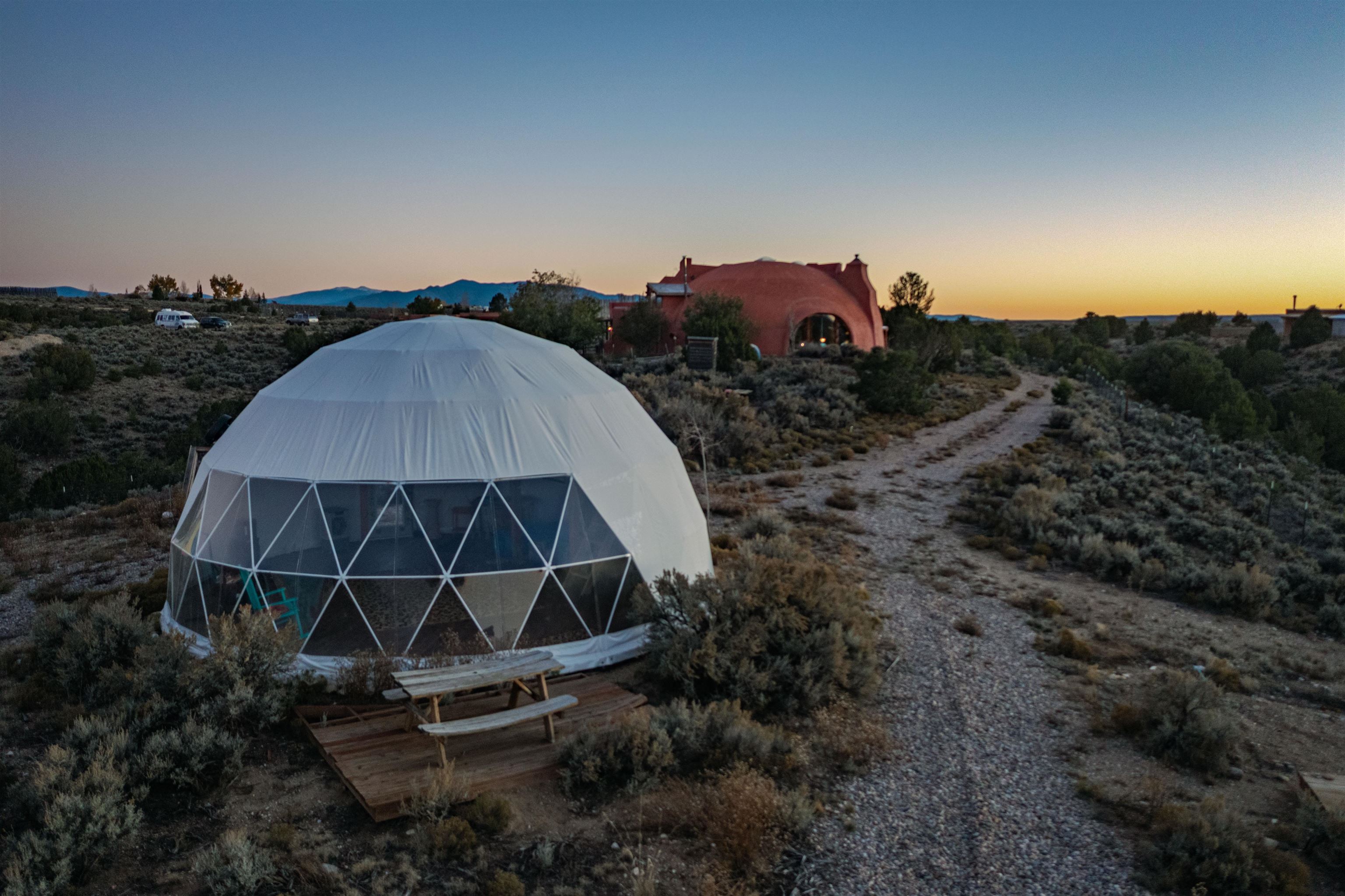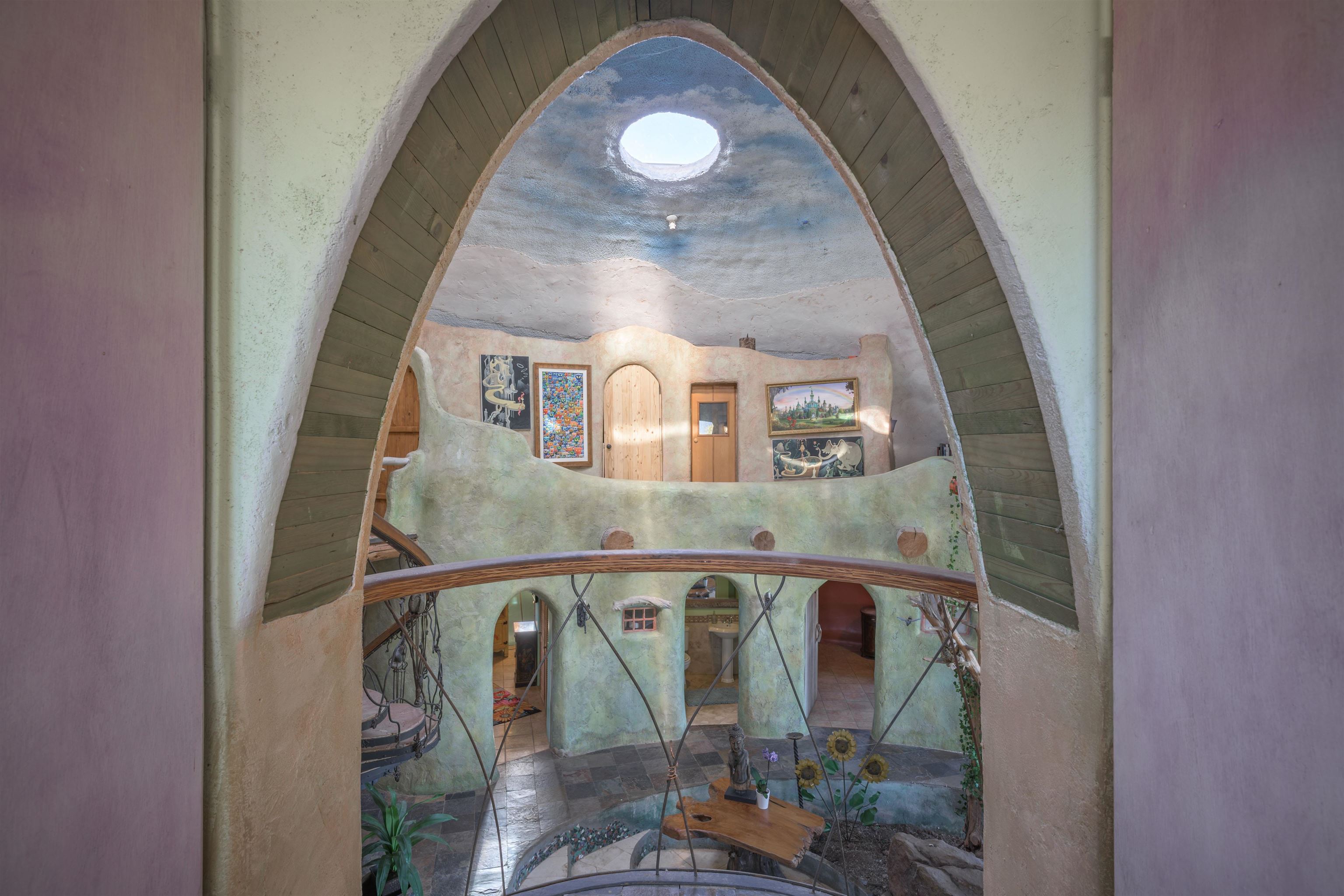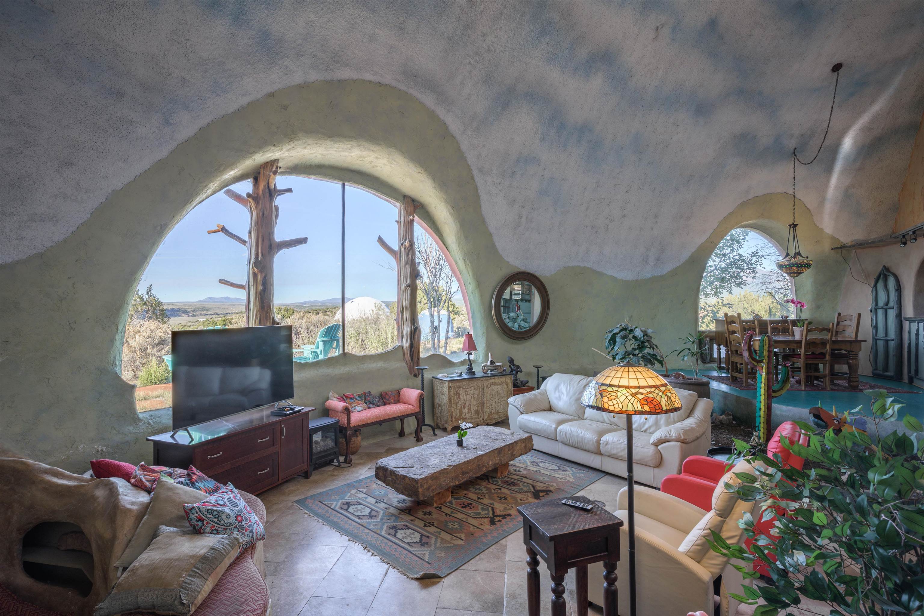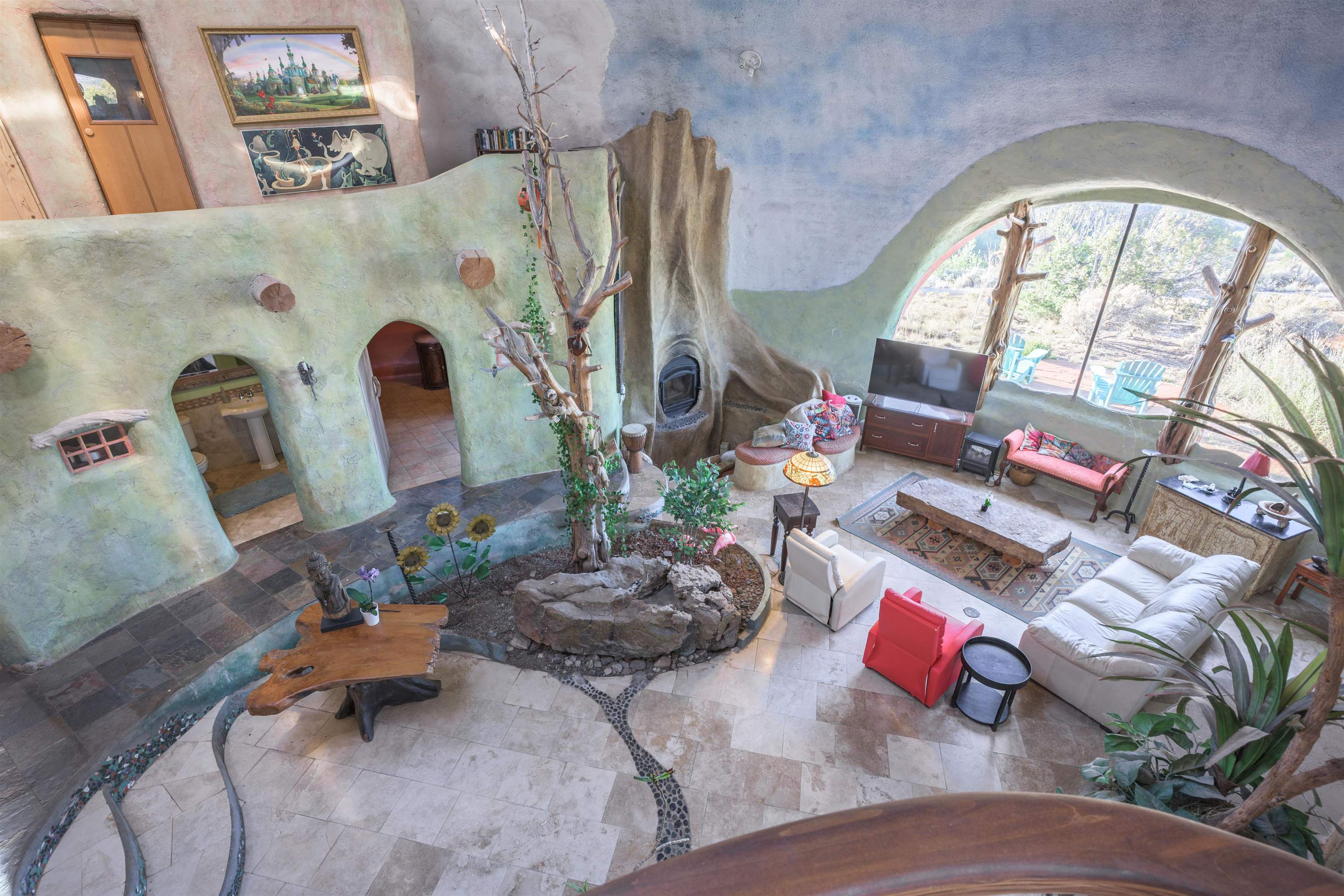 A Dreamy & Wondrous Masterpiece in Taos, New Mexico as Featured in Dwell Magazine, Homes.com, and more...Perched on five-plus pristine and private high-desert acres at the end of Tune Drive, you will discover "The Dreaming Dome," a dreamy and wondrous architectural masterpiece. Truly whimsical and delightfully outlandish in all the best ways, this structure—as featured on HGTV and in Parade Magazine as "The Most Beautiful House in America"—is more of a sculpture than your standard residence. Inspired by the rainforests of Costa Rica and the New Mexico alpine high-desert, this sustainable, monolithic designed dome includes a yoga hut in the backyard, engulfed by the most stunning views the region has to offer. Upon stepping inside this architectural wonder, you are greeted by a visual dreamland defined by 35-foot ceilings, hand-finished adobe-style walls in rich earth tones, hand-carved doors, travertine tile, luxurious stained-glass chandeliers, and high-end CUSTOM finish-work throughout. The spacious interior features vibrant mosaic paths, hand-painted murals, cedar trunk columns with hanging monkeys, toucans, and sloths, beside a romantic mystic tree wood-burning fireplace in the den with a black river rock bancito, and a dramatic painted sky ceiling flooded with circular skylights. The extra-large, half-moon juniper-framed window is as special as can be, offering equally incredible views and providing natural warmth and light from Mother Sun to compliment the radiant heated floors. The functional and stylish kitchen, just beyond the pond (now an atrium), includes Taos turquoise floors, soft green cabinets with marble countertops embedded with stainless steel appliances, a central island bar, beneath the traditional vigas beam ceiling. The adjacent dining room comfortably fits the family and offers another charming gathering area. The home provides ample and elegant space, possessing three distinctive bedrooms with three and a half eclectic bathrooms, including a private second-story primary ensuite straight out of a Disney movie, complete with a fireplace, and accessed by a dazzling sculpted vine staircase that leads up through your bedroom to a walk-in shower and access to a private hot tub deck—perfect for stargazing under the big NM sky. Outside, you will enjoy all of your time taking in the Land of Enchantment, tending to the garden under the cottonwood trees, and entertaining and bewildering your guests en su casa. Some of life's sweetest memories will be created here, while kids and furry friends roam freely in one of the fenced yards, accessible through a convenient double-doggie-door. Fresh H2O from your own 900-foot private well from the aquifer below is a major plus for day-to-day living, providing some of the best-tasting water you will find. As for the location, it is simply unbeatable for adventure and relaxation, situated close to the Rio Grande River, near natural hot springs, a jaunt from Taos Airport, and not far from the Historic Taos Plaza, world-class skiing and snowboarding at Taos Ski Valley, and endless hiking, biking, fishing, and bird watching trails. Even the wildlife will find their way to this magical wonderland while you lead a yoga class or mold pottery in the Yoga Dome, make bread in the blue horno, drink your morning coffee or evening wine, and experience the sweetest sunsets on our planet; and don't be surprised if an occasional hot air balloon emerges from the Gorge during a dreamy sunrise. This is custom luxury, eco-friendly, and fantasy, while submerged in nature, right here in Taos, New Mexico. Does it get any better? The answer very well might be no, so don't waste any time making this wonder of Taos, New Mexico your very own Reality.
