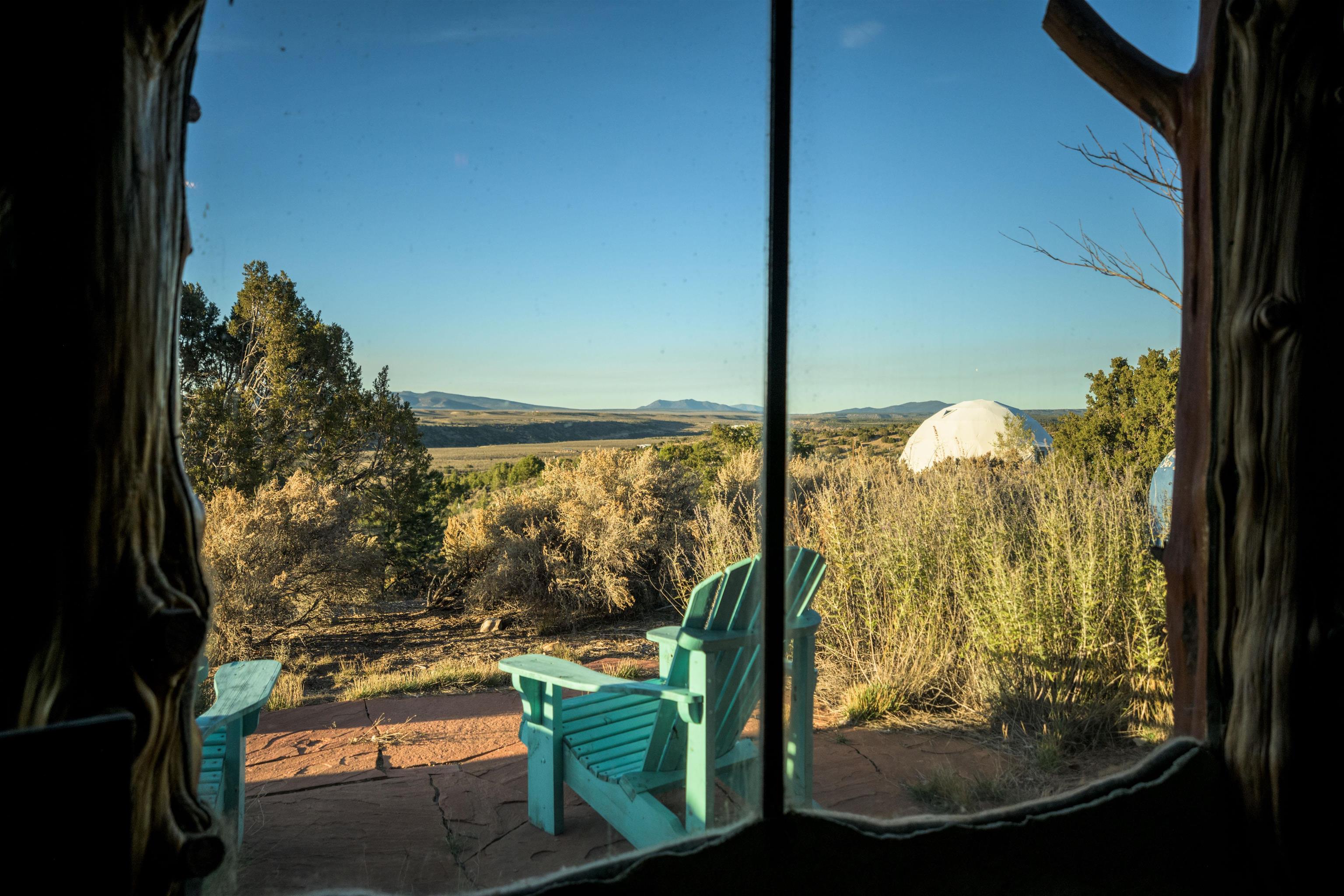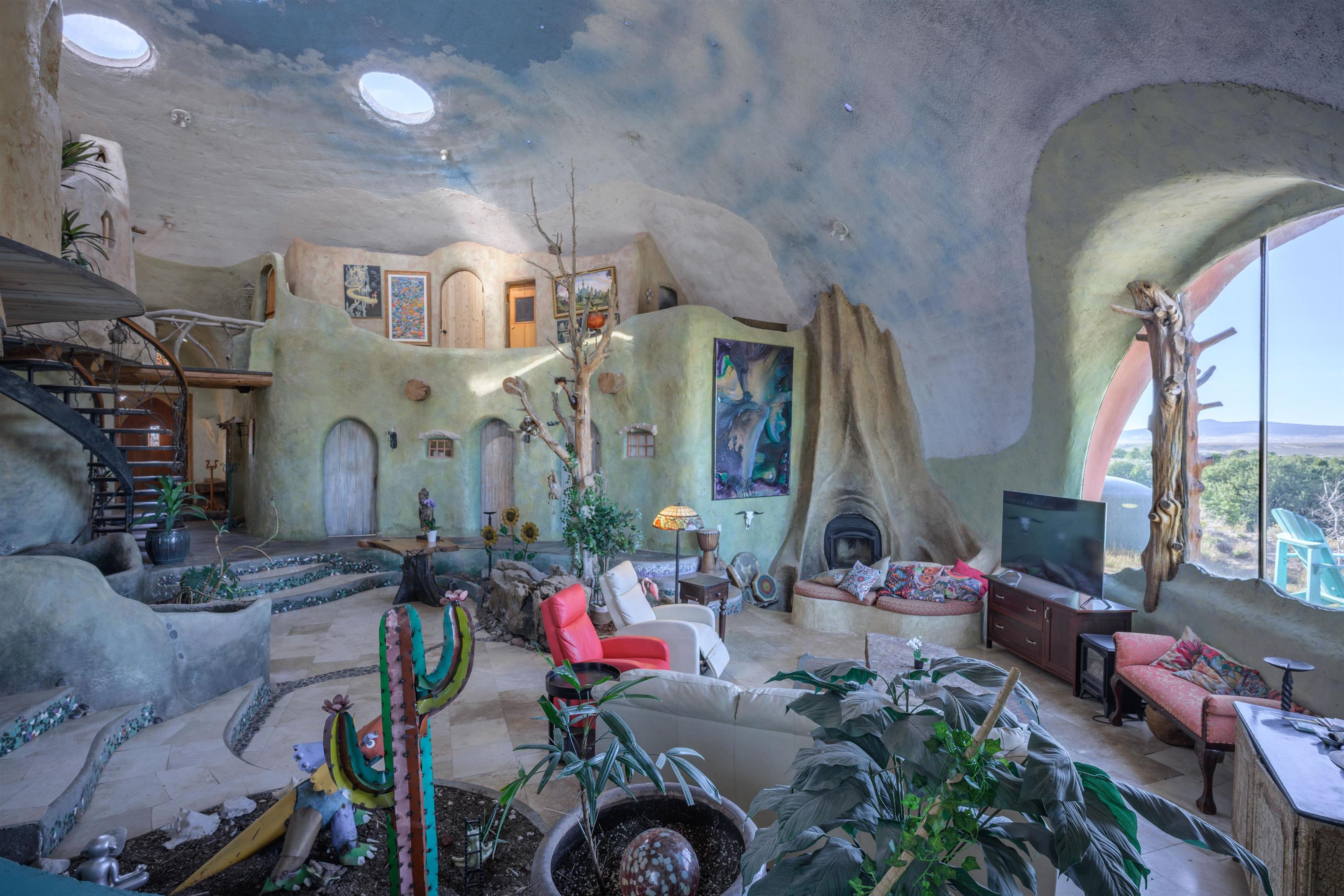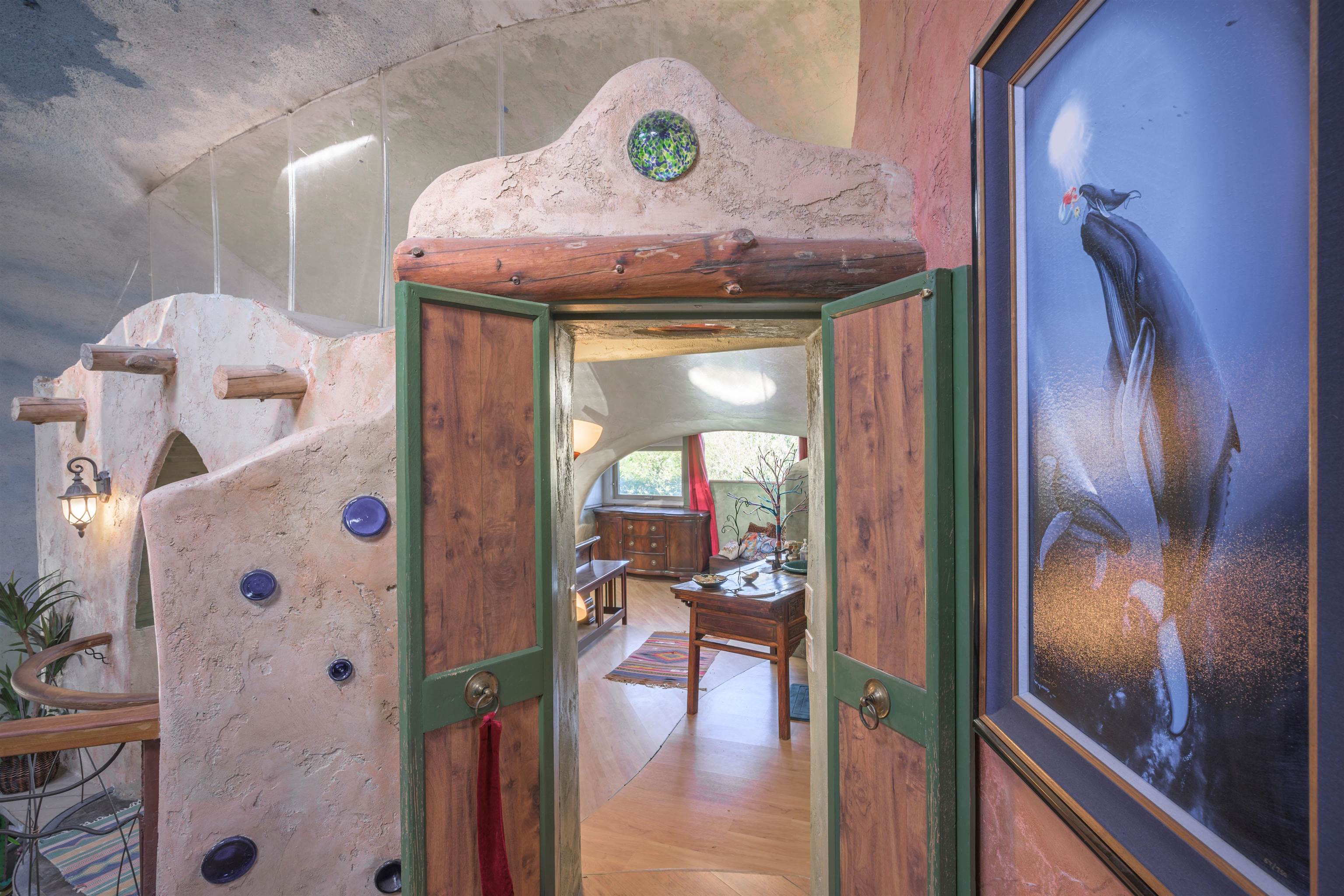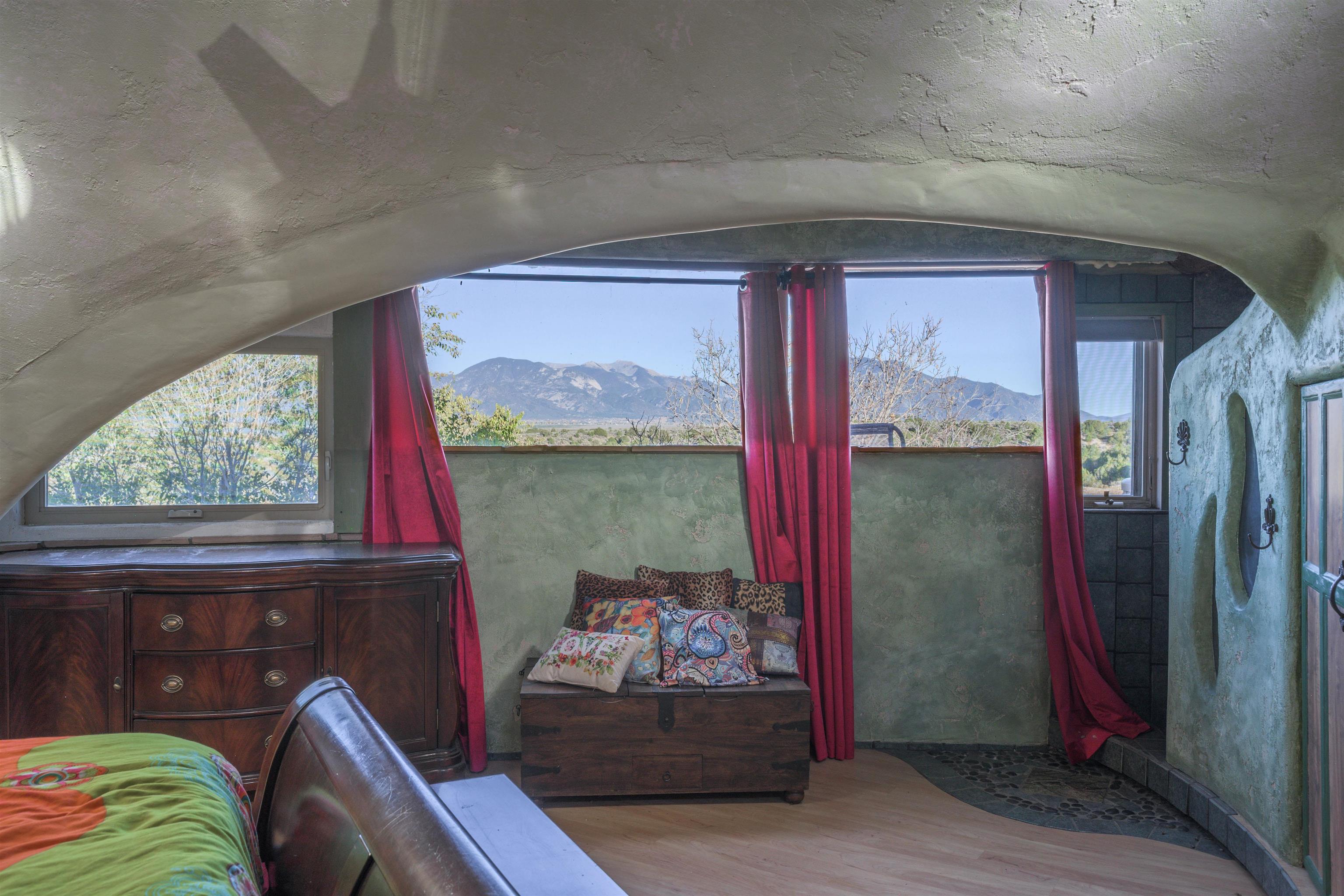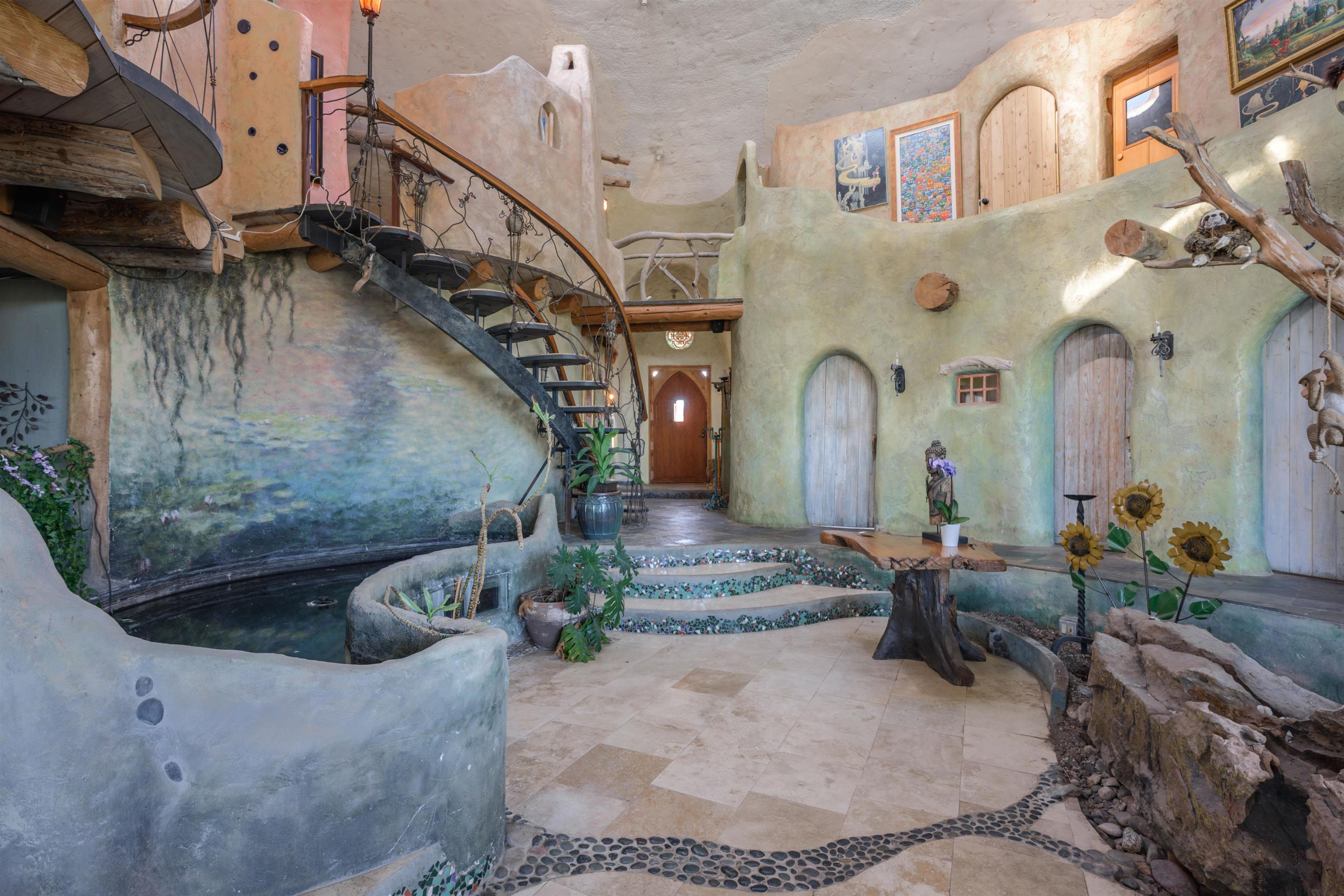 A Dreamy & Wondrous Masterpiece in Taos, New Mexico as Featured in Dwell Magazine, Homes.com, and more...Perched on five-plus pristine and private high-desert acres at the end of Tune Drive, you will discover "The Dreaming Dome," a dreamy and wondrous architectural masterpiece. Truly whimsical and delightfully outlandish in all the best ways, this structure—as featured on HGTV and in Parade Magazine as "The Most Beautiful House in America"—is more of a sculpture than your standard residence. Inspired by the rainforests of Costa Rica and the New Mexico alpine high-desert, this sustainable, monolithic designed dome includes a yoga hut in the backyard, engulfed by the most stunning views the region has to offer. Upon stepping inside this architectural wonder, you are greeted by a visual dreamland defined by 35-foot ceilings, hand-finished adobe-style walls in rich earth tones, hand-carved doors, travertine tile, luxurious stained-glass chandeliers, and high-end CUSTOM finish-work throughout. The spacious interior features vibrant mosaic paths, hand-painted murals, cedar trunk columns with hanging monkeys, toucans, and sloths, beside a romantic mystic tree wood-burning fireplace in the den with a black river rock bancito, and a dramatic painted sky ceiling flooded with circular skylights. The extra-large, half-moon juniper-framed window is as special as can be, offering equally incredible views and providing natural warmth and light from Mother Sun to compliment the radiant heated floors. The functional and stylish kitchen, just beyond the pond (now an atrium), includes Taos turquoise floors, soft green cabinets with marble countertops embedded with stainless steel appliances, a central island bar, beneath the traditional vigas beam ceiling. The adjacent dining room comfortably fits the family and offers another charming gathering area. The home provides ample and elegant space, possessing three distinctive bedrooms with three and a half eclectic bathrooms, including a private second-story primary ensuite straight out of a Disney movie, complete with a fireplace, and accessed by a dazzling sculpted vine staircase that leads up through your bedroom to a walk-in shower and access to a private hot tub deck—perfect for stargazing under the big NM sky. Outside, you will enjoy all of your time taking in the Land of Enchantment, tending to the garden under the cottonwood trees, and entertaining and bewildering your guests en su casa. Some of life's sweetest memories will be created here, while kids and furry friends roam freely in one of the fenced yards, accessible through a convenient double-doggie-door. Fresh H2O from your own 900-foot private well from the aquifer below is a major plus for day-to-day living, providing some of the best-tasting water you will find. As for the location, it is simply unbeatable for adventure and relaxation, situated close to the Rio Grande River, near natural hot springs, a jaunt from Taos Airport, and not far from the Historic Taos Plaza, world-class skiing and snowboarding at Taos Ski Valley, and endless hiking, biking, fishing, and bird watching trails. Even the wildlife will find their way to this magical wonderland while you lead a yoga class or mold pottery in the Yoga Dome, make bread in the blue horno, drink your morning coffee or evening wine, and experience the sweetest sunsets on our planet; and don't be surprised if an occasional hot air balloon emerges from the Gorge during a dreamy sunrise. This is custom luxury, eco-friendly, and fantasy, while submerged in nature, right here in Taos, New Mexico. Does it get any better? The answer very well might be no, so don't waste any time making this wonder of Taos, New Mexico your very own Reality.