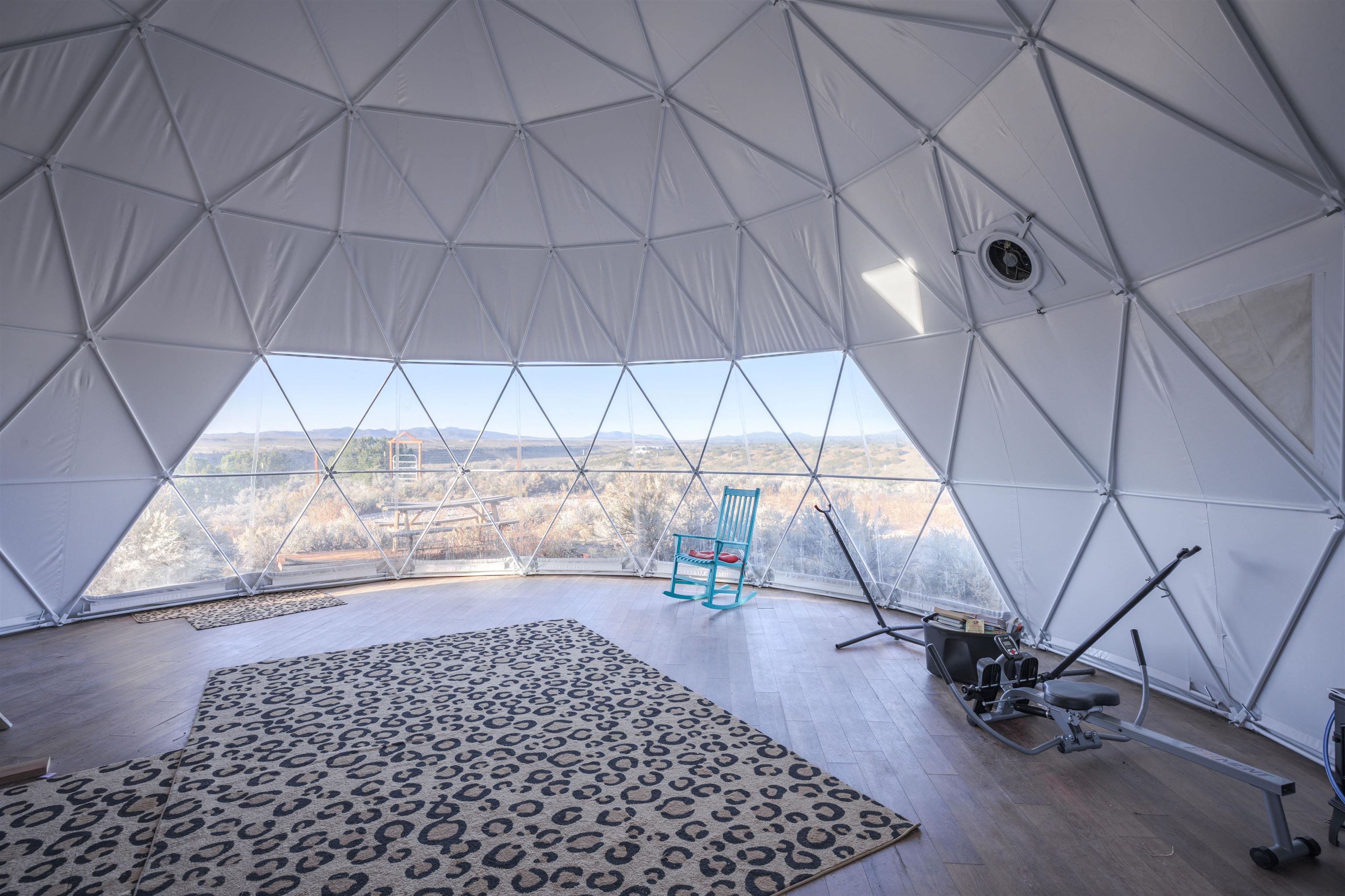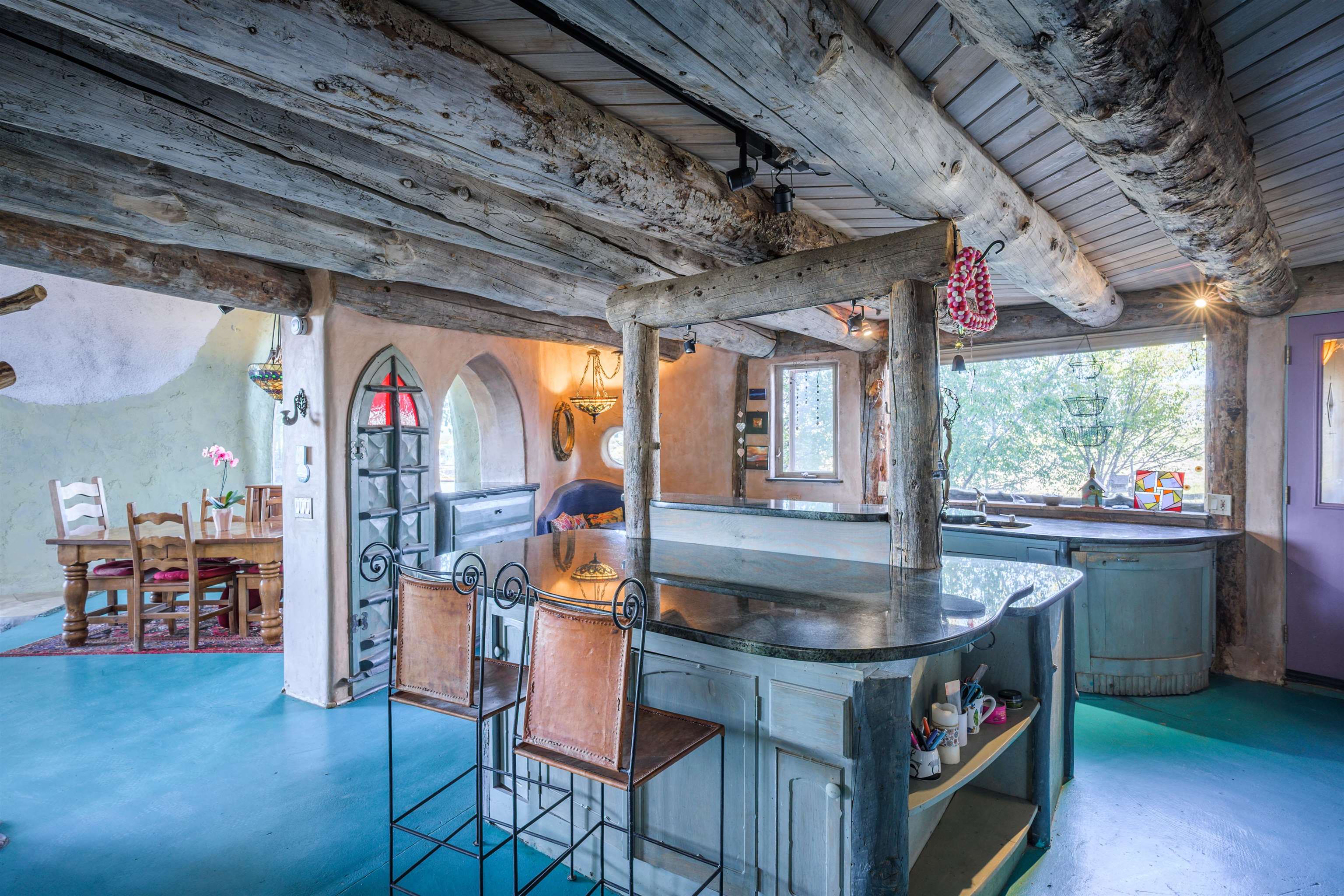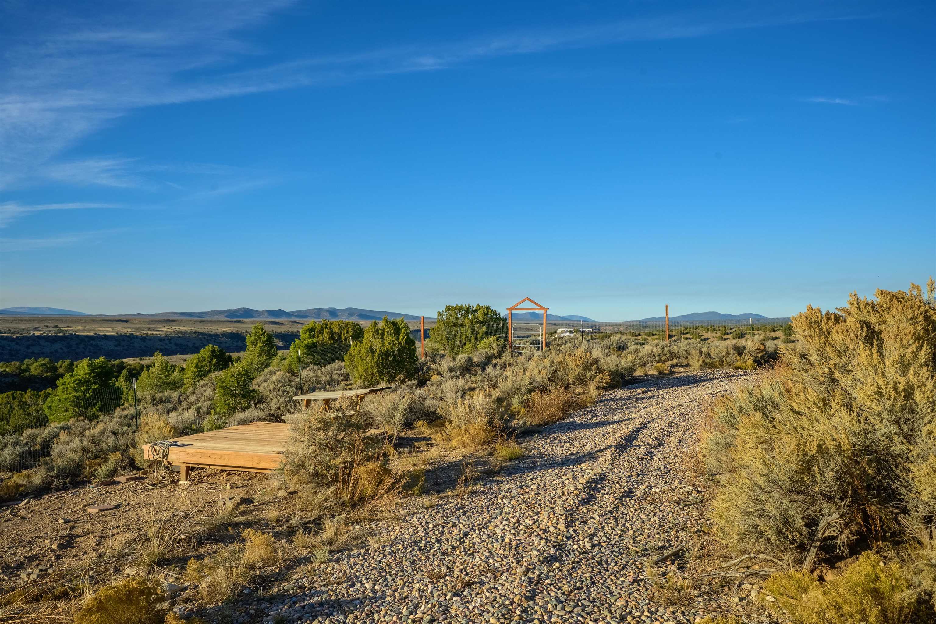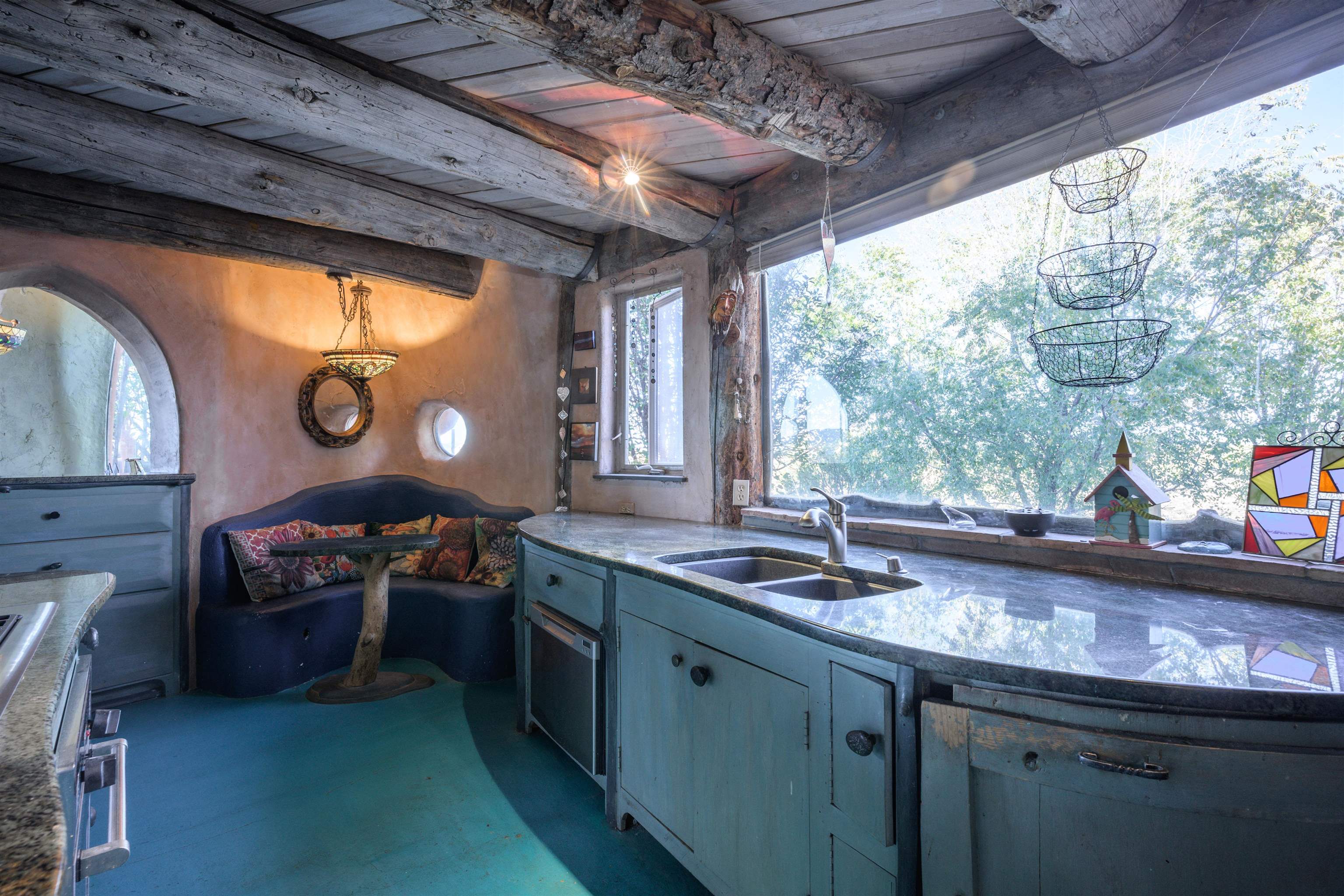 A Dreamy & Wondrous Masterpiece in Taos, New Mexico as Featured in Dwell Magazine, Homes.com, and more...Perched on five-plus pristine and private high-desert acres at the end of Tune Drive, you will discover "The Dreaming Dome," a dreamy and wondrous architectural masterpiece. Truly whimsical and delightfully outlandish in all the best ways, this structure—as featured on HGTV and in Parade Magazine as "The Most Beautiful House in America"—is more of a sculpture than your standard residence. Inspired by the rainforests of Costa Rica and the New Mexico alpine high-desert, this sustainable, monolithic designed dome includes a yoga hut in the backyard, engulfed by the most stunning views the region has to offer. Upon stepping inside this architectural wonder, you are greeted by a visual dreamland defined by 35-foot ceilings, hand-finished adobe-style walls in rich earth tones, hand-carved doors, travertine tile, luxurious stained-glass chandeliers, and high-end CUSTOM finish-work throughout. The spacious interior features vibrant mosaic paths, hand-painted murals, cedar trunk columns with hanging monkeys, toucans, and sloths, beside a romantic mystic tree wood-burning fireplace in the den with a black river rock bancito, and a dramatic painted sky ceiling flooded with circular skylights. The extra-large, half-moon juniper-framed window is as special as can be, offering equally incredible views and providing natural warmth and light from Mother Sun to compliment the radiant heated floors. The functional and stylish kitchen, just beyond the pond (now an atrium), includes Taos turquoise floors, soft green cabinets with marble countertops embedded with stainless steel appliances, a central island bar, beneath the traditional vigas beam ceiling. The adjacent dining room comfortably fits the family and offers another charming gathering area. The home provides ample and elegant space, possessing three distinctive bedrooms with three and a half eclectic bathrooms, including a private second-story primary ensuite straight out of a Disney movie, complete with a fireplace, and accessed by a dazzling sculpted vine staircase that leads up through your bedroom to a walk-in shower and access to a private hot tub deck—perfect for stargazing under the big NM sky. Outside, you will enjoy all of your time taking in the Land of Enchantment, tending to the garden under the cottonwood trees, and entertaining and bewildering your guests en su casa. Some of life's sweetest memories will be created here, while kids and furry friends roam freely in one of the fenced yards, accessible through a convenient double-doggie-door. Fresh H2O from your own 900-foot private well from the aquifer below is a major plus for day-to-day living, providing some of the best-tasting water you will find. As for the location, it is simply unbeatable for adventure and relaxation, situated close to the Rio Grande River, near natural hot springs, a jaunt from Taos Airport, and not far from the Historic Taos Plaza, world-class skiing and snowboarding at Taos Ski Valley, and endless hiking, biking, fishing, and bird watching trails. Even the wildlife will find their way to this magical wonderland while you lead a yoga class or mold pottery in the Yoga Dome, make bread in the blue horno, drink your morning coffee or evening wine, and experience the sweetest sunsets on our planet; and don't be surprised if an occasional hot air balloon emerges from the Gorge during a dreamy sunrise. This is custom luxury, eco-friendly, and fantasy, while submerged in nature, right here in Taos, New Mexico. Does it get any better? The answer very well might be no, so don't waste any time making this wonder of Taos, New Mexico your very own Reality.