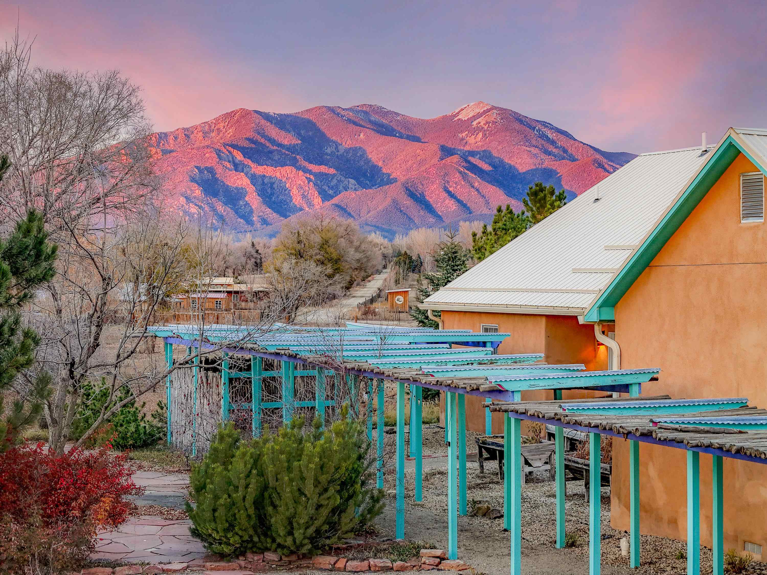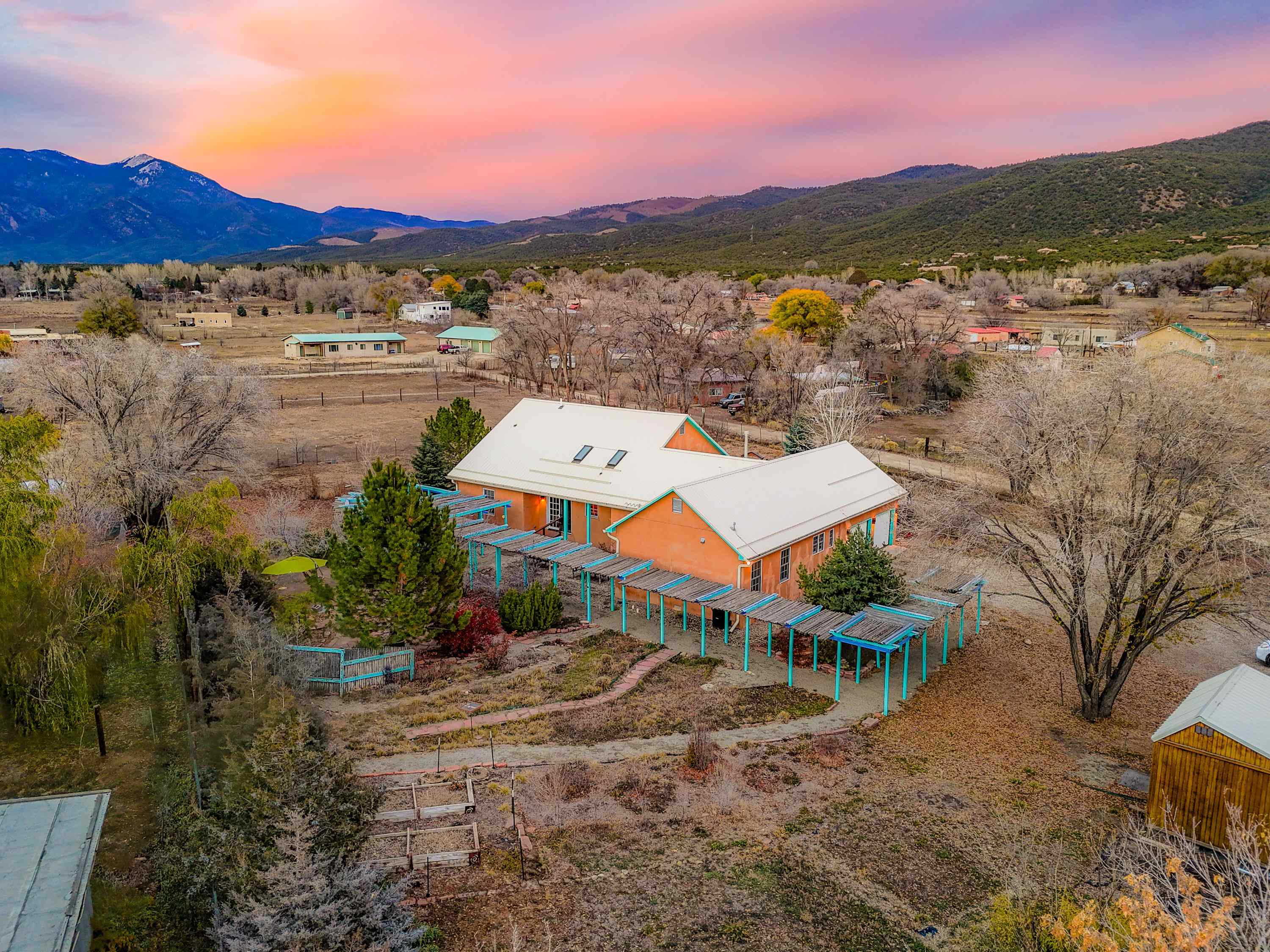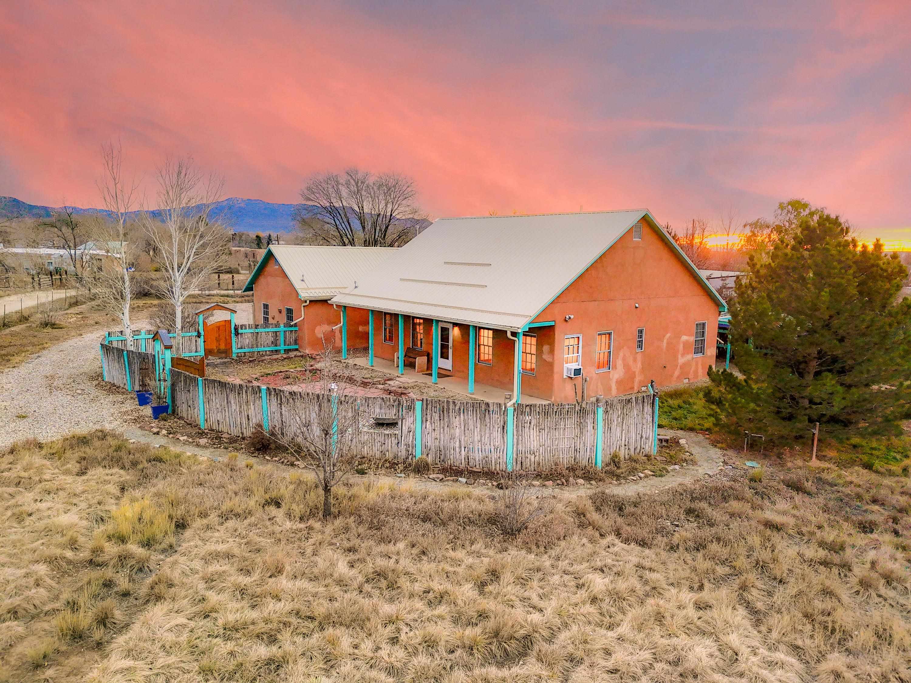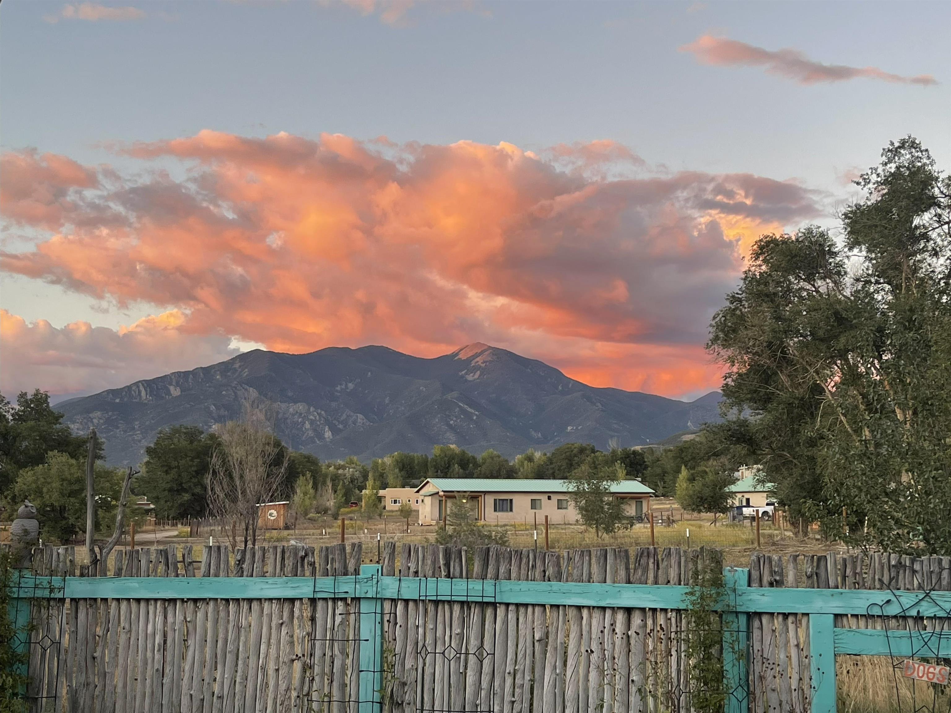 Just Off Kit Carson Road—1.4 Miles from Taos Plaza! This 2-bedroom, 2-bath home plus office offers 2,300 sq. ft. of Territorial-style living on 0.96 fenced acres with stunning north-facing views of the Sangre de Cristo Mountains. Inside, a formal living room with a pine-mantled fireplace sits across from the formal dining room highlighted by an art deco chandelier and sconces. The primary suite features a spacious ensuite and his-and-hers walk-in closets. The chef’s kitchen shines with ample cabinetry, an island, farmhouse sink, skylights, and gorgeous green marble countertops, plus a sunny kitchenette with French doors leading to the patio and cultivated gardens. Solid pine floors run throughout, with tile in the baths, laundry, and utility rooms. The home is comfortably warmed by European Buderus baseboard heating. Pergolas wrap around half the house, and in spring, the yard bursts with red and orange irises and red feathered poppies. Across the street, you can stroll over to the Taos Cow in the Anglada Building for a scoop of homemade ice cream and a taste of local flavor—just one more reason you’ll love calling this Taos retreat home.