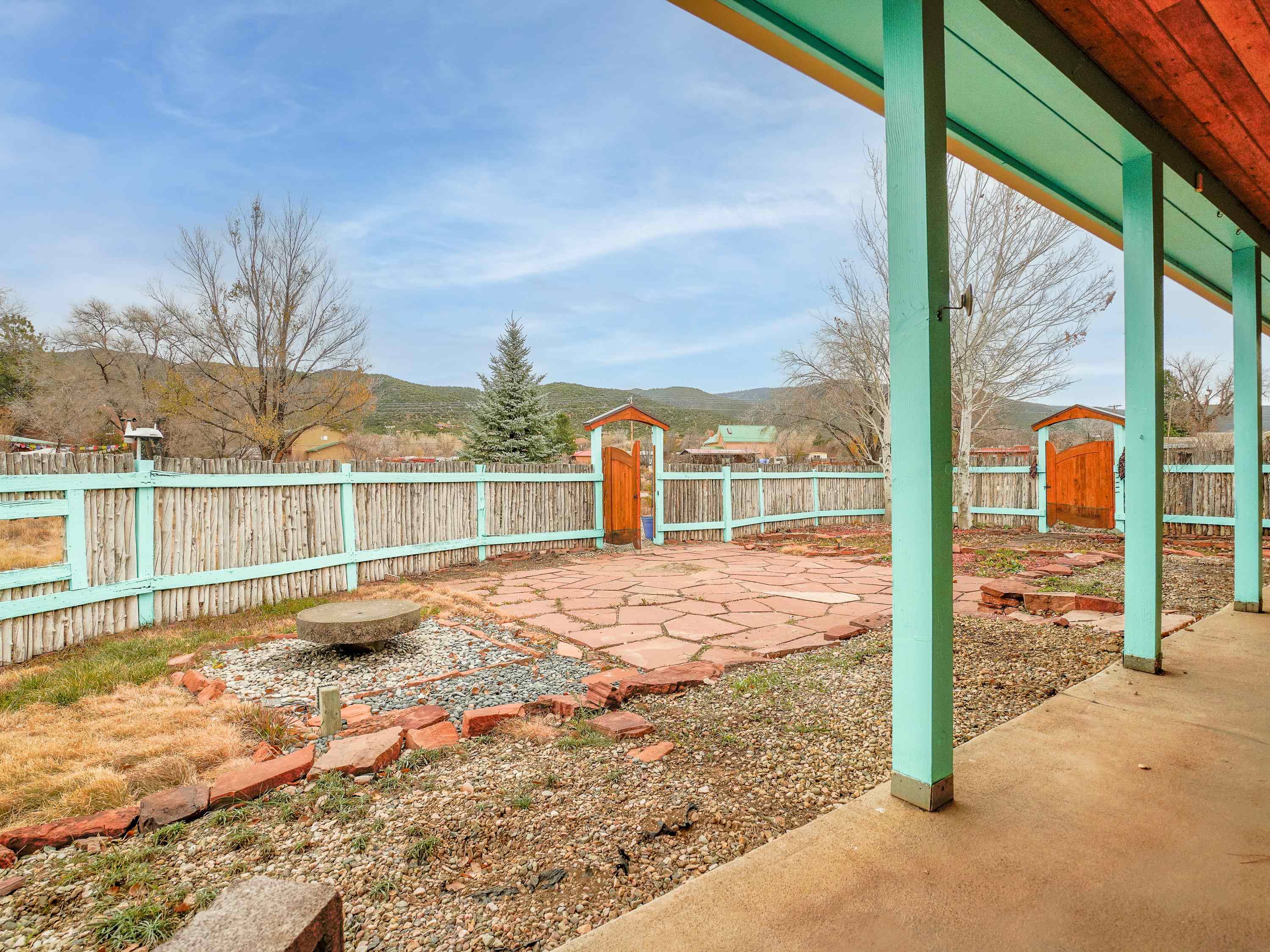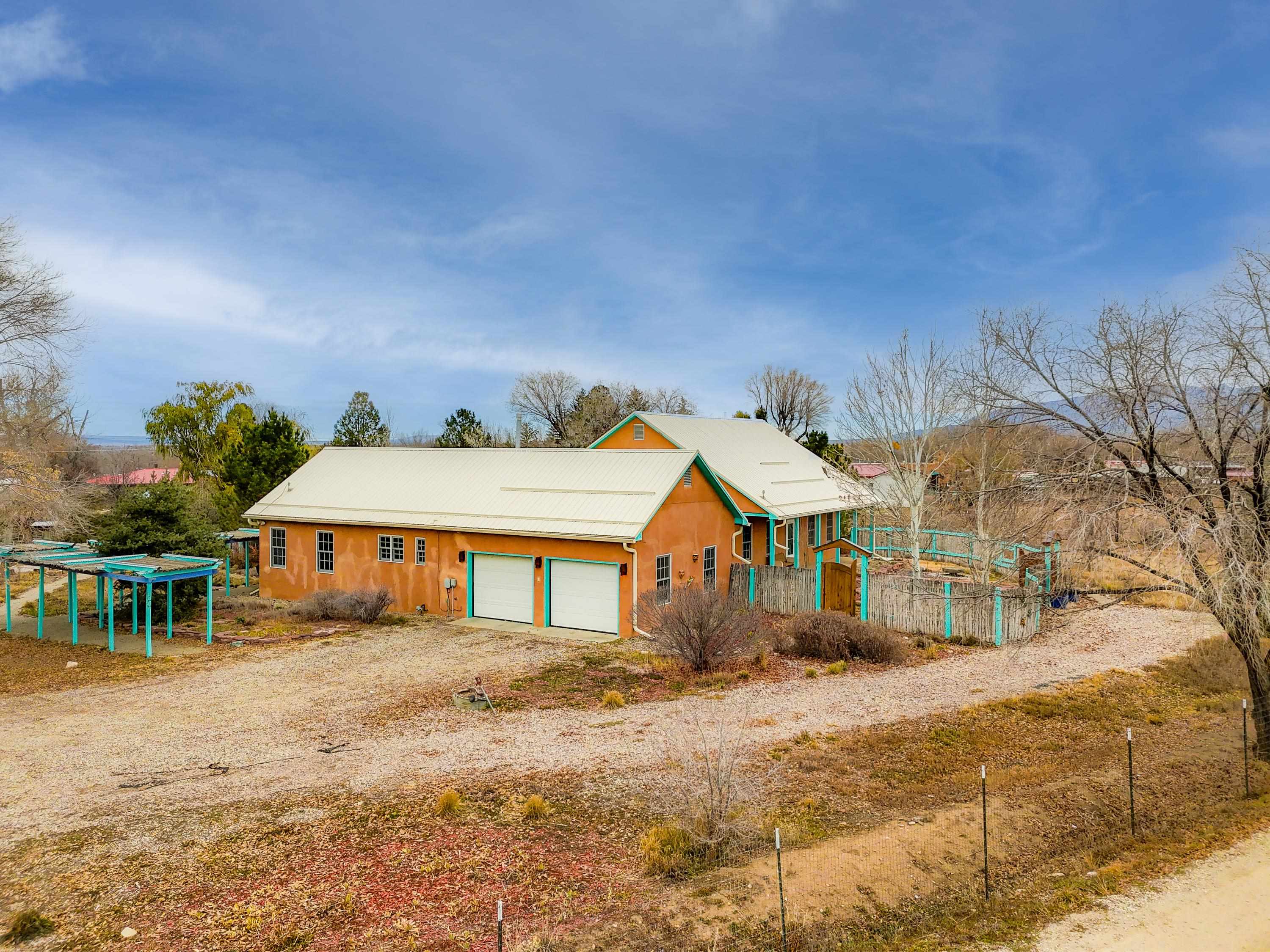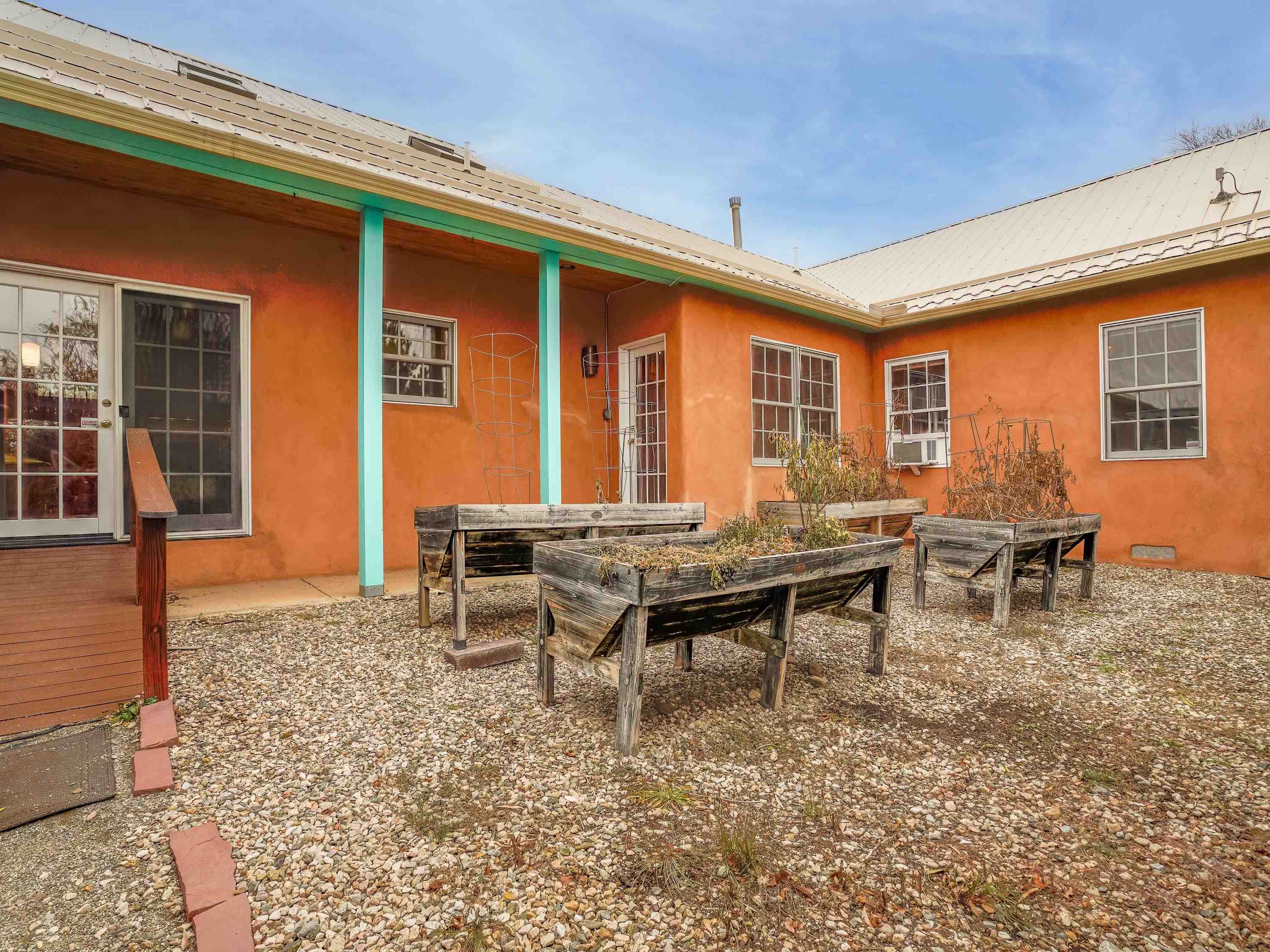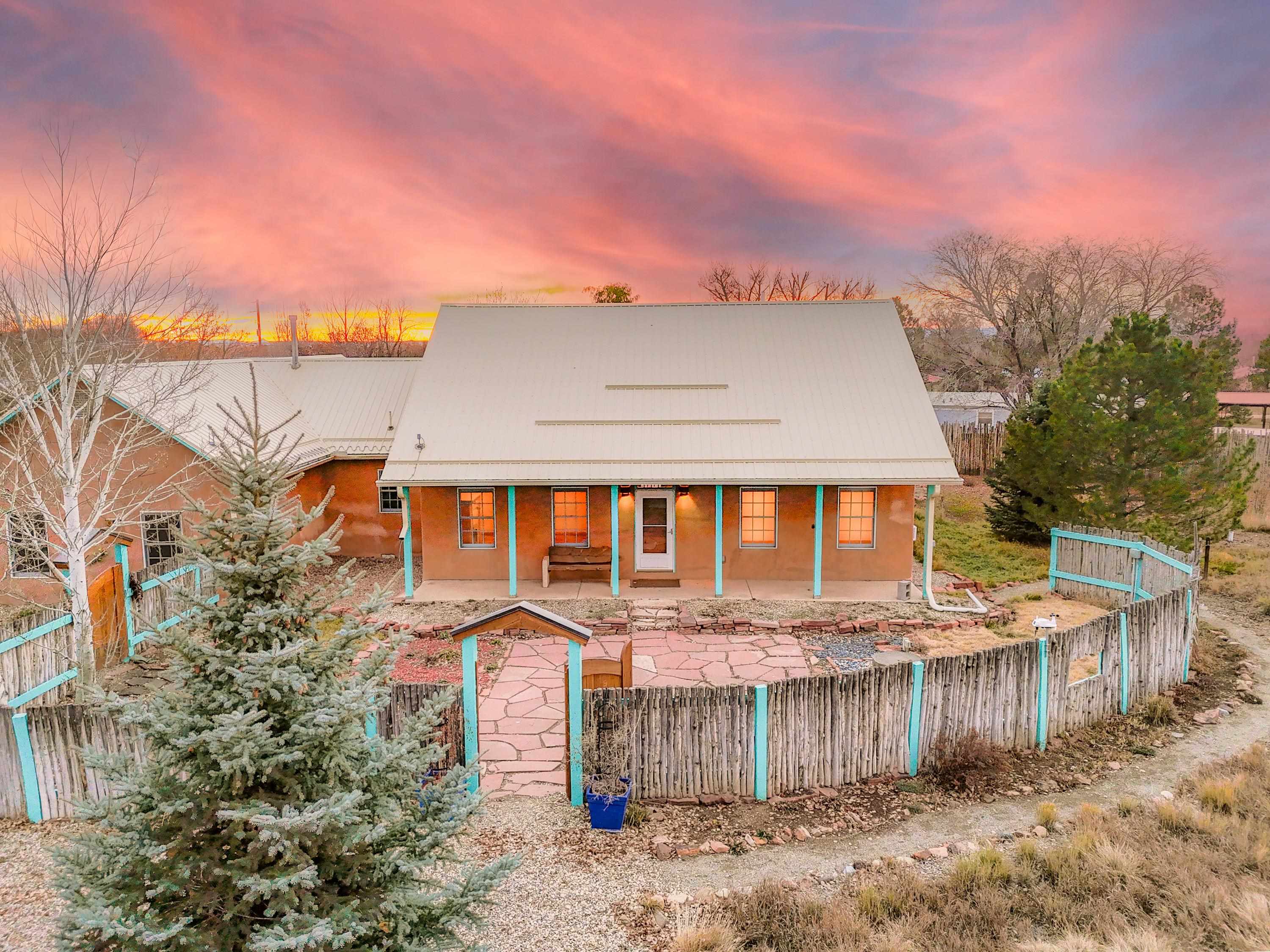 Just Off Kit Carson Road—1.4 Miles from Taos Plaza! This 2-bedroom, 2-bath home plus office offers 2,300 sq. ft. of Territorial-style living on 0.96 fenced acres with stunning north-facing views of the Sangre de Cristo Mountains. Inside, a formal living room with a pine-mantled fireplace sits across from the formal dining room highlighted by an art deco chandelier and sconces. The primary suite features a spacious ensuite and his-and-hers walk-in closets. The chef’s kitchen shines with ample cabinetry, an island, farmhouse sink, skylights, and gorgeous green marble countertops, plus a sunny kitchenette with French doors leading to the patio and cultivated gardens. Solid pine floors run throughout, with tile in the baths, laundry, and utility rooms. The home is comfortably warmed by European Buderus baseboard heating. Pergolas wrap around half the house, and in spring, the yard bursts with red and orange irises and red feathered poppies. Across the street, you can stroll over to the Taos Cow in the Anglada Building for a scoop of homemade ice cream and a taste of local flavor—just one more reason you’ll love calling this Taos retreat home.
