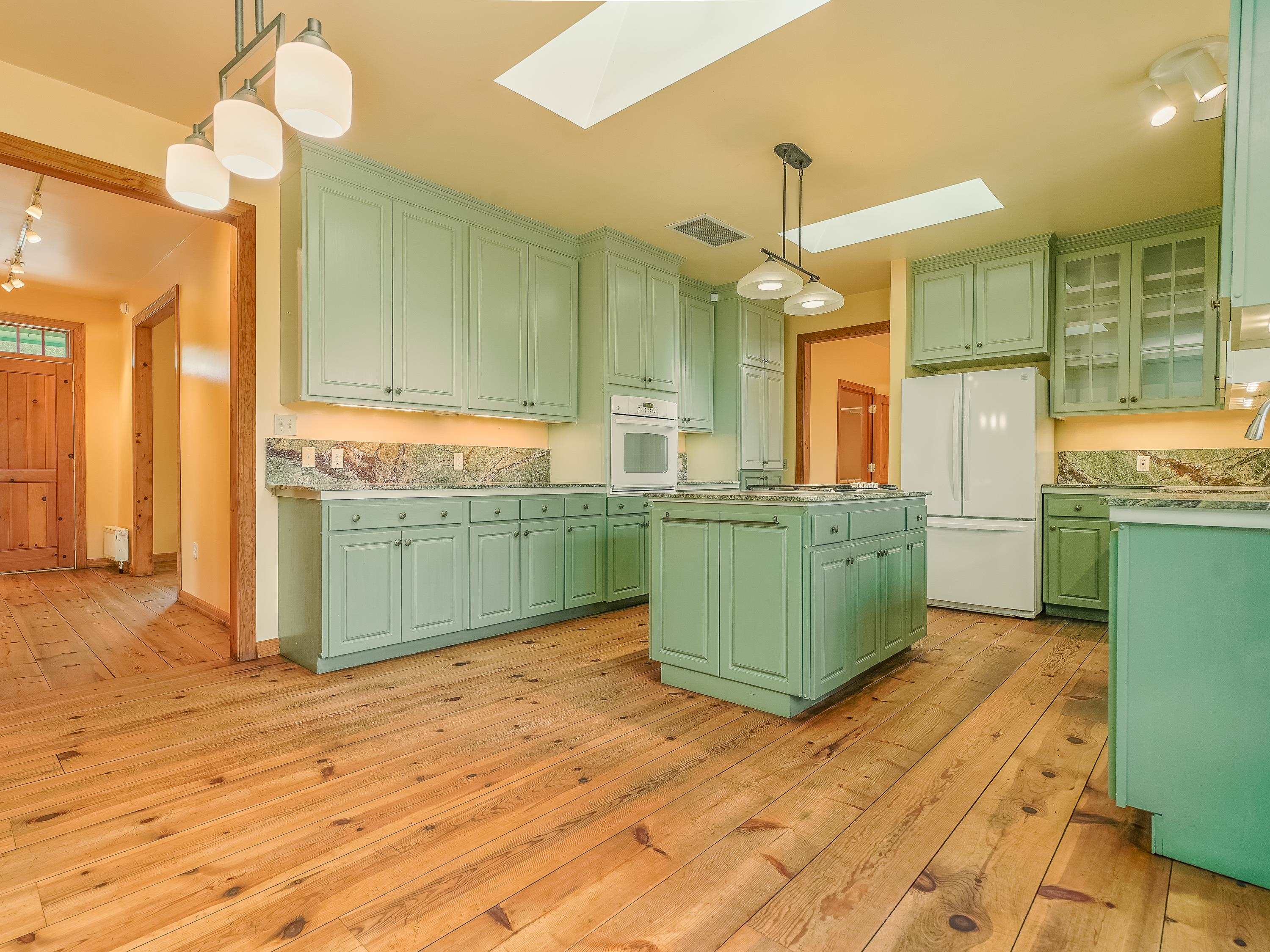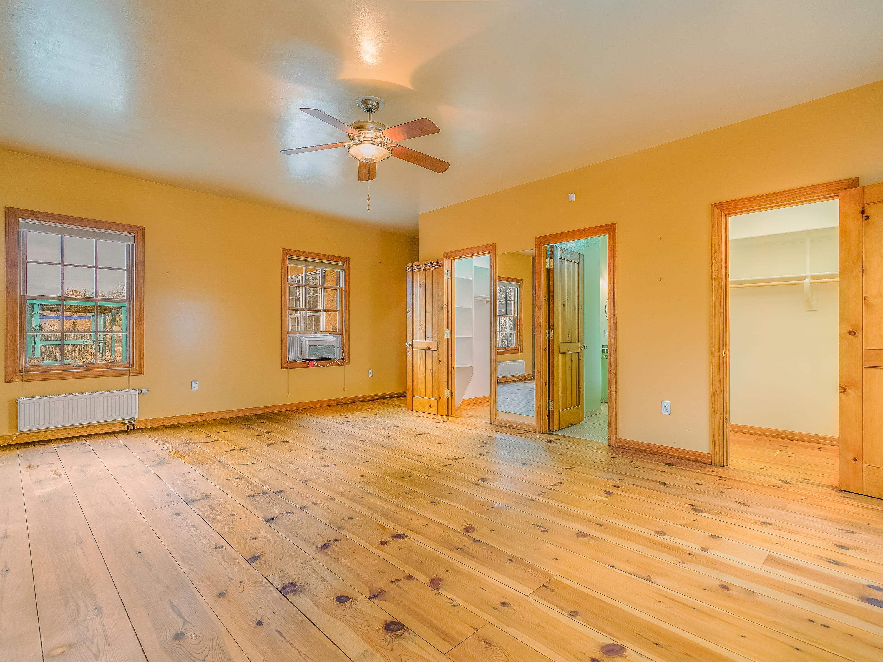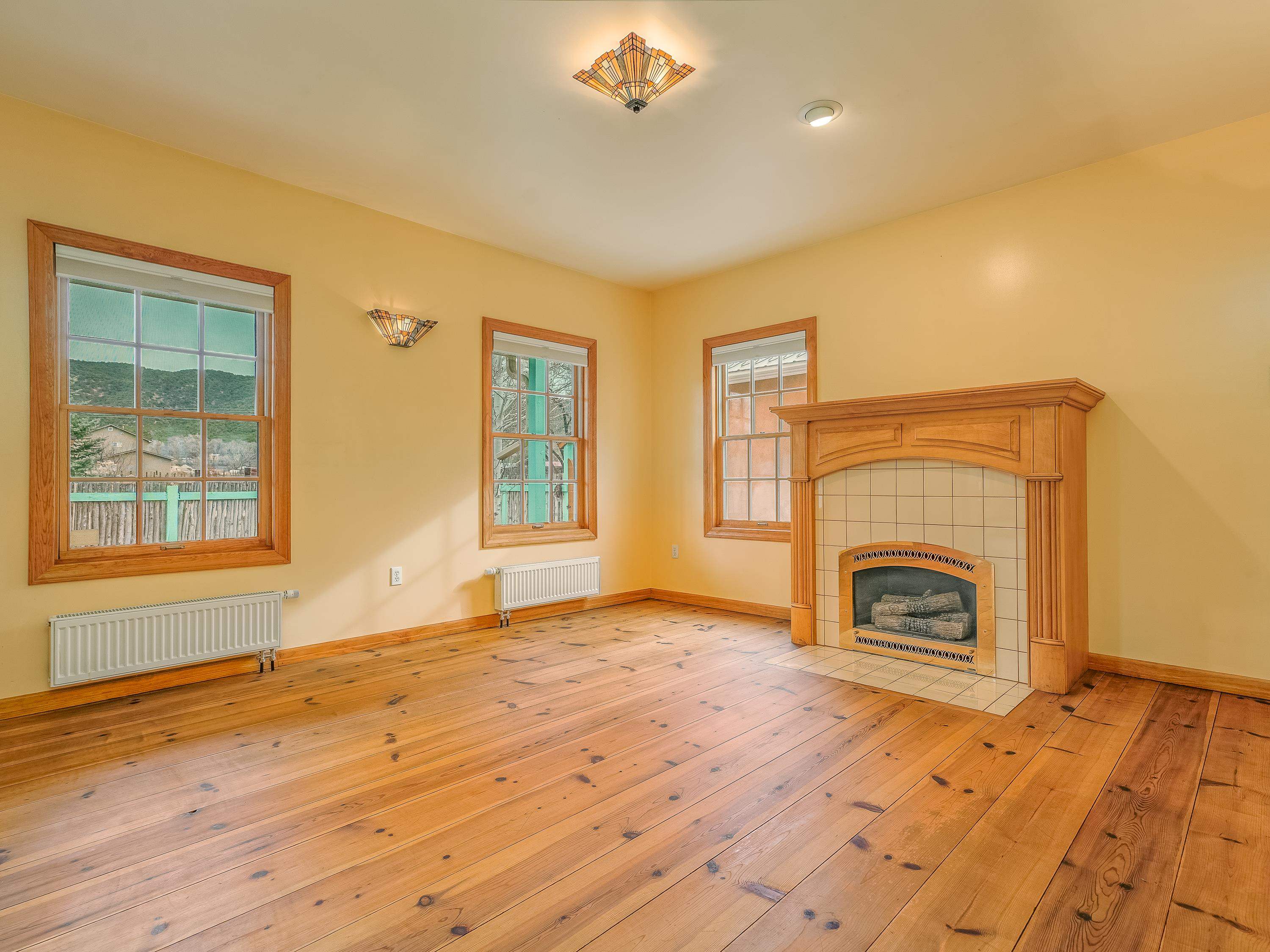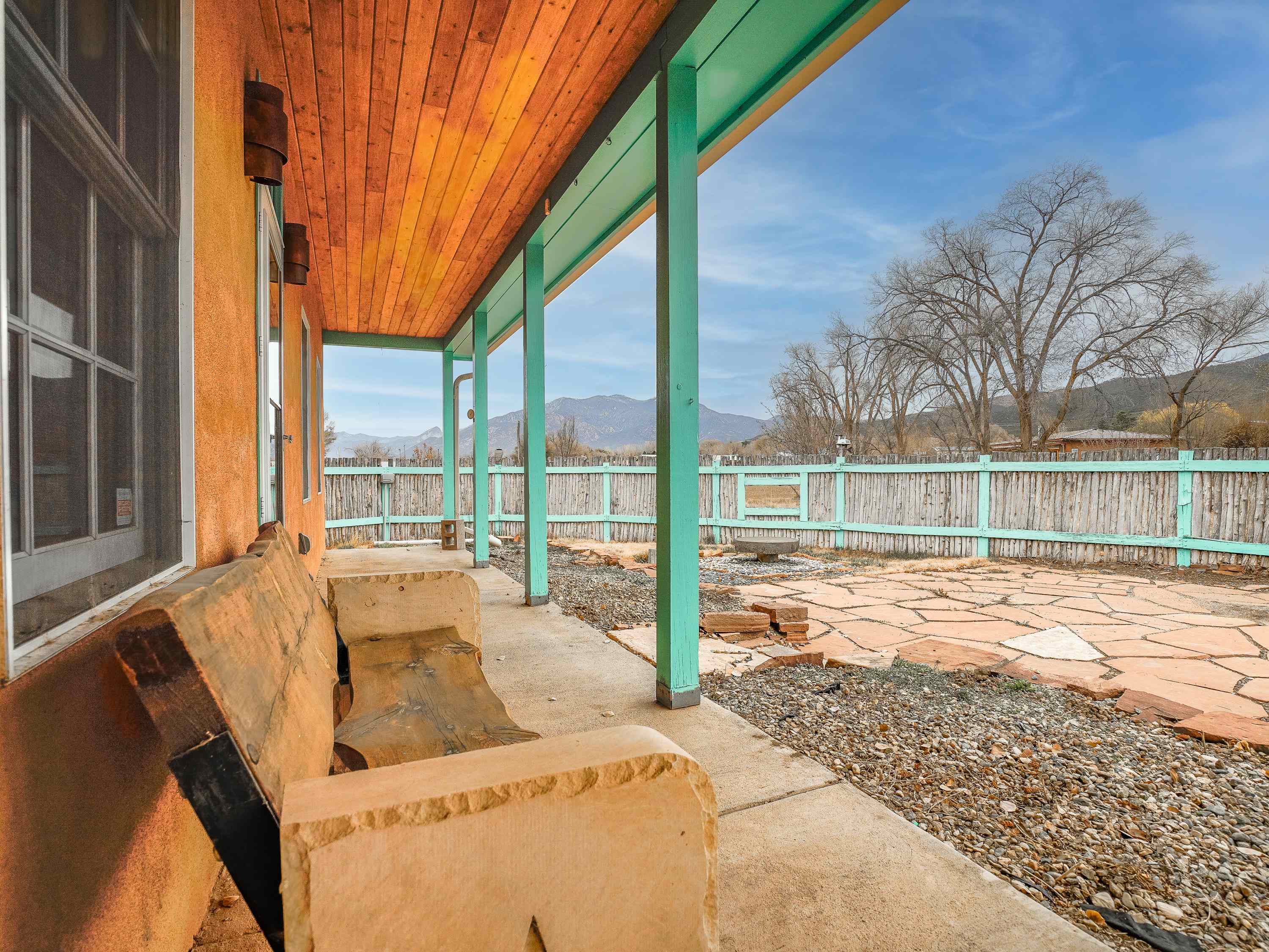 Just Off Kit Carson Road—1.4 Miles from Taos Plaza! This 2-bedroom, 2-bath home plus office offers 2,300 sq. ft. of Territorial-style living on 0.96 fenced acres with stunning north-facing views of the Sangre de Cristo Mountains. Inside, a formal living room with a pine-mantled fireplace sits across from the formal dining room highlighted by an art deco chandelier and sconces. The primary suite features a spacious ensuite and his-and-hers walk-in closets. The chef’s kitchen shines with ample cabinetry, an island, farmhouse sink, skylights, and gorgeous green marble countertops, plus a sunny kitchenette with French doors leading to the patio and cultivated gardens. Solid pine floors run throughout, with tile in the baths, laundry, and utility rooms. The home is comfortably warmed by European Buderus baseboard heating. Pergolas wrap around half the house, and in spring, the yard bursts with red and orange irises and red feathered poppies. Across the street, you can stroll over to the Taos Cow in the Anglada Building for a scoop of homemade ice cream and a taste of local flavor—just one more reason you’ll love calling this Taos retreat home.