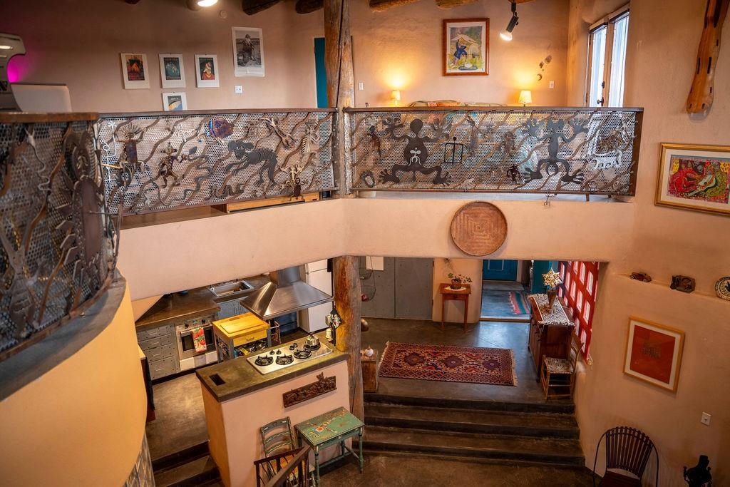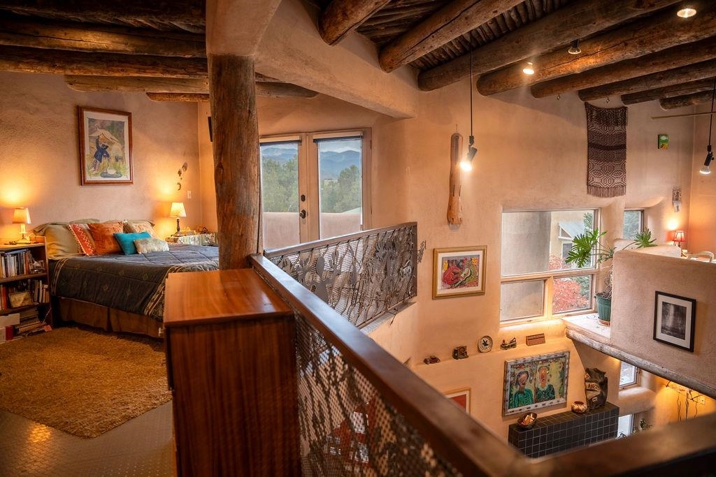 A Work of Art You Can Call Home! Tucked away and nestled amongst mature trees this tranquil and private oasis is truly a hidden treasure! Beautiful two story contemporary Northern NM style main home, guest house and studio at the end of a private road in the foothills. This exquisite home boasts of tasteful architectural details, quality finishes and appointments throughout providing functionality, efficiency, sustainability and pleasing aesthetics. Every corner reveals thoughtful design and craftsmanship, from the interplay of light across tin and latilla ceilings to the sculptural banister crafted by a local metal artist. The result is a home that feels alive with creativity and warmth. Birds eye view decks open to stunning Northern NM vistas, perfect for morning coffee or evening sunsets. Built with pumice-crete insulation, the one bedroom, one bath home stays naturally cool through the summer. The wood burning fireplace provides warmth and comfort during those cold winter months. The kitchen overlooking the living area with high ceilings and abundant natural light creates a welcoming ambience. French doors on the west lead to a patio for dining al fresco or relaxing to the sound of cascading water from the fountain. The guest house with sunroom is light and bright providing two spaces that could be bedrooms and a full bath. Perfect space for family and friends to relax in their own space. Plus, a working studio offers room to create or work remotely. Meandering pathways on 2.16 wooded acres, this sanctuary is a hidden gem waiting to be discovered! Though just minutes from town, the setting feels like a private retreat. Whether you’re looking for a home with room for guests, space for art and work from home, or simply a peaceful sanctuary, this property offers a rare blend of artistry, function, and serenity…the possibilities are endless!