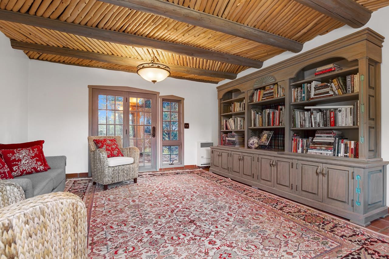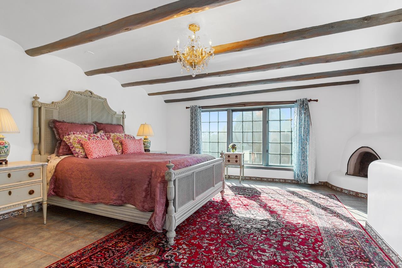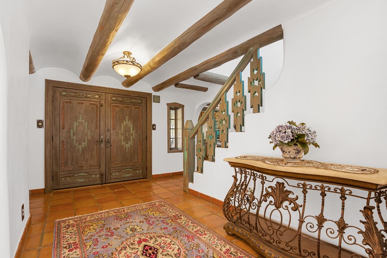 Set amidst the pinon- juniper woodland of the Canon foothills, this beautiful two story, 2400 sq ft, 3 bed and 2 bath adobe home exudes another era – a time when craftsmanship and care reigned supreme. Warm Saltillo tile, rounded plaster walls, large light-filled, mullioned windows, coved ceilings, one-of-a-kind, hand-carved doors in every room, 3 kiva style fireplaces, elaborate tilework throughout - all this just 5 minutes from Taos Plaza. Secluded behind a heavy wooden gates this 1 acre compound comes with a detached dance studio, a 1-car garage and flag stone walkways that lead to terraced gardens. Built in 1975, this lovely home has been lovingly maintained and updated and expanded over the years. Walking down past a giant wisteria, you pass beds of roses and native perennials and then you enter through those dramatic unforgettable front doors with the intaglio images of a dancer over the classic Zia sun. The bright foyer with coved vigas leads to living room centered around a fireplace with niches and a long banco. The guest wing with two spacious bedrooms is past the living room. Head In the other direction to get to the well-appointed kitchen where ample oak cabinets are wrapped around a tile clad island that will be the hang out spot of the home. Beyond is the dining room with its own kiva style fireplace and French doors leading out to the west facing patio where you can entertain al fresco to those famous Taos sunsets and colorful skies. Up a couple of steps from the kitchen is a library with built in shelves and another way to slip out to the southside gardens. Up the stairs with the elaborately carved balustrade you arrive at the 580 sq ft primary suite with windows facing werst and giving you views of el Pedernal and the Jemez mountains. The spacious bedroom leads to a dressing area and then to a sumptuous bath centered around a jetted tub and separate shower with windows looking over the valley below. Detached from the house is mirror-walled dance studio with a sprung-oak floor where the owner offered flamenco classes and recitals. And attached to that is the single car garage with lots of storage in back. Come take a look at this one of a kind, jewelbox of a home that takes you away from a life of bland.