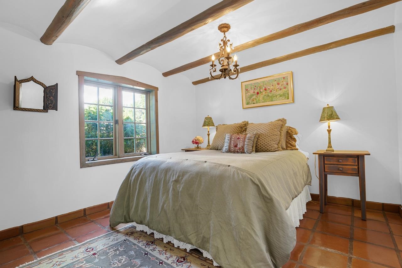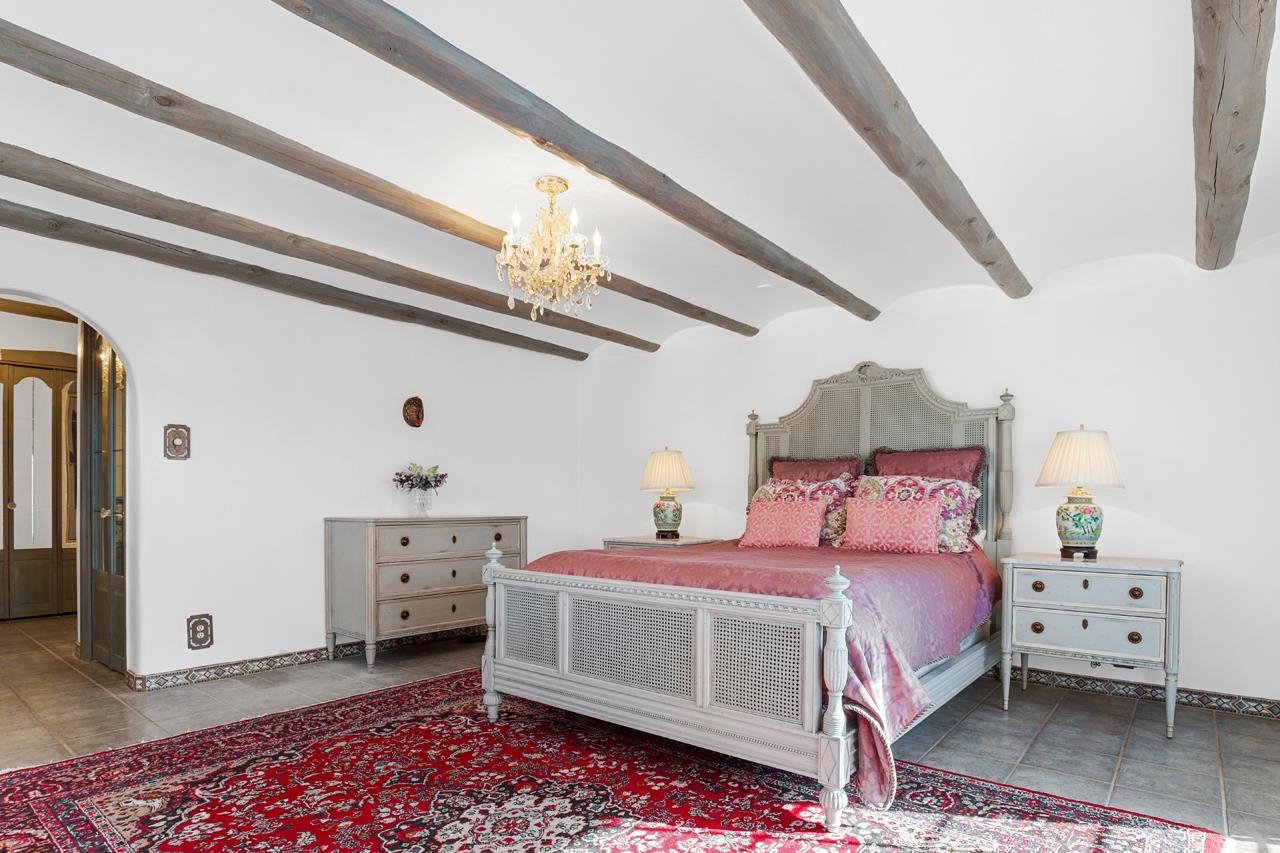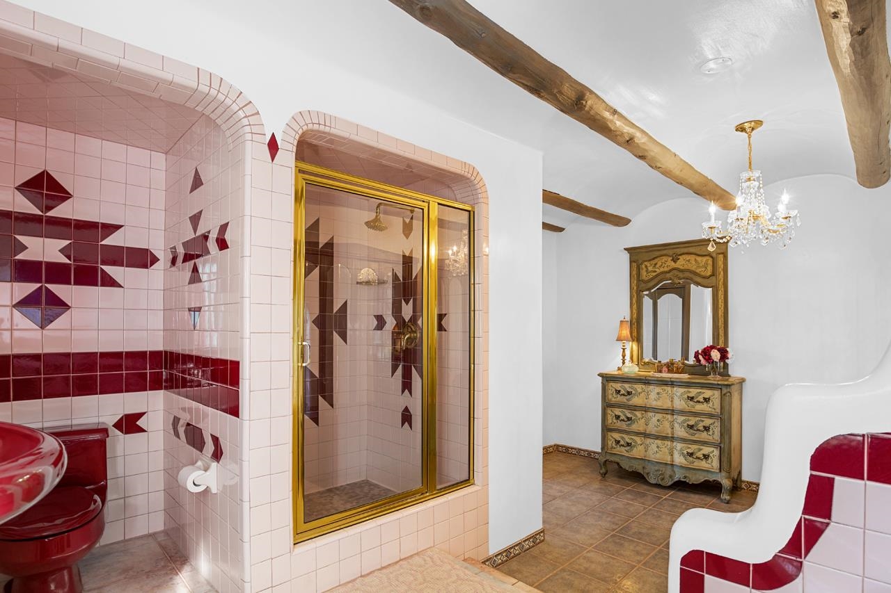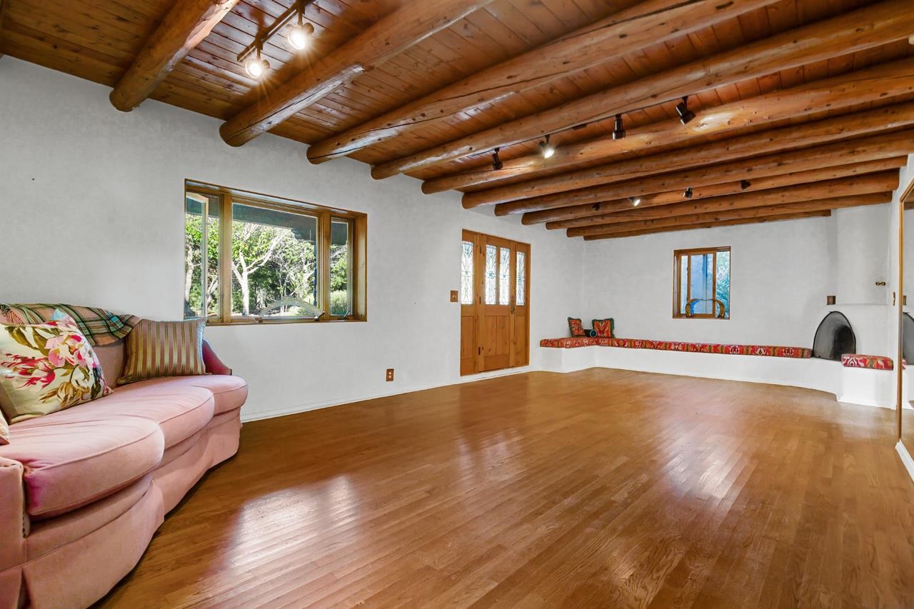 Set amidst the pinon- juniper woodland of the Canon foothills, this beautiful two story, 2400 sq ft, 3 bed and 2 bath adobe home exudes another era – a time when craftsmanship and care reigned supreme. Warm Saltillo tile, rounded plaster walls, large light-filled, mullioned windows, coved ceilings, one-of-a-kind, hand-carved doors in every room, 3 kiva style fireplaces, elaborate tilework throughout - all this just 5 minutes from Taos Plaza. Secluded behind a heavy wooden gates this 1 acre compound comes with a detached dance studio, a 1-car garage and flag stone walkways that lead to terraced gardens. Built in 1975, this lovely home has been lovingly maintained and updated and expanded over the years. Walking down past a giant wisteria, you pass beds of roses and native perennials and then you enter through those dramatic unforgettable front doors with the intaglio images of a dancer over the classic Zia sun. The bright foyer with coved vigas leads to living room centered around a fireplace with niches and a long banco. The guest wing with two spacious bedrooms is past the living room. Head In the other direction to get to the well-appointed kitchen where ample oak cabinets are wrapped around a tile clad island that will be the hang out spot of the home. Beyond is the dining room with its own kiva style fireplace and French doors leading out to the west facing patio where you can entertain al fresco to those famous Taos sunsets and colorful skies. Up a couple of steps from the kitchen is a library with built in shelves and another way to slip out to the southside gardens. Up the stairs with the elaborately carved balustrade you arrive at the 580 sq ft primary suite with windows facing werst and giving you views of el Pedernal and the Jemez mountains. The spacious bedroom leads to a dressing area and then to a sumptuous bath centered around a jetted tub and separate shower with windows looking over the valley below. Detached from the house is mirror-walled dance studio with a sprung-oak floor where the owner offered flamenco classes and recitals. And attached to that is the single car garage with lots of storage in back. Come take a look at this one of a kind, jewelbox of a home that takes you away from a life of bland.