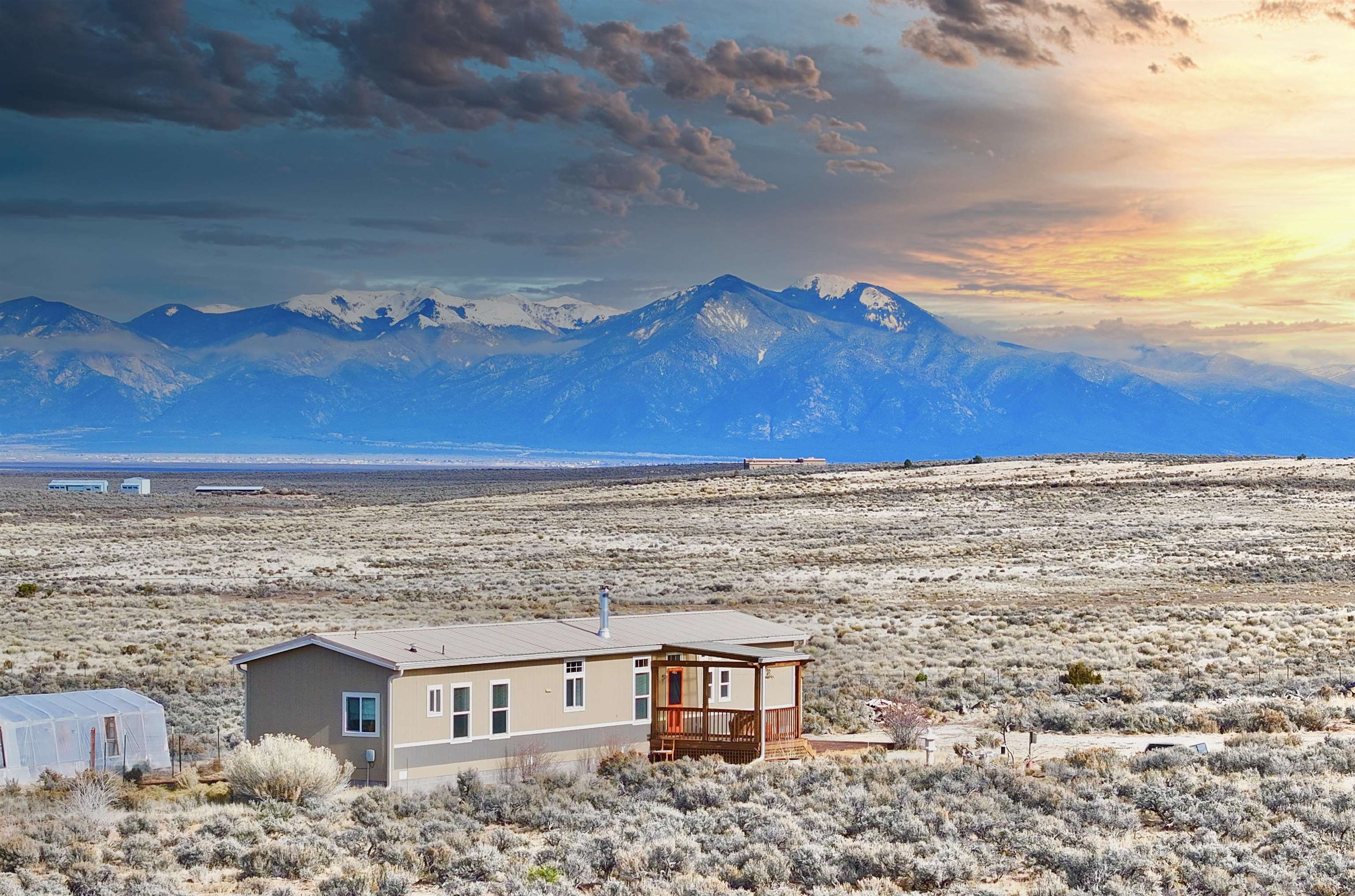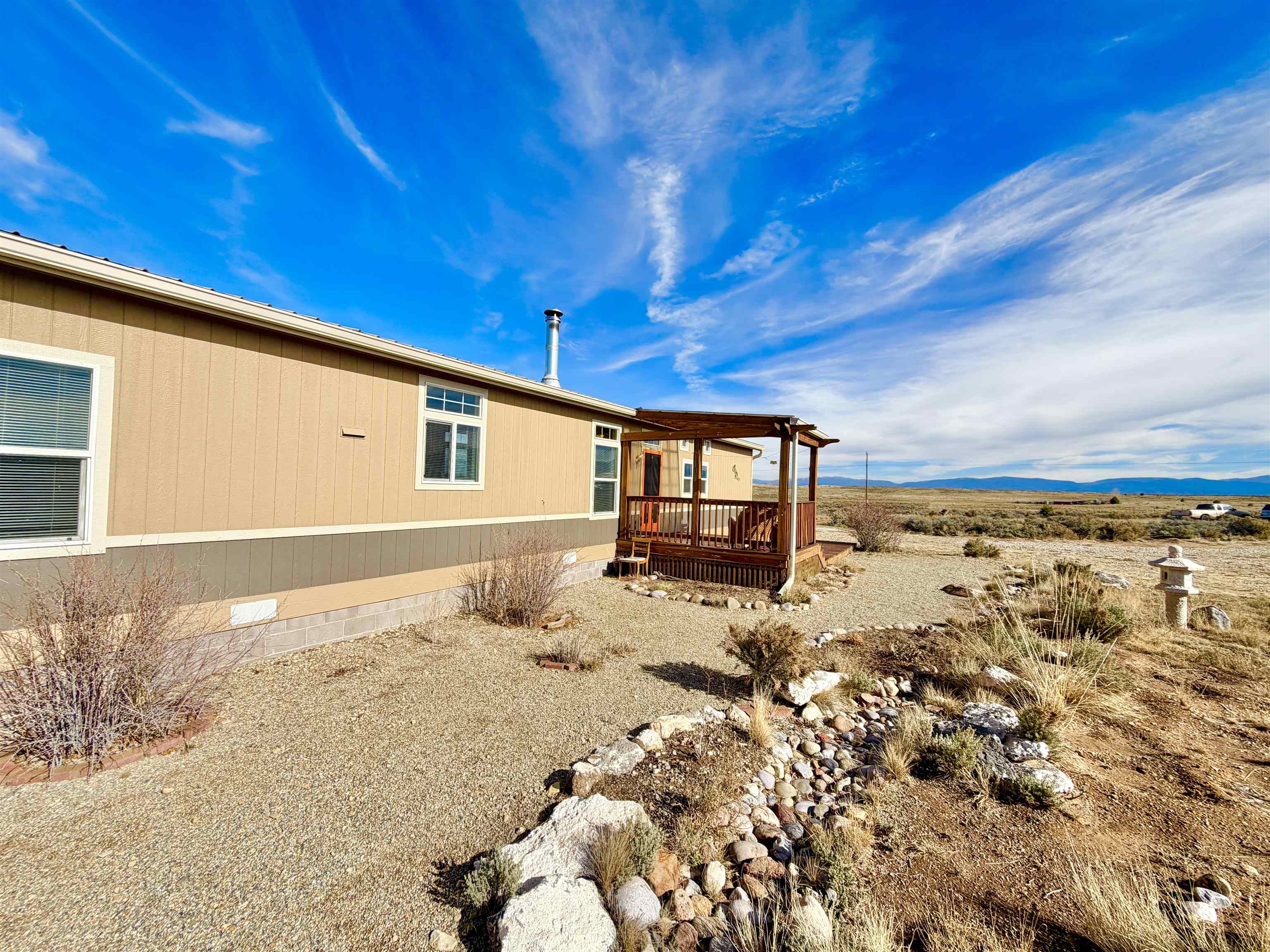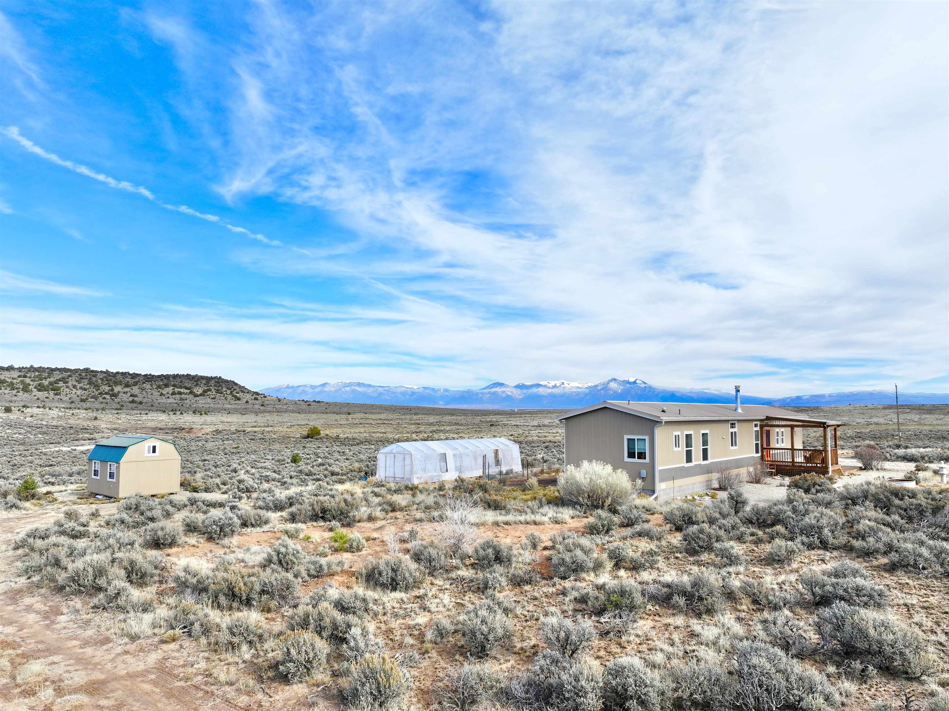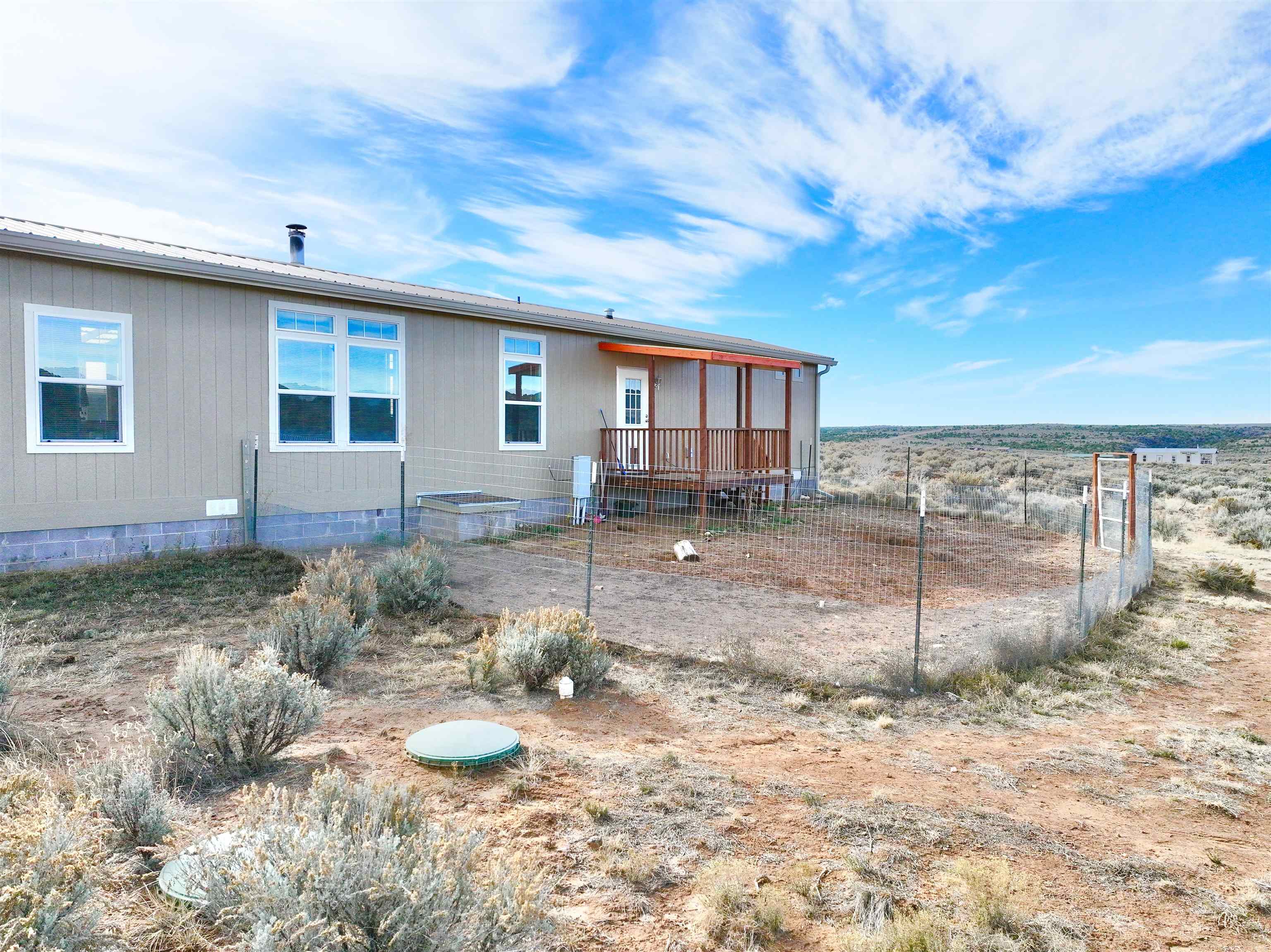 Seller offering a 5,000 credit to buyer. A spacious and picturesque home nestled amidst the serene landscapes of Carson, New Mexico, awaits your discovery. Only a short drive off the highway, this meticulously maintained 1175 square foot, two-bedroom, two-bathroom manufactured home is situated on a substantial 10-acre lot at the southernmost slope of Tres Orejas Mountain. The property boasts a convenient two-car carport and shed, providing ample storage space or the potential for a studio or workshop. Surrounded by tranquility, the property is home to the enchanting sounds of birdsong and the occasional sighting of wildlife. The western section of the property leads to a breathtaking canyon. This spectacular property has hiking trails nearby the lot that offer an array of adventures and unforgettable memories to be made. The expansive front yard is overlooked by a charming south-facing deck and covered porch, inviting you to unwind and enjoy breathtaking sunsets and endless skies. The home’s interior exudes a modern ambiance, featuring beautifully executed texture walls, tile and Purgo-style flooring. It is equipped with modern appliances, high-quality windows, and comprehensive up-fittings. The house is heated by forced air and complemented by a wood-burning stove. A north-facing deck adds a touch of elegance to the backyard, where you may encounter sightings of deer, elk, coyotes, and other wildlife. The property is securely fenced at its boundaries with barbed wire, and additional coyote fencing is strategically placed in the back yard. Within proximity, you will find the vibrant community of Ojo Caliente and its renowned hot springs, conveniently located just 16 miles away. Additionally, the Rio Grande Gorge Bridge, Taos Junction Bridge, and Rio Grande access are situated within a short distance, approximately 12, 6.1, and 6 miles respectively. The property is conveniently situated approximately 30 minutes from the iconic Taos Plaza, offering easy access to the town’s attractions and amenities. Don’t miss out on this extraordinary opportunity to experience the cozy charm of this remarkable home nestled amidst the breathtaking beauty of Carson, New Mexico. Home is anchored, title is deactivated and is being assessed as real property.