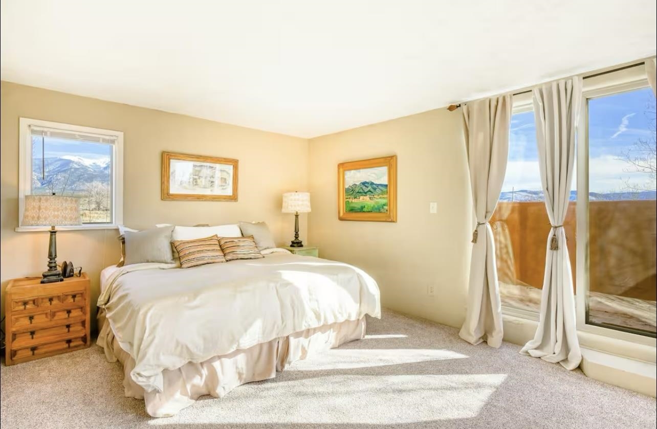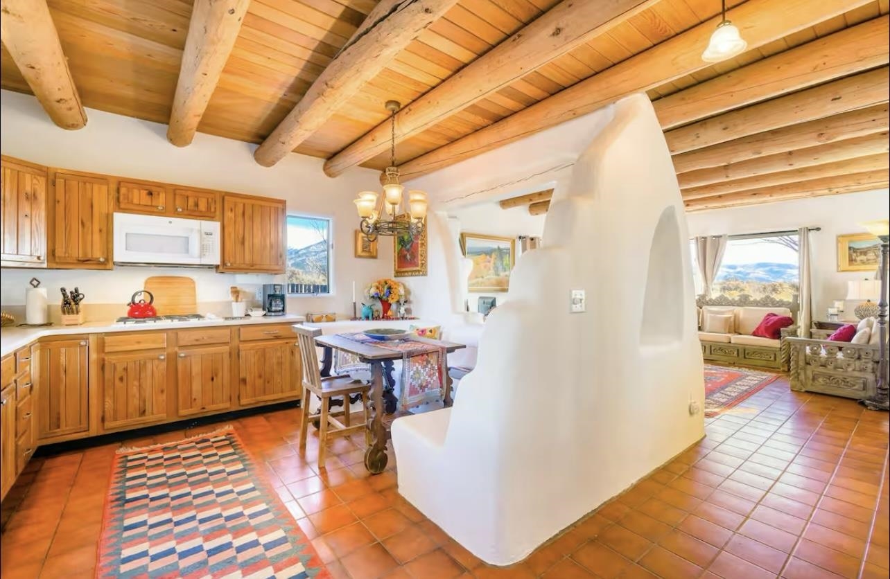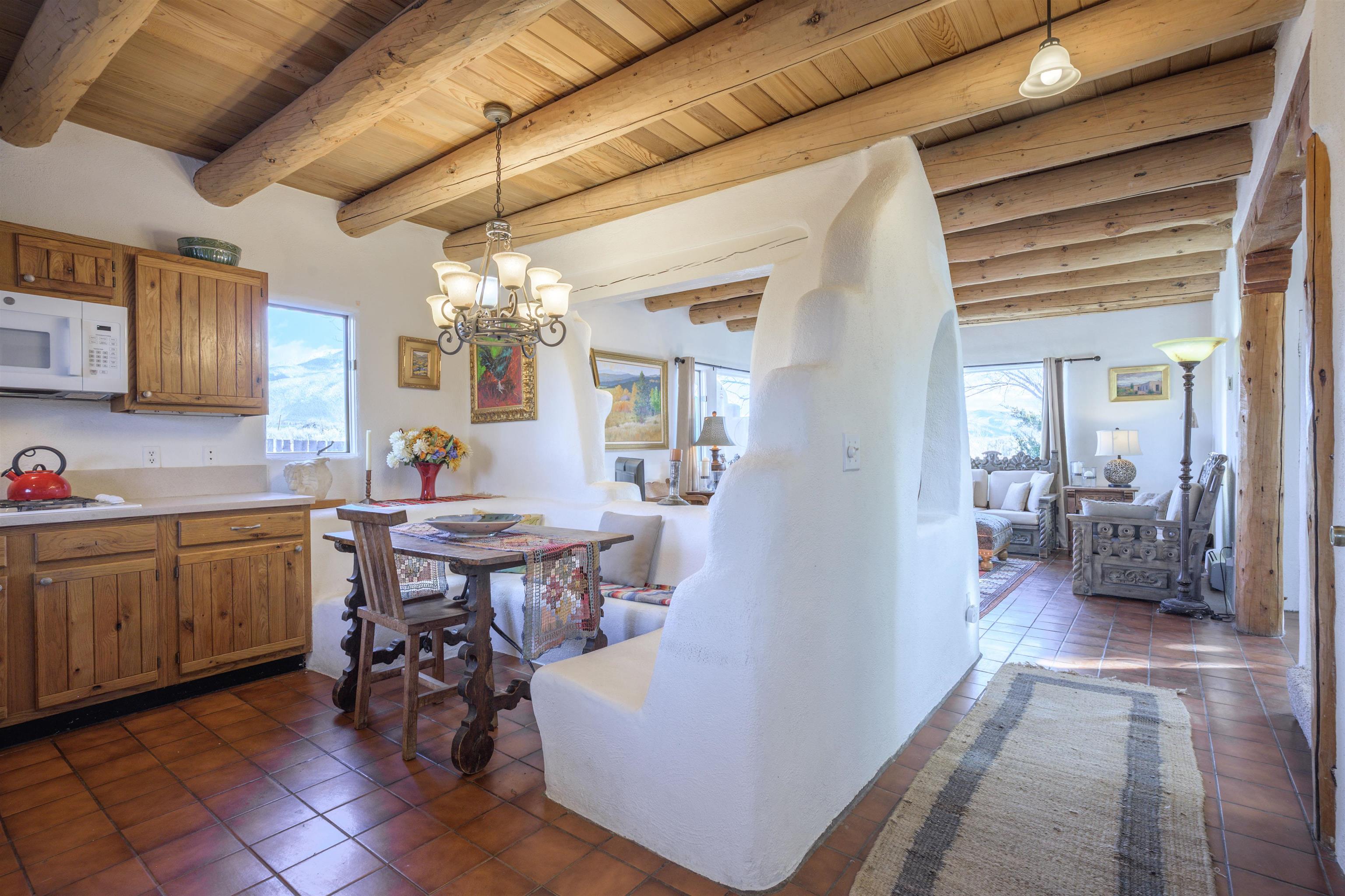 Discover classic Northern New Mexico charm in this beautifully maintained end-unit townhouse perfectly positioned between Arroyo Seco, the Town of Taos, and Taos Ski Valley. Warm architectural details—including vigas, Saltillo-style tile, carved wood accents, and hand-troweled plaster walls—give the home an inviting Southwestern character from the moment you step inside. The main level features a bright, open living area with large windows framing stunning mountain views, plus a cozy kiva-style fireplace that anchors the space. The adjacent kitchen offers generous counter space, natural wood cabinetry, and a built-in banco dining nook with sculpted adobe forms that echo traditional Taos design. A full bath with laundry adds convenient functionality on the first floor. Upstairs, both bedrooms are filled with natural light and offer access to outdoor spaces with views of the Sangre de Cristo range. The primary bedroom includes a spacious sunroom-style nook—ideal for a home office, reading area, or meditation retreat. A large second full bath with dual Talavera sinks completes the upper level. Outdoor living areas include a private walled courtyard off the kitchen and additional fenced space suitable for pets or gardening. A detached one-car carport adds covered parking and storage options. With only four units and no HOA or condo dues, this property offers rare tranquility with unbeatable proximity to skiing, hiking, dining, and the vibrant culture of Taos and Arroyo Seco. A wonderful opportunity to enjoy the best of Northern New Mexico living.