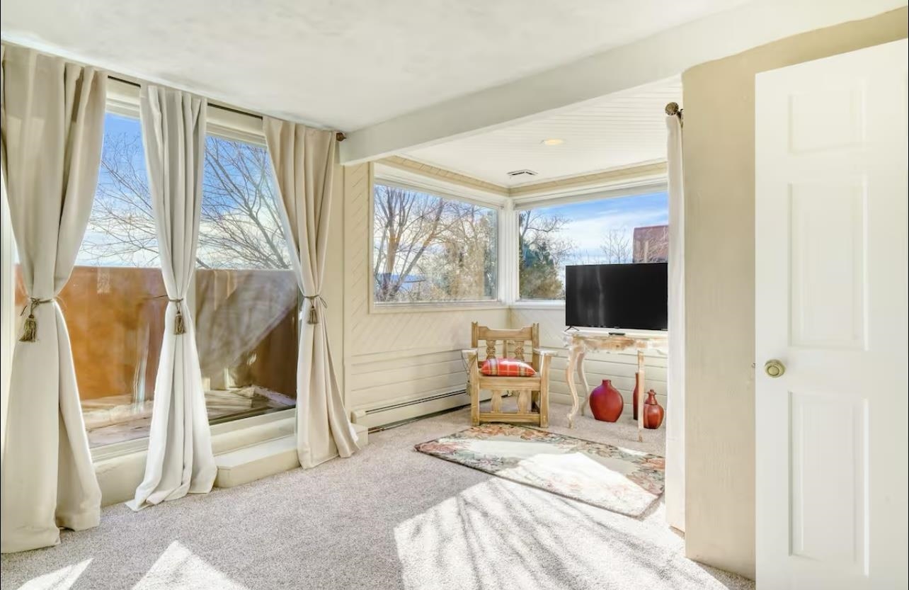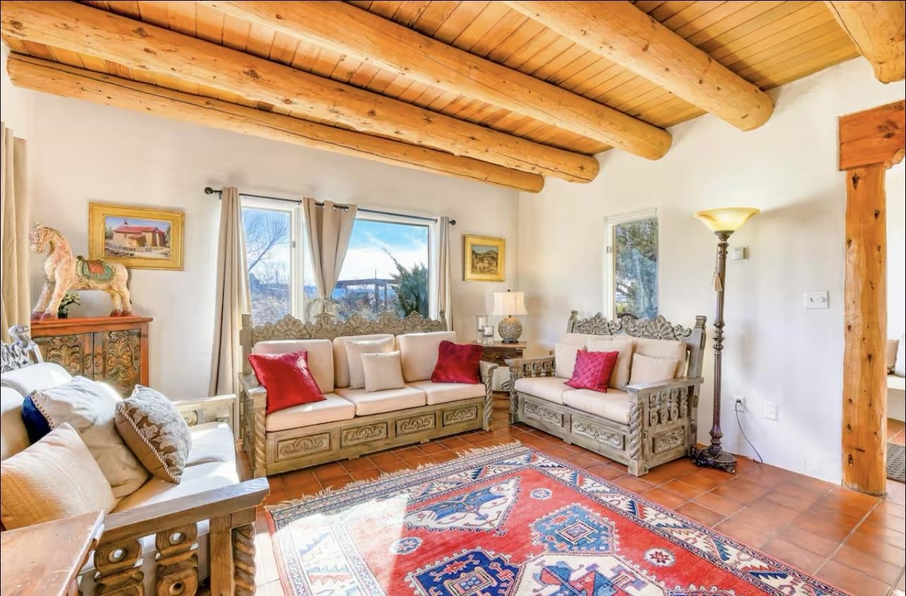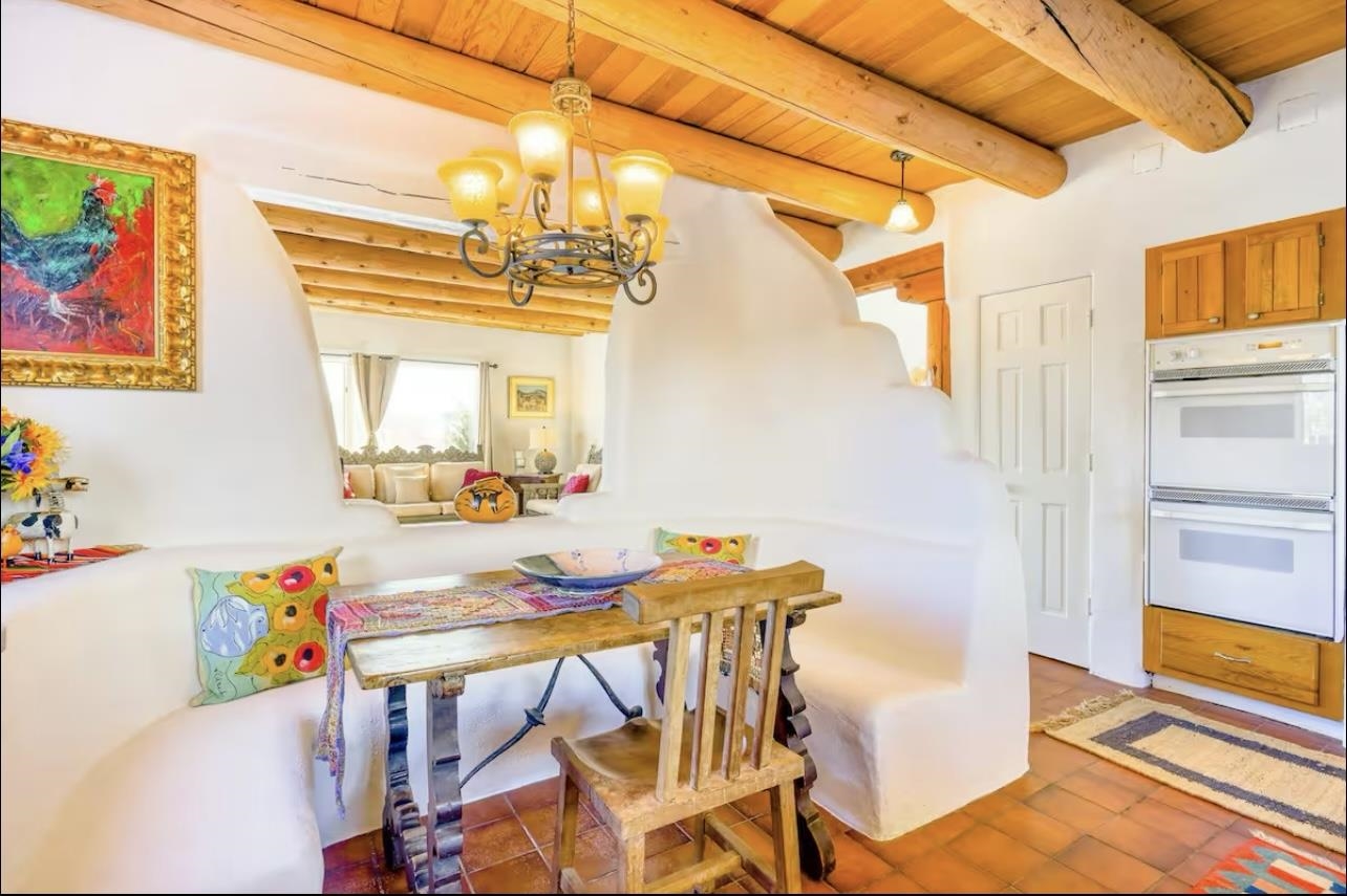 Discover classic Northern New Mexico charm in this beautifully maintained end-unit townhouse perfectly positioned between Arroyo Seco, the Town of Taos, and Taos Ski Valley. Warm architectural details—including vigas, Saltillo-style tile, carved wood accents, and hand-troweled plaster walls—give the home an inviting Southwestern character from the moment you step inside. The main level features a bright, open living area with large windows framing stunning mountain views, plus a cozy kiva-style fireplace that anchors the space. The adjacent kitchen offers generous counter space, natural wood cabinetry, and a built-in banco dining nook with sculpted adobe forms that echo traditional Taos design. A full bath with laundry adds convenient functionality on the first floor. Upstairs, both bedrooms are filled with natural light and offer access to outdoor spaces with views of the Sangre de Cristo range. The primary bedroom includes a spacious sunroom-style nook—ideal for a home office, reading area, or meditation retreat. A large second full bath with dual Talavera sinks completes the upper level. Outdoor living areas include a private walled courtyard off the kitchen and additional fenced space suitable for pets or gardening. A detached one-car carport adds covered parking and storage options. With only four units and no HOA or condo dues, this property offers rare tranquility with unbeatable proximity to skiing, hiking, dining, and the vibrant culture of Taos and Arroyo Seco. A wonderful opportunity to enjoy the best of Northern New Mexico living.