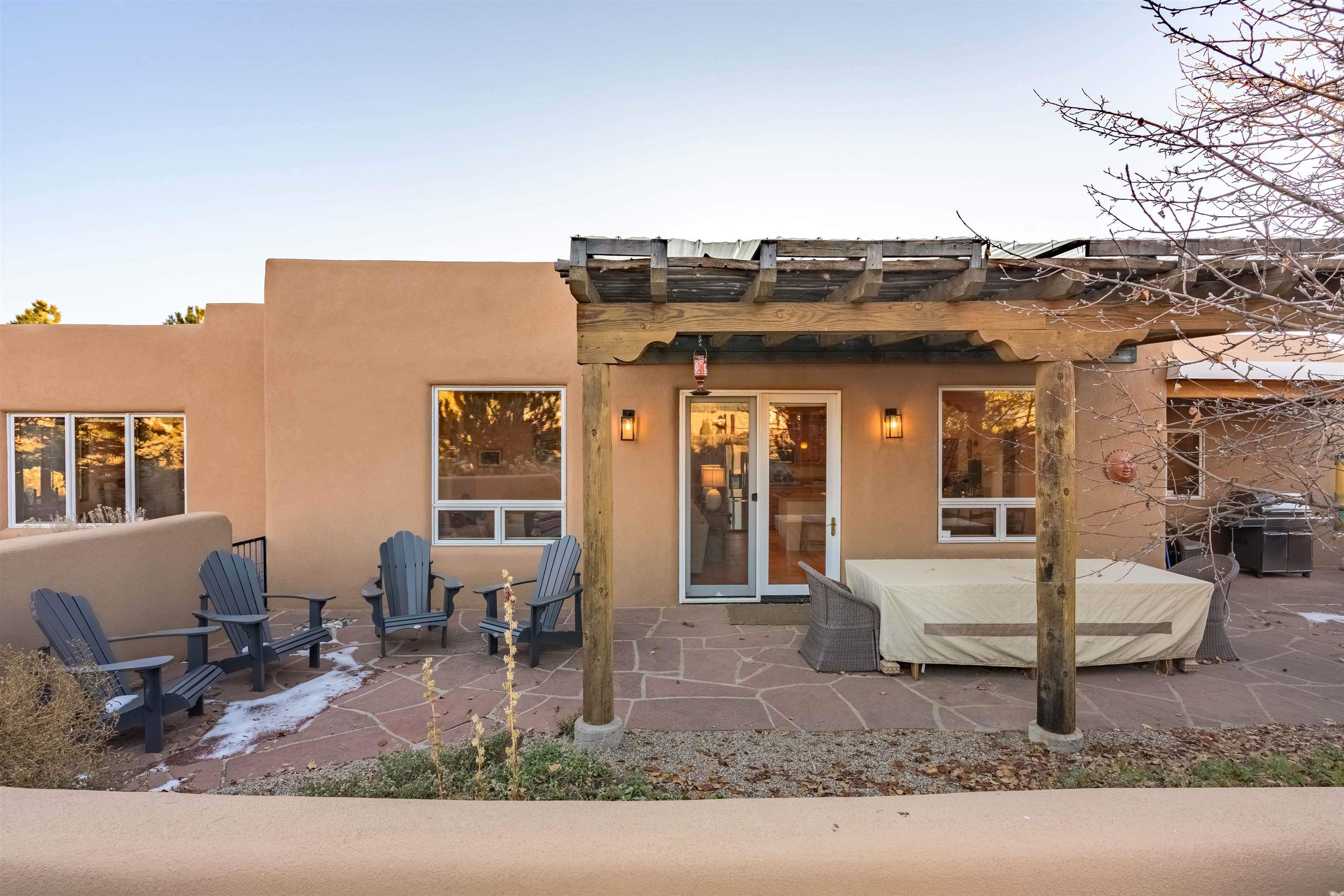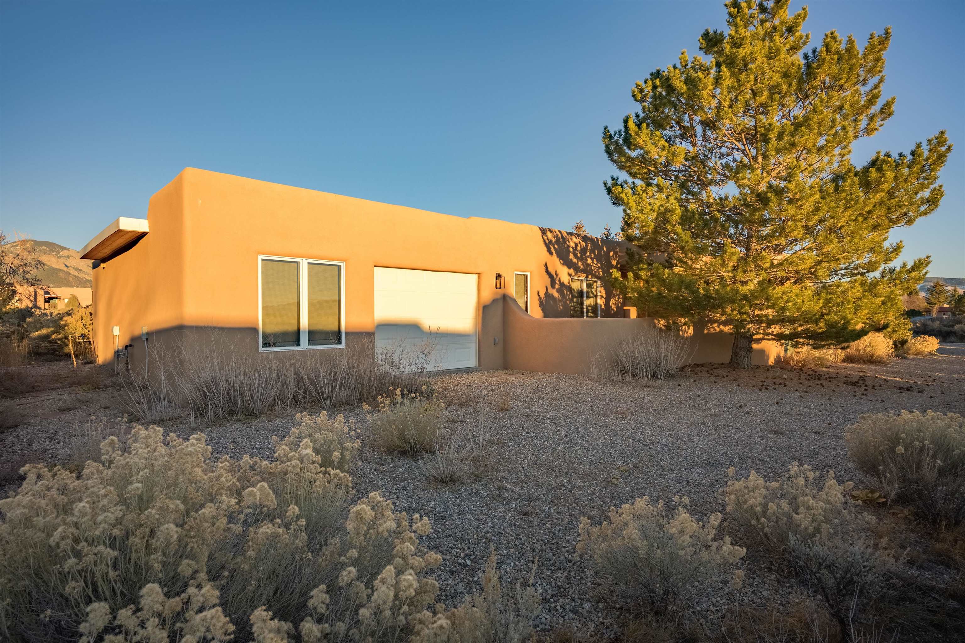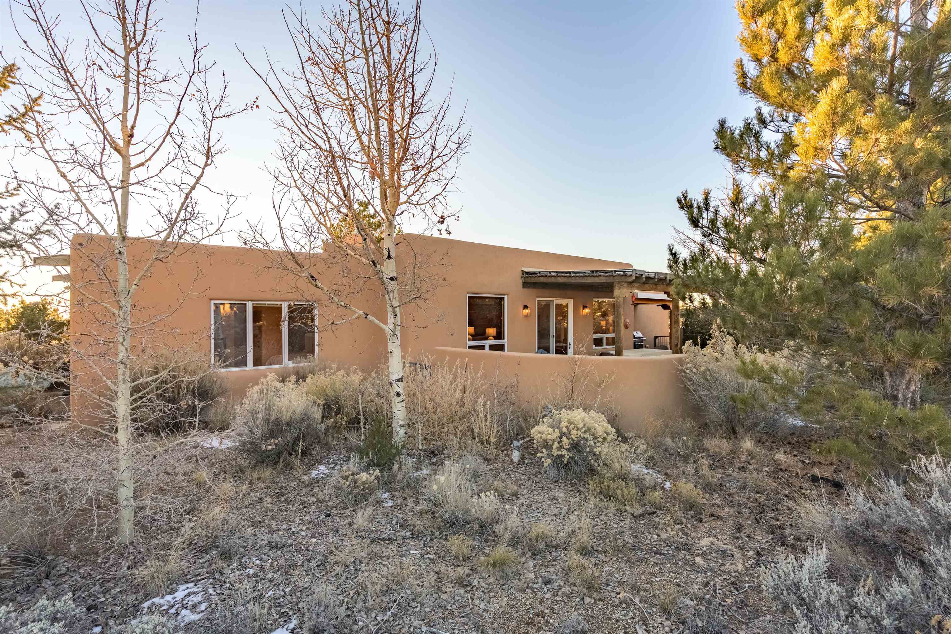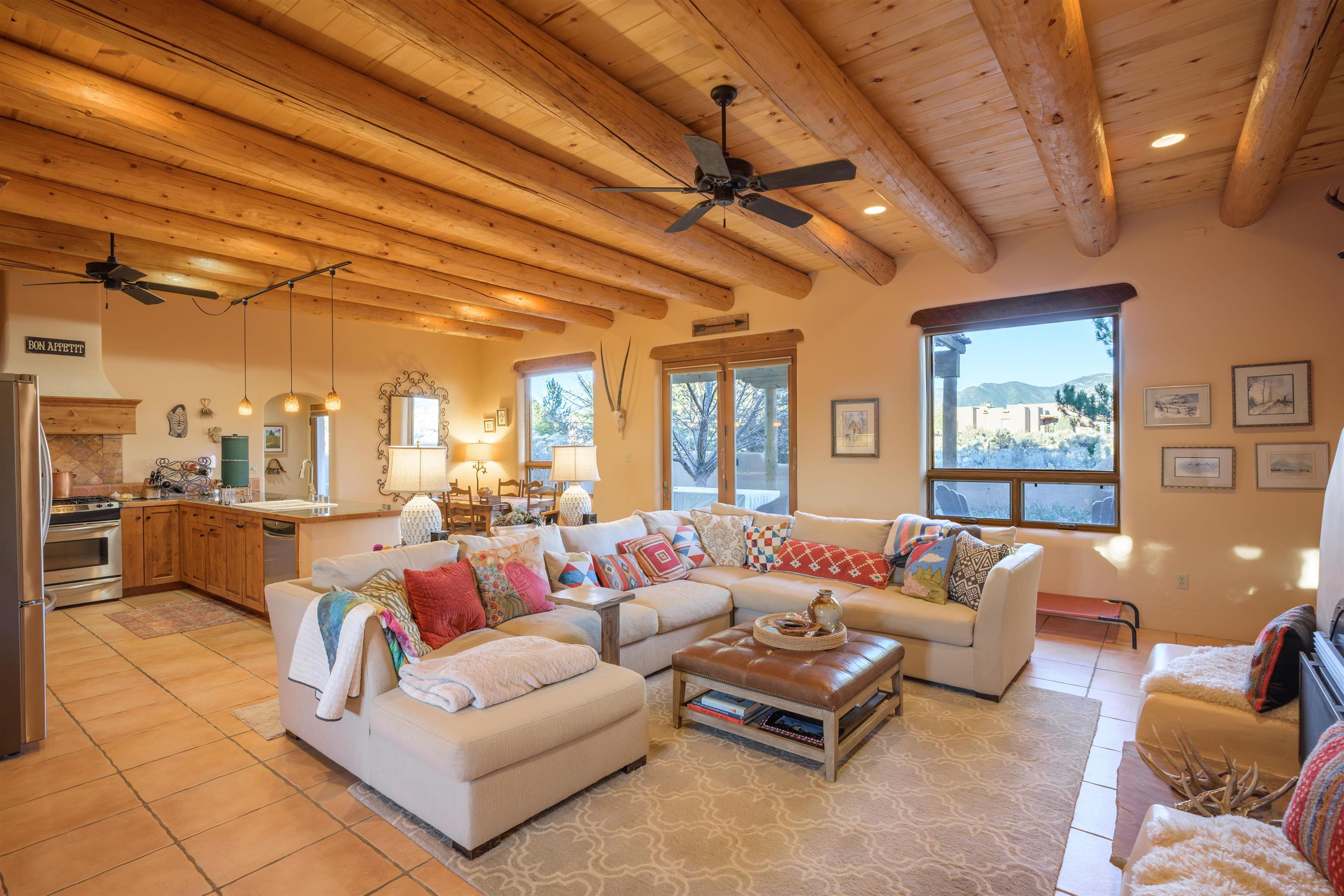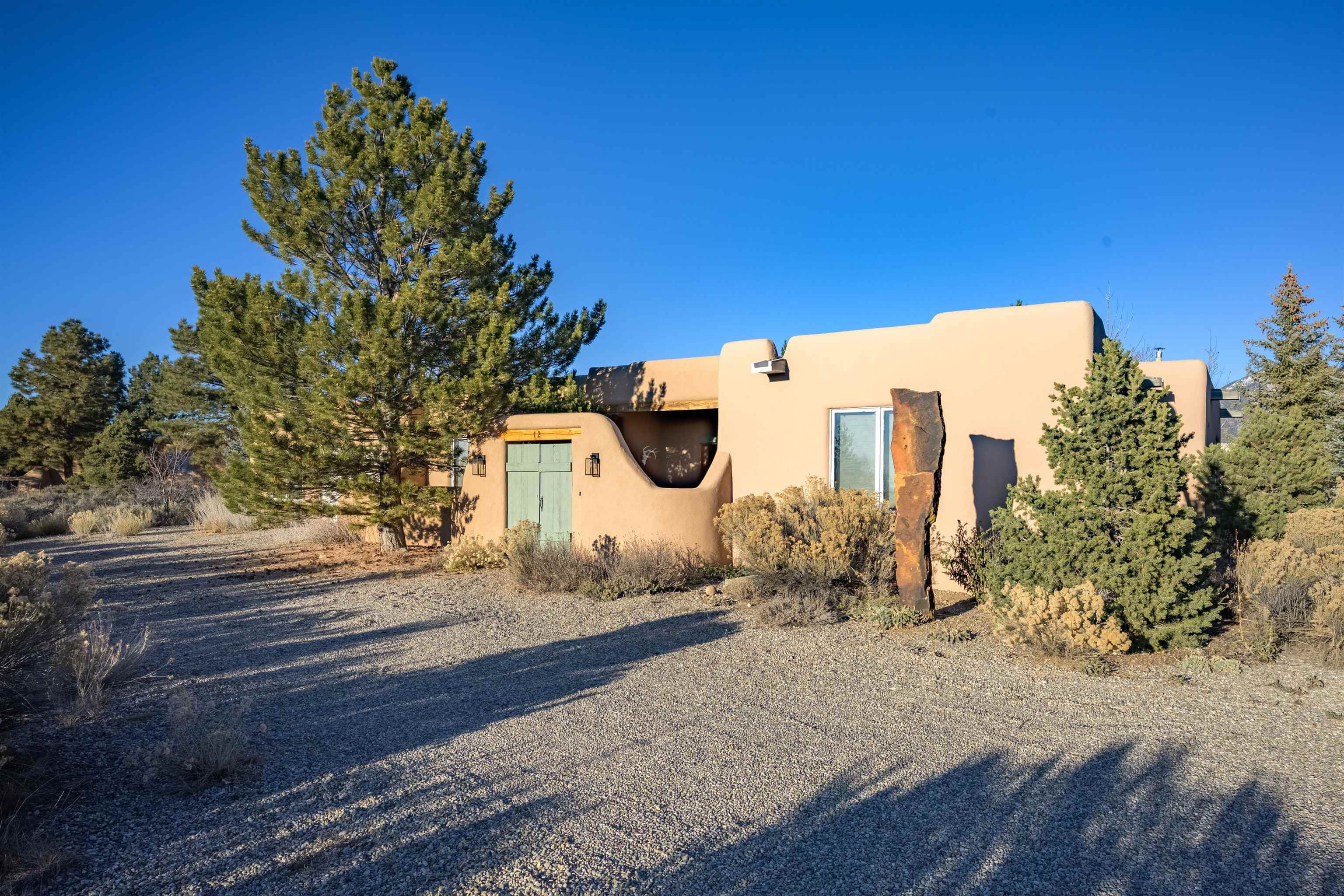 Charming Pueblo-style adobe home in Upper Colonias, featuring 3 bedrooms, 3 baths, and 2,563 sq. ft. of comfortable living space. The open floor plan showcases dramatic high ceilings, large vigas, and a welcoming kiva fireplace with bancos, creating a warm and inviting great room. Situated on a private .946-acre lot surrounded by mature aspen and pine trees, the home boasts stunning views of Taos Mountain. A rear courtyard, accessible directly from the great room, offers the perfect setting for entertaining, outdoor dining, or simply enjoying the serene mountain scenery. The kitchen is equipped with stylish cabinetry and a Professional Series range and oven, complemented by ceramic tile flooring throughout. The primary bath features both a soaking tub and a separate shower. The garage has been partially converted into a studio/workshop, adding versatility to the home. Ceiling fans throughout enhance comfort, and recent updates—including a new roof, new stucco, and a new boiler—ensure peace of mind. Conveniently located near the Town of Taos and Taos Ski Valley, this meticulously maintained home combines classic adobe charm with modern conveniences. The sale of the property includes all furniture and furnishings, providing a move-in ready experience.