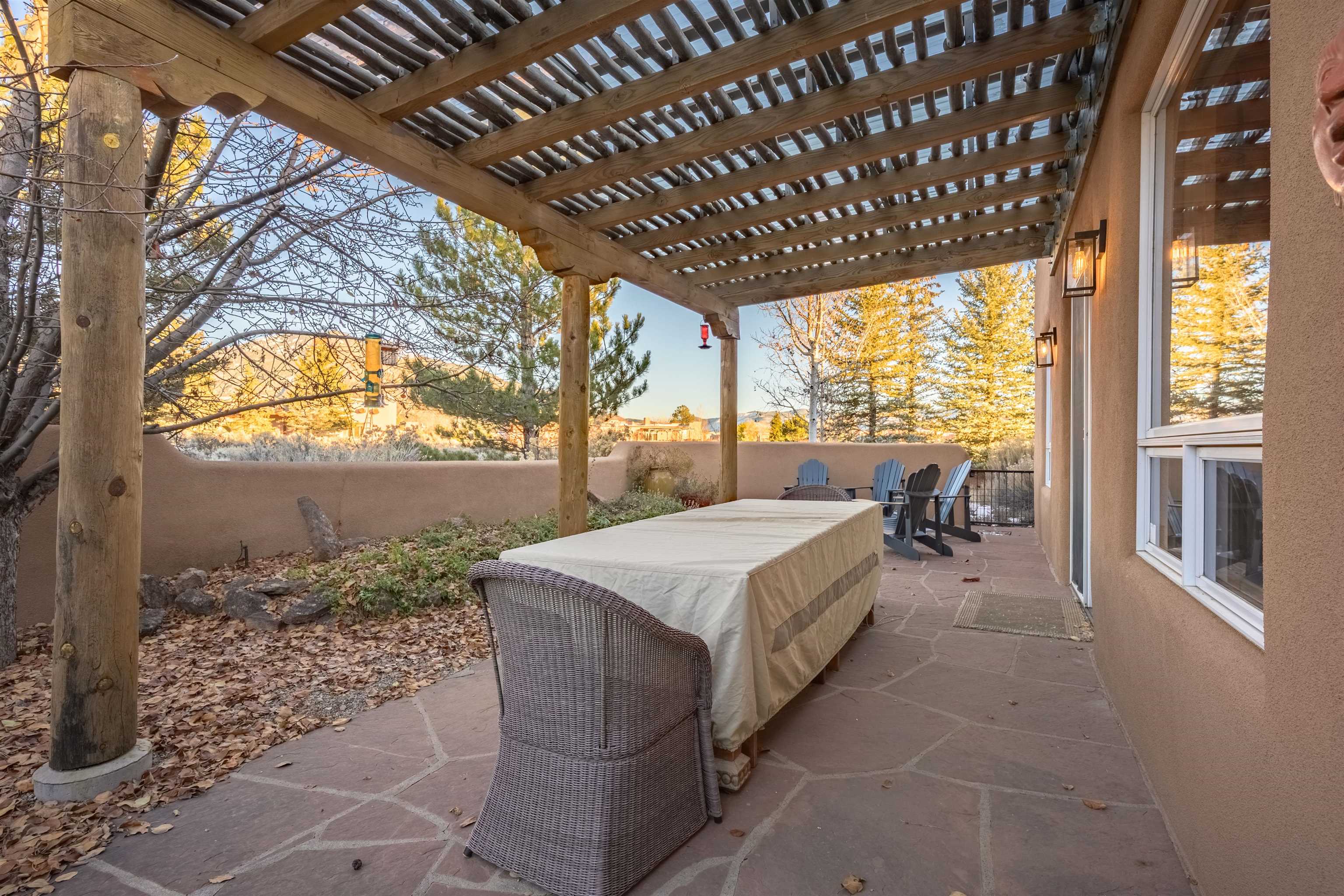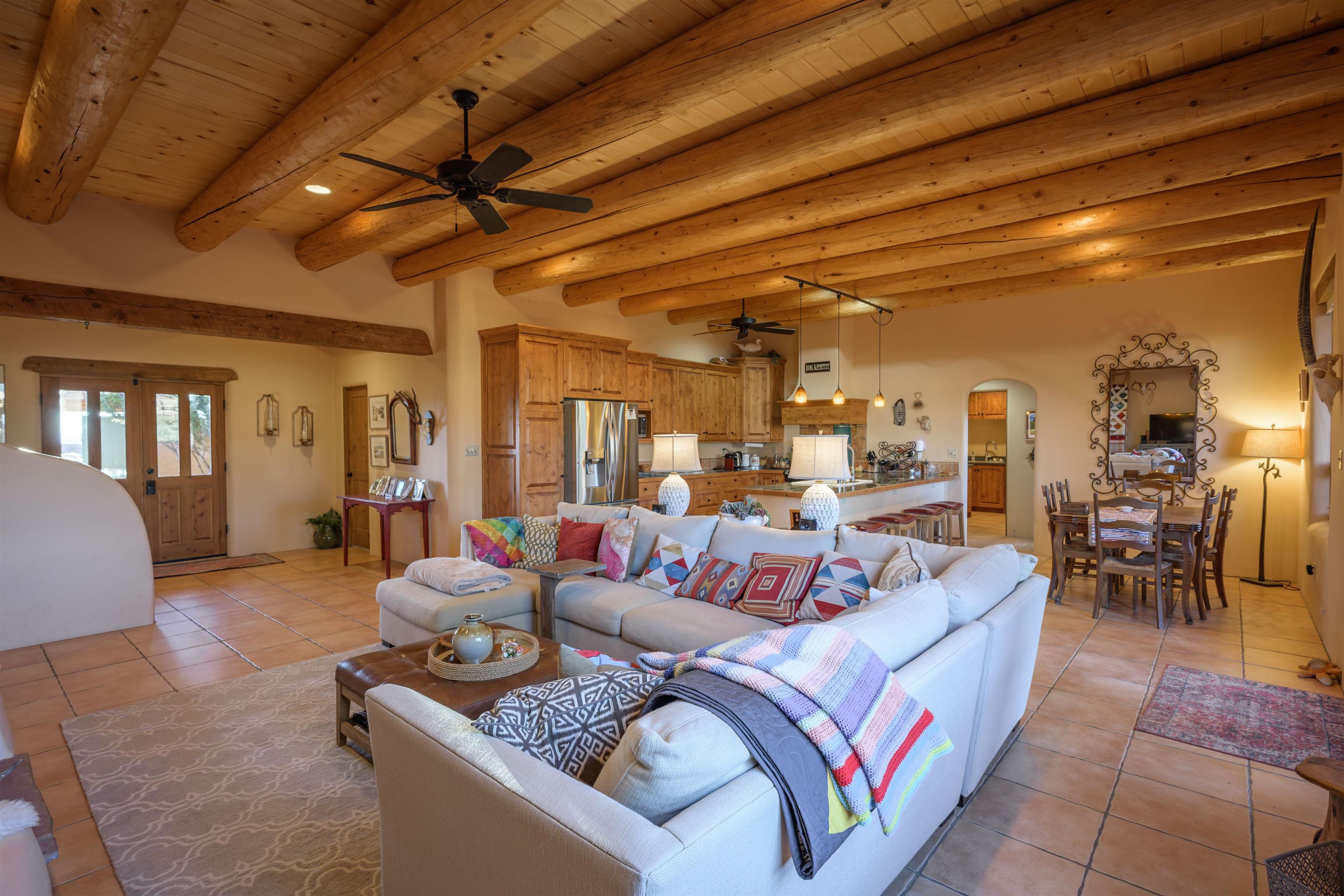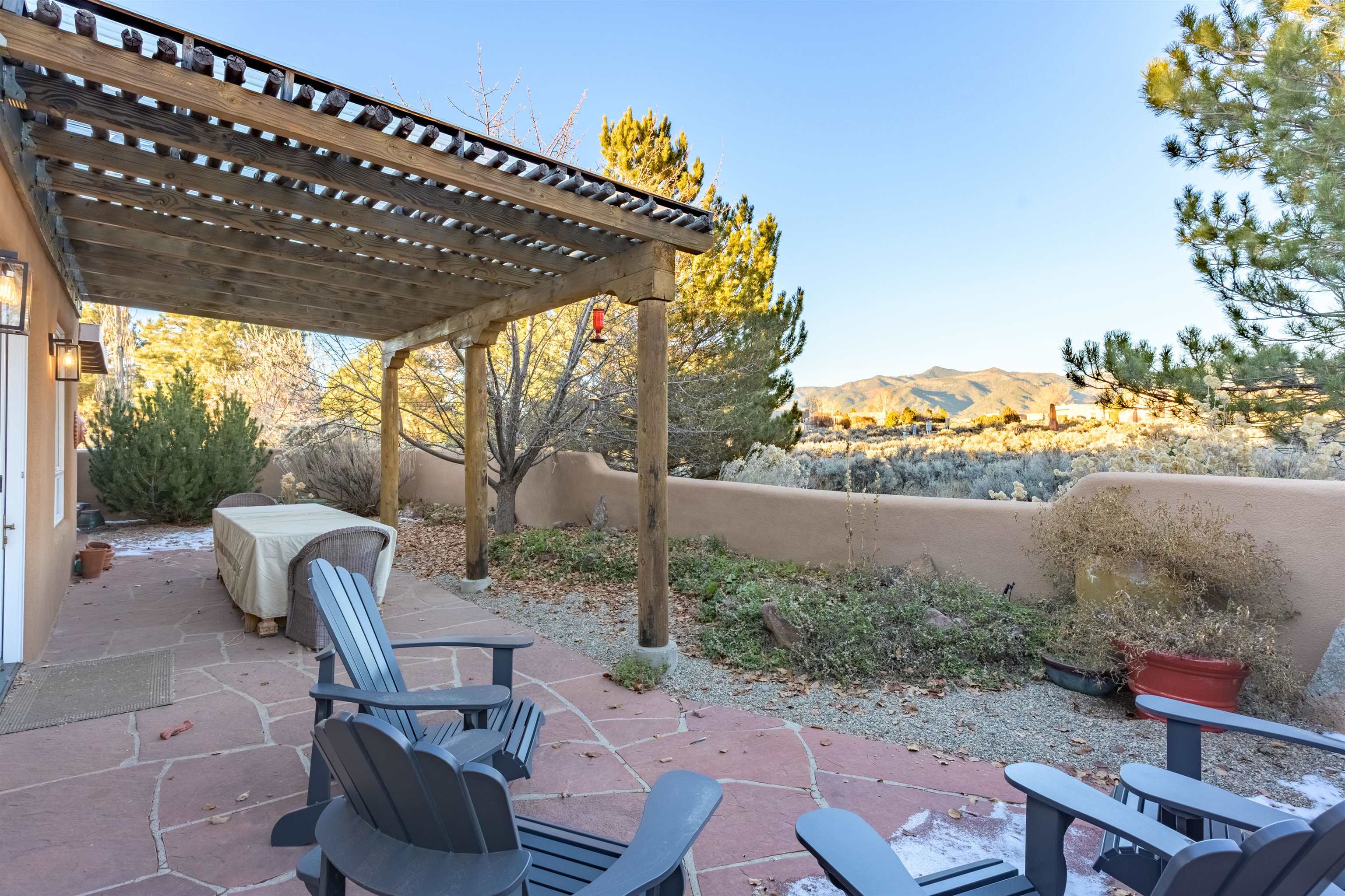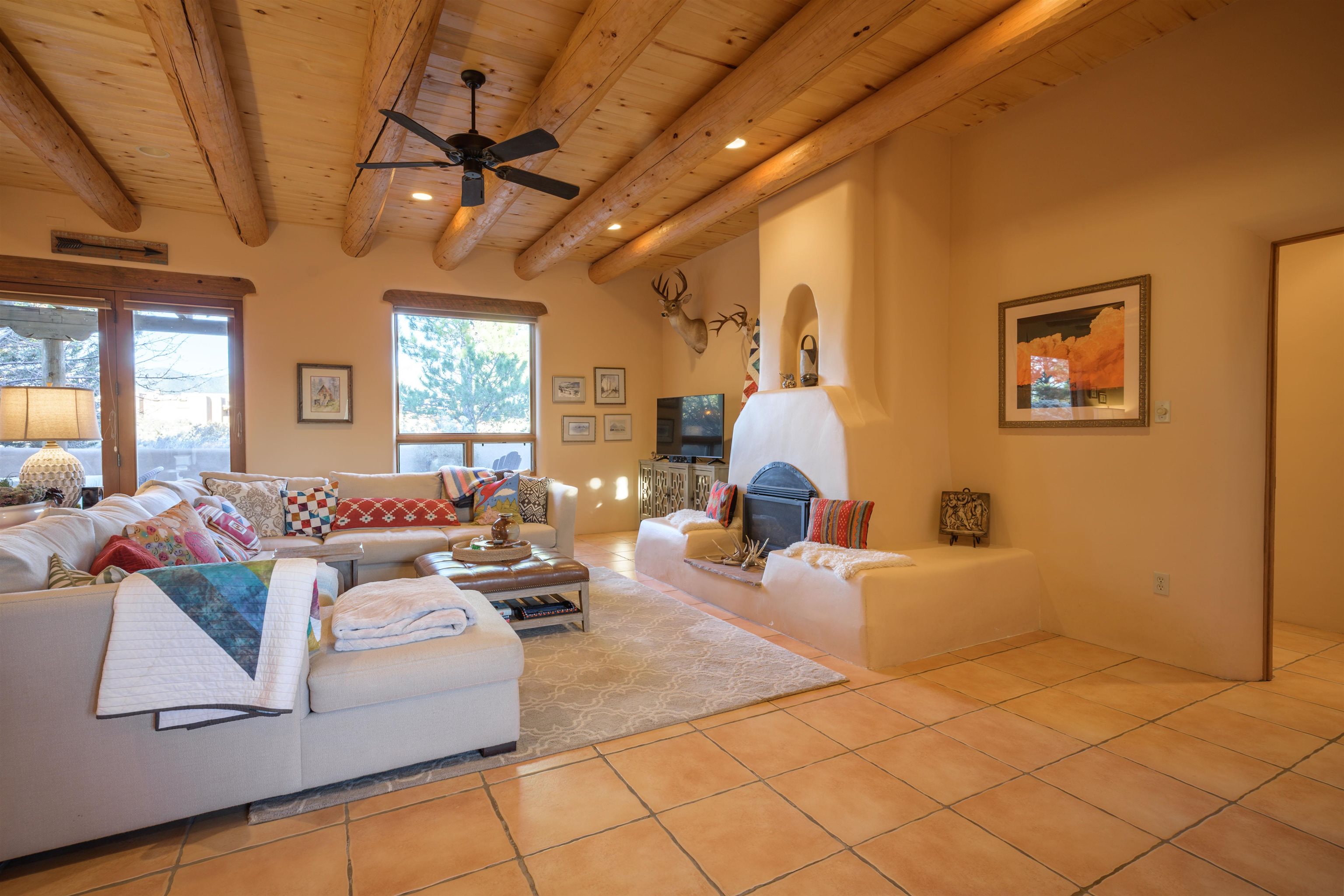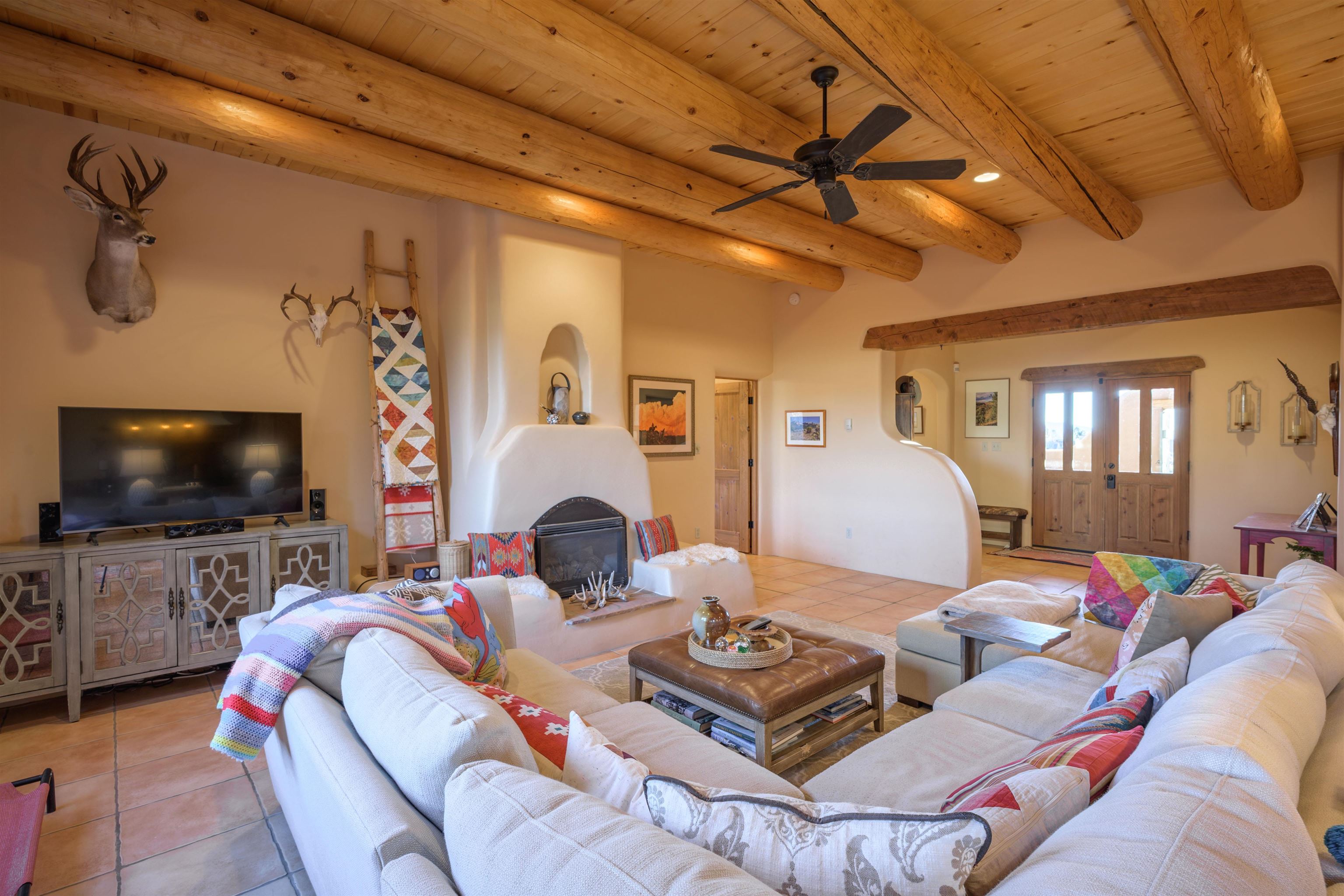 Charming Pueblo-style adobe home in Upper Colonias, featuring 3 bedrooms, 3 baths, and 2,563 sq. ft. of comfortable living space. The open floor plan showcases dramatic high ceilings, large vigas, and a welcoming kiva fireplace with bancos, creating a warm and inviting great room. Situated on a private .946-acre lot surrounded by mature aspen and pine trees, the home boasts stunning views of Taos Mountain. A rear courtyard, accessible directly from the great room, offers the perfect setting for entertaining, outdoor dining, or simply enjoying the serene mountain scenery. The kitchen is equipped with stylish cabinetry and a Professional Series range and oven, complemented by ceramic tile flooring throughout. The primary bath features both a soaking tub and a separate shower. The garage has been partially converted into a studio/workshop, adding versatility to the home. Ceiling fans throughout enhance comfort, and recent updates—including a new roof, new stucco, and a new boiler—ensure peace of mind. Conveniently located near the Town of Taos and Taos Ski Valley, this meticulously maintained home combines classic adobe charm with modern conveniences. The sale of the property includes all furniture and furnishings, providing a move-in ready experience.