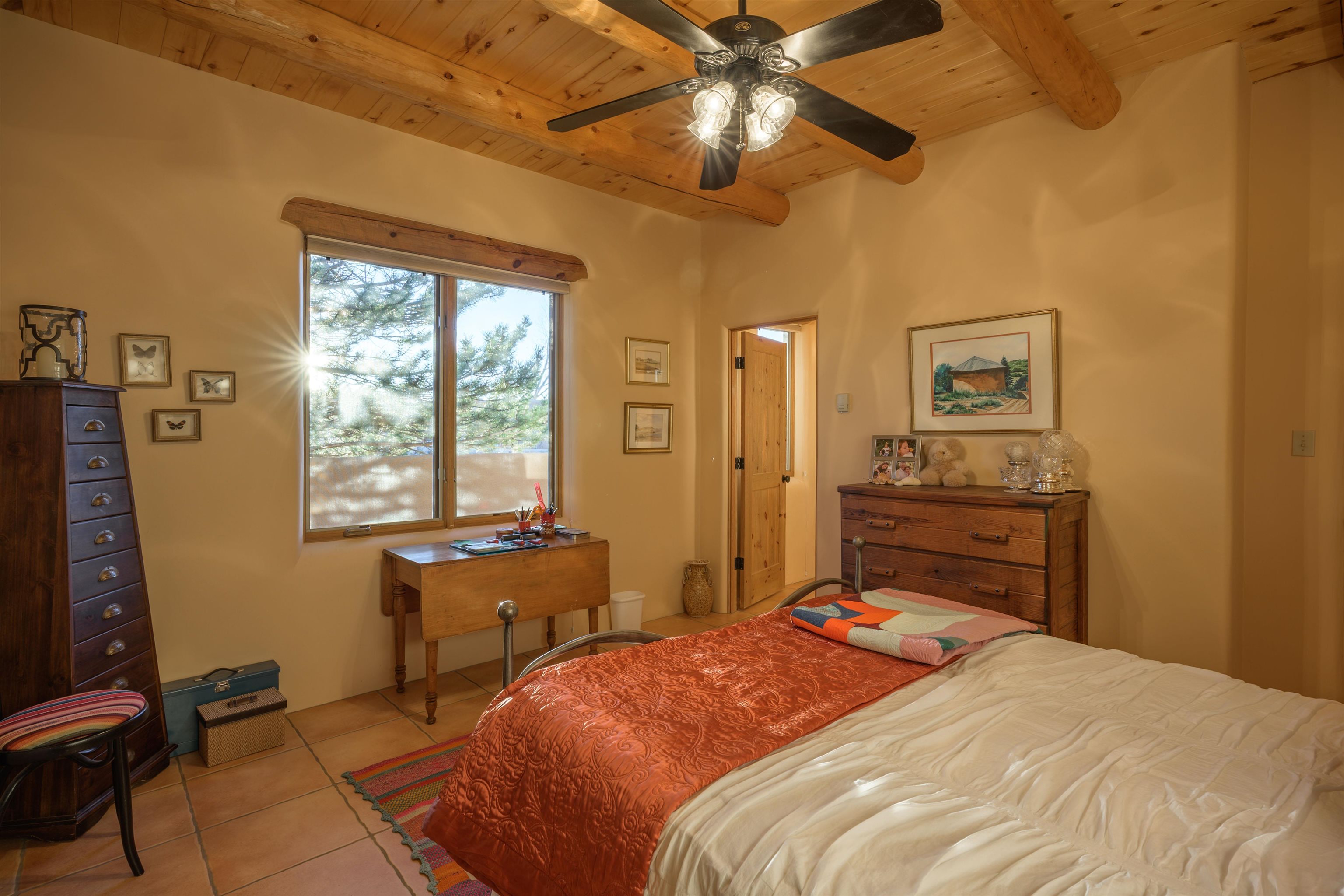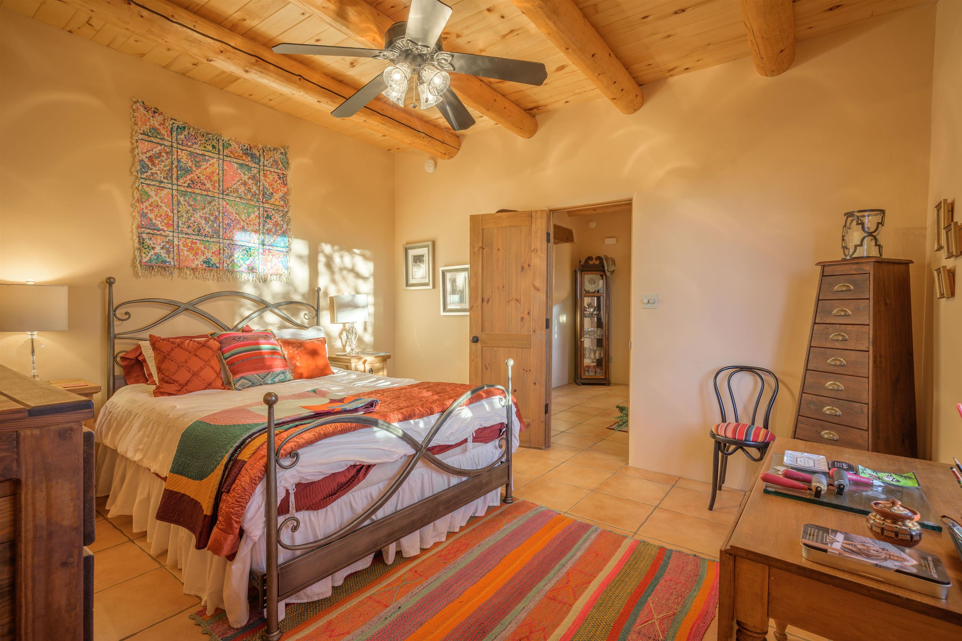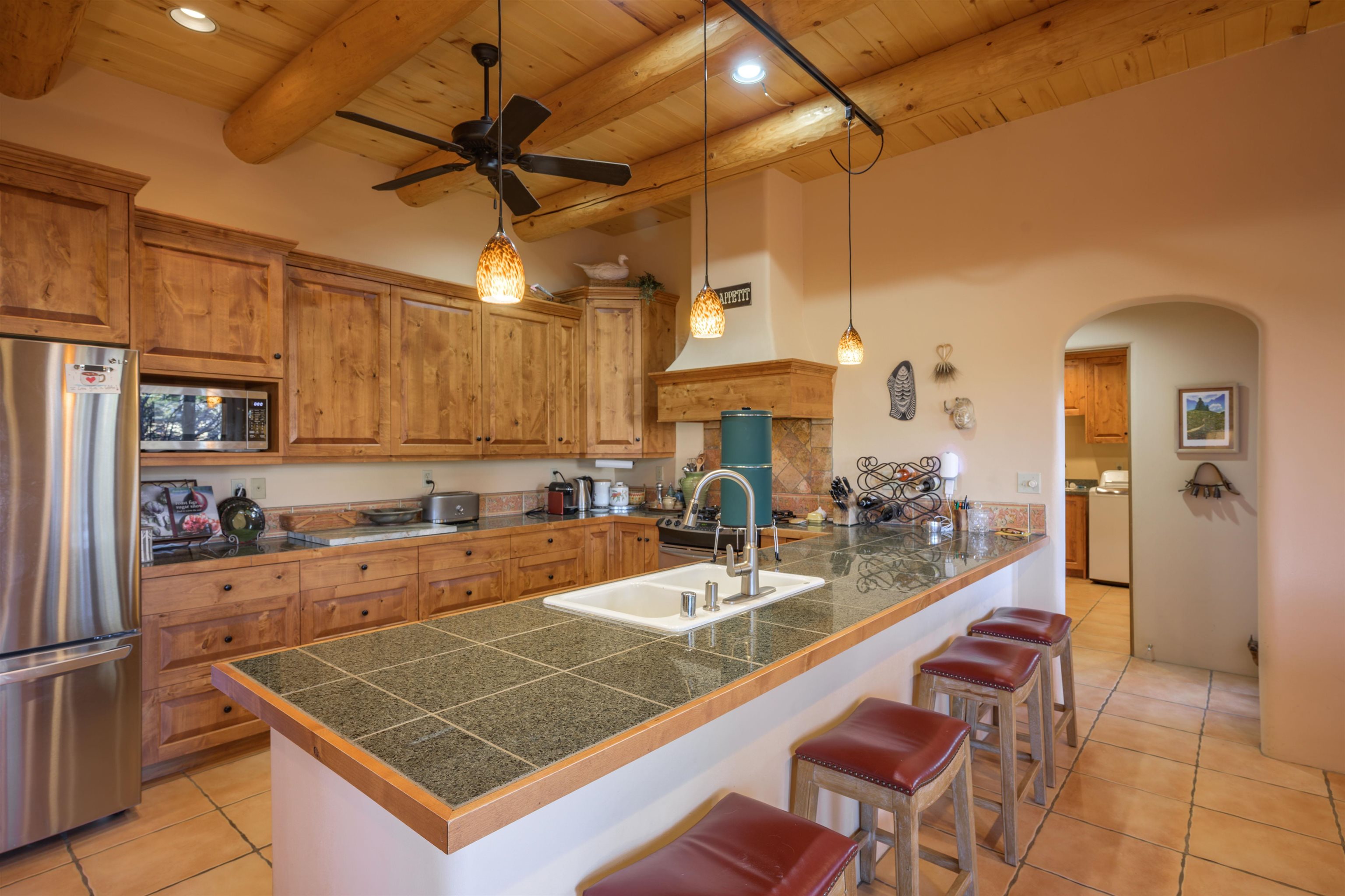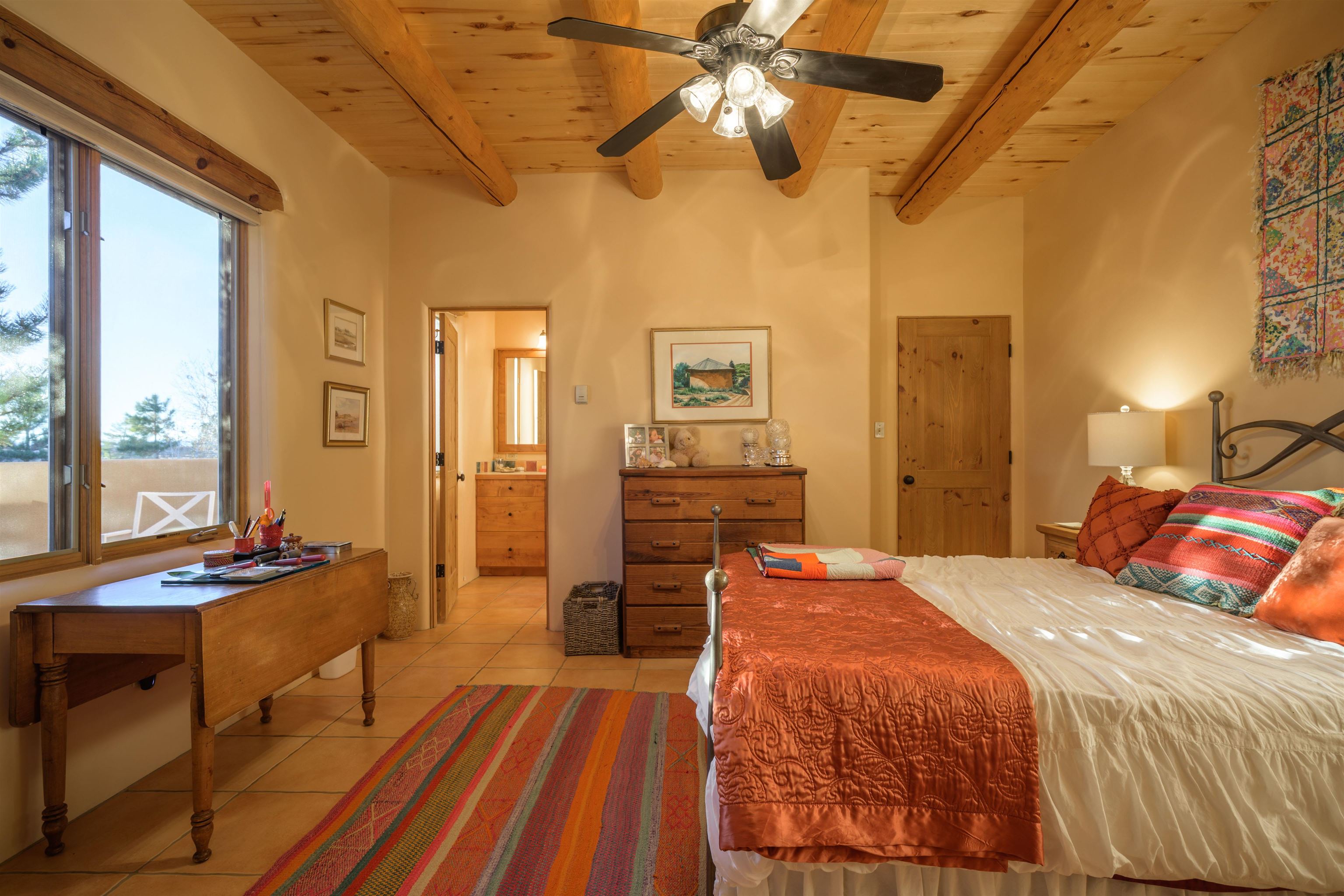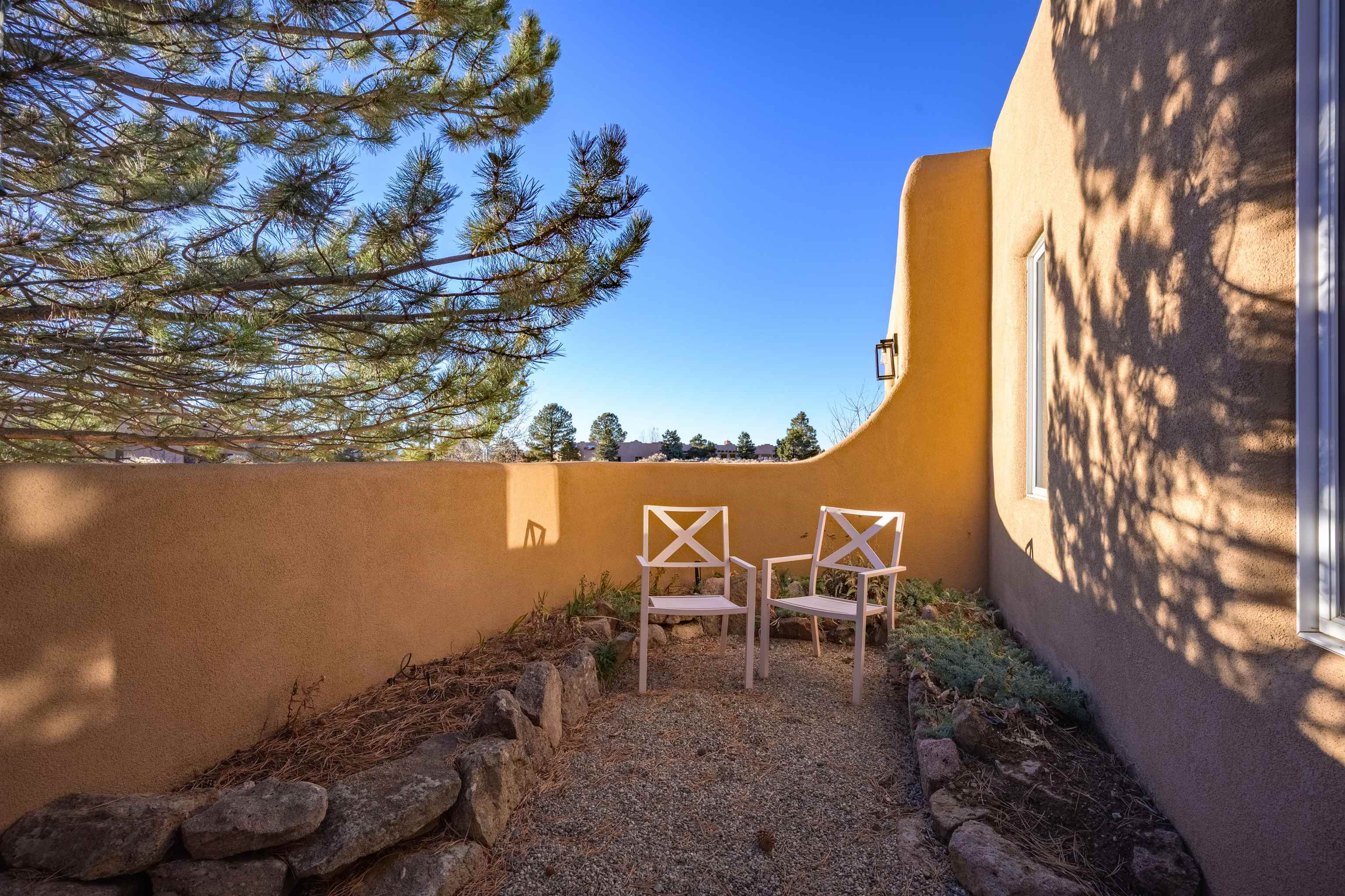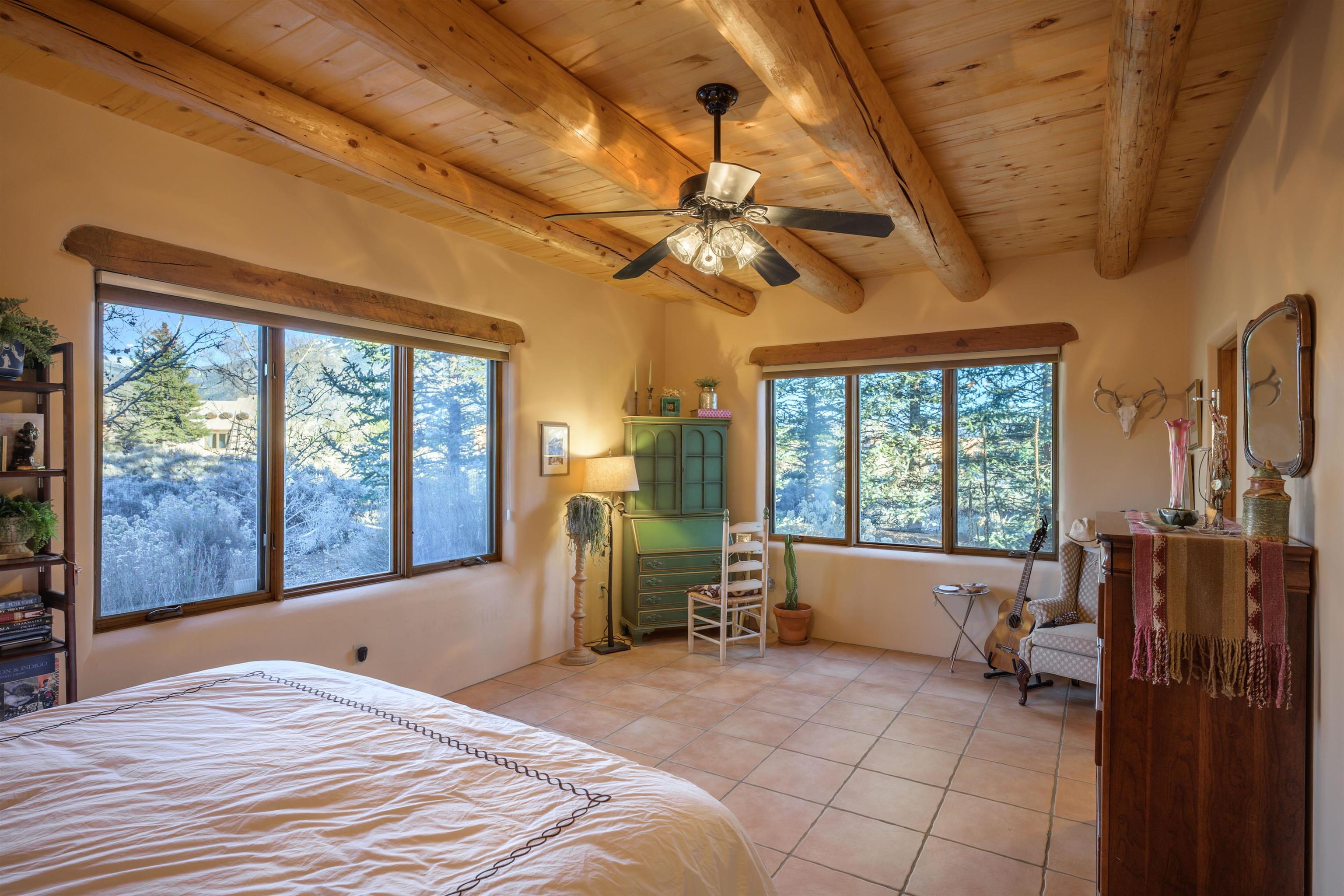 Charming Pueblo-style adobe home in Upper Colonias, featuring 3 bedrooms, 3 baths, and 2,563 sq. ft. of comfortable living space. The open floor plan showcases dramatic high ceilings, large vigas, and a welcoming kiva fireplace with bancos, creating a warm and inviting great room. Situated on a private .946-acre lot surrounded by mature aspen and pine trees, the home boasts stunning views of Taos Mountain. A rear courtyard, accessible directly from the great room, offers the perfect setting for entertaining, outdoor dining, or simply enjoying the serene mountain scenery. The kitchen is equipped with stylish cabinetry and a Professional Series range and oven, complemented by ceramic tile flooring throughout. The primary bath features both a soaking tub and a separate shower. The garage has been partially converted into a studio/workshop, adding versatility to the home. Ceiling fans throughout enhance comfort, and recent updates—including a new roof, new stucco, and a new boiler—ensure peace of mind. Conveniently located near the Town of Taos and Taos Ski Valley, this meticulously maintained home combines classic adobe charm with modern conveniences. The sale of the property includes all furniture and furnishings, providing a move-in ready experience.