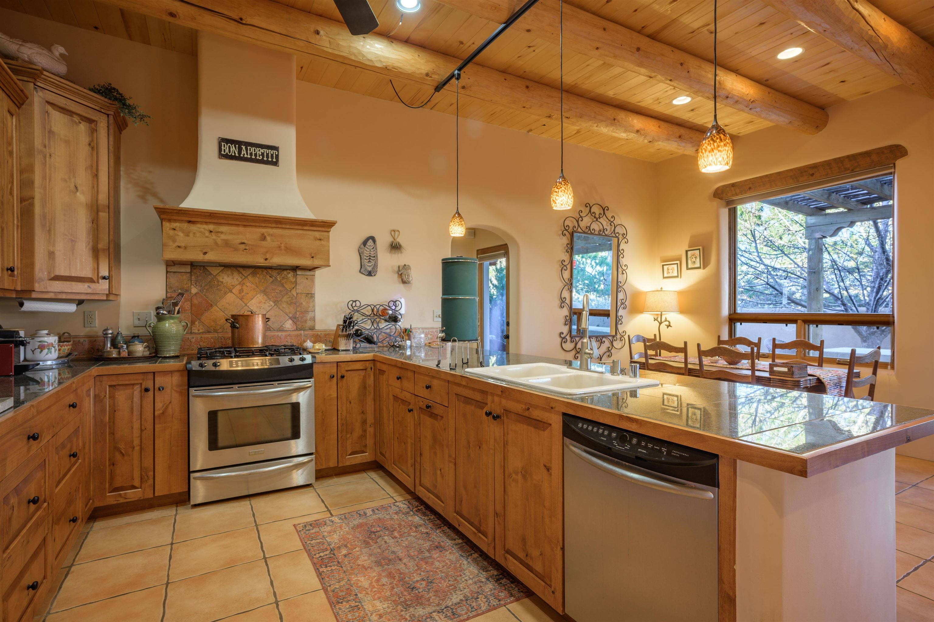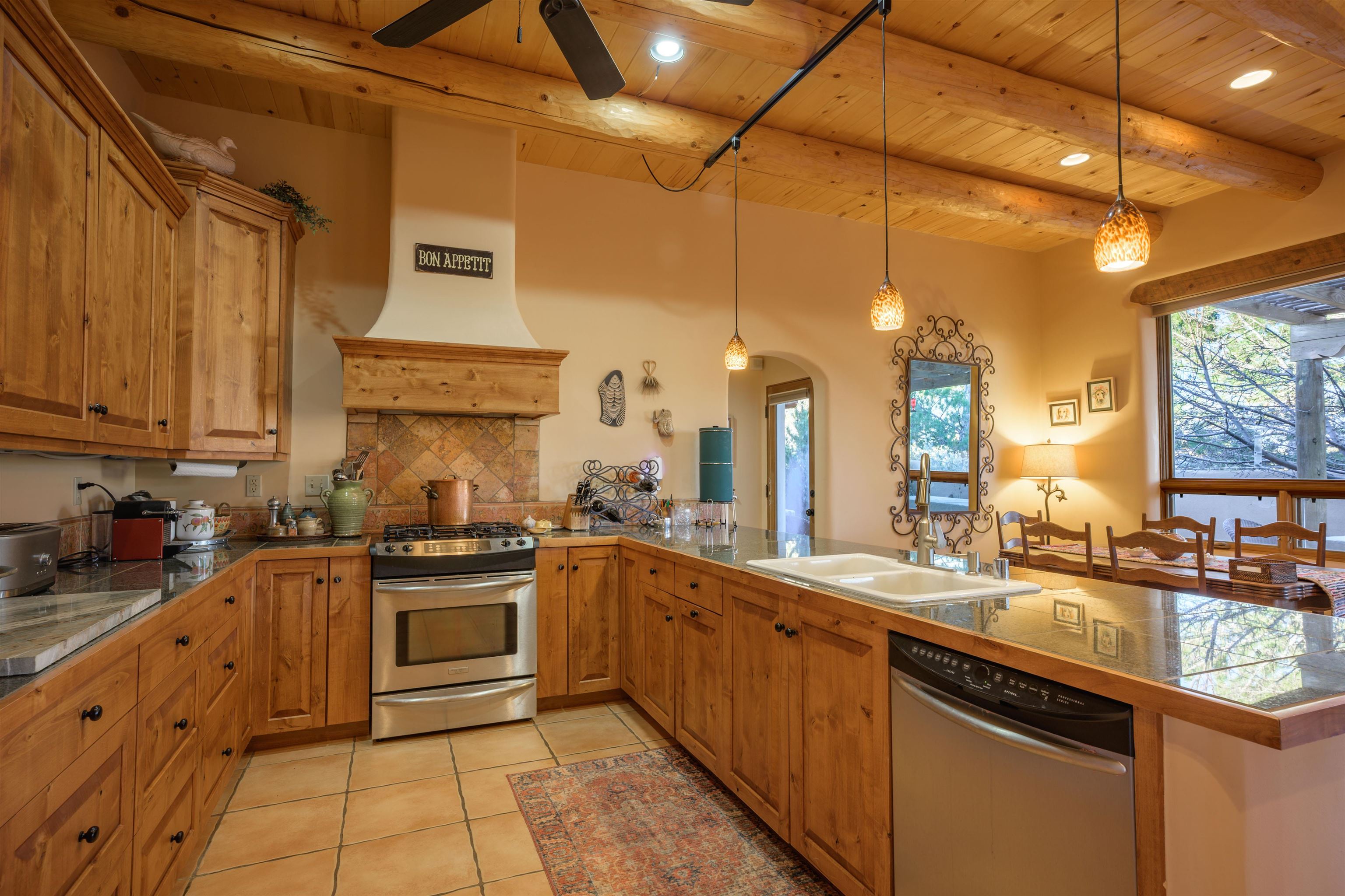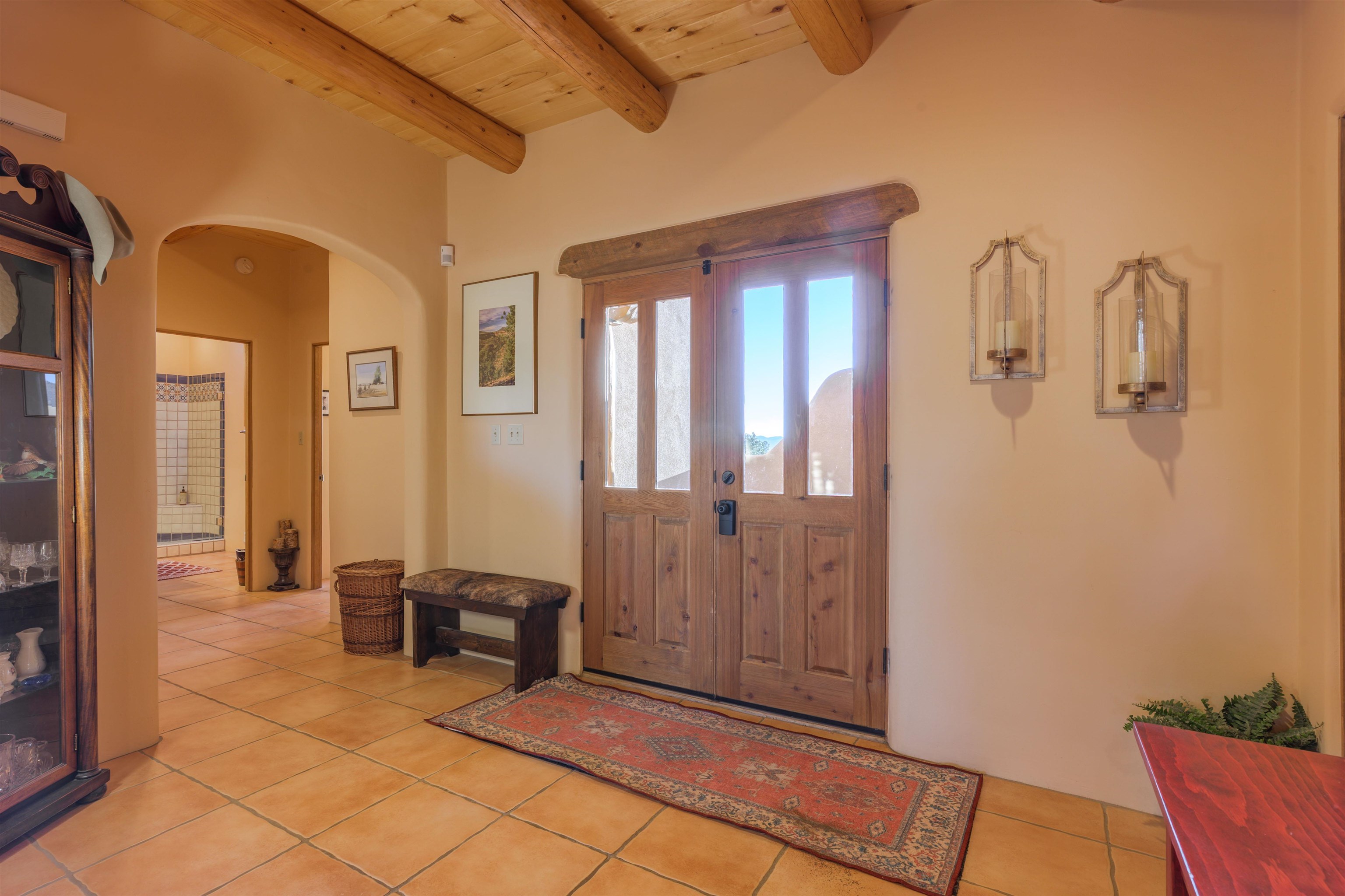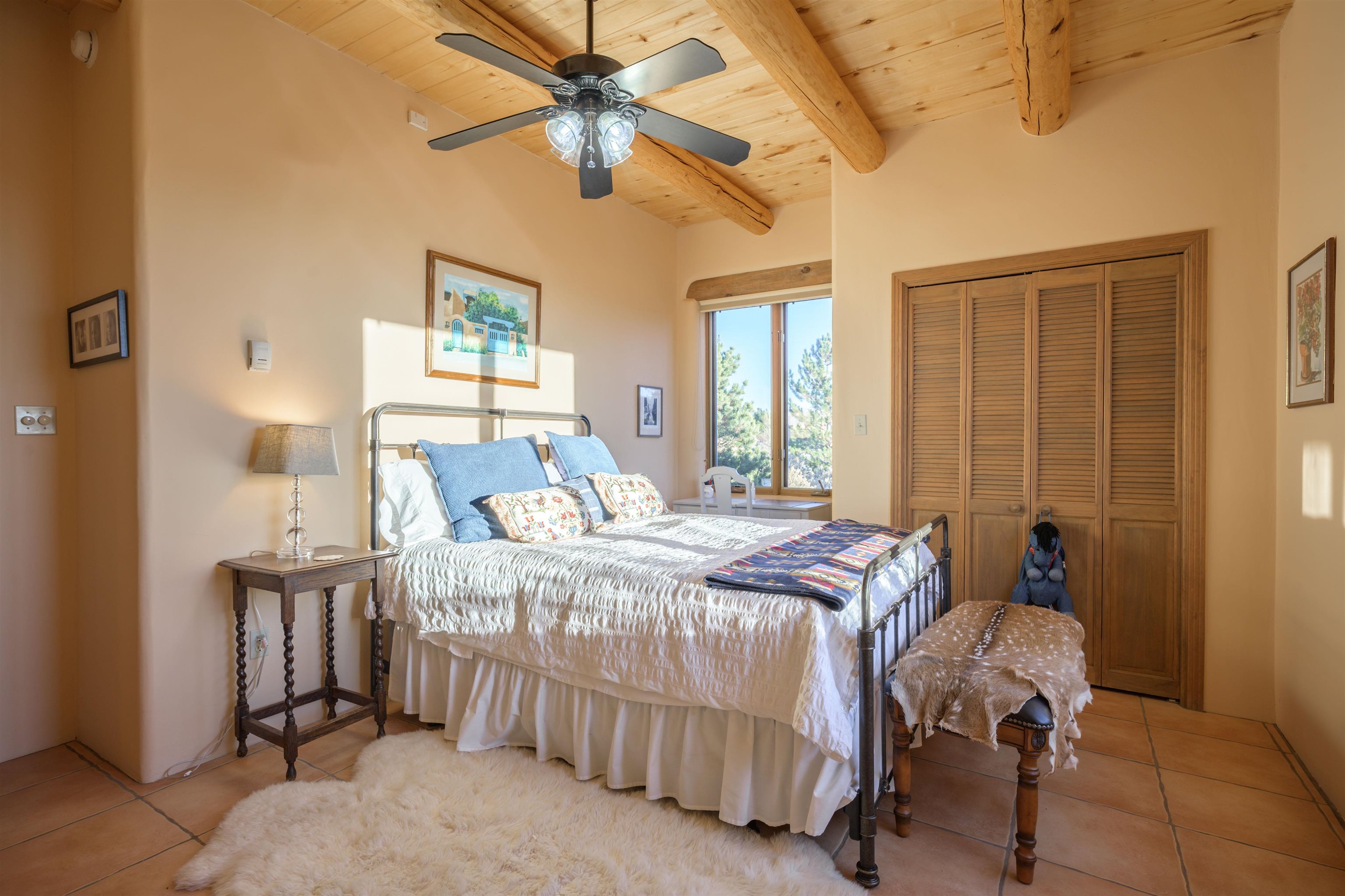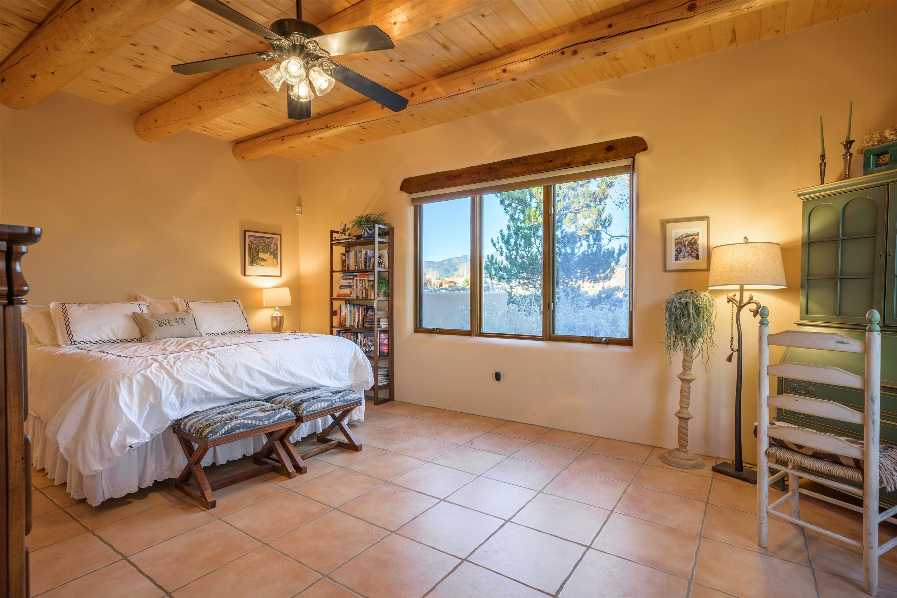 Charming Pueblo-style adobe home in Upper Colonias, featuring 3 bedrooms, 3 baths, and 2,563 sq. ft. of comfortable living space. The open floor plan showcases dramatic high ceilings, large vigas, and a welcoming kiva fireplace with bancos, creating a warm and inviting great room. Situated on a private .946-acre lot surrounded by mature aspen and pine trees, the home boasts stunning views of Taos Mountain. A rear courtyard, accessible directly from the great room, offers the perfect setting for entertaining, outdoor dining, or simply enjoying the serene mountain scenery. The kitchen is equipped with stylish cabinetry and a Professional Series range and oven, complemented by ceramic tile flooring throughout. The primary bath features both a soaking tub and a separate shower. The garage has been partially converted into a studio/workshop, adding versatility to the home. Ceiling fans throughout enhance comfort, and recent updates—including a new roof, new stucco, and a new boiler—ensure peace of mind. Conveniently located near the Town of Taos and Taos Ski Valley, this meticulously maintained home combines classic adobe charm with modern conveniences. The sale of the property includes all furniture and furnishings, providing a move-in ready experience.