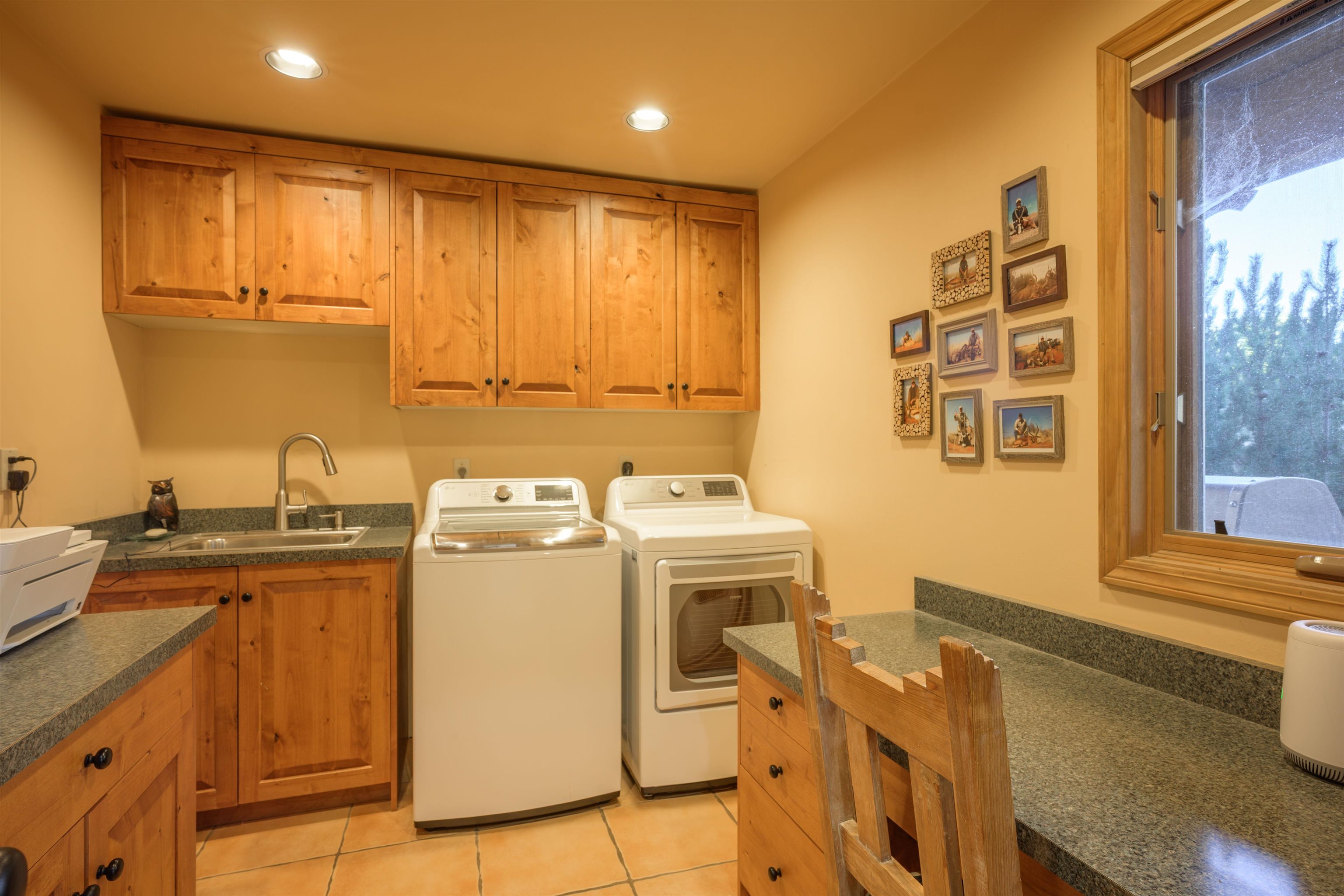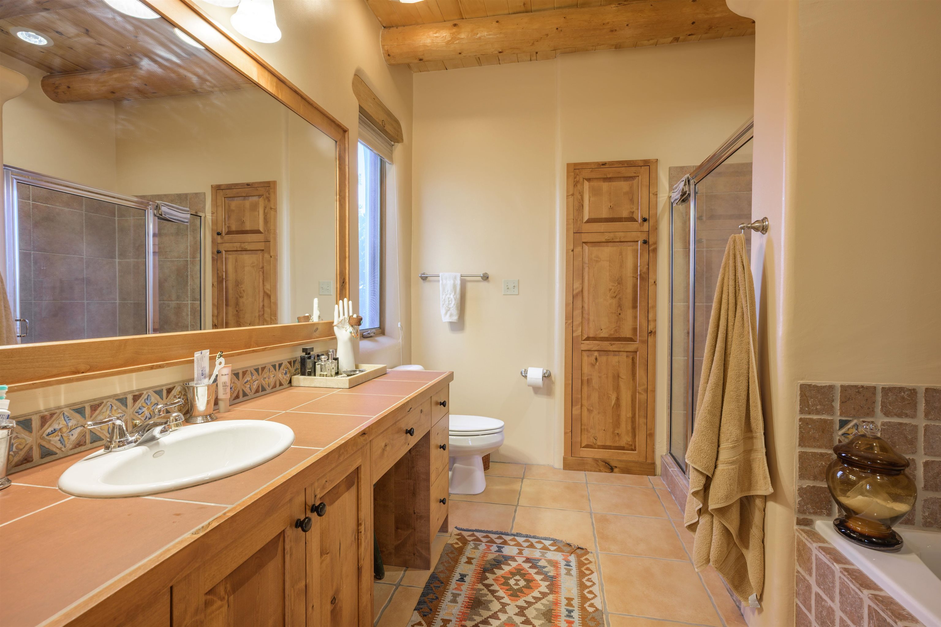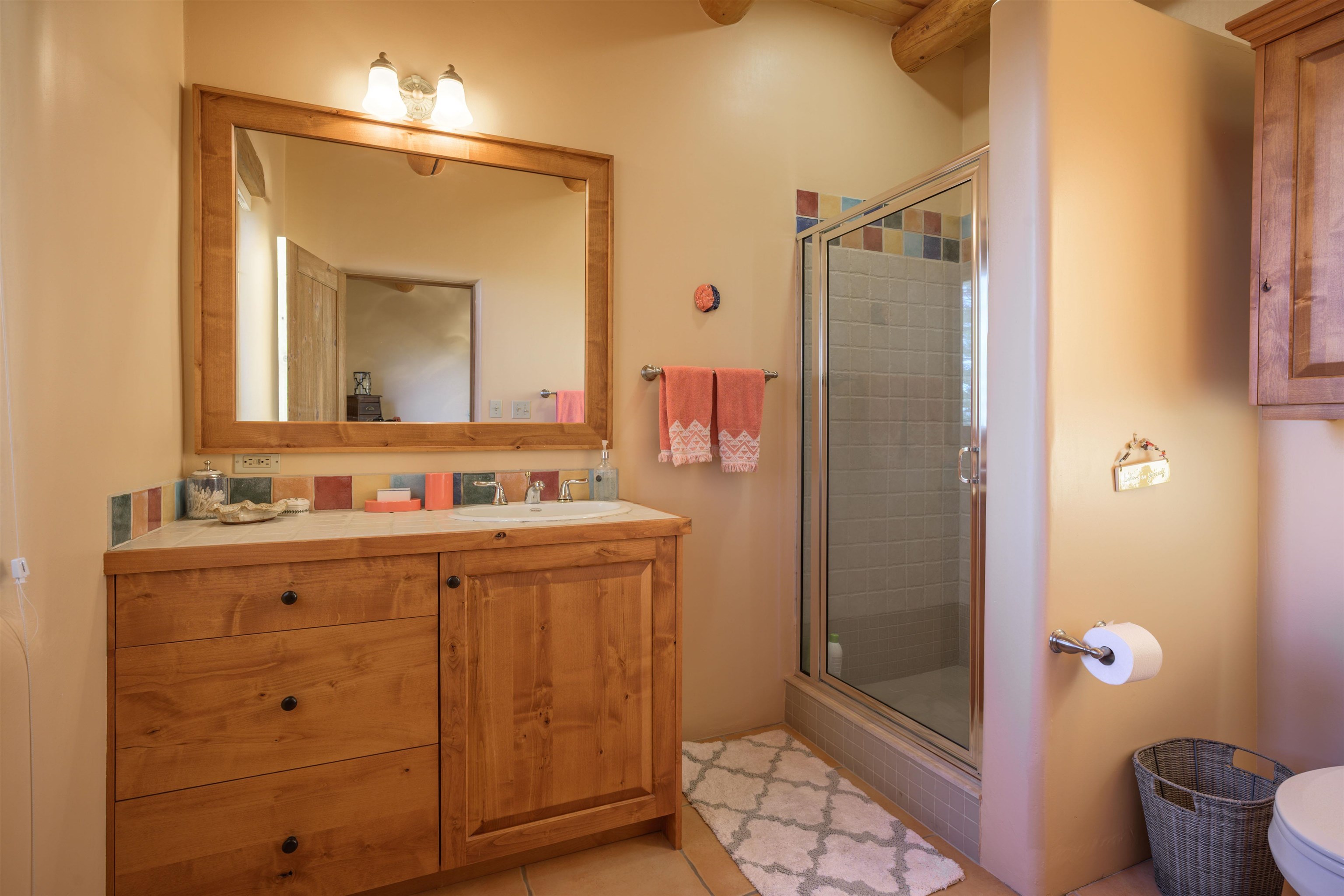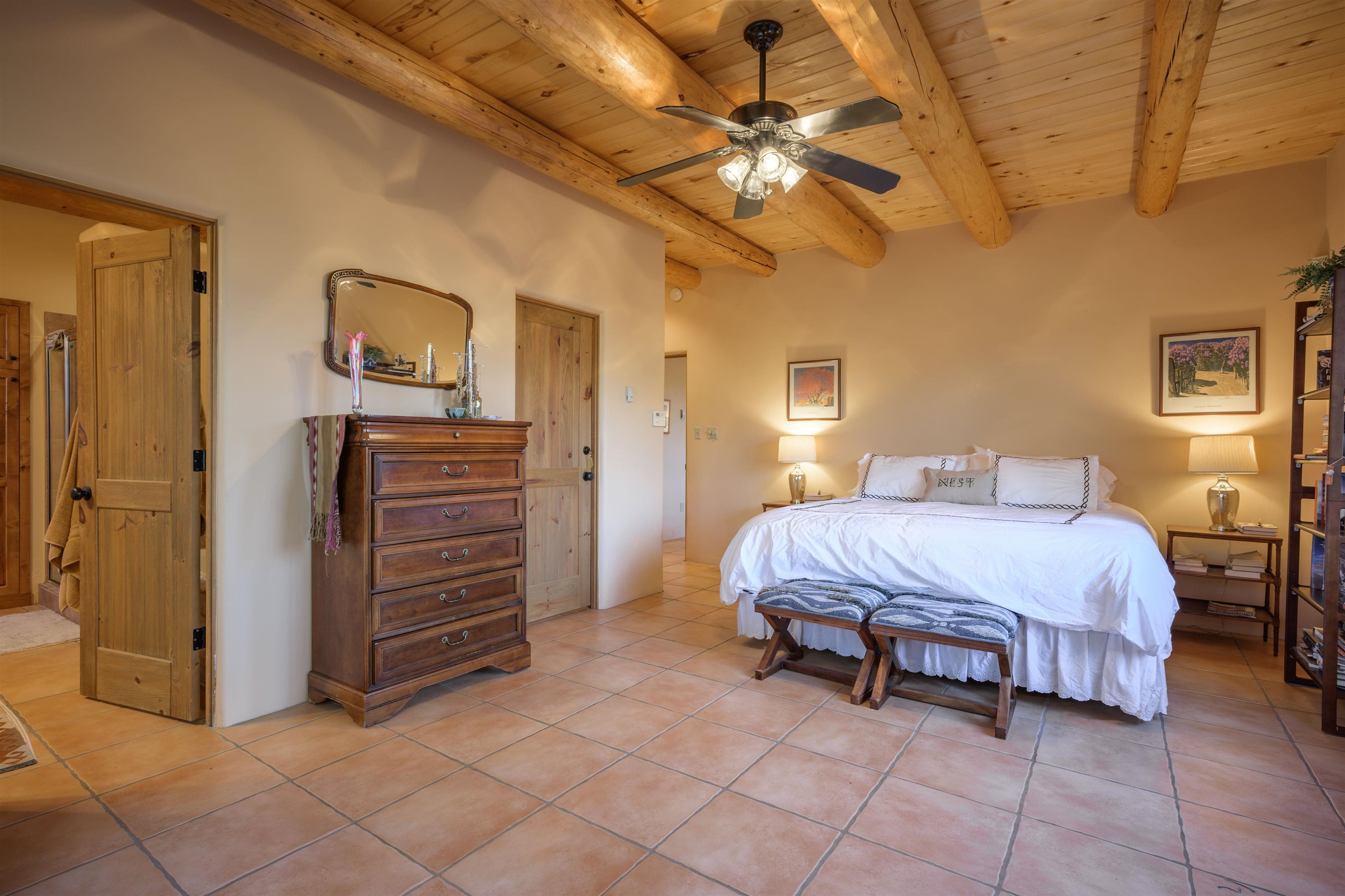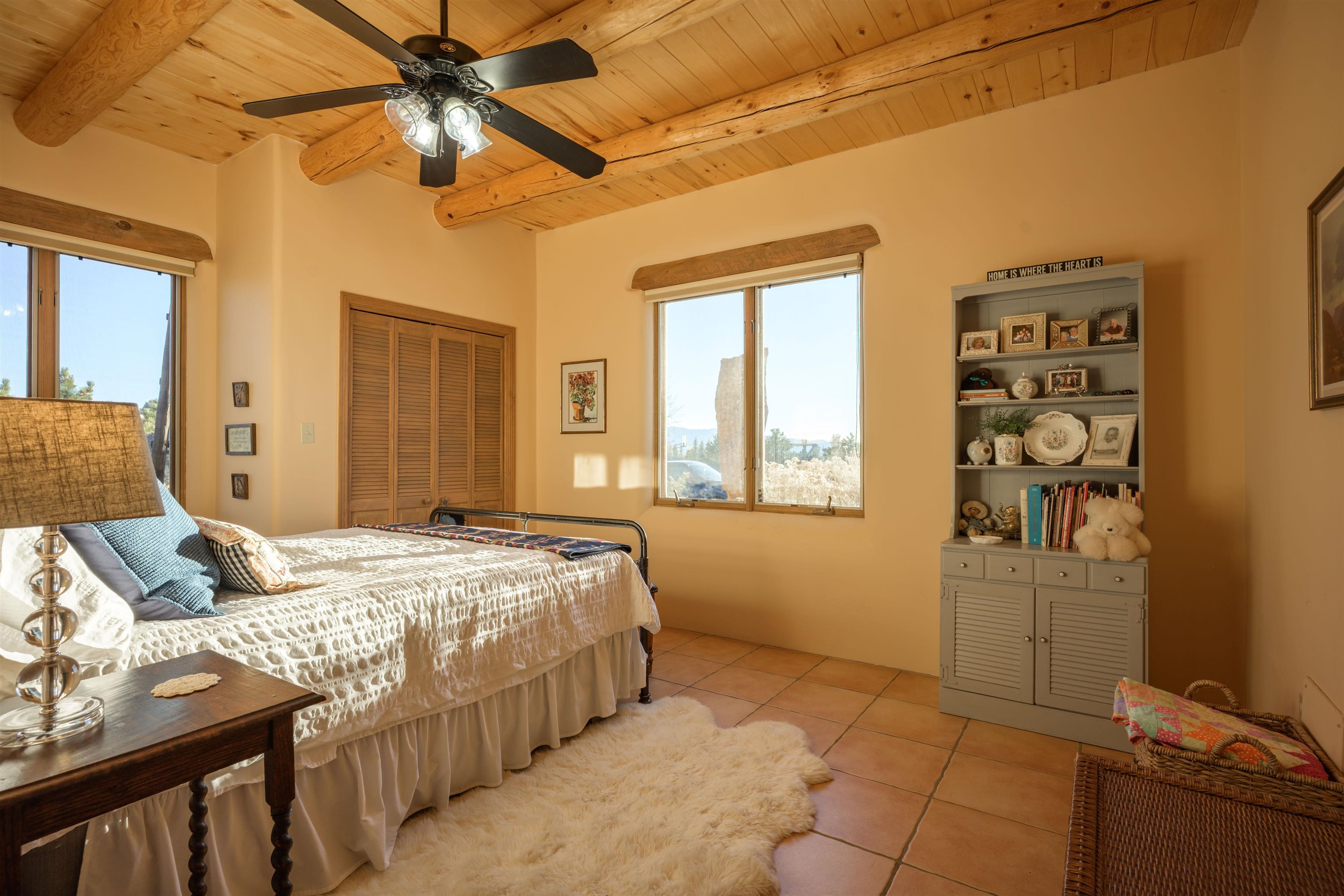 Charming Pueblo-style adobe home in Upper Colonias, featuring 3 bedrooms, 3 baths, and 2,563 sq. ft. of comfortable living space. The open floor plan showcases dramatic high ceilings, large vigas, and a welcoming kiva fireplace with bancos, creating a warm and inviting great room. Situated on a private .946-acre lot surrounded by mature aspen and pine trees, the home boasts stunning views of Taos Mountain. A rear courtyard, accessible directly from the great room, offers the perfect setting for entertaining, outdoor dining, or simply enjoying the serene mountain scenery. The kitchen is equipped with stylish cabinetry and a Professional Series range and oven, complemented by ceramic tile flooring throughout. The primary bath features both a soaking tub and a separate shower. The garage has been partially converted into a studio/workshop, adding versatility to the home. Ceiling fans throughout enhance comfort, and recent updates—including a new roof, new stucco, and a new boiler—ensure peace of mind. Conveniently located near the Town of Taos and Taos Ski Valley, this meticulously maintained home combines classic adobe charm with modern conveniences. The sale of the property includes all furniture and furnishings, providing a move-in ready experience.