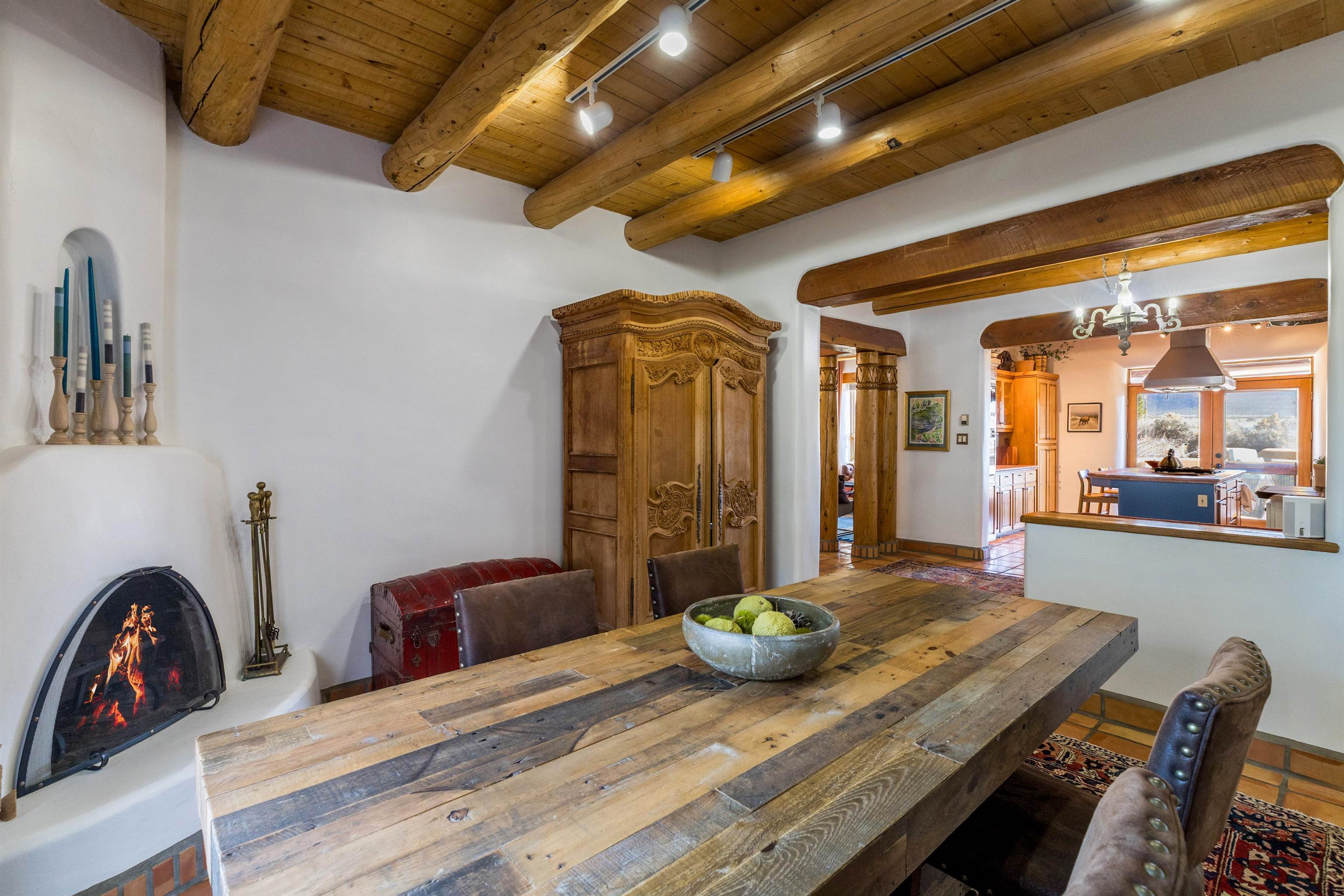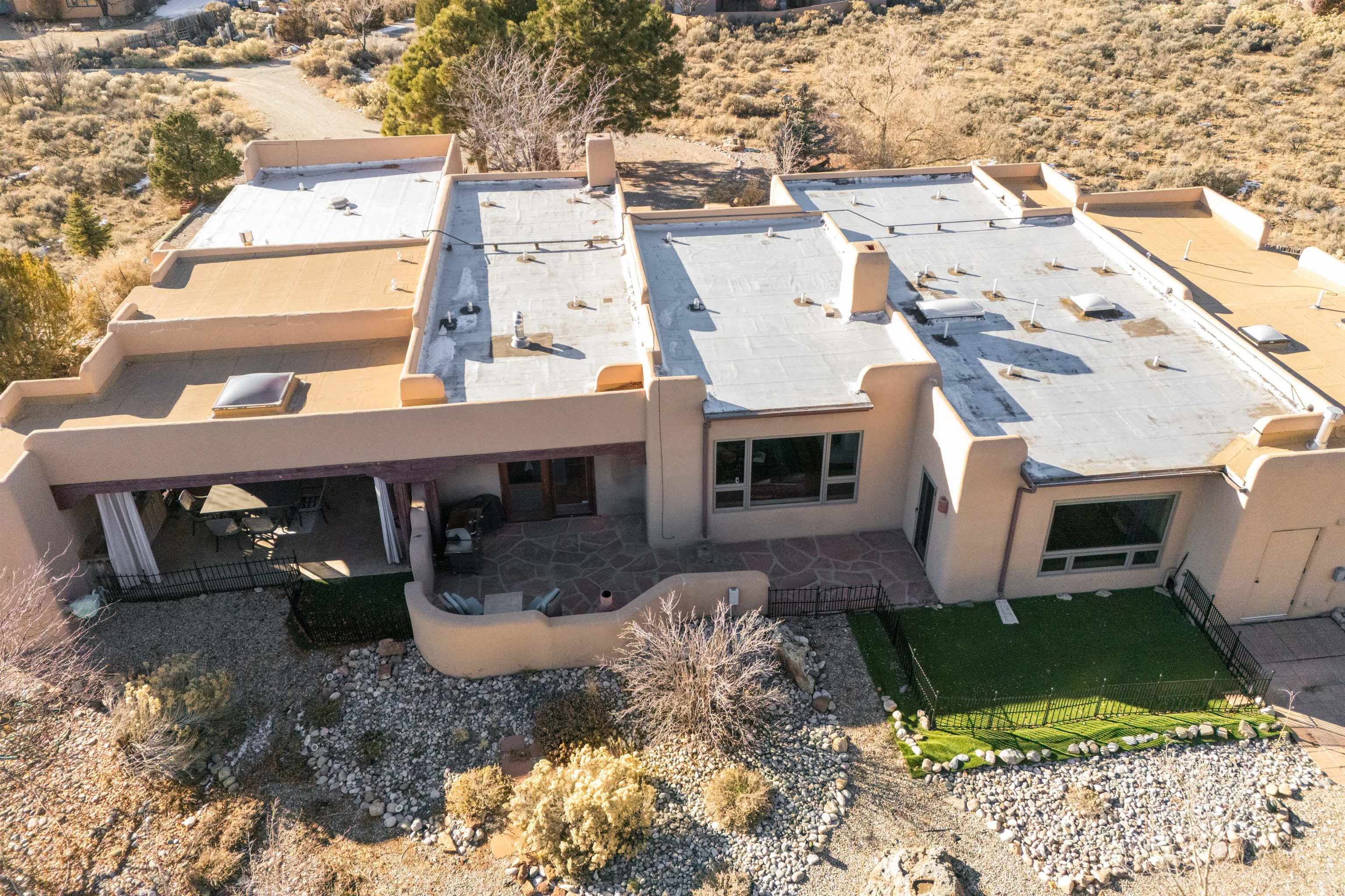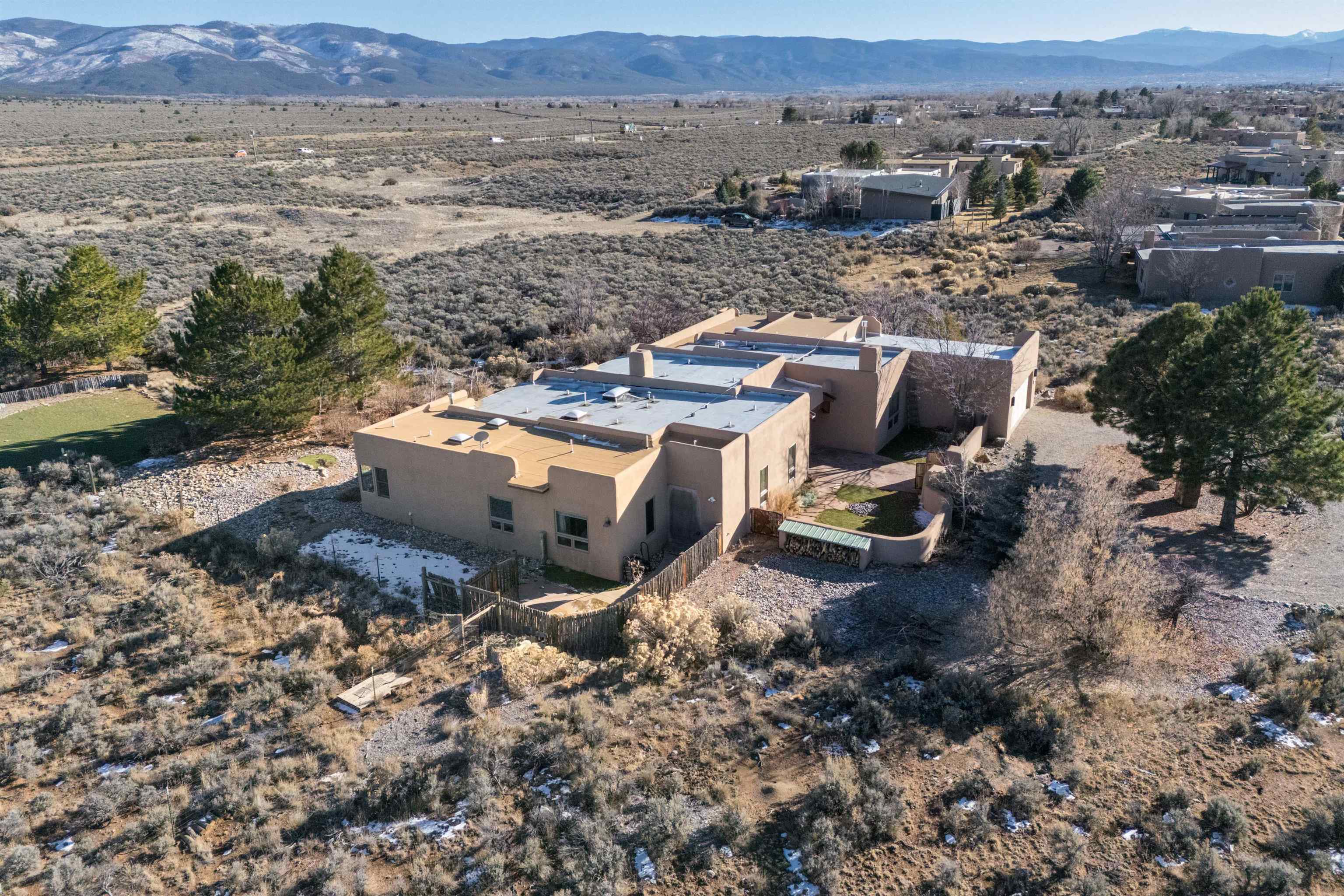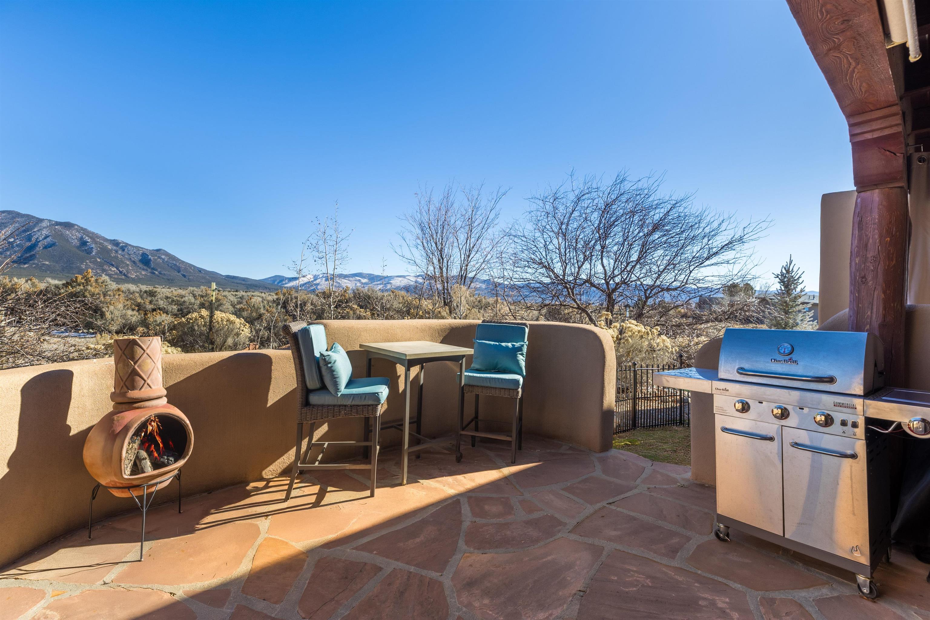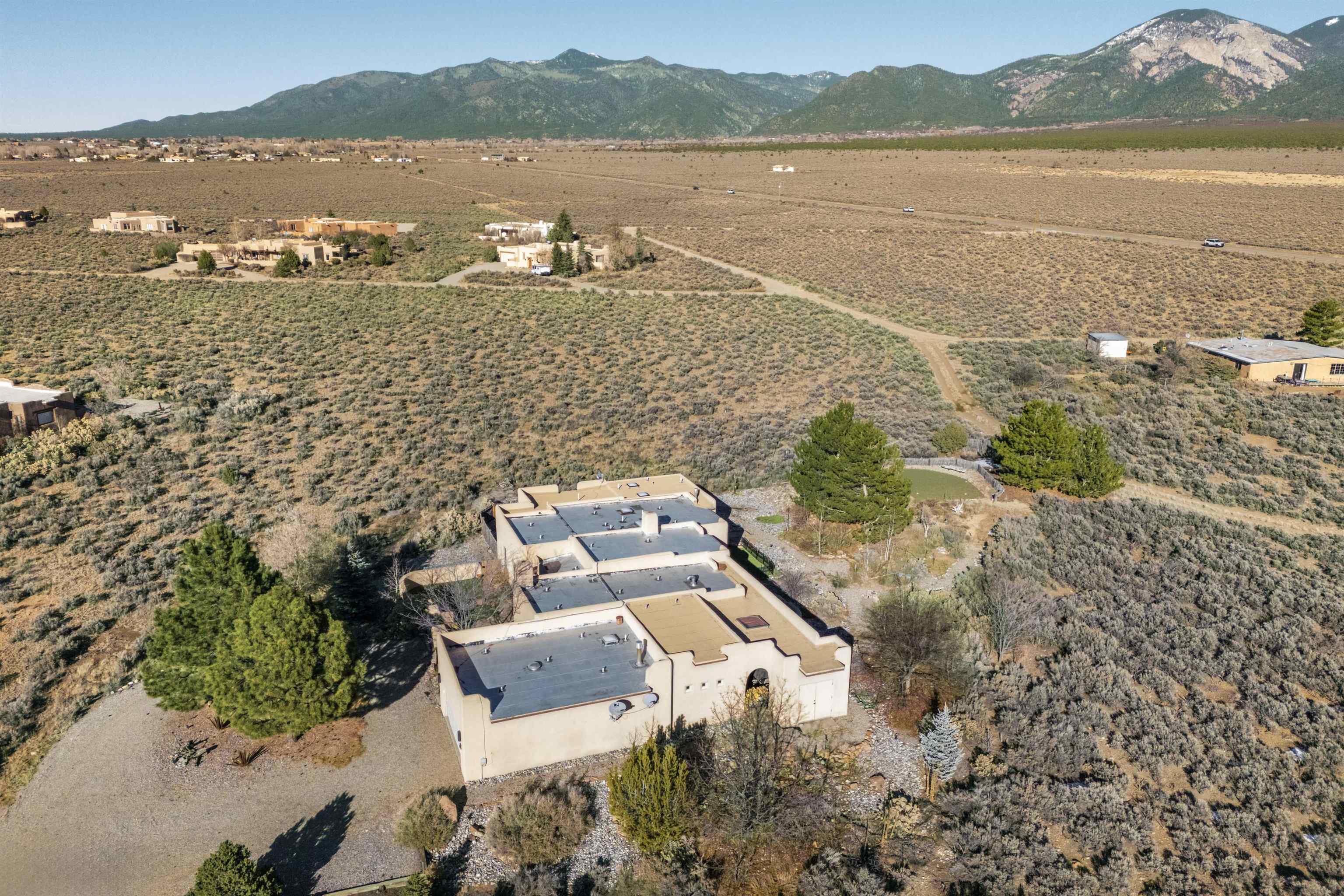 Bring the entire gang! Priced below a Dec. '25 Appraisal by Pam Bishop!!! Gorgeous adobe home in the desirable Upper Colonias neighborhood is perfectly positioned between the Town of Taos and Taos Ski Valley at the end of the road with expansive mountain views. Adobe construction, Viga wood beams on the ceilings, two southwestern style fireplaces, saltillo tile- all the beautiful, authentic features that are, sadly, disappearing from our market. This house has it all-4 bedrooms, three baths, two living rooms, a cozy dining room with a fireplace, and a bonus artist's studio/project room with a utility sink, loads of storage and lots of windows bringing in natural light from the north and east. The primary bedroom has large windows with sweeping views of the mountains, a luxurious 6-piece bath and a gigantic walk-in closet with generous built-in storage. The chef's kitchen has great appliances, a large island for counter top dining and direct access to a long portal, partially covered with a grill and entertaining space with front-row views of Taos Mountain. Great spaces for gathering, entertaining, or quietly unwinding after a long day on the river or playing in the mountains. This home is being sold with some furnishings and others are available on a separate bill of sale. Held by the Mountain: a North-side Adobe retreat.