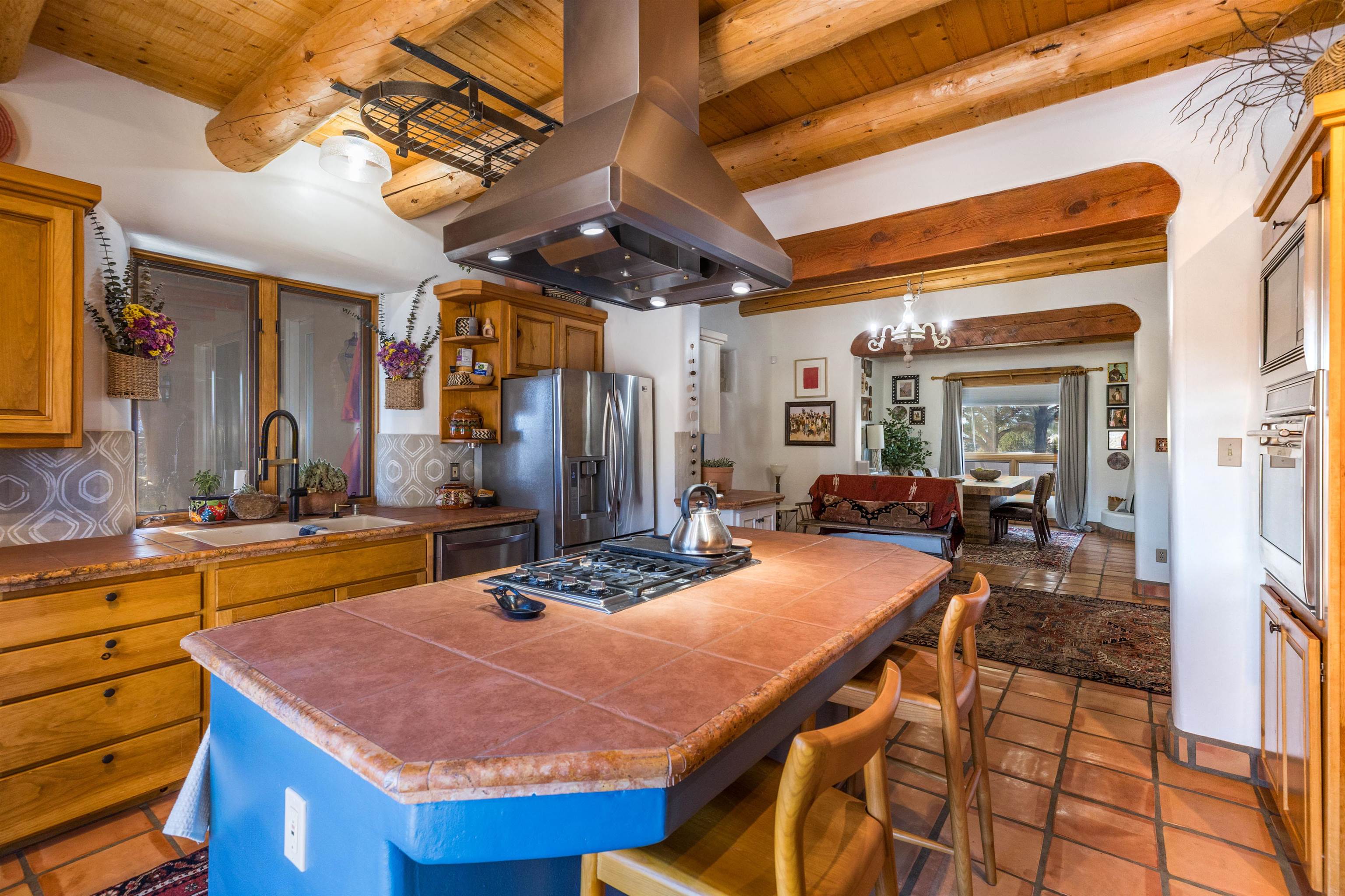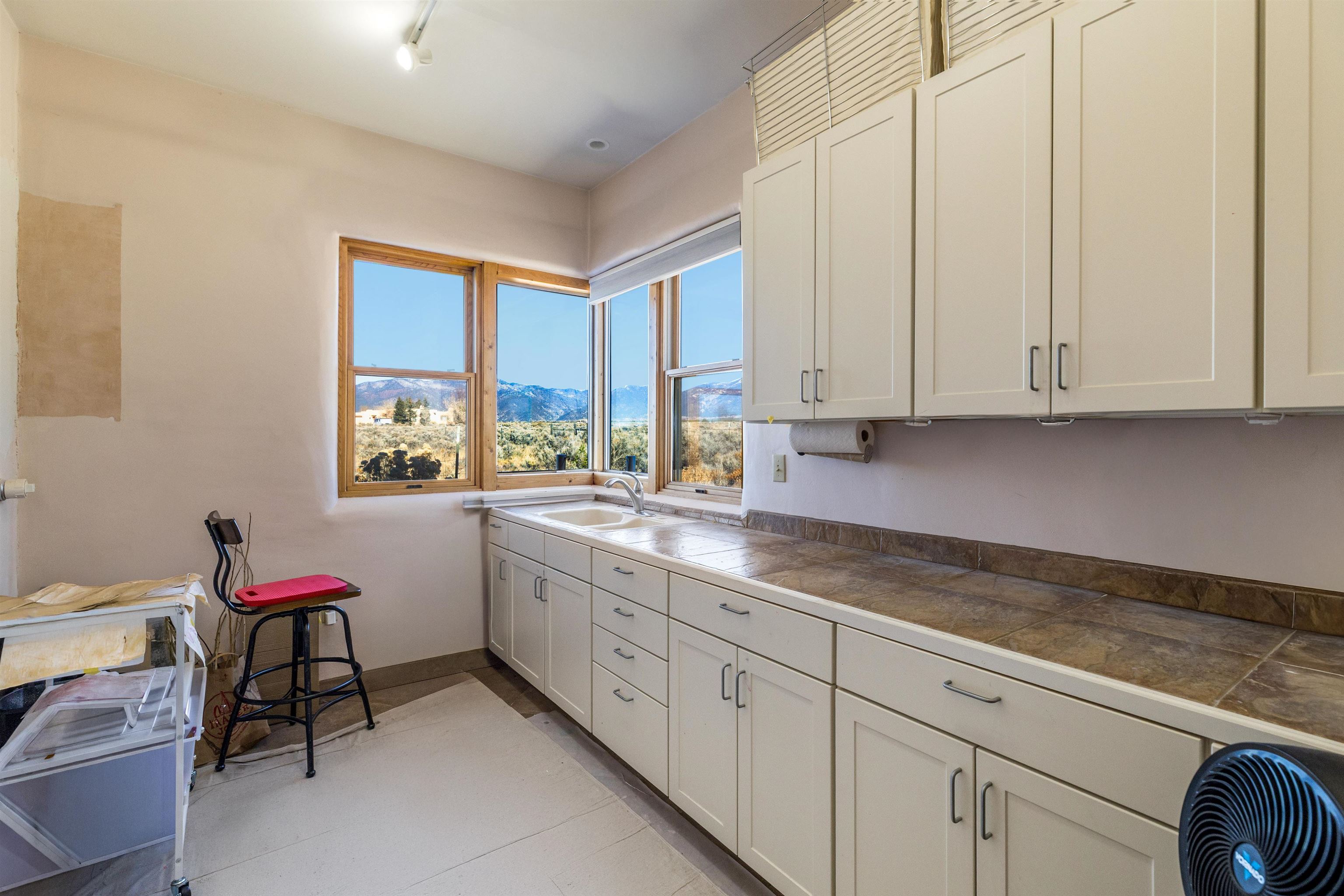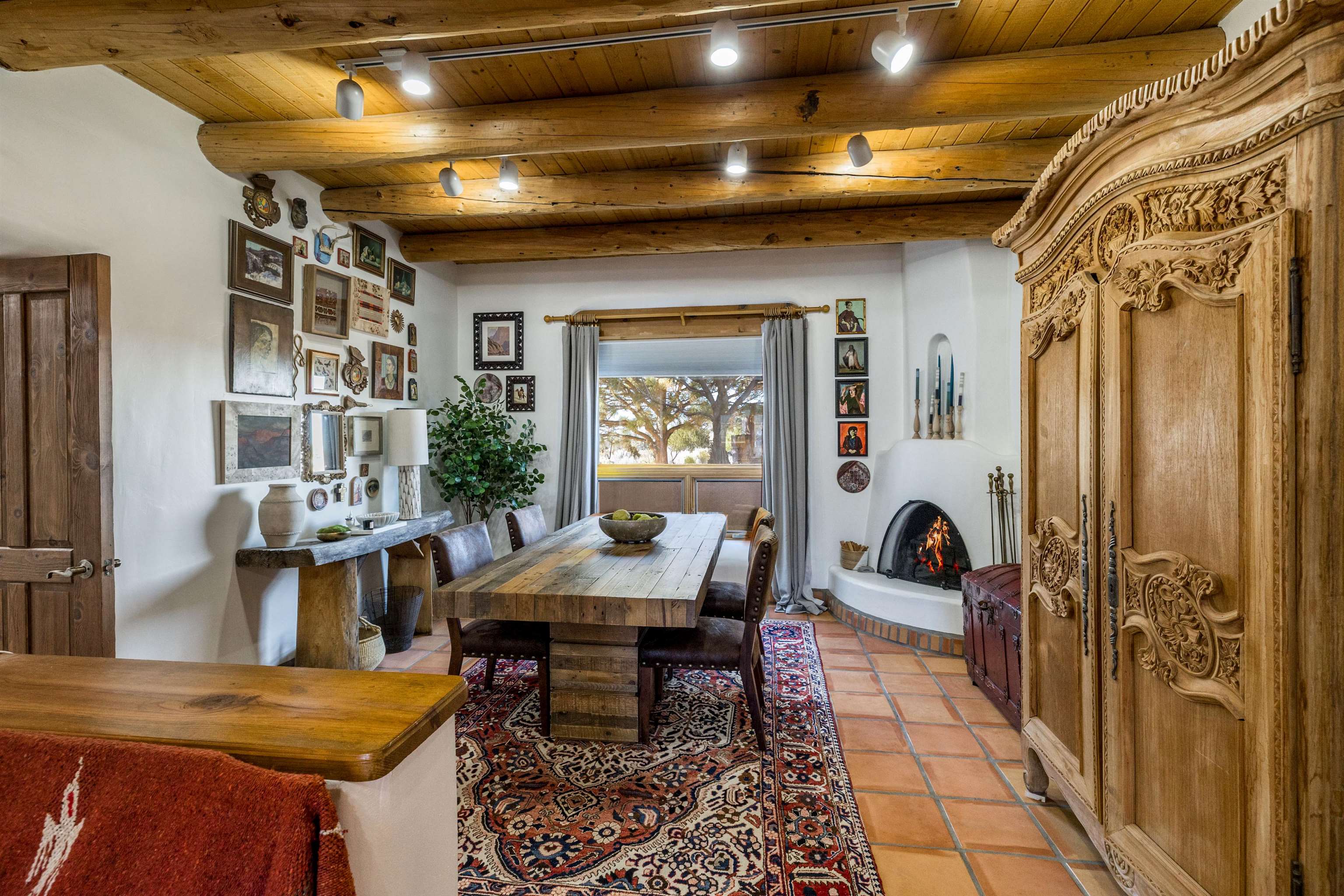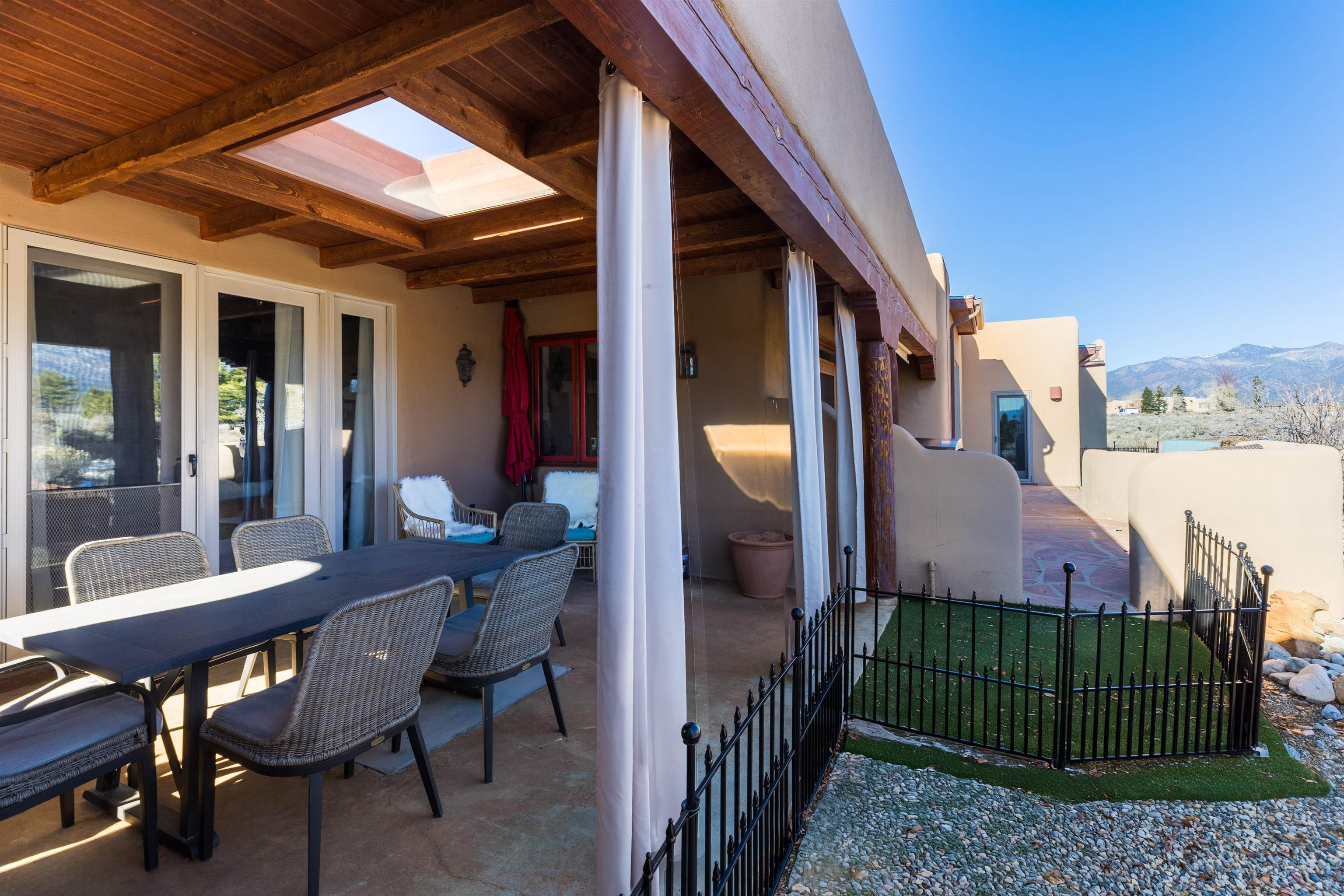 Bring the entire gang! Priced below a Dec. '25 Appraisal by Pam Bishop!!! Gorgeous adobe home in the desirable Upper Colonias neighborhood is perfectly positioned between the Town of Taos and Taos Ski Valley at the end of the road with expansive mountain views. Adobe construction, Viga wood beams on the ceilings, two southwestern style fireplaces, saltillo tile- all the beautiful, authentic features that are, sadly, disappearing from our market. This house has it all-4 bedrooms, three baths, two living rooms, a cozy dining room with a fireplace, and a bonus artist's studio/project room with a utility sink, loads of storage and lots of windows bringing in natural light from the north and east. The primary bedroom has large windows with sweeping views of the mountains, a luxurious 6-piece bath and a gigantic walk-in closet with generous built-in storage. The chef's kitchen has great appliances, a large island for counter top dining and direct access to a long portal, partially covered with a grill and entertaining space with front-row views of Taos Mountain. Great spaces for gathering, entertaining, or quietly unwinding after a long day on the river or playing in the mountains. This home is being sold with some furnishings and others are available on a separate bill of sale. Held by the Mountain: a North-side Adobe retreat.