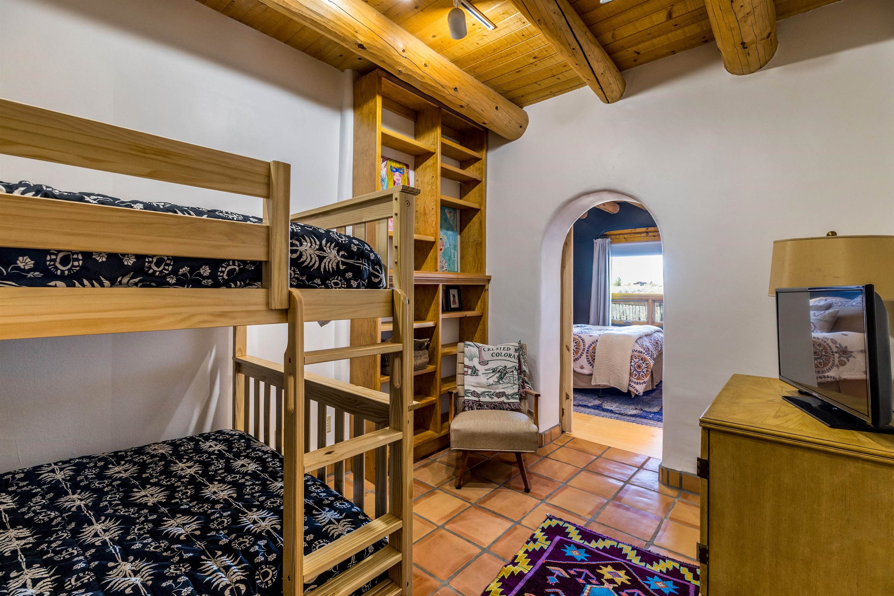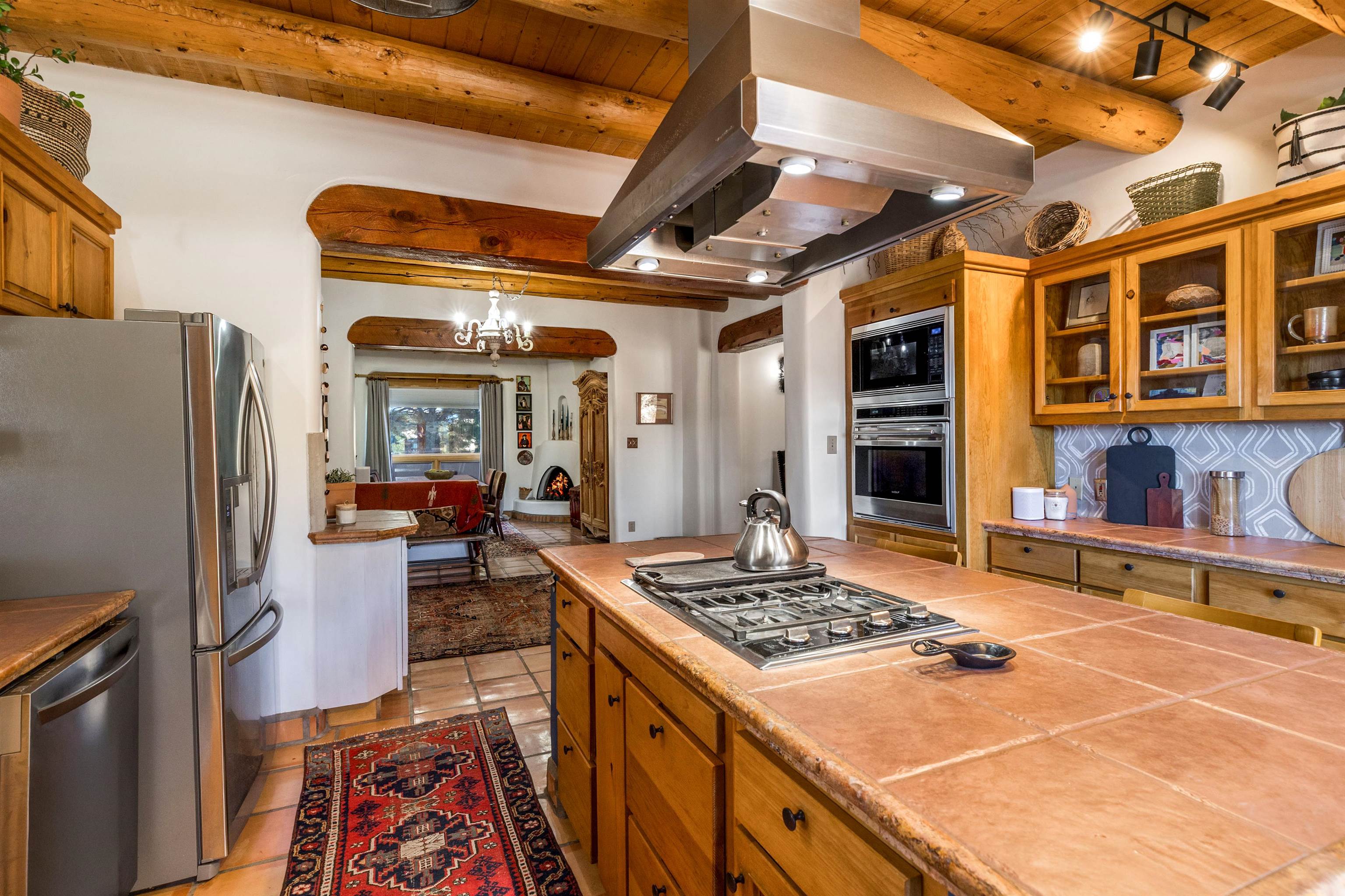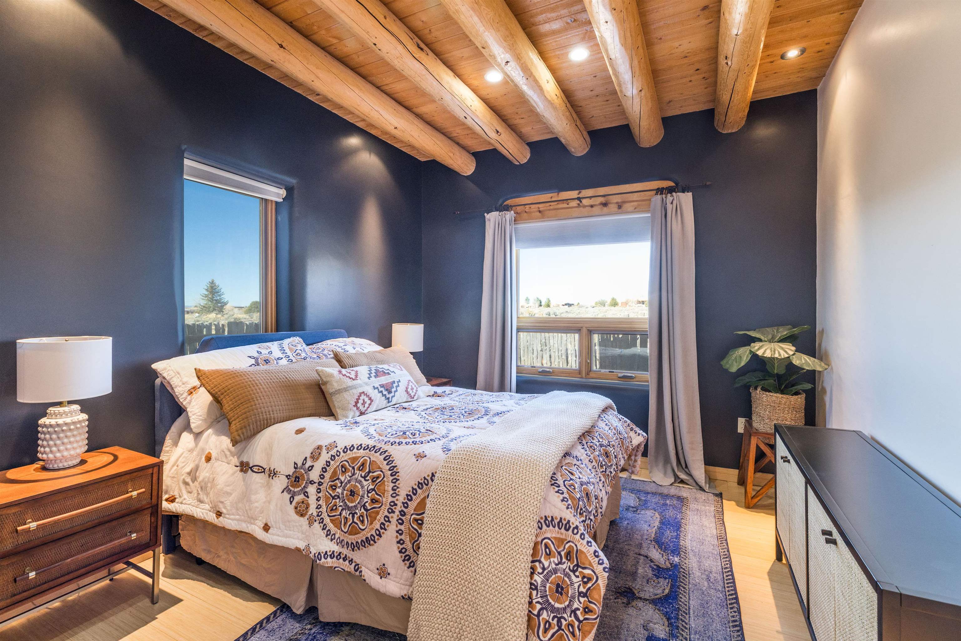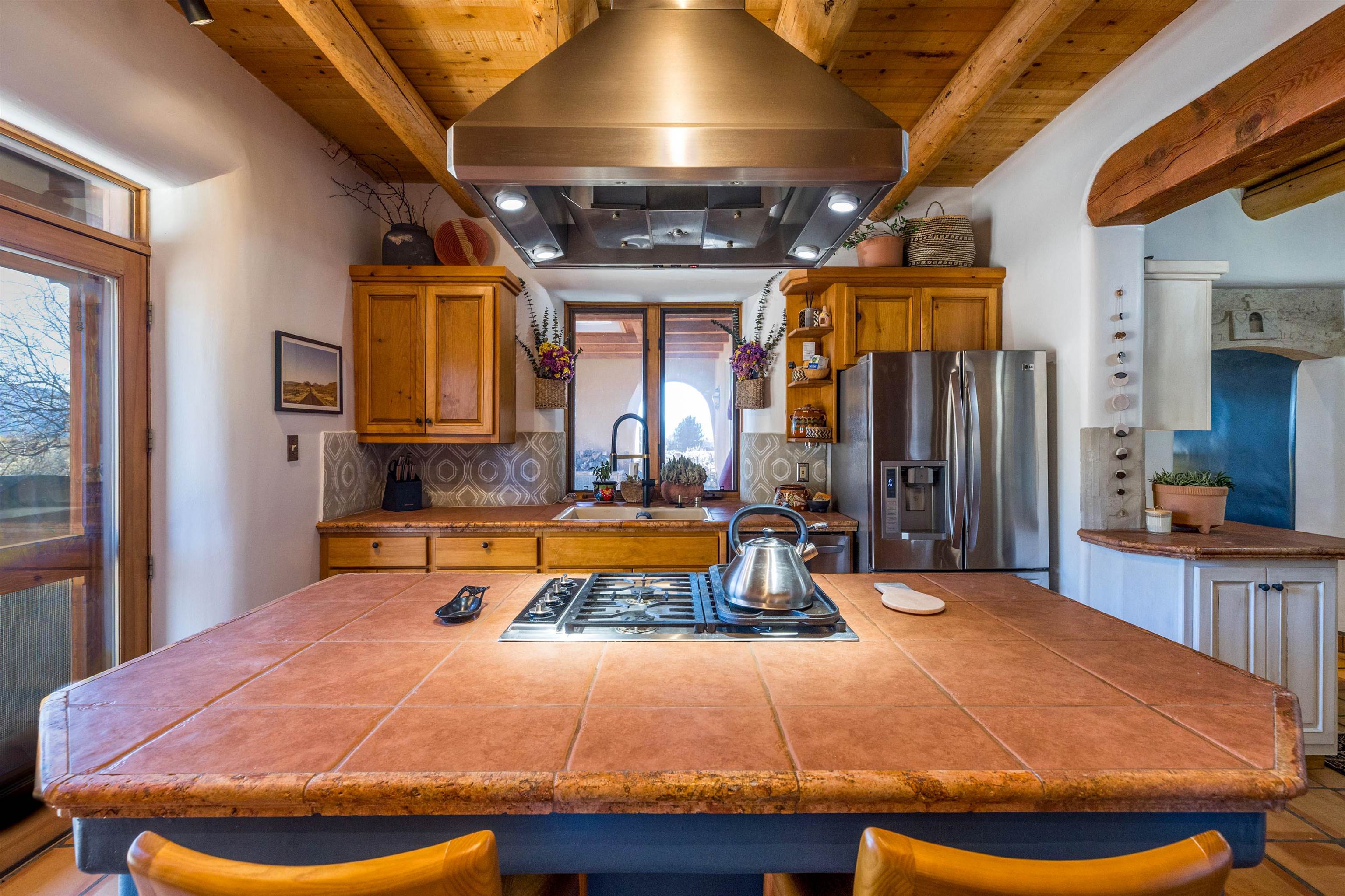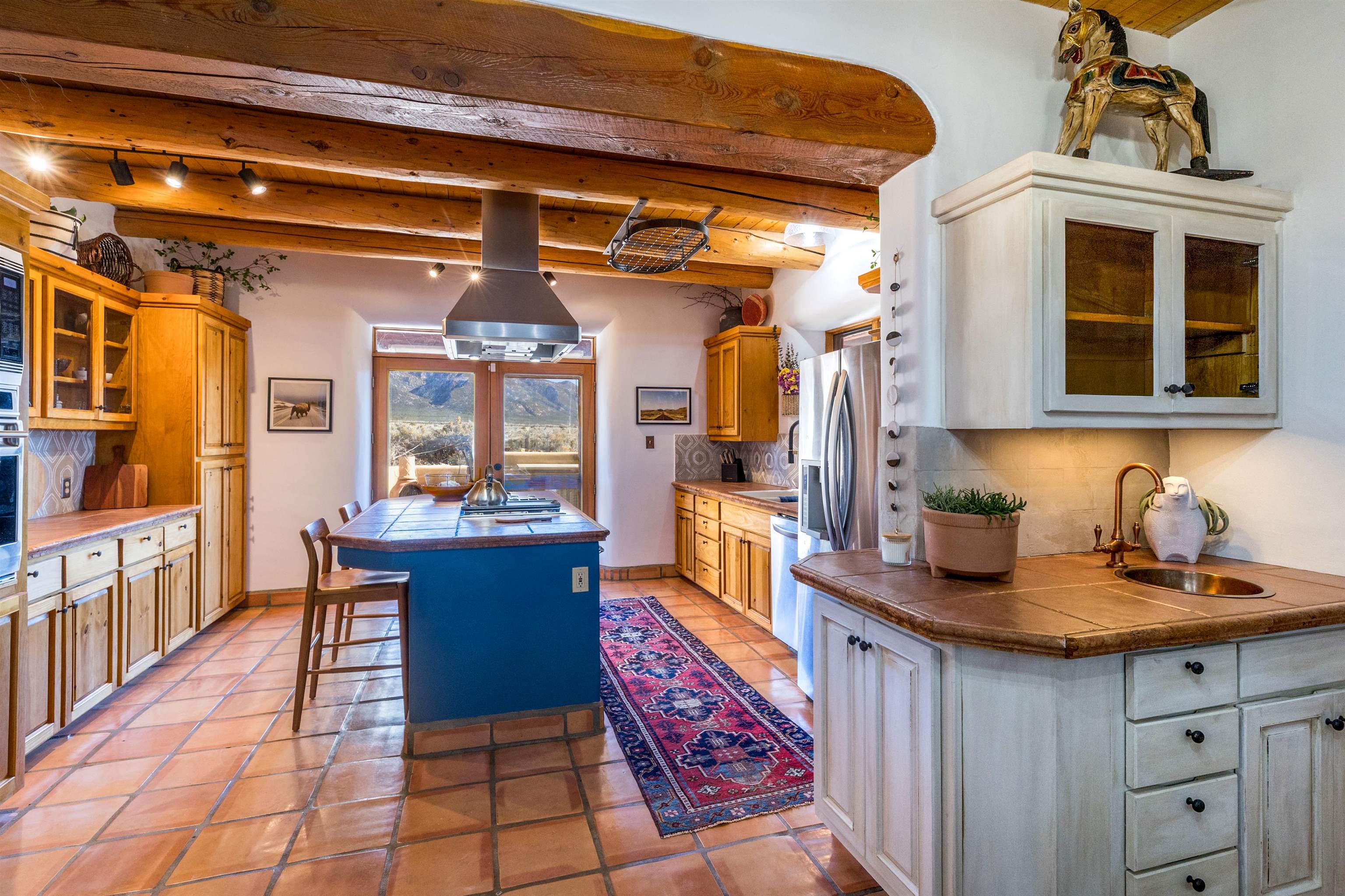 Bring the entire gang! Priced below a Dec. '25 Appraisal by Pam Bishop!!! Gorgeous adobe home in the desirable Upper Colonias neighborhood is perfectly positioned between the Town of Taos and Taos Ski Valley at the end of the road with expansive mountain views. Adobe construction, Viga wood beams on the ceilings, two southwestern style fireplaces, saltillo tile- all the beautiful, authentic features that are, sadly, disappearing from our market. This house has it all-4 bedrooms, three baths, two living rooms, a cozy dining room with a fireplace, and a bonus artist's studio/project room with a utility sink, loads of storage and lots of windows bringing in natural light from the north and east. The primary bedroom has large windows with sweeping views of the mountains, a luxurious 6-piece bath and a gigantic walk-in closet with generous built-in storage. The chef's kitchen has great appliances, a large island for counter top dining and direct access to a long portal, partially covered with a grill and entertaining space with front-row views of Taos Mountain. Great spaces for gathering, entertaining, or quietly unwinding after a long day on the river or playing in the mountains. This home is being sold with some furnishings and others are available on a separate bill of sale. Held by the Mountain: a North-side Adobe retreat.