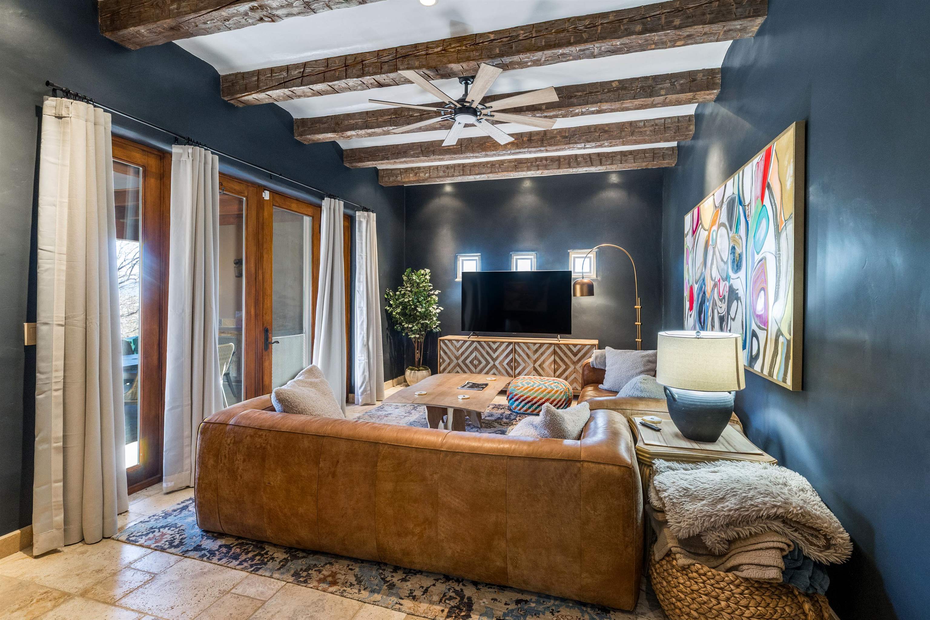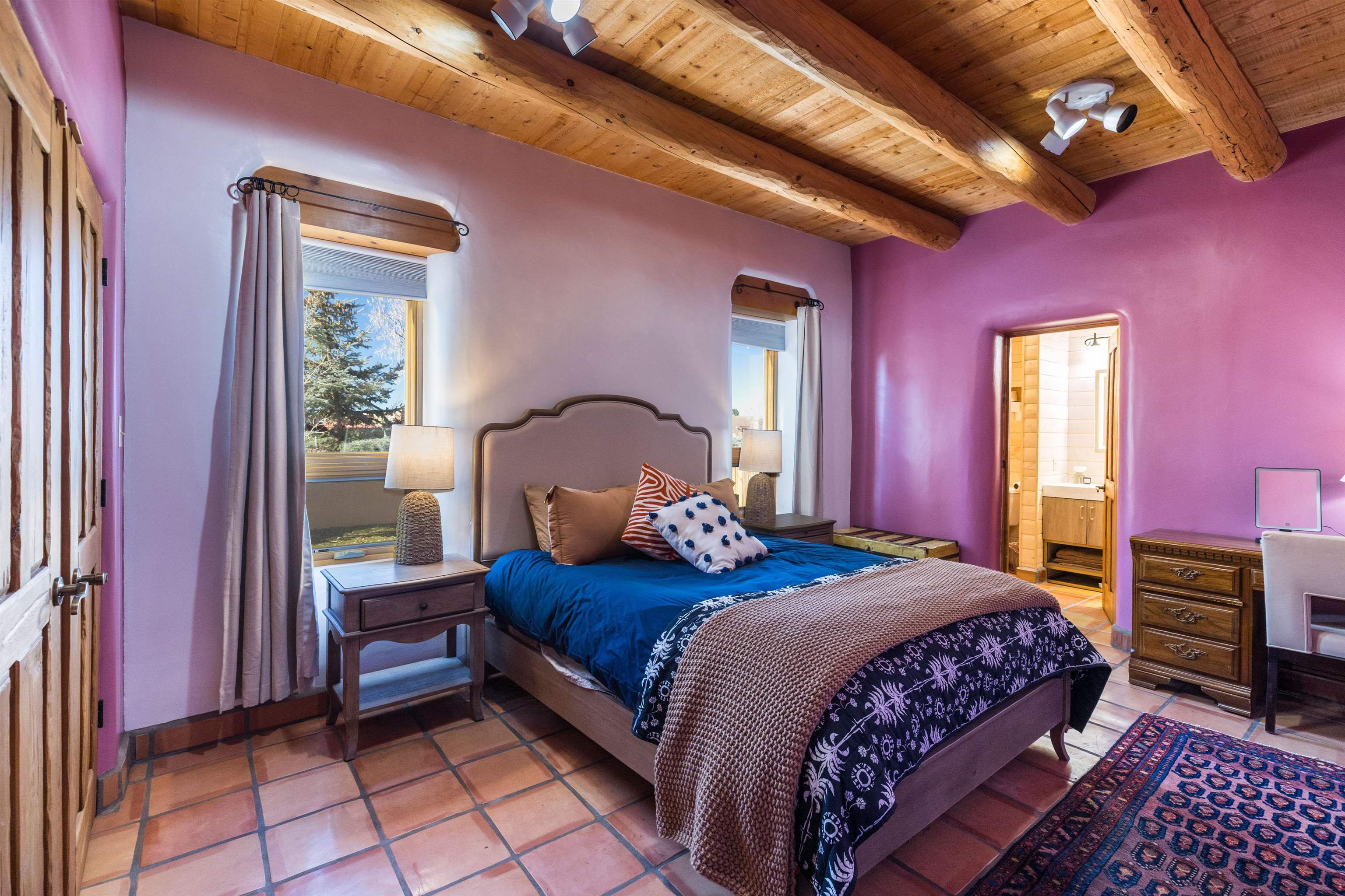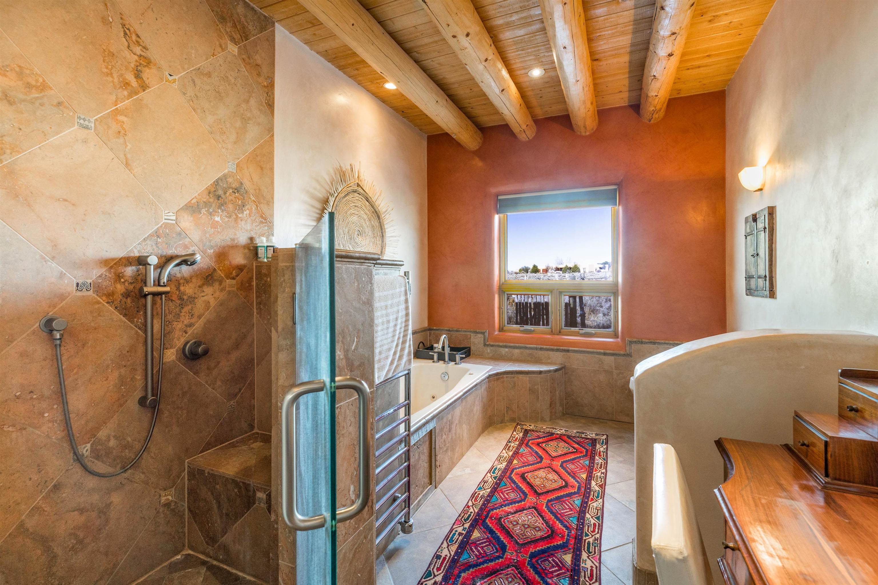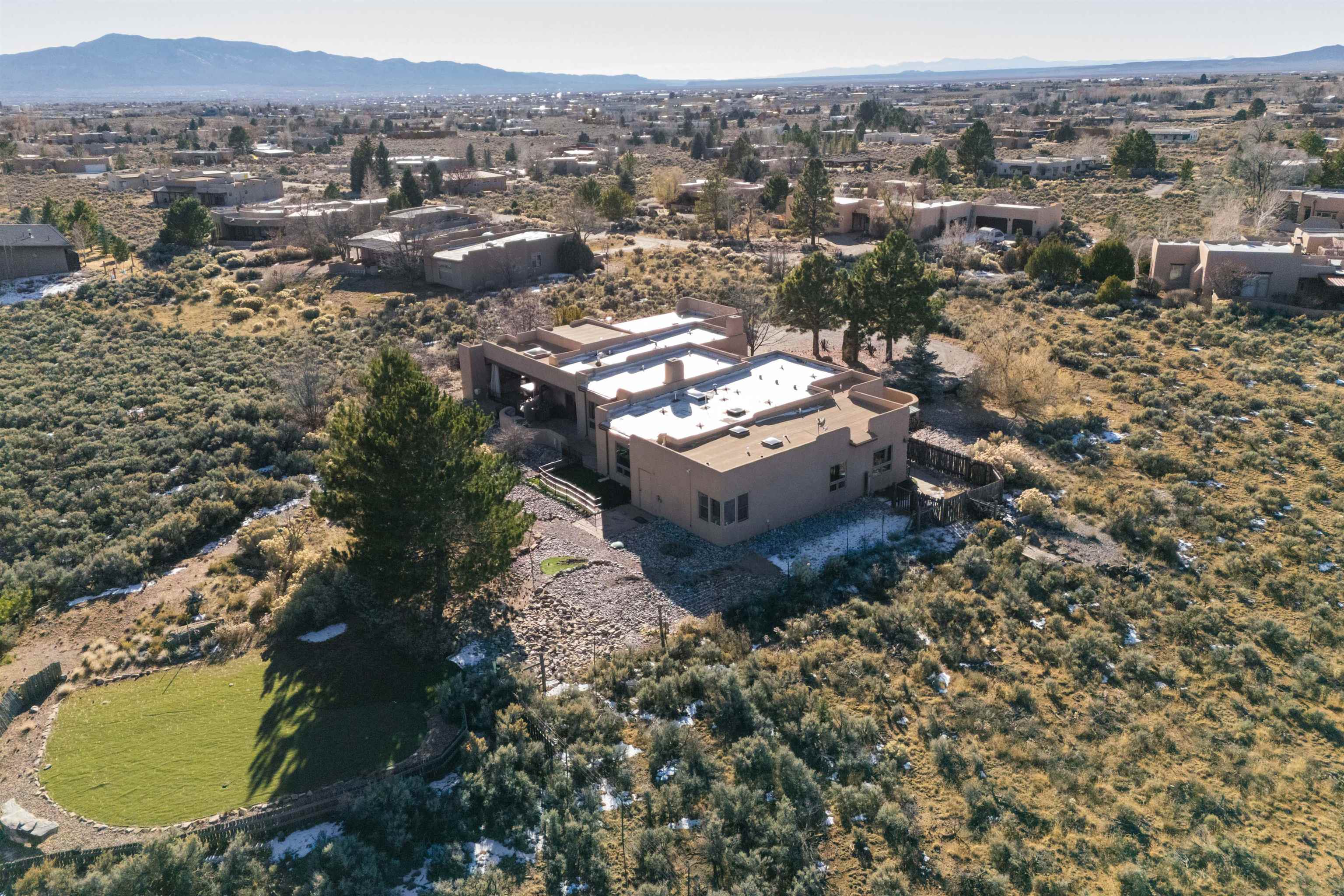 Bring the entire gang! Priced below a Dec. '25 Appraisal by Pam Bishop!!! Gorgeous adobe home in the desirable Upper Colonias neighborhood is perfectly positioned between the Town of Taos and Taos Ski Valley at the end of the road with expansive mountain views. Adobe construction, Viga wood beams on the ceilings, two southwestern style fireplaces, saltillo tile- all the beautiful, authentic features that are, sadly, disappearing from our market. This house has it all-4 bedrooms, three baths, two living rooms, a cozy dining room with a fireplace, and a bonus artist's studio/project room with a utility sink, loads of storage and lots of windows bringing in natural light from the north and east. The primary bedroom has large windows with sweeping views of the mountains, a luxurious 6-piece bath and a gigantic walk-in closet with generous built-in storage. The chef's kitchen has great appliances, a large island for counter top dining and direct access to a long portal, partially covered with a grill and entertaining space with front-row views of Taos Mountain. Great spaces for gathering, entertaining, or quietly unwinding after a long day on the river or playing in the mountains. This home is being sold with some furnishings and others are available on a separate bill of sale. Held by the Mountain: a North-side Adobe retreat.
