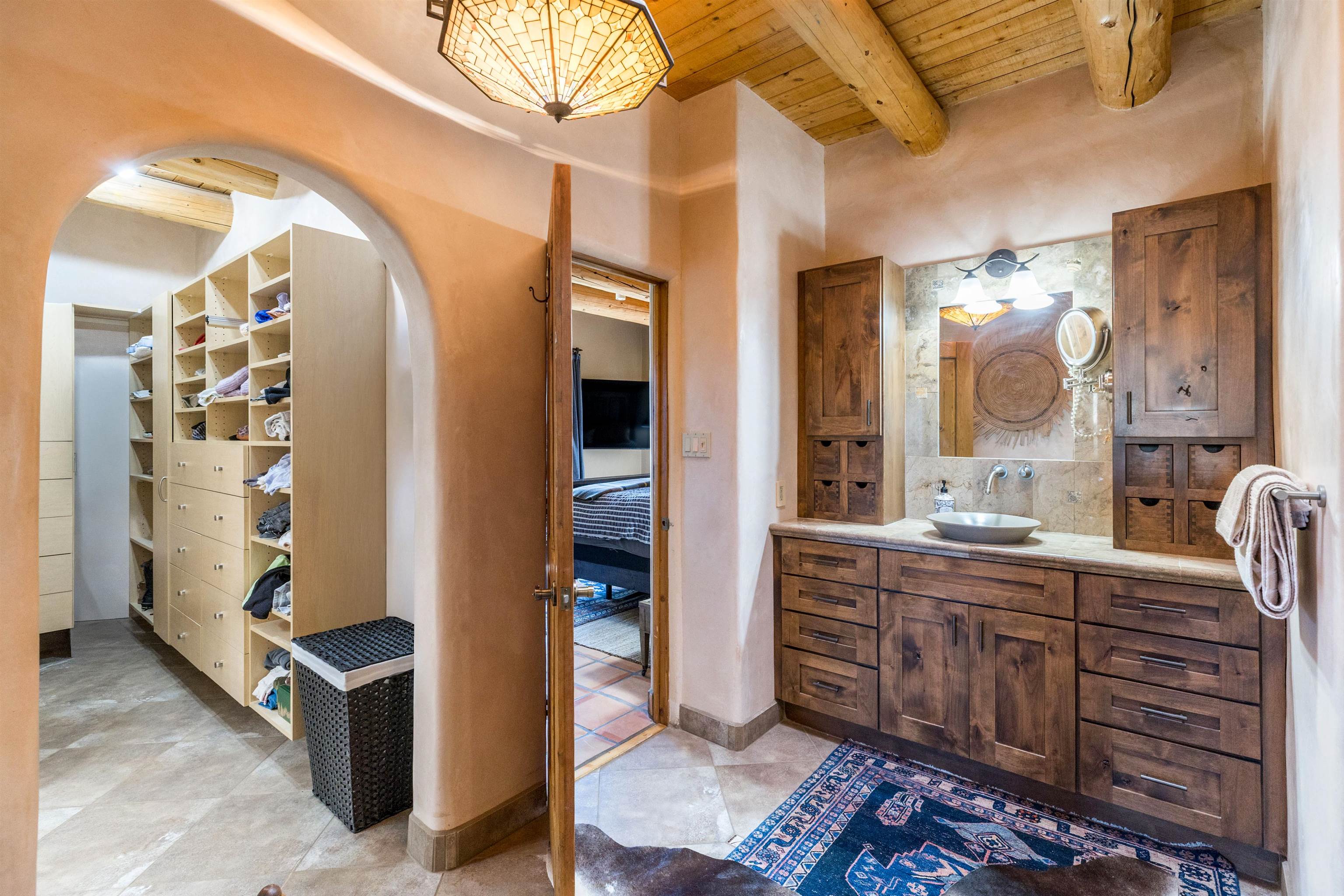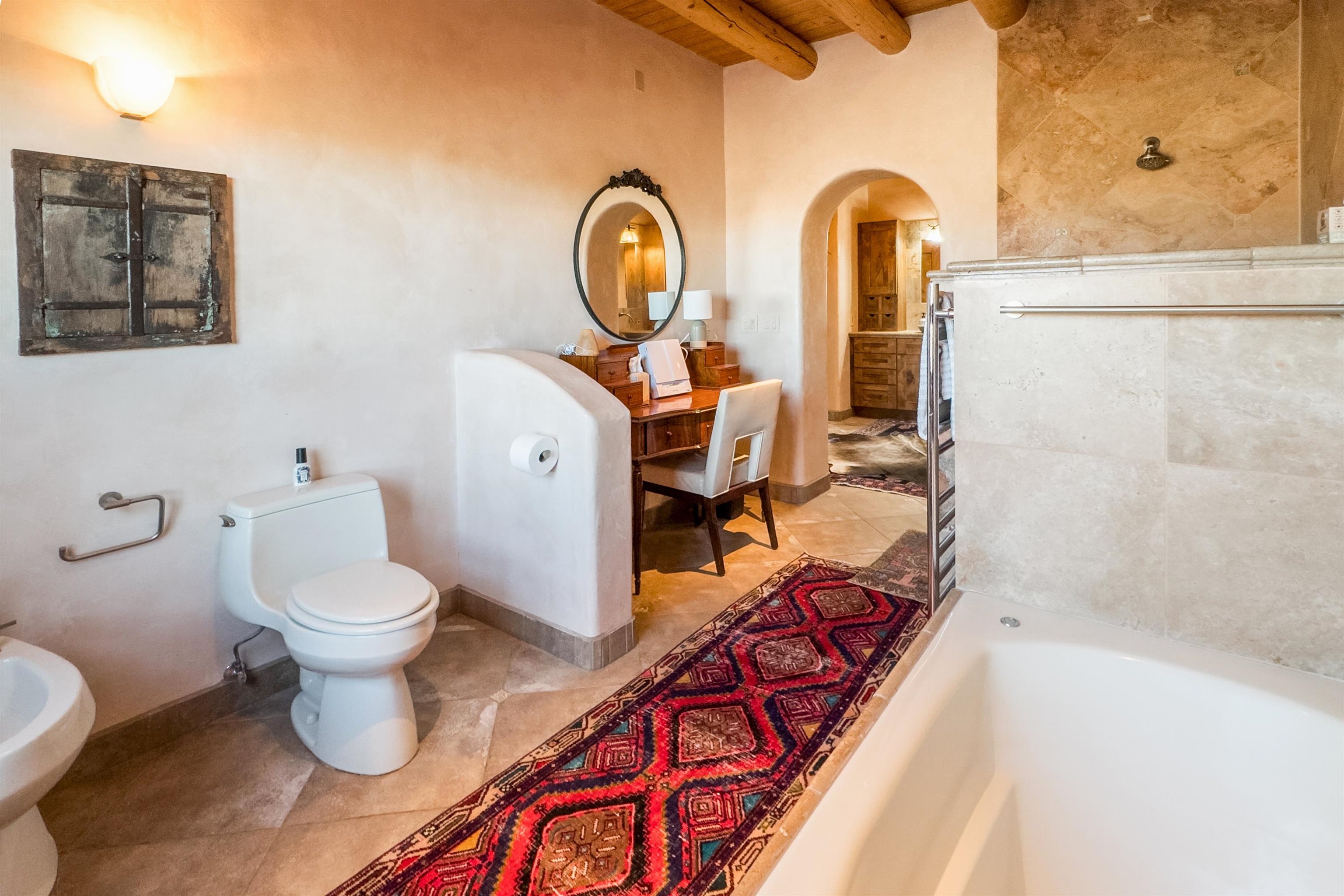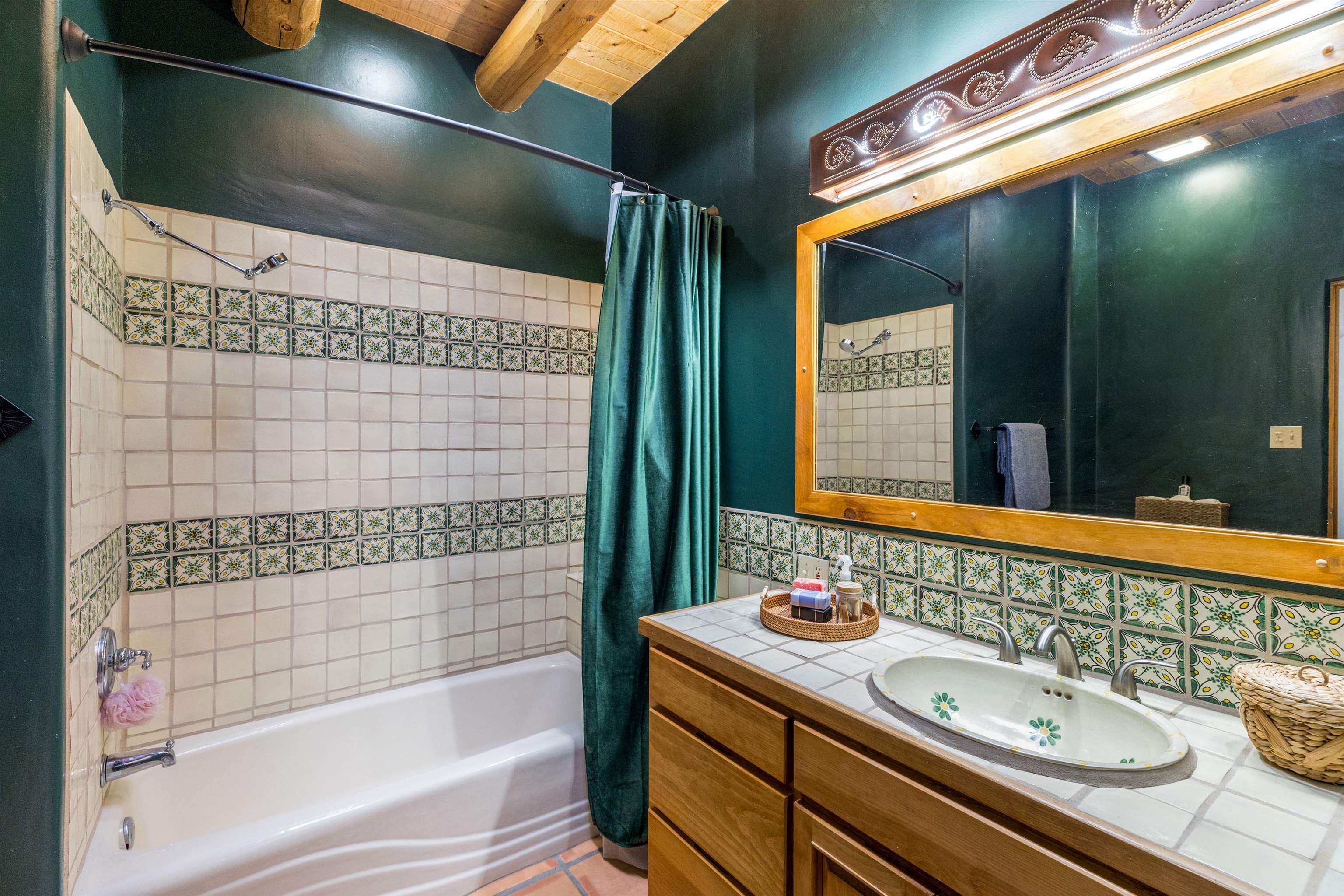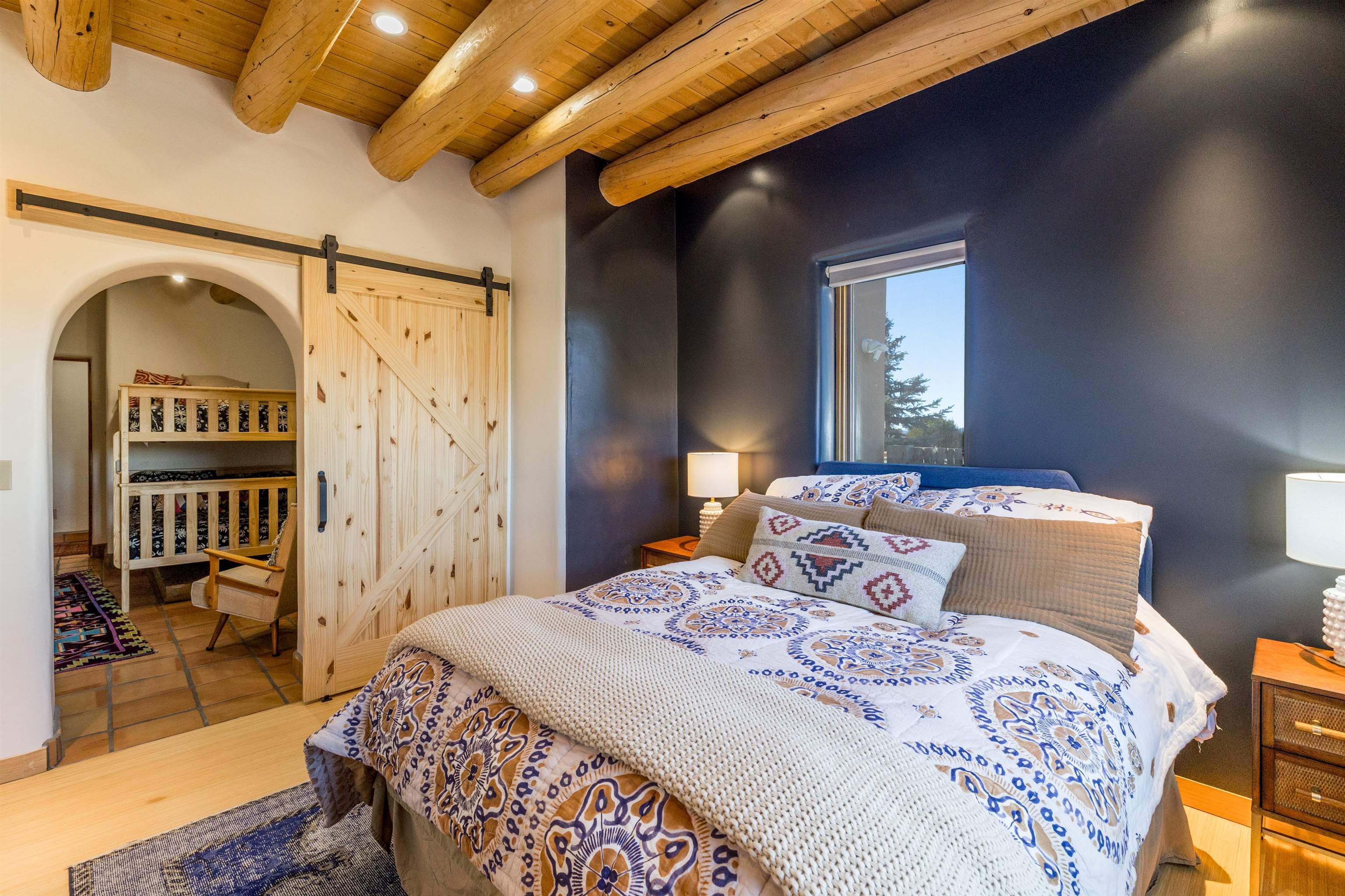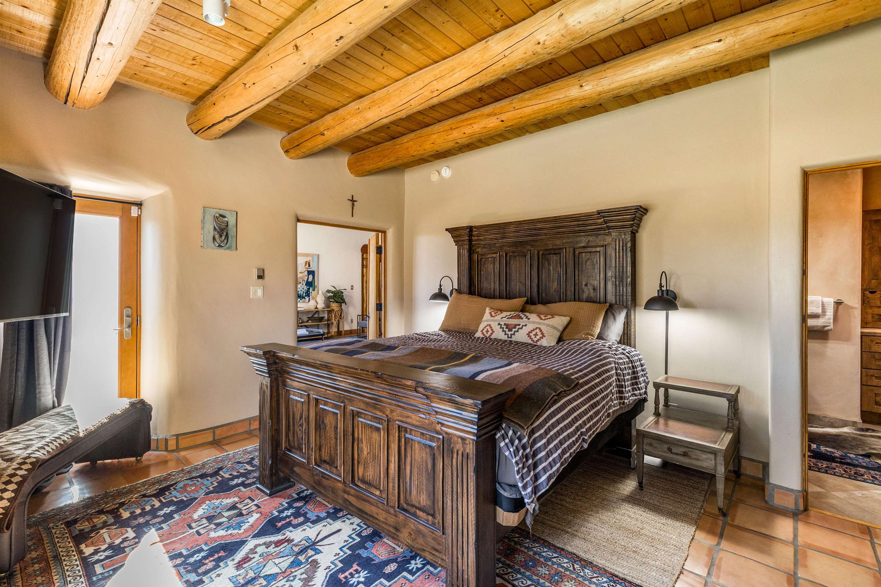 Bring the entire gang! Priced below a Dec. '25 Appraisal by Pam Bishop!!! Gorgeous adobe home in the desirable Upper Colonias neighborhood is perfectly positioned between the Town of Taos and Taos Ski Valley at the end of the road with expansive mountain views. Adobe construction, Viga wood beams on the ceilings, two southwestern style fireplaces, saltillo tile- all the beautiful, authentic features that are, sadly, disappearing from our market. This house has it all-4 bedrooms, three baths, two living rooms, a cozy dining room with a fireplace, and a bonus artist's studio/project room with a utility sink, loads of storage and lots of windows bringing in natural light from the north and east. The primary bedroom has large windows with sweeping views of the mountains, a luxurious 6-piece bath and a gigantic walk-in closet with generous built-in storage. The chef's kitchen has great appliances, a large island for counter top dining and direct access to a long portal, partially covered with a grill and entertaining space with front-row views of Taos Mountain. Great spaces for gathering, entertaining, or quietly unwinding after a long day on the river or playing in the mountains. This home is being sold with some furnishings and others are available on a separate bill of sale. Held by the Mountain: a North-side Adobe retreat.