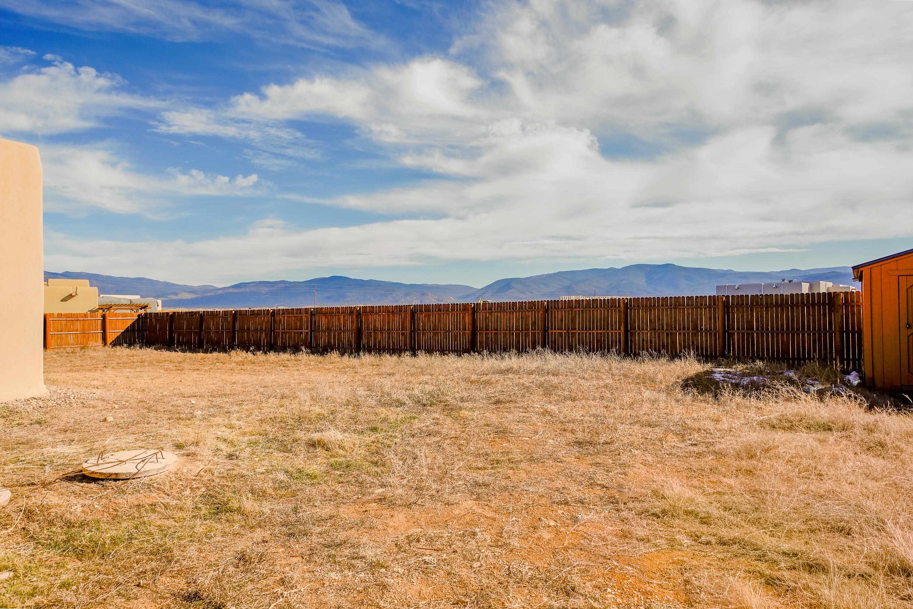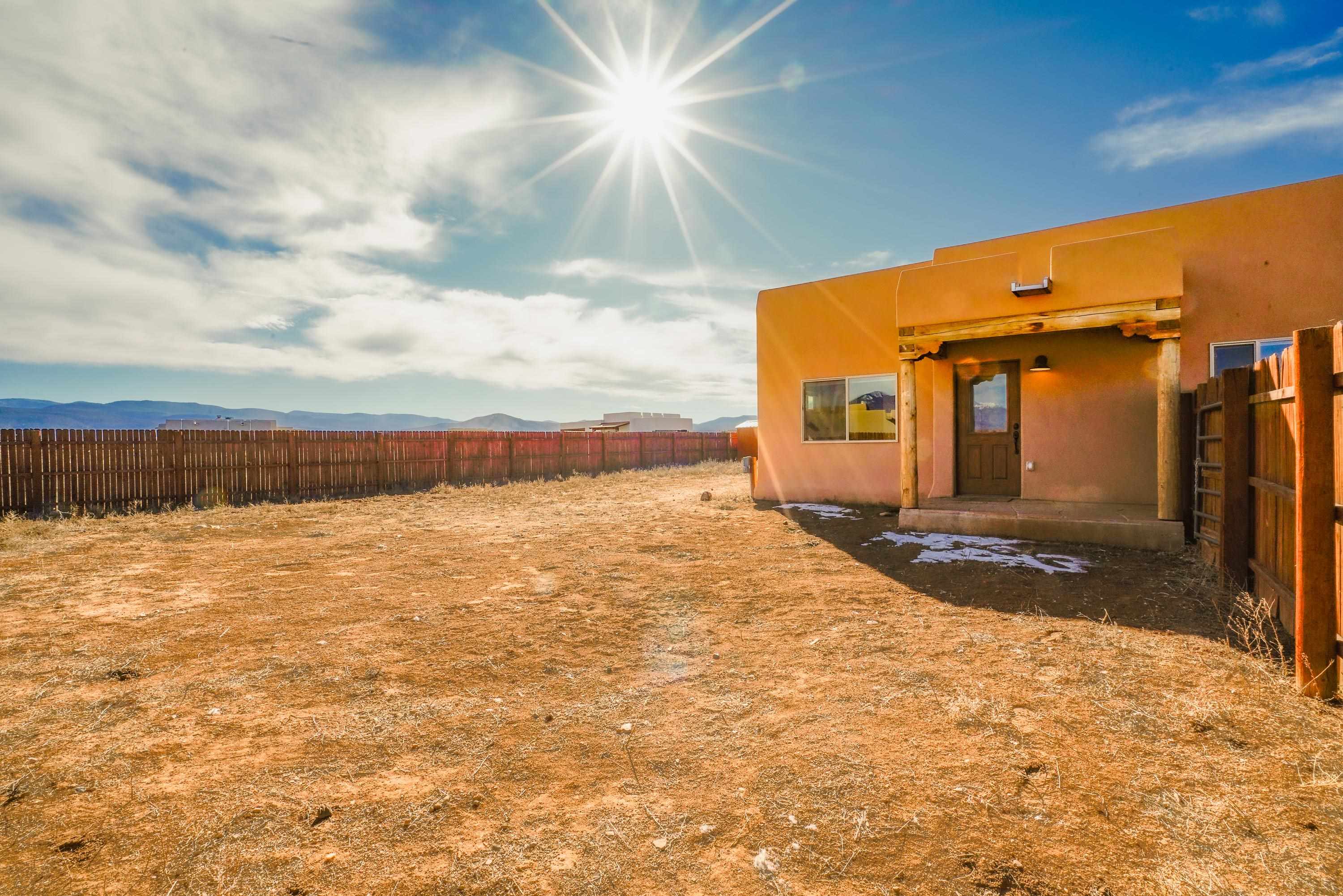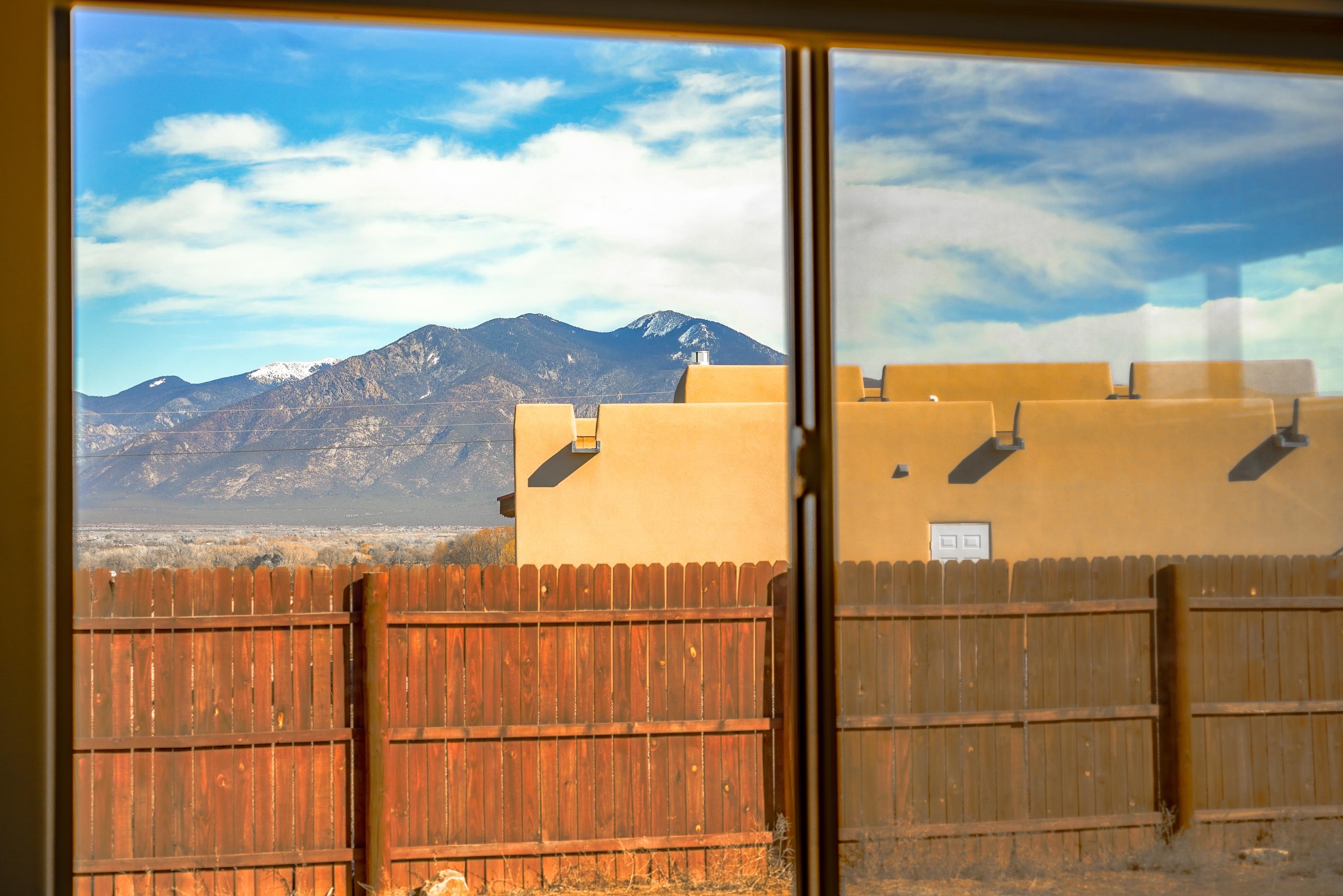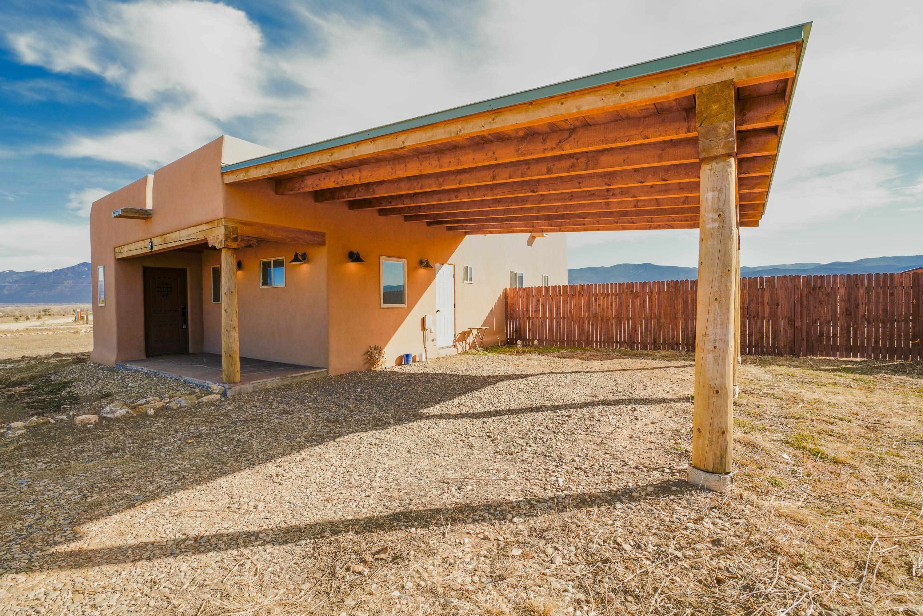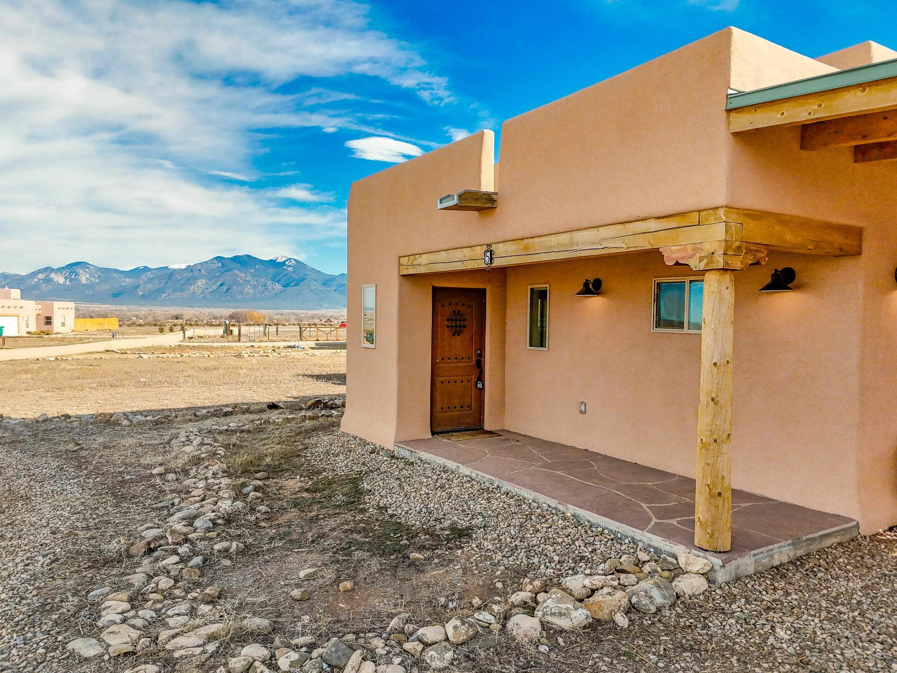 Discover classic Northern New Mexico charm in this beautiful 1,000-square-foot Pueblo-style home. This 2-bedroom, 2-bath residence blends authentic character with modern comfort. The home, built in 2022 offers hot water radiant heat, stained cement floors, and custom blinds on all windows, creating a warm and inviting interior year-round. Enjoy indoor-outdoor living with a covered porch and a fenced backyard—ideal for relaxing, entertaining, or pets. A two-car attached carport provides convenient covered parking. The property is well-equipped with fiber-optic internet, town water, Navien on-demand water heater and natural gas for easy, efficient living. The beautifully appointed kitchen has stainless steel appliances and gas oven/range. Take in breathtaking views of the Sangre de Cristo Mountains right from home, while being just minutes from hiking trails and only five minutes from local restaurants and shops. Located 15 minutes from Taos Plaza, you’ll have quick access to renowned art galleries, dining, shopping, and nightlife. Taos Ski Valley is just 35 minutes away. This charming Pueblo-style home offers the perfect balance of scenic beauty, comfort, and proximity to everything Taos has to offer.