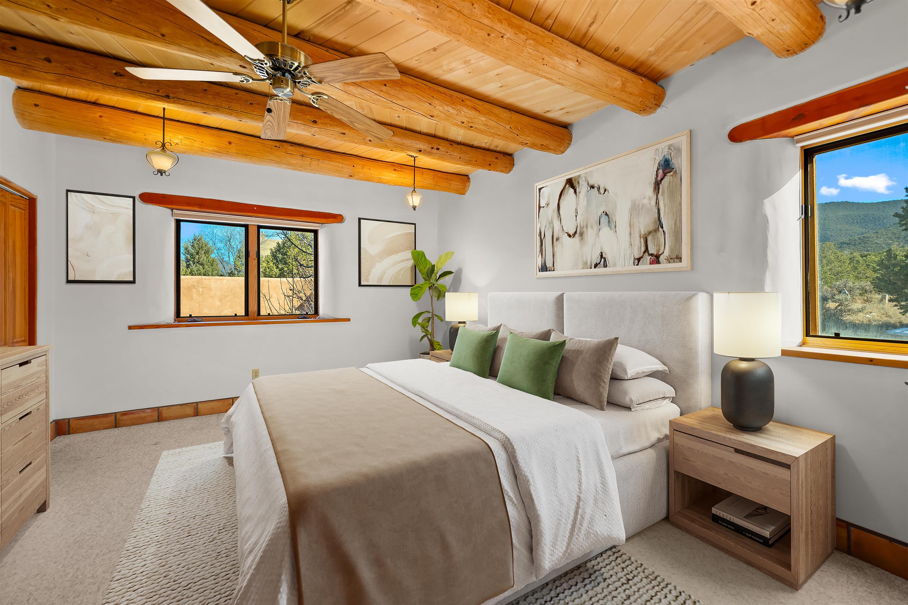 Southwest-style home offering classic New Mexico character with warm wood accents and flexible living spaces. Exposed vigas and wood-plank ceilings create architectural interest throughout, complemented by saltillo tile and carpeted areas for comfort. The open living and dining areas are anchored by a traditional kiva fireplace, providing a cozy focal point and seamless flow for everyday living or entertaining. The kitchen features custom wood cabinetry, tiled countertops, a center island with seating, and abundant natural light. Bedrooms are generously sized with wood-beamed ceilings and ample closet space. Bathrooms include colorful tile accents and well-laid-out vanities. A dedicated laundry/mechanical room adds functionality. Additional highlights include an attached garage/workshop space with storage potential, multiple exterior access points, and a classic adobe-style exterior set against a scenic Northern New Mexico backdrop. This property offers a solid foundation for a primary residence, second home, or creative retreat.