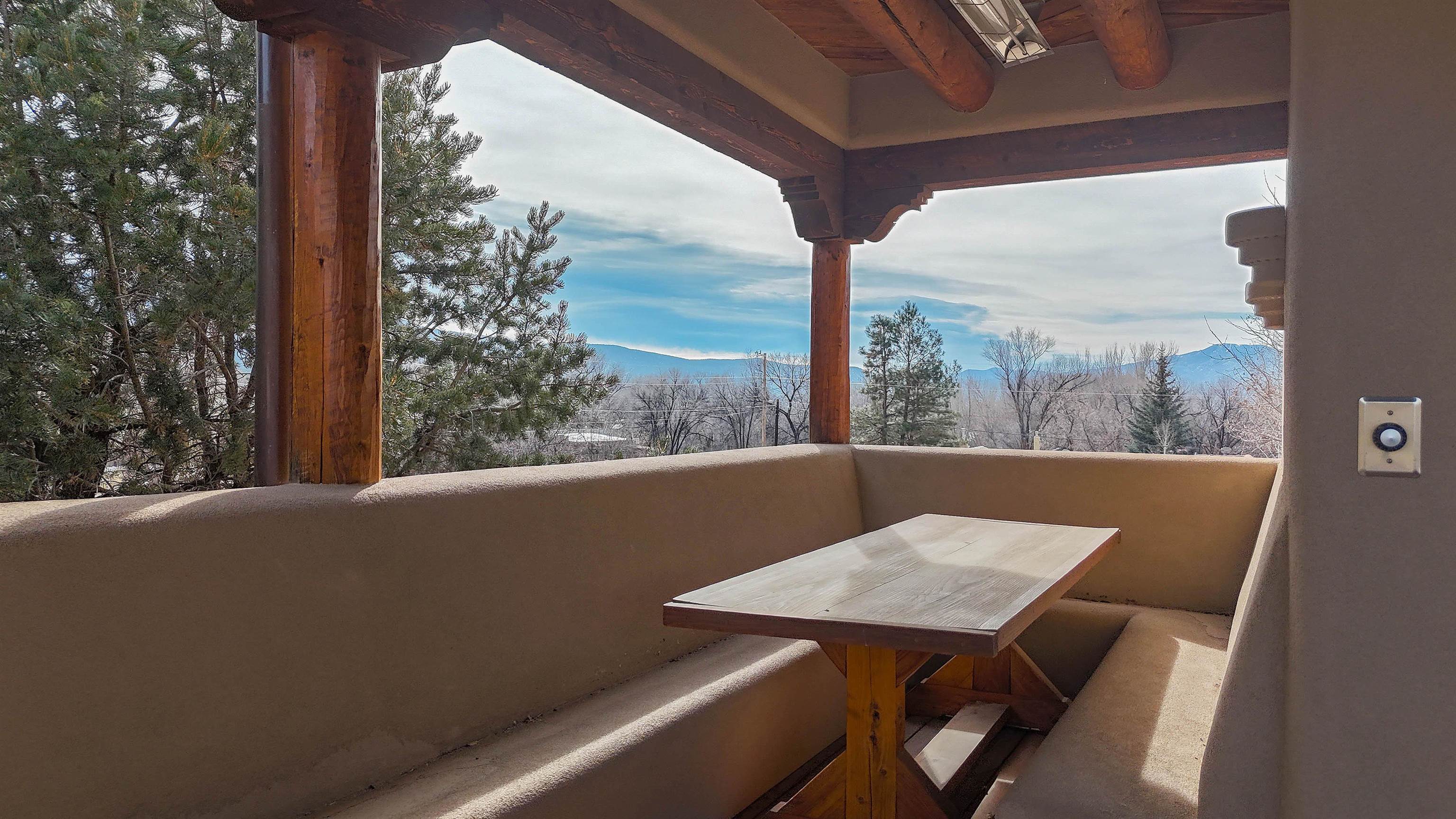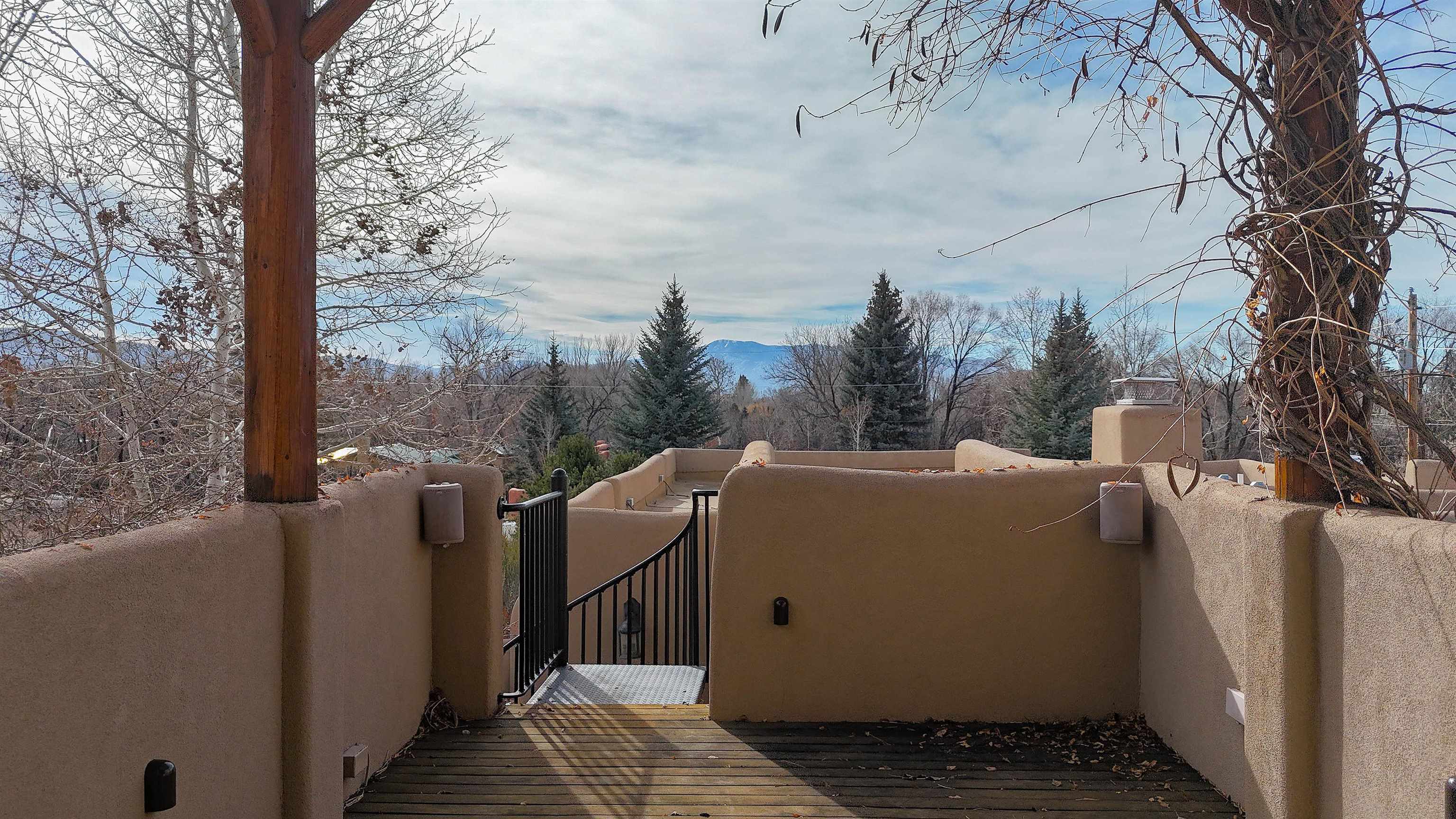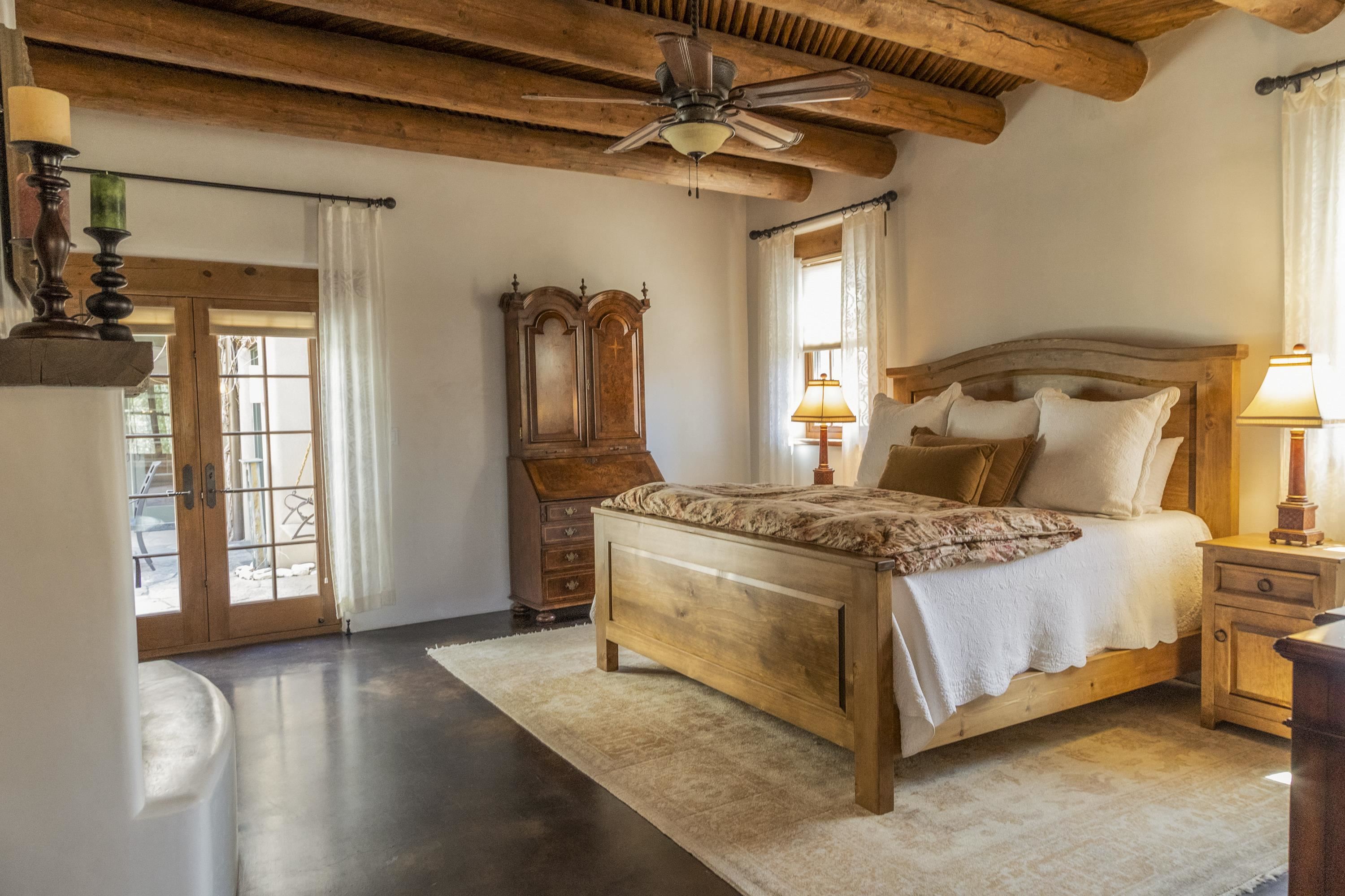 THE DEVARGAS SANCTUARY-4,950 SQ FT | 5 BEDS | 4 BATHS | GUEST CASITA Craftsmanship Meets High-Desert Luxury - Escape to a sanctuary where historic soul meets modern sophistication. Situated on a lush .385-acre parcel just steps from the vibrant Taos Plaza, this 4,950-square-foot estate is an architectural masterpiece consisting of a three-bedroom main house and a separate, attached two-bedroom casita. From the hand-crafted front door to the soaring ten-foot ceilings, every inch of the residence reflects a commitment to quality. The interior is a symphony of traditional textures, featuring hand-plastered walls, polished concrete floors, and the rhythmic beauty of viga and herringbone latilla ceilings. The heart of the home is an epicurean kitchen designed for the serious chef, anchored by a Jade Range and GE Monogram double-ovens. This culinary space flows seamlessly into a beautiful dining room, a private interior courtyard or out to the lush perennial gardens for sun-drenched alfresco dining. For the homeowner seeking ultimate serenity, the primary wing offers a secluded retreat complete with a spa-inspired bathroom, dual dressing rooms, and a southwestern fireplace. Innovation meets tradition throughout the floor plan, most notably in the upper-level great room. Accessible via a graceful staircase or a private elevator, this grand space is defined by elegant windows, a hand-carved mantel, and the thoughtful addition of a stylish second-floor kitchenette. This secondary kitchen provides a high level of convenience, allowing for effortless hosting on the upper level without the need to descend to the main floor. Whether you are preparing morning coffee to enjoy by the fire or serving refreshments to guests on the terrace, this functional space enhances the home's versatility. The great room opens onto a private portal where a raised wood-burning fireplace and built-in bancos provide the perfect vantage point for watching the light change over the majestic Taos Mountain. An additional room on this level currently serves as a refined office but offers the flexibility to be used as a bedroom, supported by a contemporary full bathroom nearby. The proximity of the kitchenette makes this upper level feel like a self-contained suite, perfect for long-term guests or a quiet evening retreat. The amenities extend far beyond the main living quarters. For the serious collector, an impressive 1,350-bottle wine cellar awaits, finished with a granite tasting counter and a reassuring battery backup system. Visitors will find their own paradise in the attached guest casita, which offers a completely separate entrance for maximum privacy. This delightful retreat features two additional bedrooms and one bathroom, comfortably accommodating up to four guests with its own kitchenette, living room with a fireplace, and a charming dining area. The estate grounds are a true outdoor oasis, fully enclosed by adobe walls and featuring tiered rock gardens, a gated vegetable patch, and a secluded lawn with a private hot tub. Additionally, a free-standing, 475-square-foot climate-controlled studio provides a turnkey opportunity for an artist’s workshop or creative sanctuary. Located within walking distance to the historic galleries and celebrated cafes of Taos, this property—with an adjoining lot also available—represents a rare chance to own a five-bedroom, four-bathroom masterpiece in the heart of the Taos.