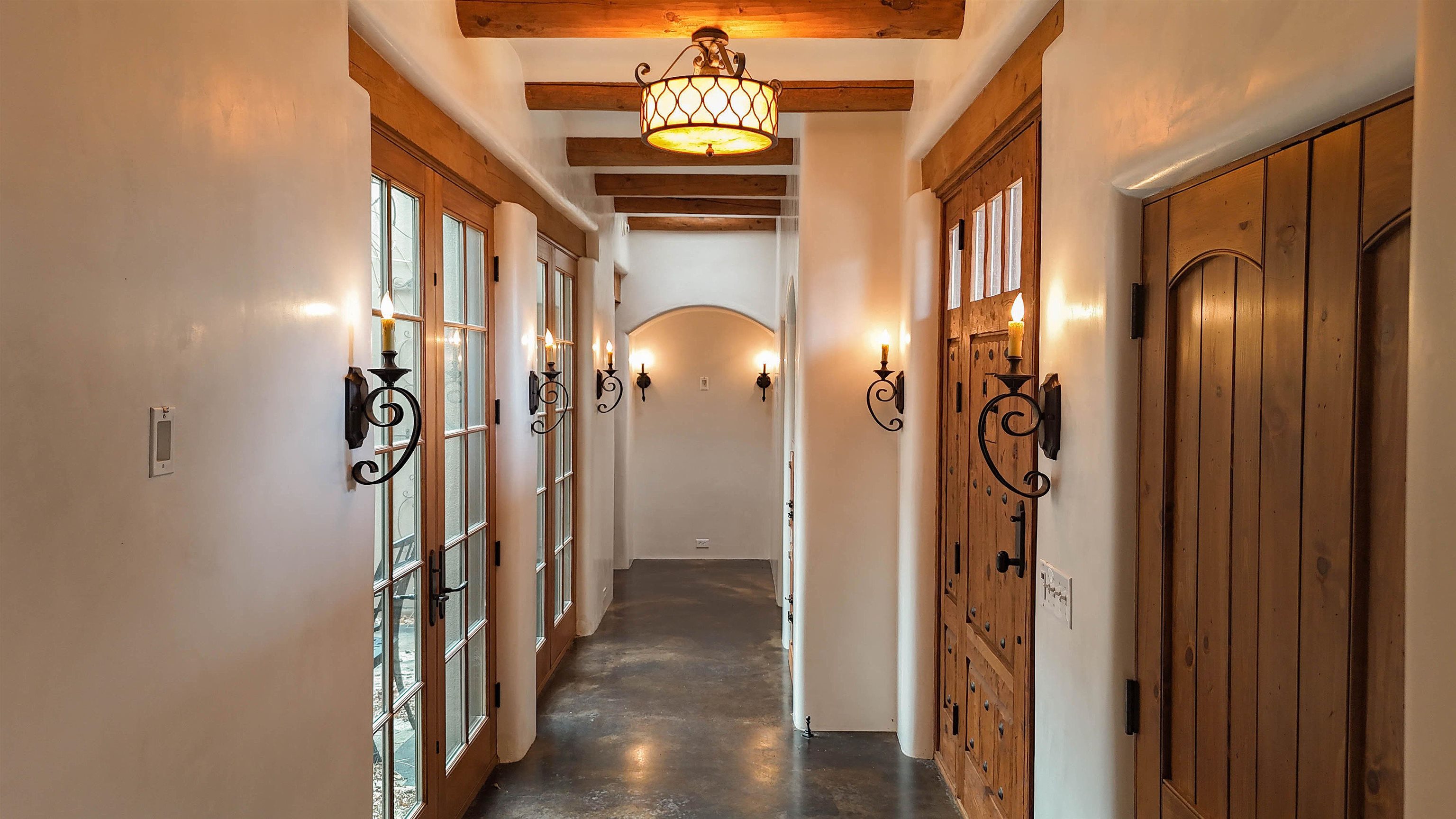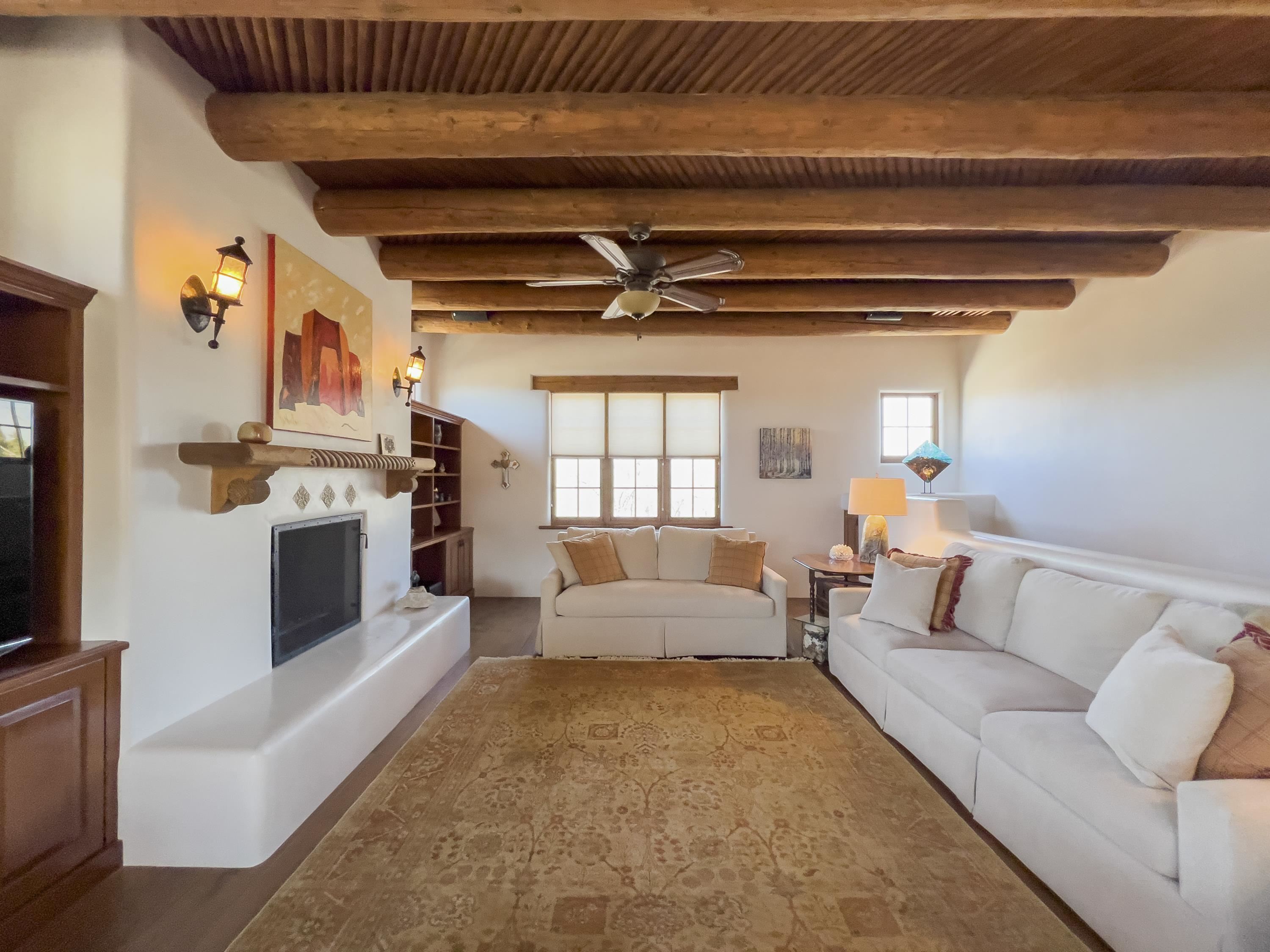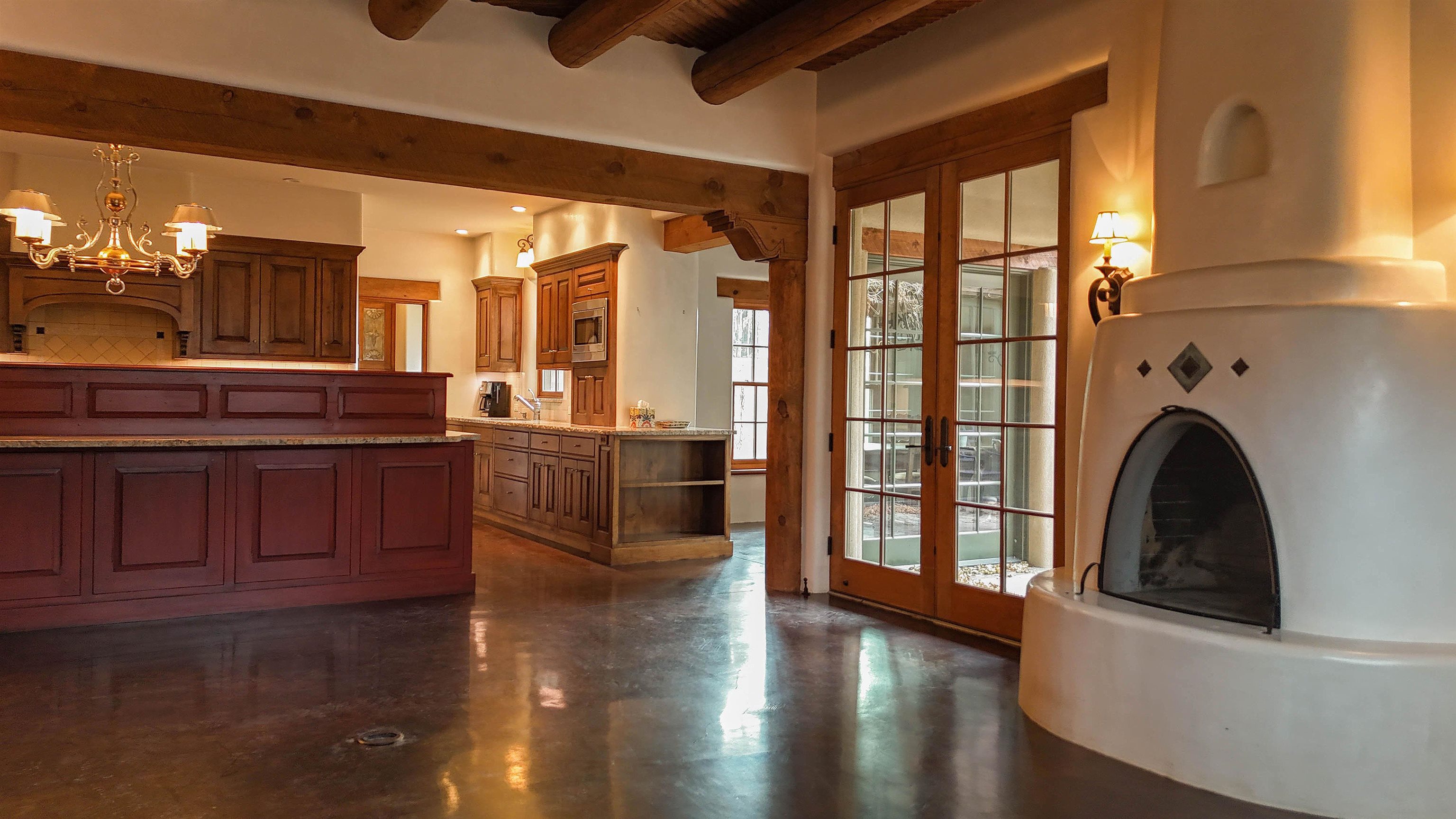 THE DEVARGAS SANCTUARY-4,950 SQ FT | 5 BEDS | 4 BATHS | GUEST CASITA Craftsmanship Meets High-Desert Luxury - Escape to a sanctuary where historic soul meets modern sophistication. Situated on a lush .385-acre parcel just steps from the vibrant Taos Plaza, this 4,950-square-foot estate is an architectural masterpiece consisting of a three-bedroom main house and a separate, attached two-bedroom casita. From the hand-crafted front door to the soaring ten-foot ceilings, every inch of the residence reflects a commitment to quality. The interior is a symphony of traditional textures, featuring hand-plastered walls, polished concrete floors, and the rhythmic beauty of viga and herringbone latilla ceilings. The heart of the home is an epicurean kitchen designed for the serious chef, anchored by a Jade Range and GE Monogram double-ovens. This culinary space flows seamlessly into a beautiful dining room, a private interior courtyard or out to the lush perennial gardens for sun-drenched alfresco dining. For the homeowner seeking ultimate serenity, the primary wing offers a secluded retreat complete with a spa-inspired bathroom, dual dressing rooms, and a southwestern fireplace. Innovation meets tradition throughout the floor plan, most notably in the upper-level great room. Accessible via a graceful staircase or a private elevator, this grand space is defined by elegant windows, a hand-carved mantel, and the thoughtful addition of a stylish second-floor kitchenette. This secondary kitchen provides a high level of convenience, allowing for effortless hosting on the upper level without the need to descend to the main floor. Whether you are preparing morning coffee to enjoy by the fire or serving refreshments to guests on the terrace, this functional space enhances the home's versatility. The great room opens onto a private portal where a raised wood-burning fireplace and built-in bancos provide the perfect vantage point for watching the light change over the majestic Taos Mountain. An additional room on this level currently serves as a refined office but offers the flexibility to be used as a bedroom, supported by a contemporary full bathroom nearby. The proximity of the kitchenette makes this upper level feel like a self-contained suite, perfect for long-term guests or a quiet evening retreat. The amenities extend far beyond the main living quarters. For the serious collector, an impressive 1,350-bottle wine cellar awaits, finished with a granite tasting counter and a reassuring battery backup system. Visitors will find their own paradise in the attached guest casita, which offers a completely separate entrance for maximum privacy. This delightful retreat features two additional bedrooms and one bathroom, comfortably accommodating up to four guests with its own kitchenette, living room with a fireplace, and a charming dining area. The estate grounds are a true outdoor oasis, fully enclosed by adobe walls and featuring tiered rock gardens, a gated vegetable patch, and a secluded lawn with a private hot tub. Additionally, a free-standing, 475-square-foot climate-controlled studio provides a turnkey opportunity for an artist’s workshop or creative sanctuary. Located within walking distance to the historic galleries and celebrated cafes of Taos, this property—with an adjoining lot also available—represents a rare chance to own a five-bedroom, four-bathroom masterpiece in the heart of the Taos.