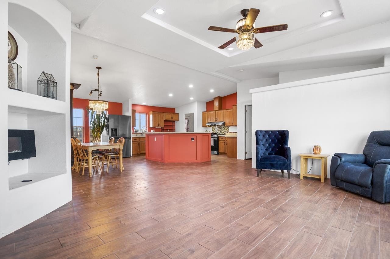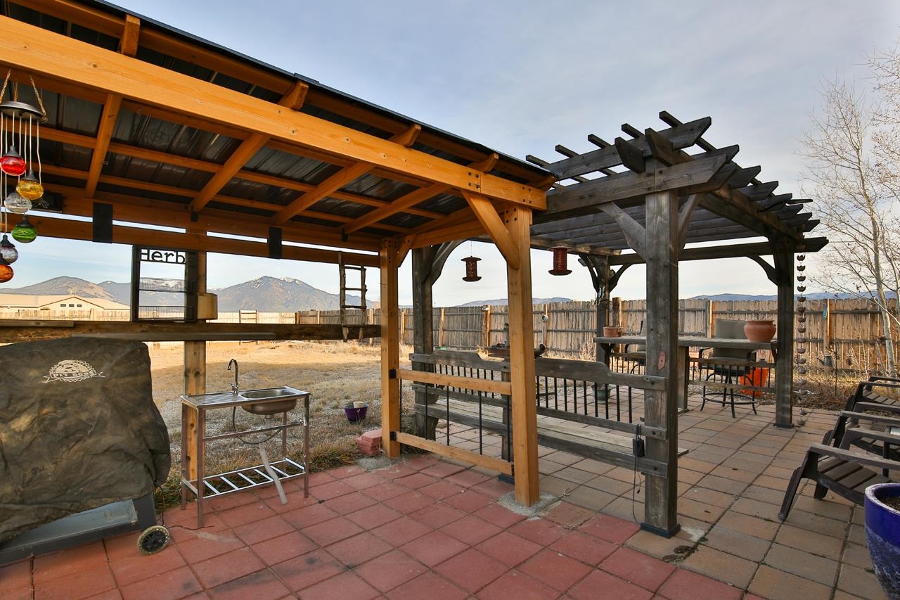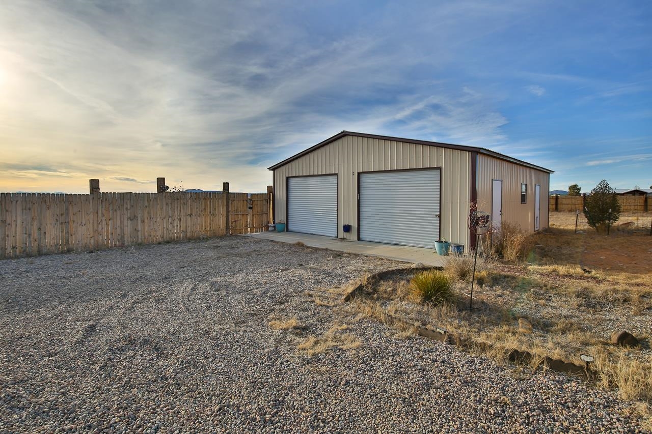 Welcome to this well-maintained 3-bedroom, 2-bath modular home with beautiful mountain and sunset views. The property is fully fenced and includes a large American Steel metal garage with space for up to four vehicles, making it ideal for storage, hobbies, or work needs. Inside, the home offers practical updates over the years, including newer lighting fixtures, tile flooring, air conditioning, and a comfortable bathroom setup with a jetted tub and walk-in shower. The kitchen features upgraded smart appliances, allowing easy control from your phone, supported by fiber-optic internet availability. An EV hook-up is also in place for added convenience. Outside, enjoy a covered gazebo for relaxing or entertaining, along with a fenced yard and planting beds ready for gardening. With easy move-in condition and scenic views, this home offers a comfortable and functional place to settle in and make your own.