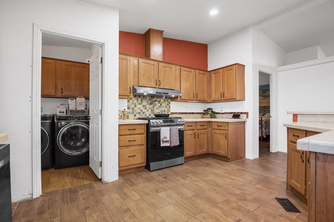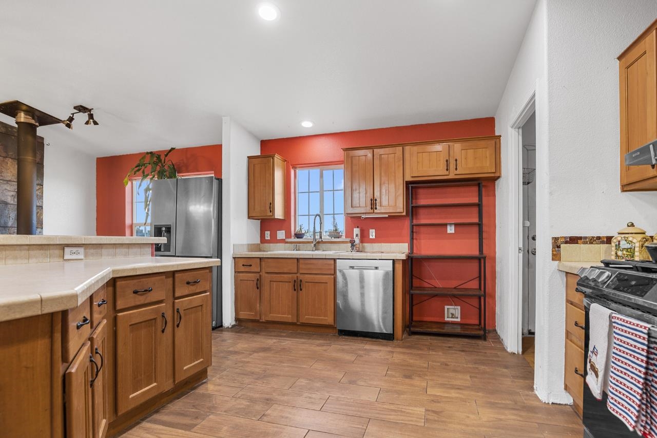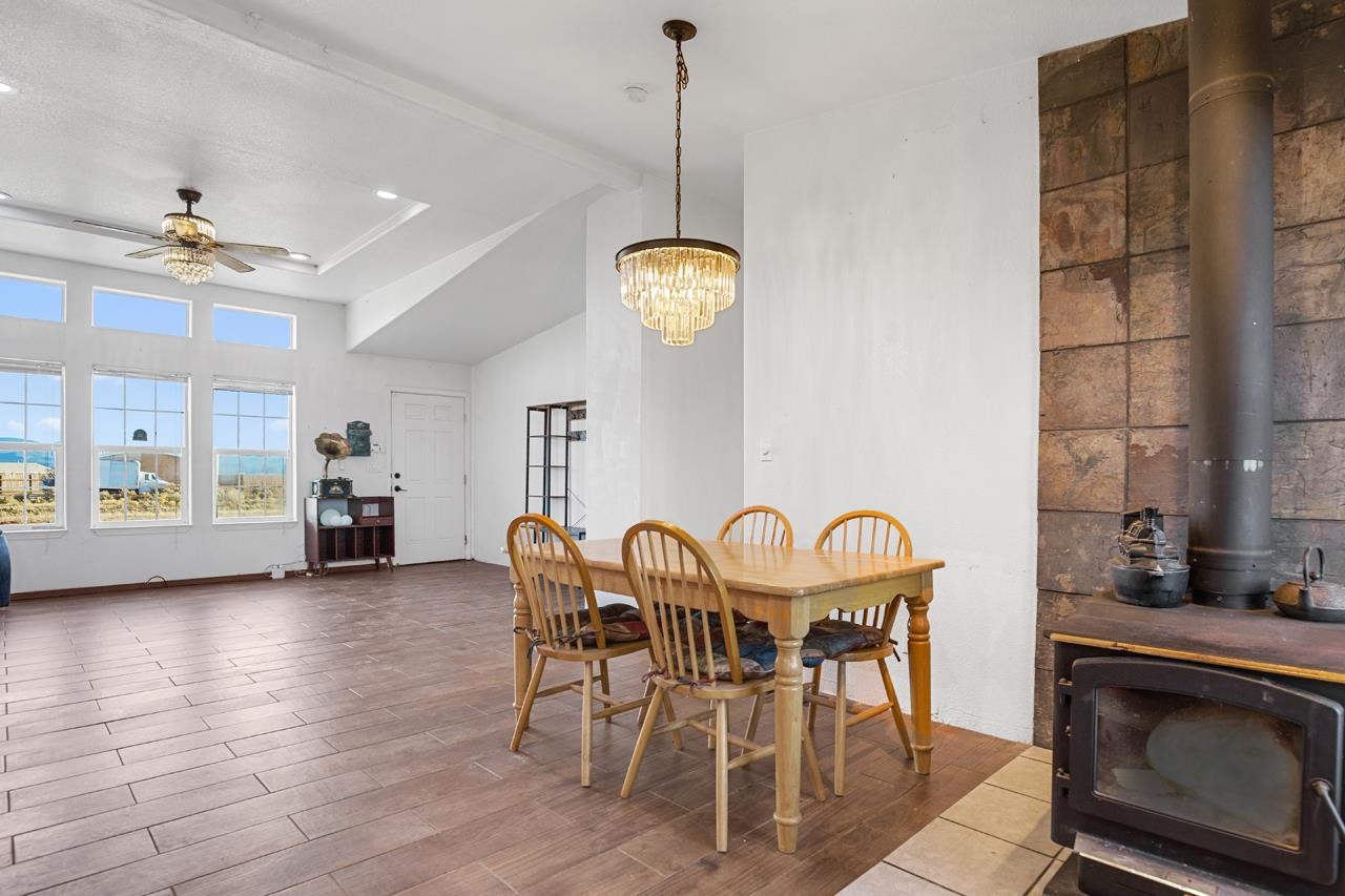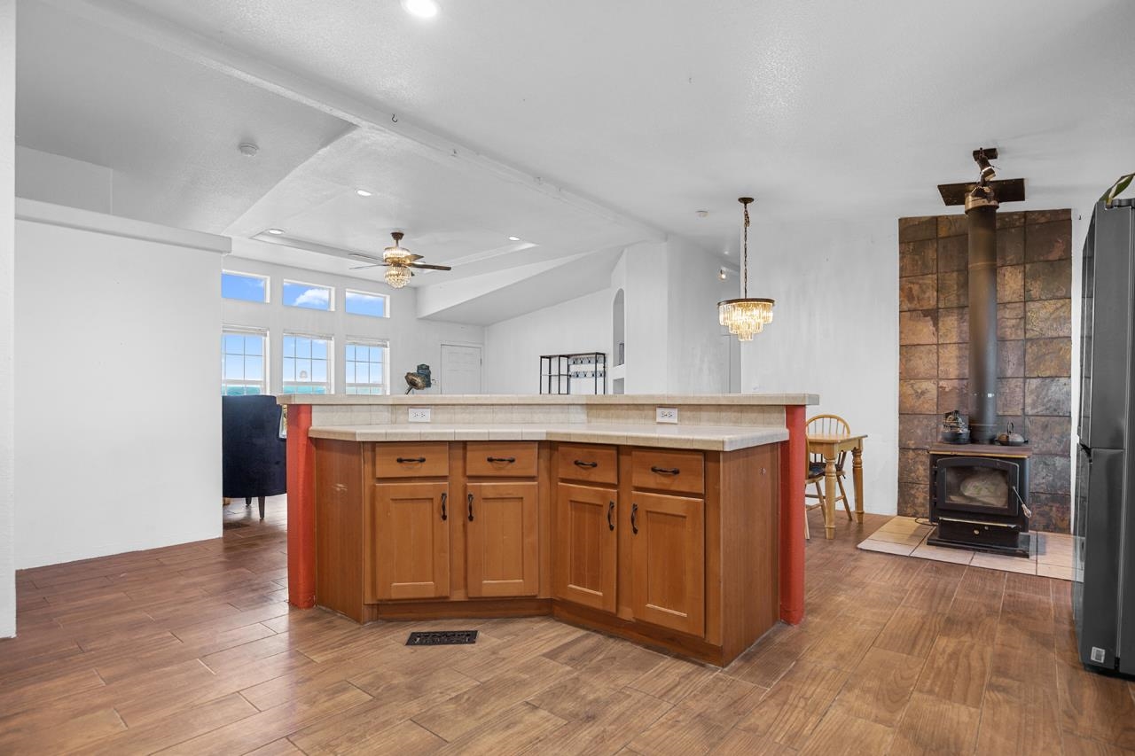 Welcome to this well-maintained 3-bedroom, 2-bath modular home with beautiful mountain and sunset views. The property is fully fenced and includes a large American Steel metal garage with space for up to four vehicles, making it ideal for storage, hobbies, or work needs. Inside, the home offers practical updates over the years, including newer lighting fixtures, tile flooring, air conditioning, and a comfortable bathroom setup with a jetted tub and walk-in shower. The kitchen features upgraded smart appliances, allowing easy control from your phone, supported by fiber-optic internet availability. An EV hook-up is also in place for added convenience. Outside, enjoy a covered gazebo for relaxing or entertaining, along with a fenced yard and planting beds ready for gardening. With easy move-in condition and scenic views, this home offers a comfortable and functional place to settle in and make your own.