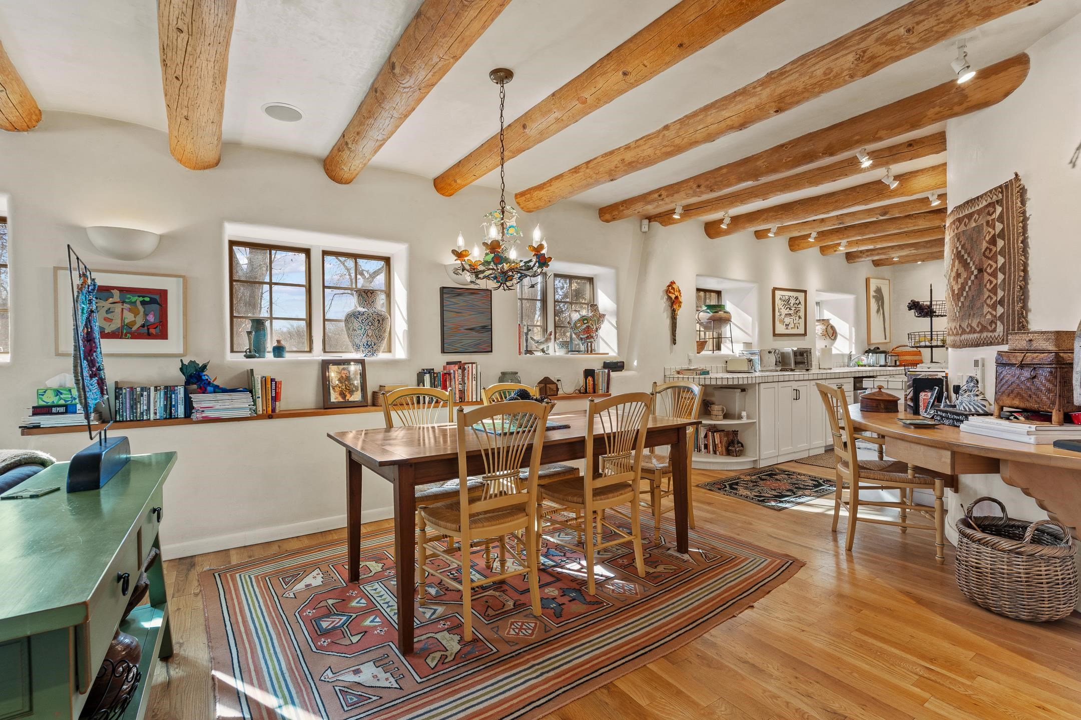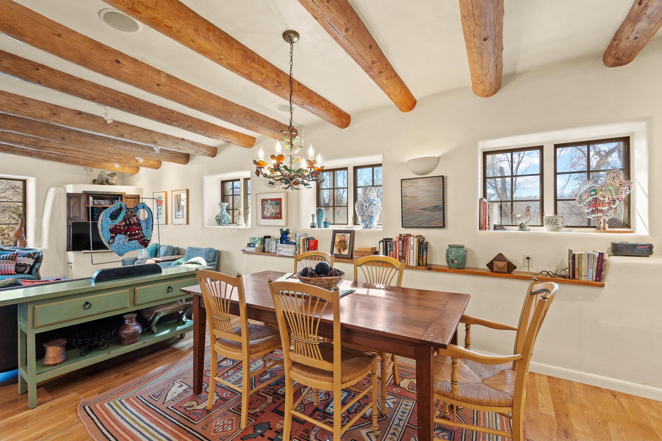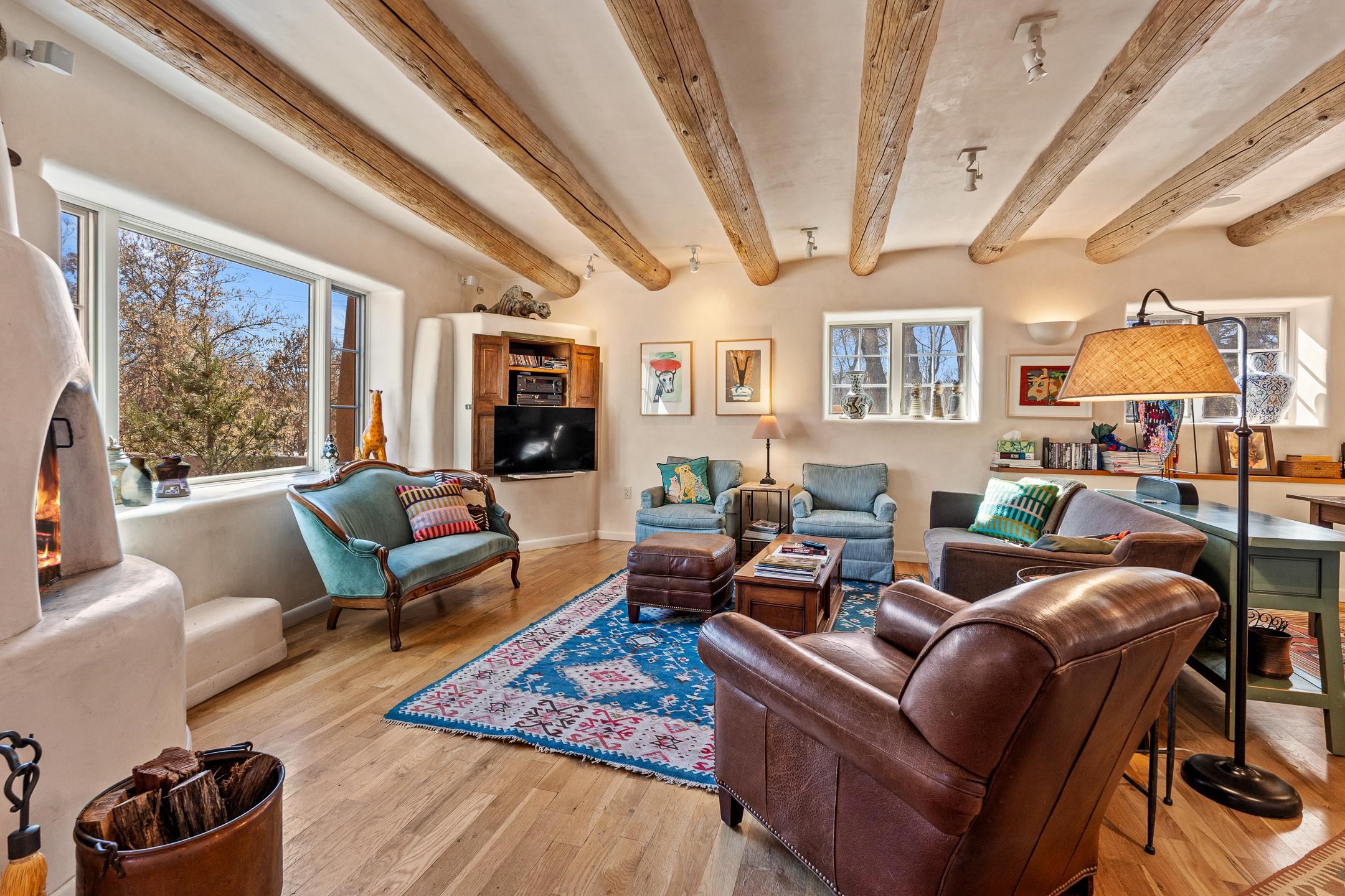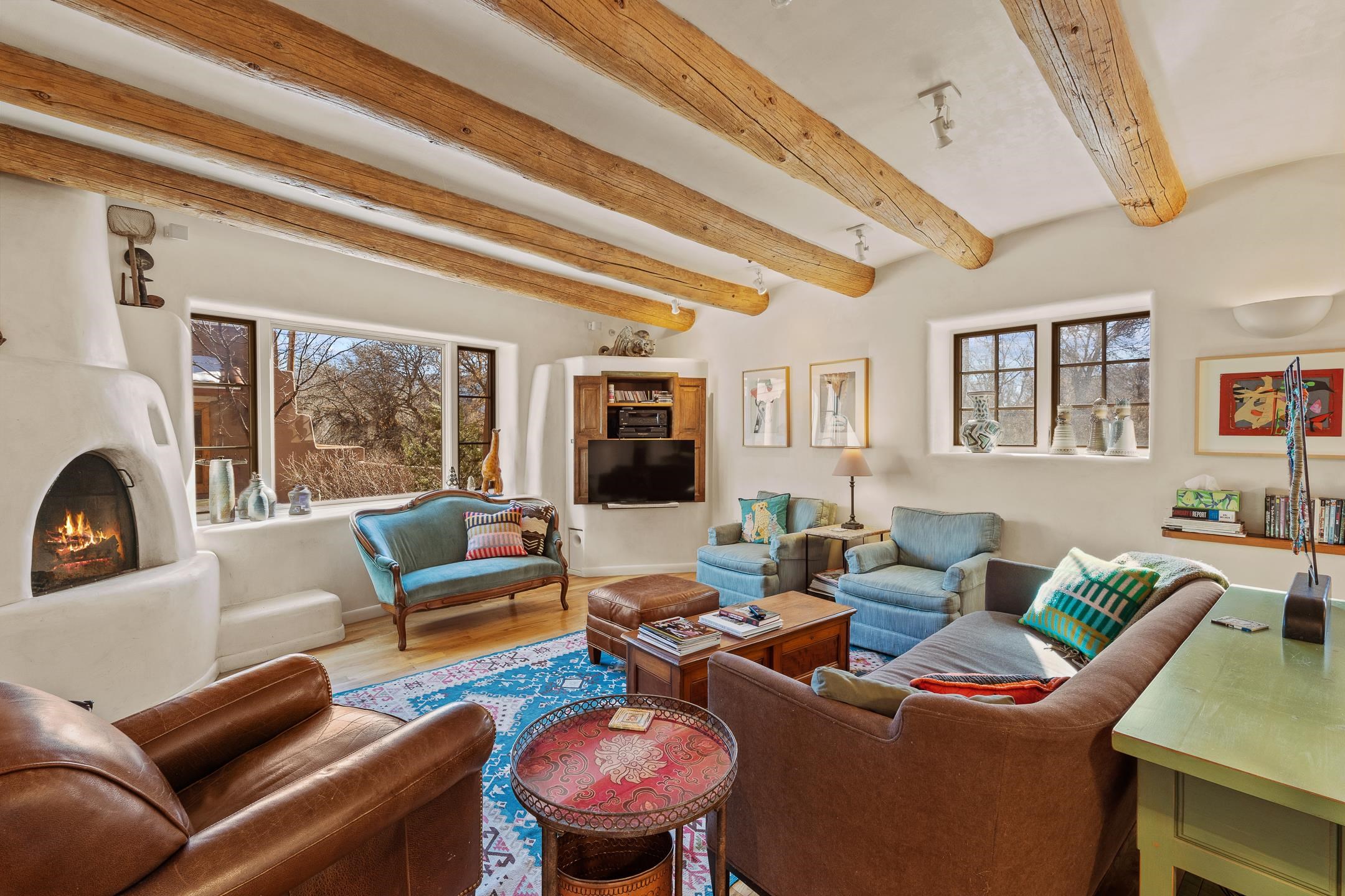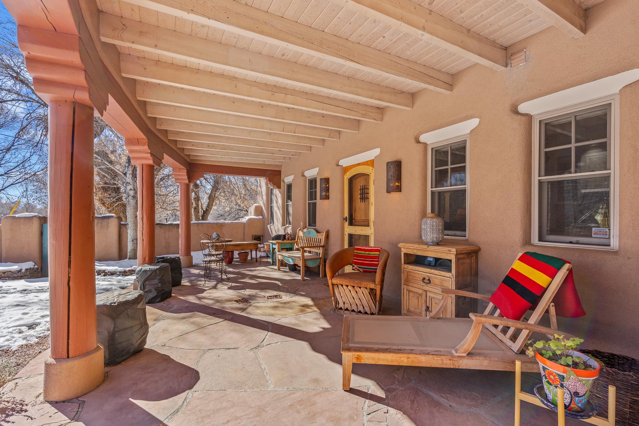 Situated within Taos’ highly sought-after Historic District, this exceptional multi-level adobe property honors the area’s rich cultural heritage while offering refined modern livability. The Upper House was formerly the cantina for La Loma Plaza and is ideally located within walking distance to the Historic Taos Plaza, shopping, and dining. The property presents a rare opportunity to own a piece of Taos history, thoughtfully adapted for contemporary living. The Upper House, originally built in the late 1800s to early 1900s just outside the original Taos Plaza walls, was carefully and completely remodeled in 2001 with deep respect for its historic character, scale, and setting. Rich architectural details include original vigas, coved ceilings, and authentic adobe brick construction on three sides. Interior finishes reflect timeless Southwestern elegance with diamond-finished plaster walls, wood floors, Saltillo tile baths, and a kiva fireplace faithfully replicated from the original design. The primary suite features a walk-in closet and a four-piece bath, complemented by a powder room and in-unit washer and dryer. The Lower Home, constructed in 2006, was intentionally designed to complement the Historic District with appropriate massing, materials, and architectural continuity. Offering exceptional versatility, the first level includes a guest suite or bonus living area with a bedroom, two large closets, a three-piece bath with a stackable washer/dryer, a kitchen and dining area, and a spacious storage room, all accented by Saltillo tile floors. The second level features a generous primary suite, a flexible living space upon entry, such as a study with a closet or a potential additional bedroom, a large bedroom with a four-piece en-suite bathroom, and direct patio access. Wood floors and 9–10-foot wood beam ceilings throughout add warmth, volume, and character. Outdoor living is a defining feature of the property. Flagstone portals and stairways with embedded fossils, brick-paved patios, viga and latilla ceilings, and a kiva fireplace on the upper portal create inviting spaces for year-round enjoyment. A second-floor deck captures mountain views, while the upper portal and patio offer sweeping sunset vistas and a unique, elevated, treehouse-like ambiance. The fully fenced property includes a remote-controlled driveway gate, parking for four or more vehicles, and mature landscaping both outside and within the pedestrian gate. Both homes were built by respected local builder Jim Pollard and designed by architect Sharon Porter, reflecting a cohesive vision aligned with Historic District standards and the timeless architectural traditions of Taos. Beyond the property, enjoy easy access to renowned cultural and recreational destinations, including walking distance to historic Taos Plaza and nearby activities such as Taos Pueblo, Taos Ski Valley, hiking, rafting, biking, and golf. Taos Regional Airport offers direct flights from several U.S. cities, enhancing both accessibility and lifestyle appeal. NOTE: The fire in the fireplaces is virtually staged. Seller currently occupies the property full-time and requests an extended closing, anticipated for late summer. Matterport Tours: Main House: https://my.matterport.com/show/?m=YHNou8Rq4ph Upstairs Casita: https://my.matterport.com/show/?m=kwQXeKkwhaw Downstairs Guest House: https://my.matterport.com/show/?m=xjmswRdqfXM