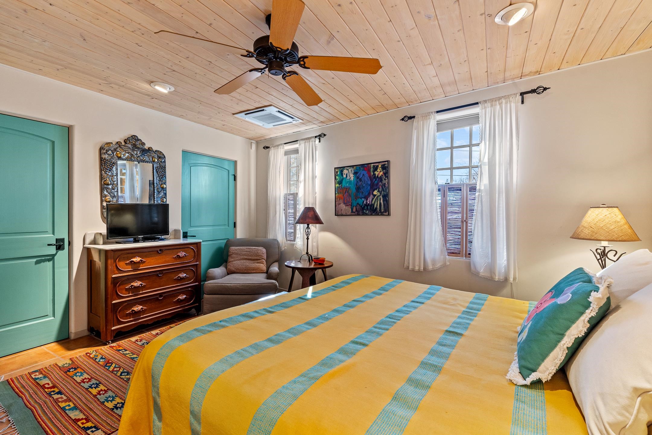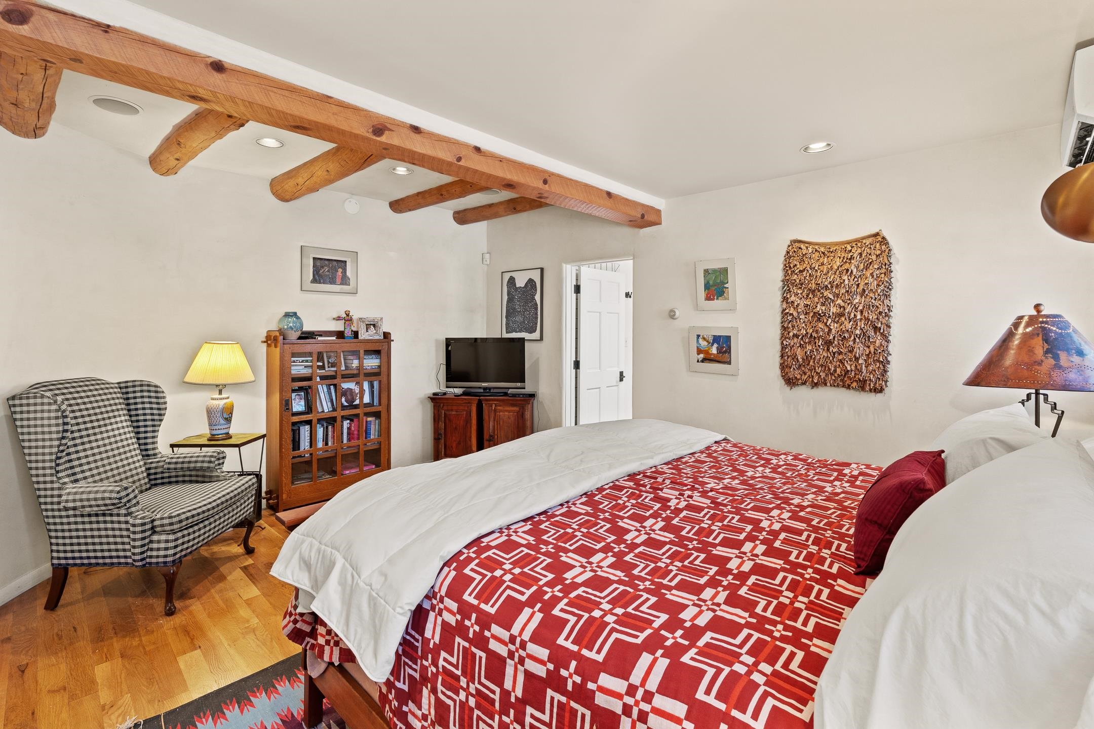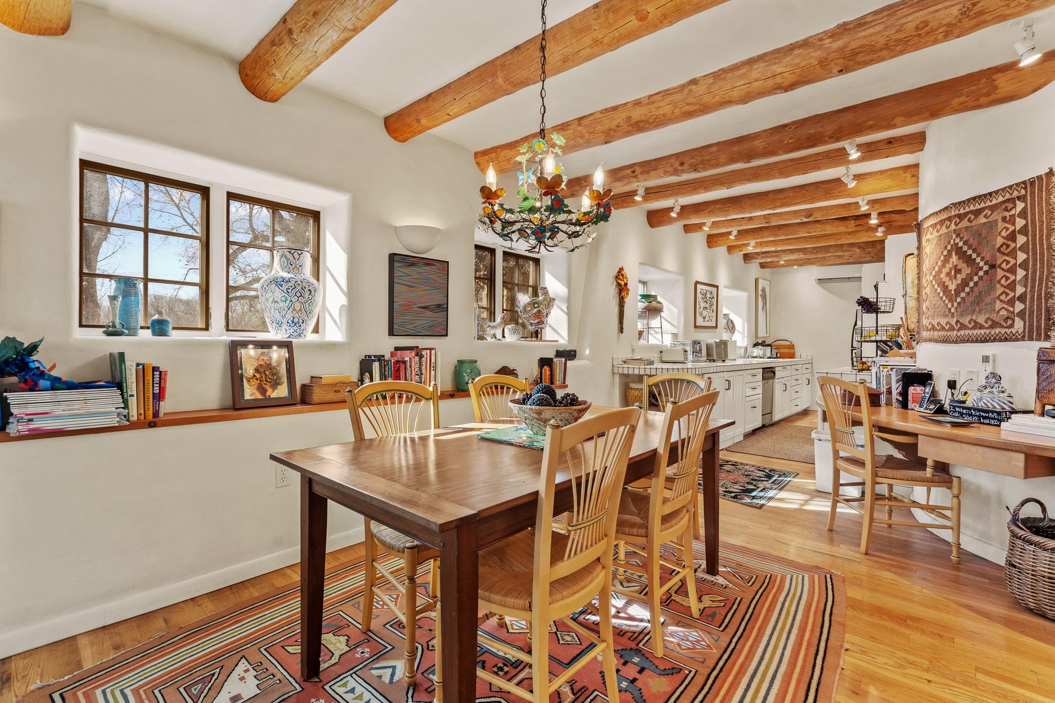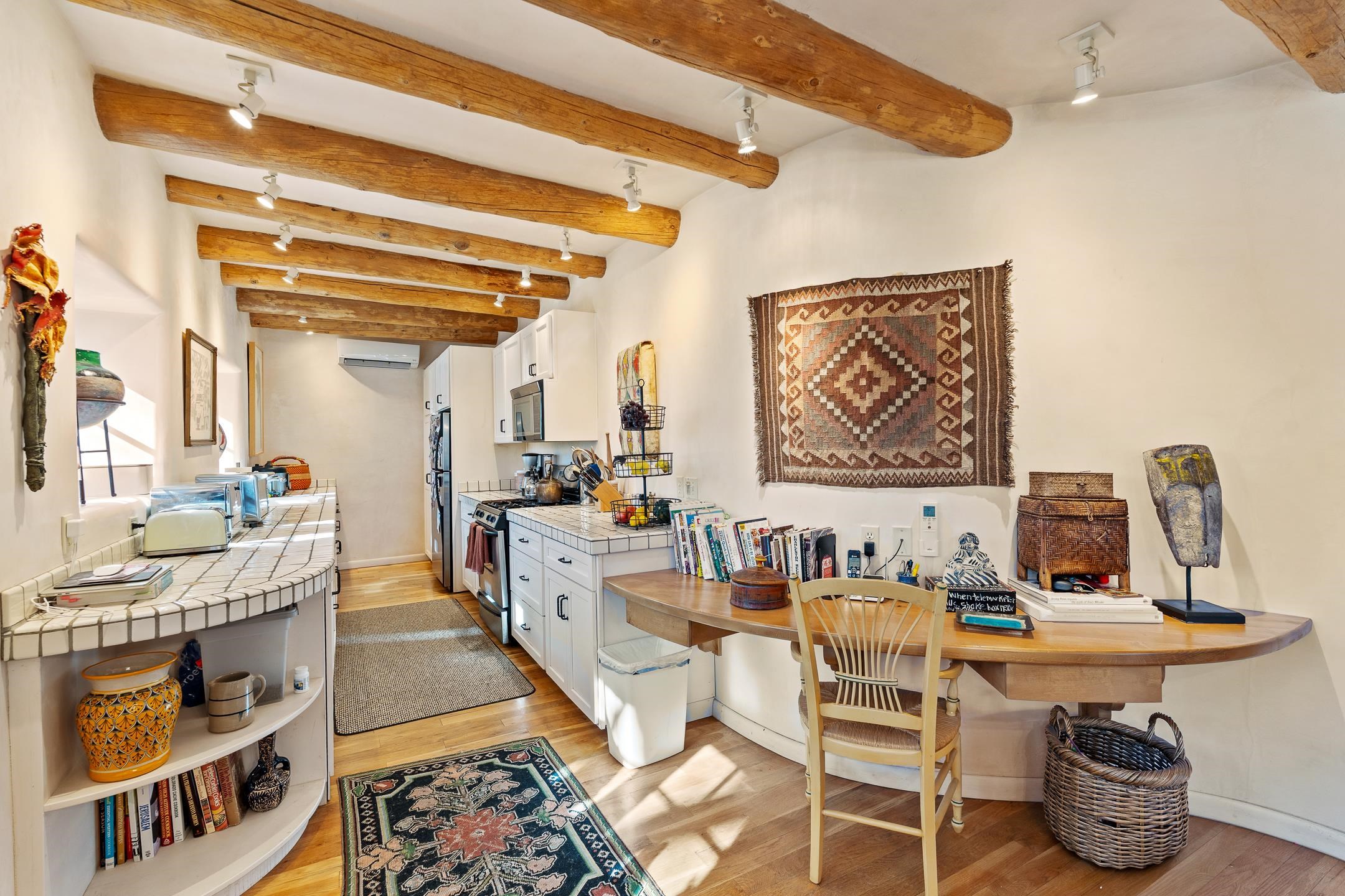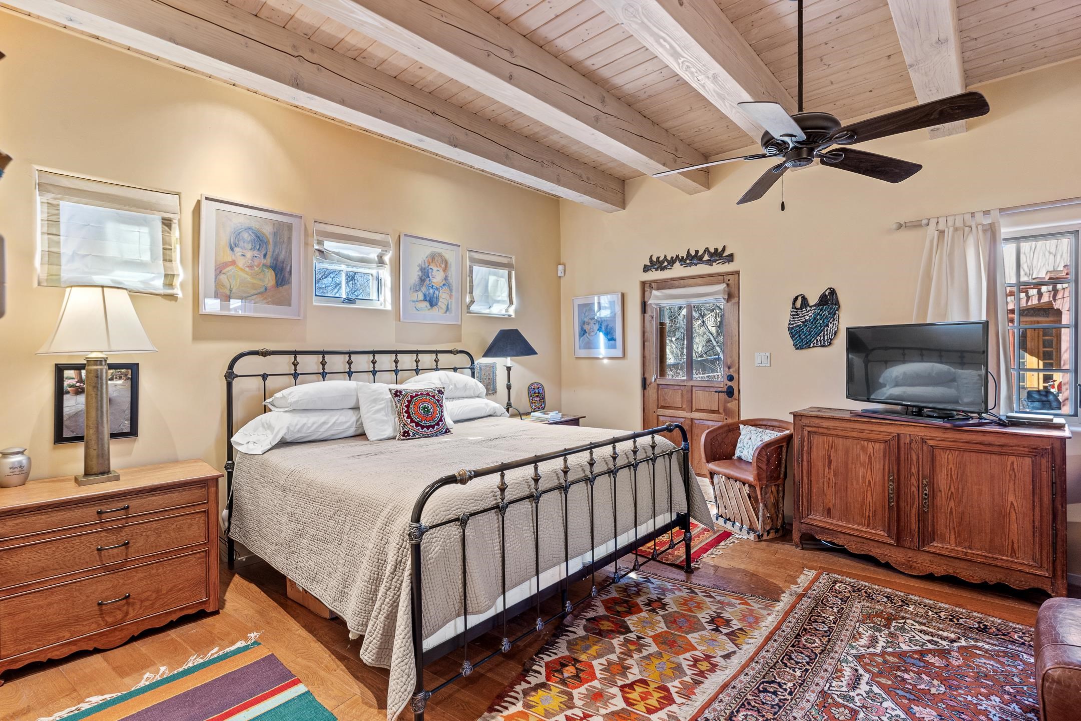 Situated within Taos’ highly sought-after Historic District, this exceptional multi-level adobe property honors the area’s rich cultural heritage while offering refined modern livability. The Upper House was formerly the cantina for La Loma Plaza and is ideally located within walking distance to the Historic Taos Plaza, shopping, and dining. The property presents a rare opportunity to own a piece of Taos history, thoughtfully adapted for contemporary living. The Upper House, originally built in the late 1800s to early 1900s just outside the original Taos Plaza walls, was carefully and completely remodeled in 2001 with deep respect for its historic character, scale, and setting. Rich architectural details include original vigas, coved ceilings, and authentic adobe brick construction on three sides. Interior finishes reflect timeless Southwestern elegance with diamond-finished plaster walls, wood floors, Saltillo tile baths, and a kiva fireplace faithfully replicated from the original design. The primary suite features a walk-in closet and a four-piece bath, complemented by a powder room and in-unit washer and dryer. The Lower Home, constructed in 2006, was intentionally designed to complement the Historic District with appropriate massing, materials, and architectural continuity. Offering exceptional versatility, the first level includes a guest suite or bonus living area with a bedroom, two large closets, a three-piece bath with a stackable washer/dryer, a kitchen and dining area, and a spacious storage room, all accented by Saltillo tile floors. The second level features a generous primary suite, a flexible living space upon entry, such as a study with a closet or a potential additional bedroom, a large bedroom with a four-piece en-suite bathroom, and direct patio access. Wood floors and 9–10-foot wood beam ceilings throughout add warmth, volume, and character. Outdoor living is a defining feature of the property. Flagstone portals and stairways with embedded fossils, brick-paved patios, viga and latilla ceilings, and a kiva fireplace on the upper portal create inviting spaces for year-round enjoyment. A second-floor deck captures mountain views, while the upper portal and patio offer sweeping sunset vistas and a unique, elevated, treehouse-like ambiance. The fully fenced property includes a remote-controlled driveway gate, parking for four or more vehicles, and mature landscaping both outside and within the pedestrian gate. Both homes were built by respected local builder Jim Pollard and designed by architect Sharon Porter, reflecting a cohesive vision aligned with Historic District standards and the timeless architectural traditions of Taos. Beyond the property, enjoy easy access to renowned cultural and recreational destinations, including walking distance to historic Taos Plaza and nearby activities such as Taos Pueblo, Taos Ski Valley, hiking, rafting, biking, and golf. Taos Regional Airport offers direct flights from several U.S. cities, enhancing both accessibility and lifestyle appeal. NOTE: The fire in the fireplaces is virtually staged. Seller currently occupies the property full-time and requests an extended closing, anticipated for late summer. Matterport Tours: Main House: https://my.matterport.com/show/?m=YHNou8Rq4ph Upstairs Casita: https://my.matterport.com/show/?m=kwQXeKkwhaw Downstairs Guest House: https://my.matterport.com/show/?m=xjmswRdqfXM