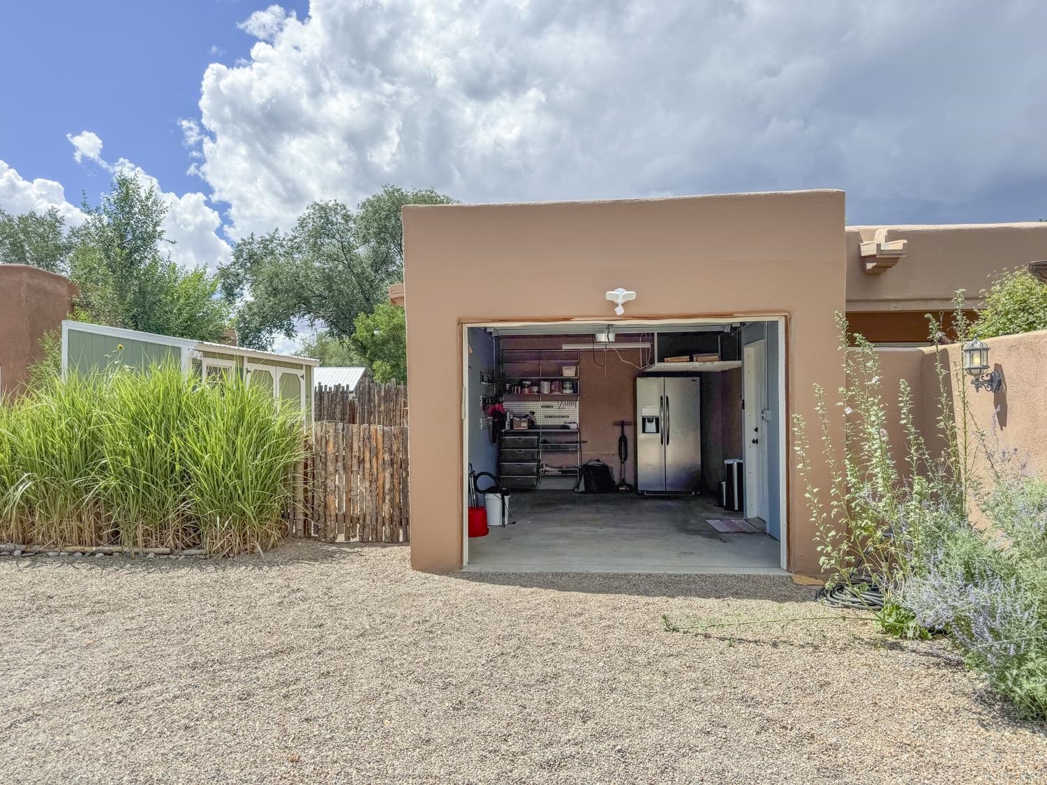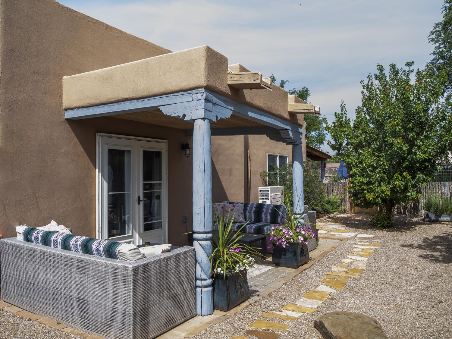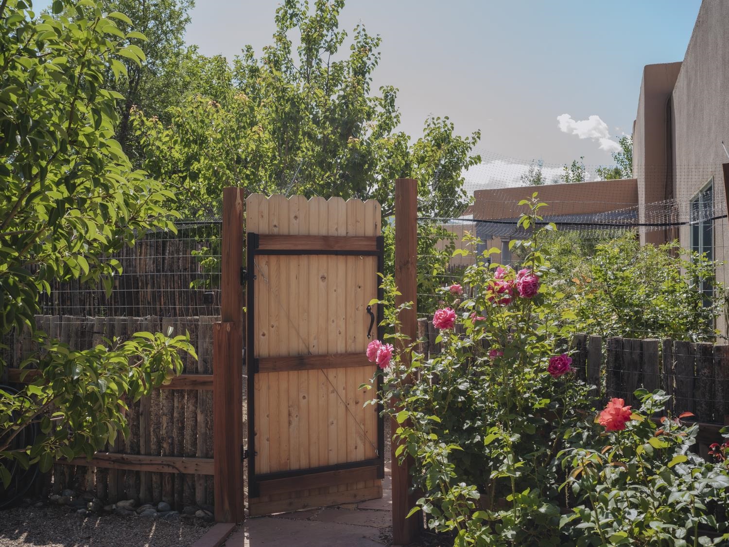 YOUR PICTURE-PERFECT TAOS DREAM HOME delivers the ultimate combination of village walkability and private sanctuary living. Perfectly positioned just steps from the historic Taos Plaza, galleries, vibrant restaurants, and the beautifully renovated Fred Baca Park this move-in-ready 3-bedroom, 2-bathroom Pueblo-style residence offers an unbeatable location without sacrificing serenity. The experience begins at the front gate, where a fully fenced perimeter leads to a beautifully manicured entry courtyard. The gentle sound of a trickling fountain sets a tranquil tone before you even step through the front door. Inside, the 1,462-square-foot open floor plan is a masterclass in Southwestern craftsmanship, featuring authentic viga and tongue-and-groove ceilings, tiled floors throughout, and a charming traditional fireplace that serves as the heart of the living space. The chef’s kitchen has been thoughtfully reimagined with new upscale appliances, ample counter space for preparation, a casual dining breakfast bar, and plentiful storage. Designed for effortless year-round comfort, the residence features the constant warmth of radiant floor heat and the modern efficiency of mini-split air conditioning—a rare luxury for in-town living. The expansive primary suite serves as a true retreat, offering an attached bath and direct access to a stunning landscaped patio where a secluded hot tub awaits under the stars. Two additional bedrooms provide versatile space for a creative studio, home office, or guest quarters. The outdoor living spaces are a hidden oasis of sustainability and peace. Beyond the flagstone patio, the meticulously landscaped backyard reveals a lush environment with prolific pear trees, a "magical" quartz fountain, and numerous vignettes designed for lounging, dining, or meditation. Additional features include an attached one-car garage with custom shelving and an "adorable green shed" for extra storage. Connected to town water, sewer, and natural gas, this home provides the ultimate in convenience. Live in a community where local treasures are at your doorstep, all while enjoying the quiet, turn-key seclusion of this meticulously maintained Taos jewel.