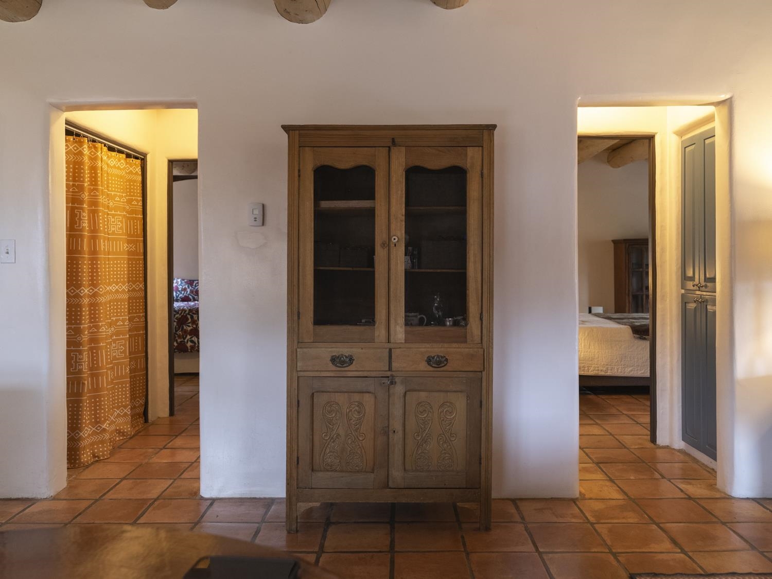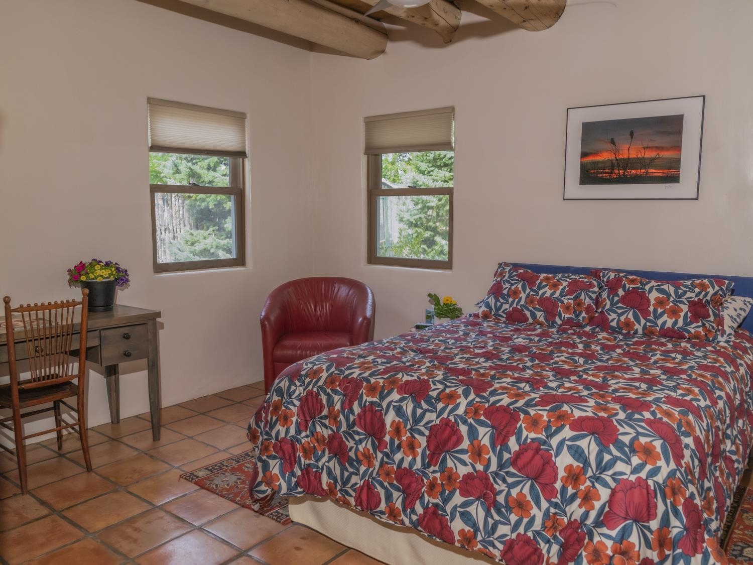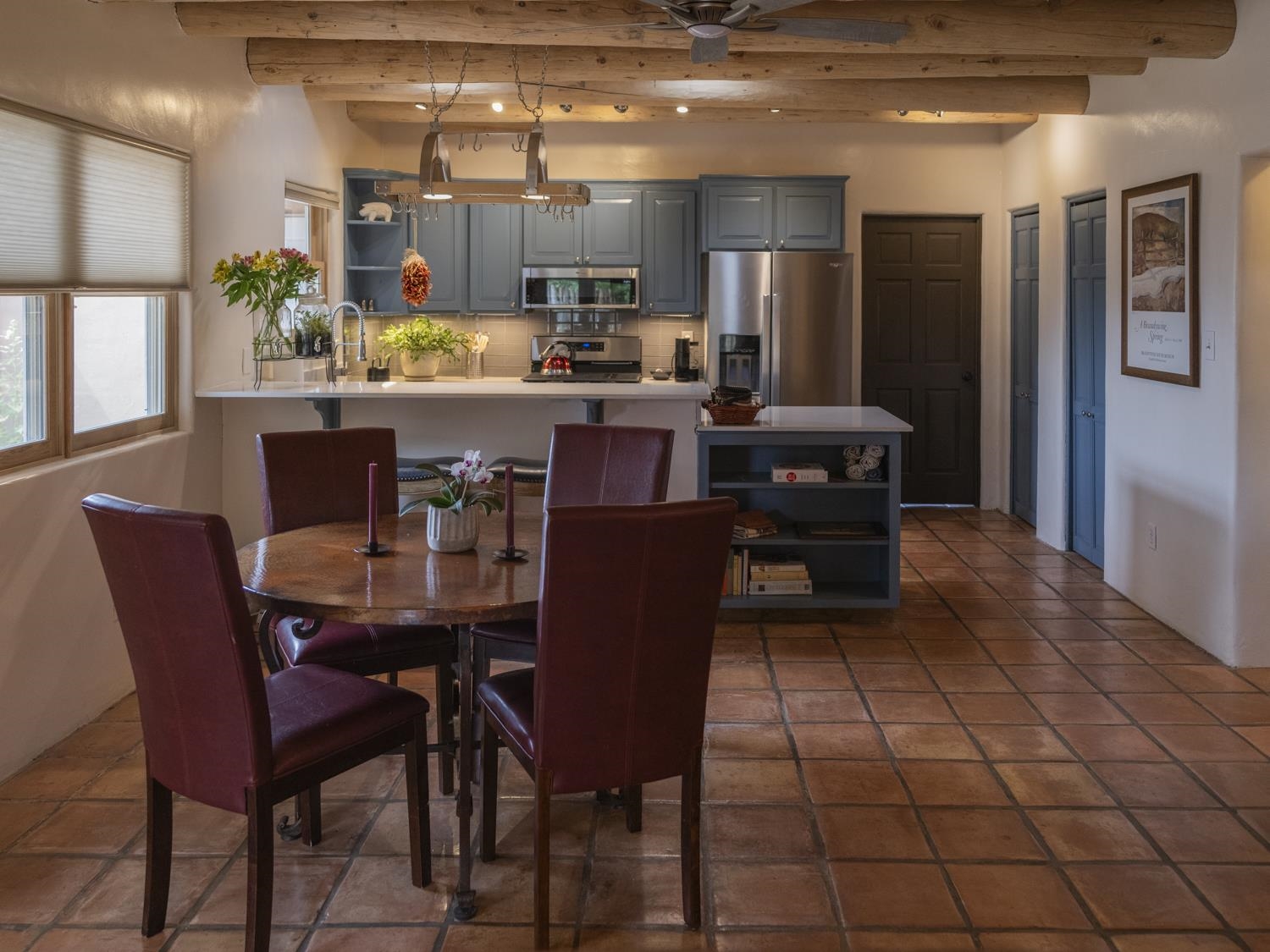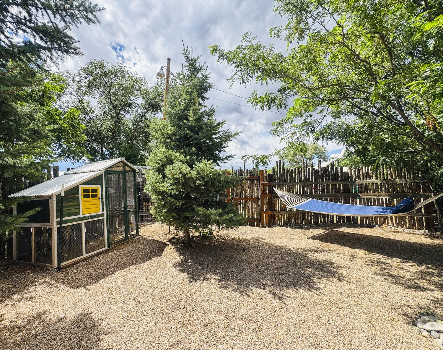 YOUR PICTURE-PERFECT TAOS DREAM HOME delivers the ultimate combination of village walkability and private sanctuary living. Perfectly positioned just steps from the historic Taos Plaza, galleries, vibrant restaurants, and the beautifully renovated Fred Baca Park this move-in-ready 3-bedroom, 2-bathroom Pueblo-style residence offers an unbeatable location without sacrificing serenity. The experience begins at the front gate, where a fully fenced perimeter leads to a beautifully manicured entry courtyard. The gentle sound of a trickling fountain sets a tranquil tone before you even step through the front door. Inside, the 1,462-square-foot open floor plan is a masterclass in Southwestern craftsmanship, featuring authentic viga and tongue-and-groove ceilings, tiled floors throughout, and a charming traditional fireplace that serves as the heart of the living space. The chef’s kitchen has been thoughtfully reimagined with new upscale appliances, ample counter space for preparation, a casual dining breakfast bar, and plentiful storage. Designed for effortless year-round comfort, the residence features the constant warmth of radiant floor heat and the modern efficiency of mini-split air conditioning—a rare luxury for in-town living. The expansive primary suite serves as a true retreat, offering an attached bath and direct access to a stunning landscaped patio where a secluded hot tub awaits under the stars. Two additional bedrooms provide versatile space for a creative studio, home office, or guest quarters. The outdoor living spaces are a hidden oasis of sustainability and peace. Beyond the flagstone patio, the meticulously landscaped backyard reveals a lush environment with prolific pear trees, a "magical" quartz fountain, and numerous vignettes designed for lounging, dining, or meditation. Additional features include an attached one-car garage with custom shelving and an "adorable green shed" for extra storage. Connected to town water, sewer, and natural gas, this home provides the ultimate in convenience. Live in a community where local treasures are at your doorstep, all while enjoying the quiet, turn-key seclusion of this meticulously maintained Taos jewel.