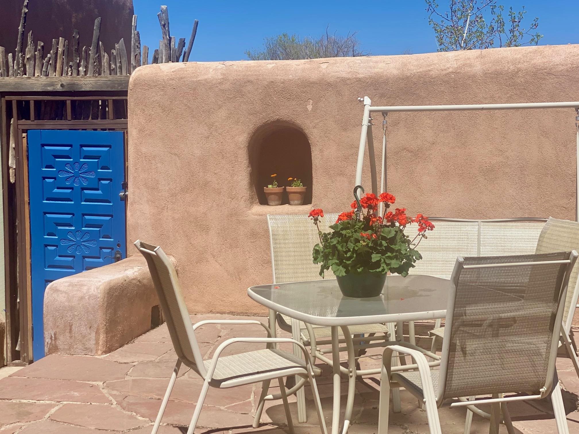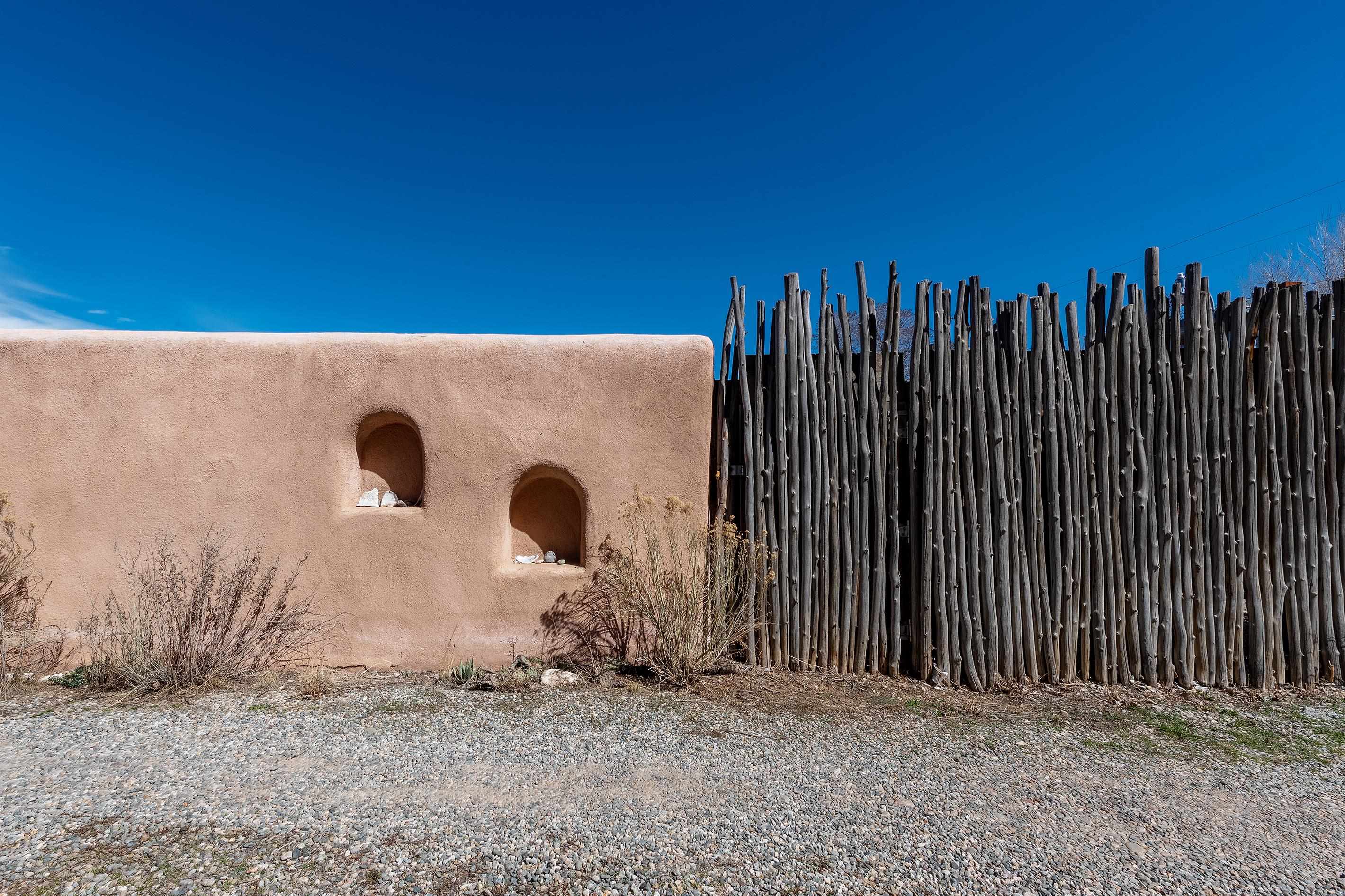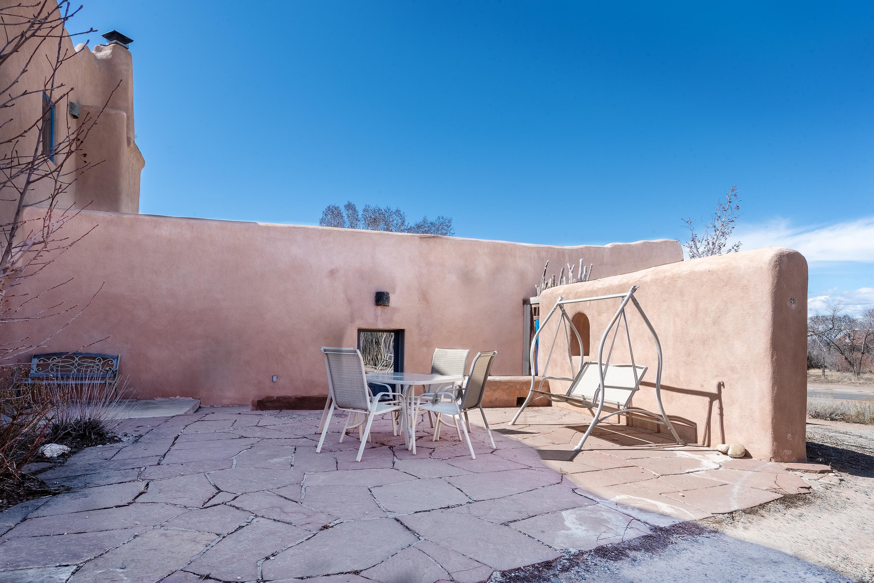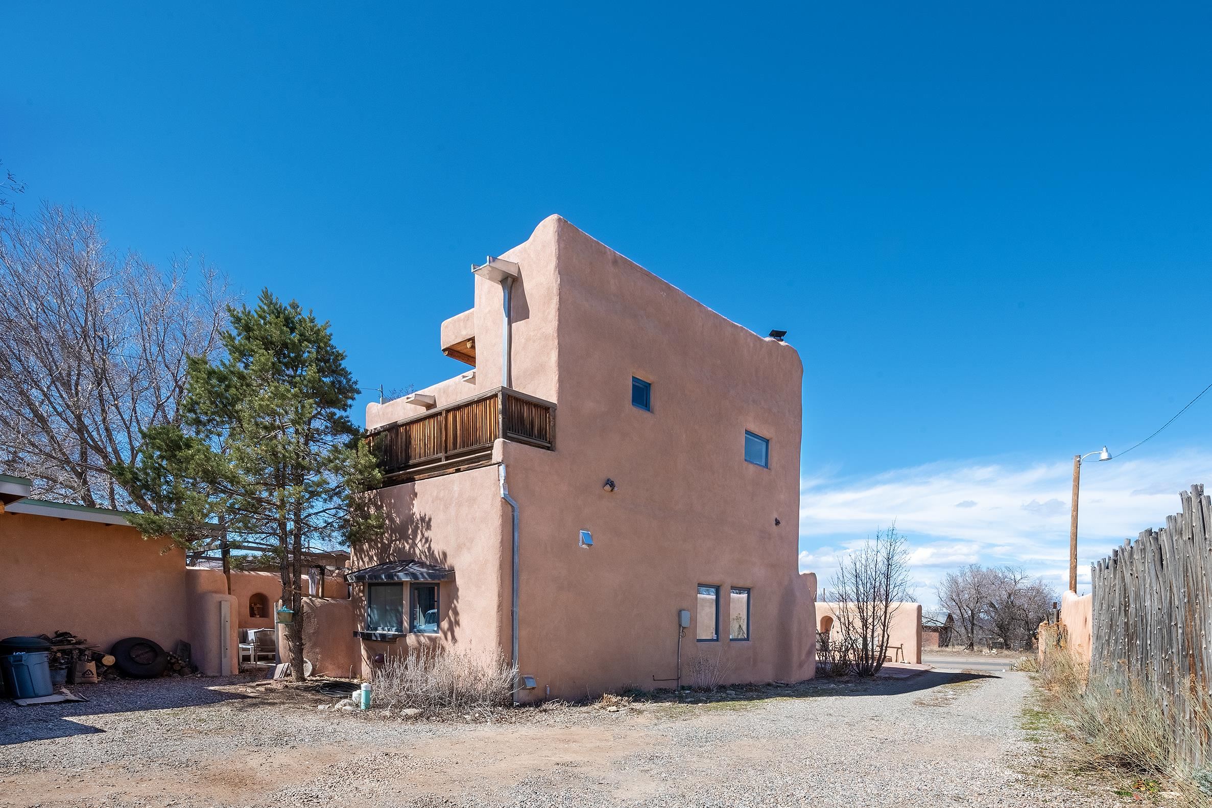 This home is a dream come true if you're looking for an iconic Ranchos adobe! Behind the Blue Door is a walled flagstone patio creating a grand entryway. This 2319 sq ft adobe home has been tastefully renovated and modernized, preserving the original 1930's feel with vigas and tongue and groove ceilings throughout. Saltillo tile floors are warmed by in-floor radiant heat. This home features two distinct living areas. The large, primary living area with wood floors southwestern style fireplace and bancos is currently used as a working artist's studio and gallery with a reception area and private entrance. The other side of the soaring foyer leads to an open living room, warmed by a second fireplace, with dining room and newly renovated kitchen beyond. Double glass doors lead to an enclosed back courtyard ideal for entertaining. The downstairs includes a full bathroom and separate laundry room. Curving wooden stairs adorned with nichos lead to the two bedrooms. The primary bedroom has an attached bathroom and a private deck. A bedroom built-in and a large closet in the hall serve for ample wardrobe space. The third southwestern style fireplace is tucked in the corner of the comfortable guest bedroom. A gated drive-way along the north side of the home takes you to a detached two-car carport and workshop ideal for a second "maker space." all on 0.184 acres