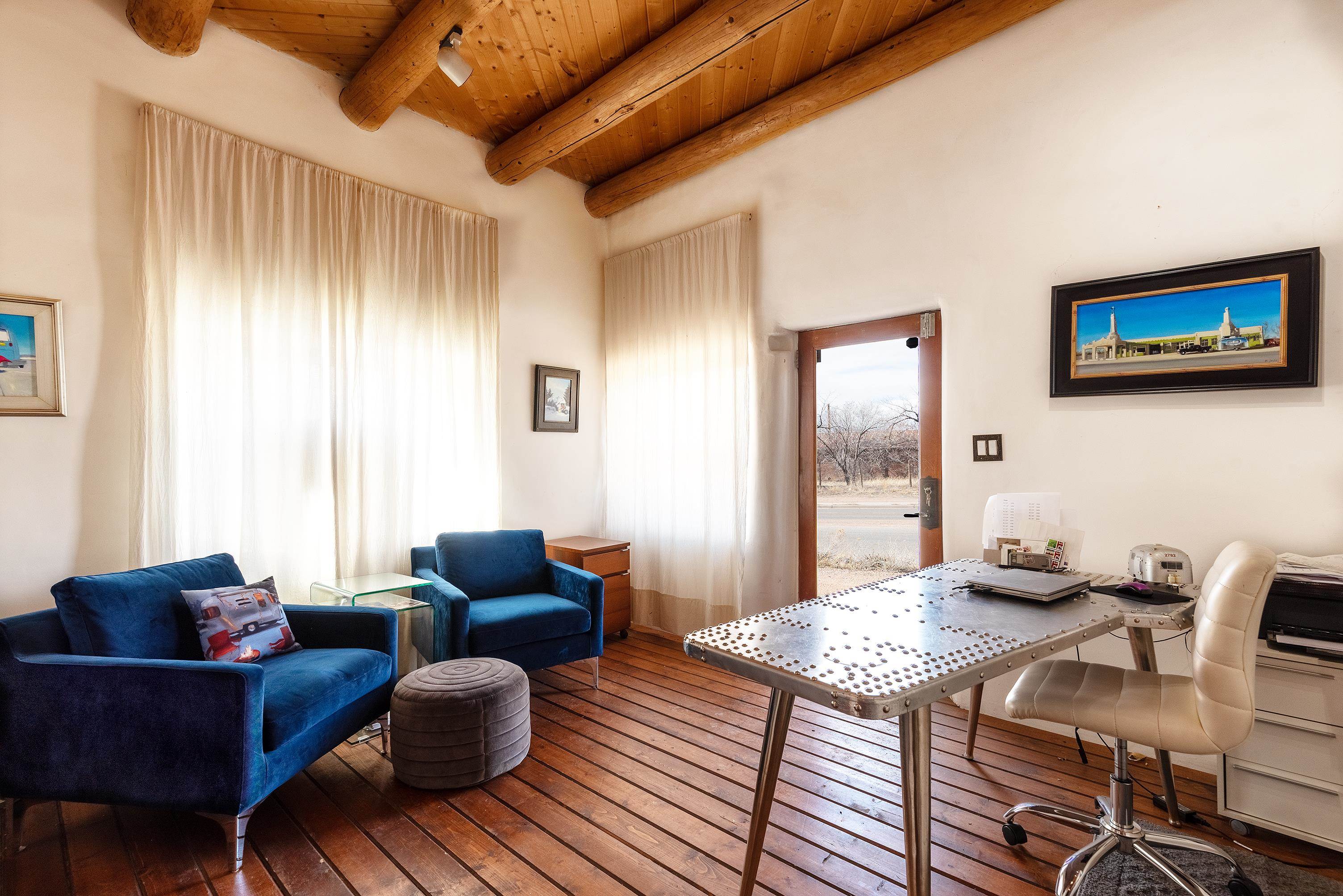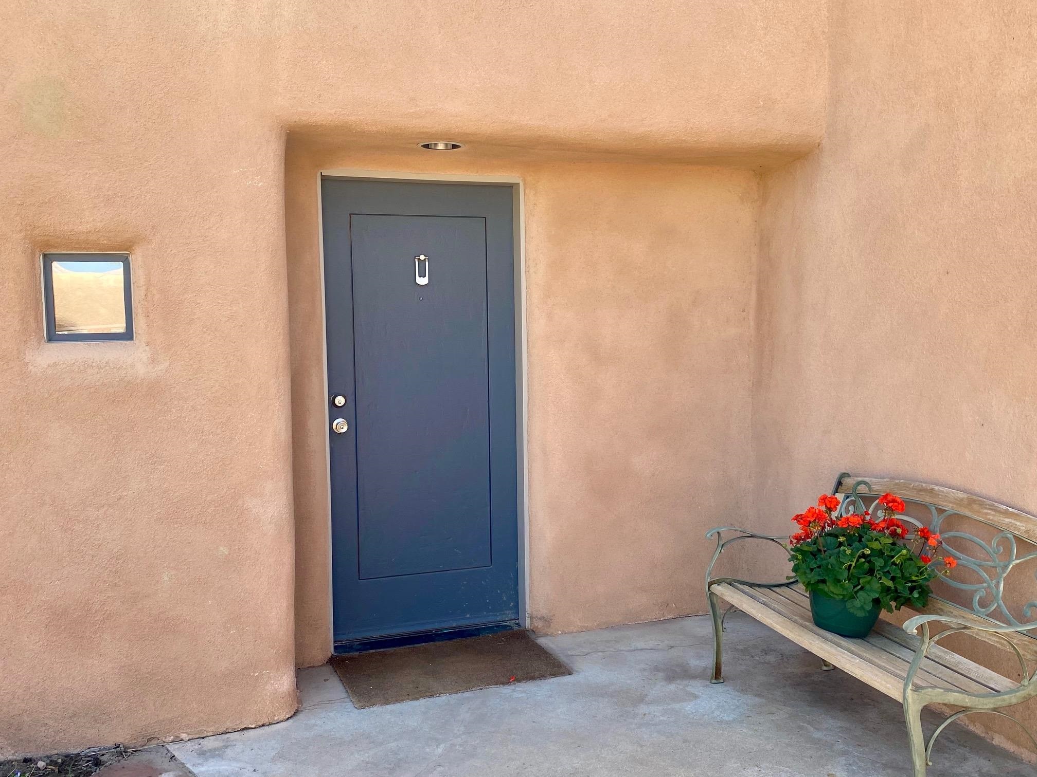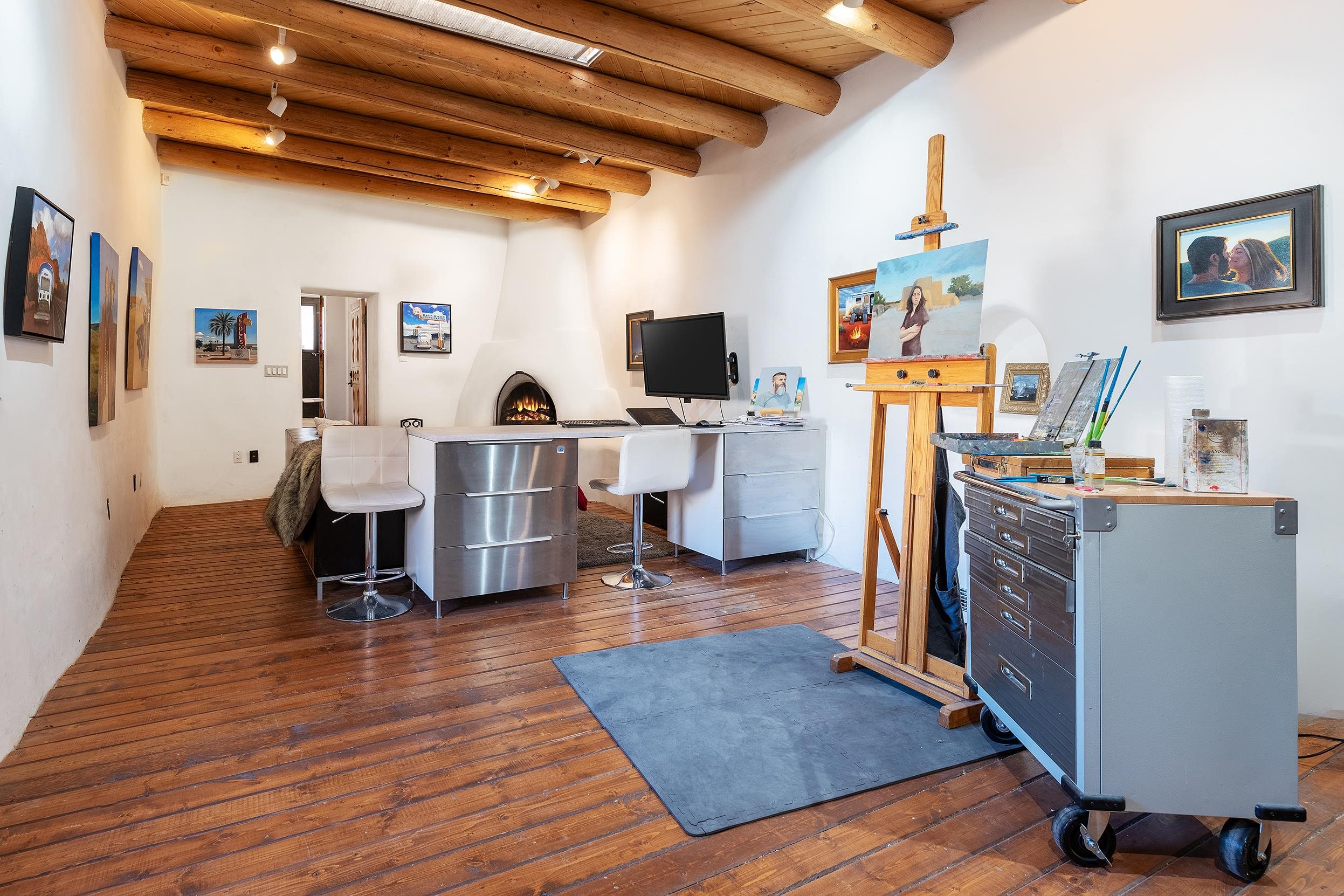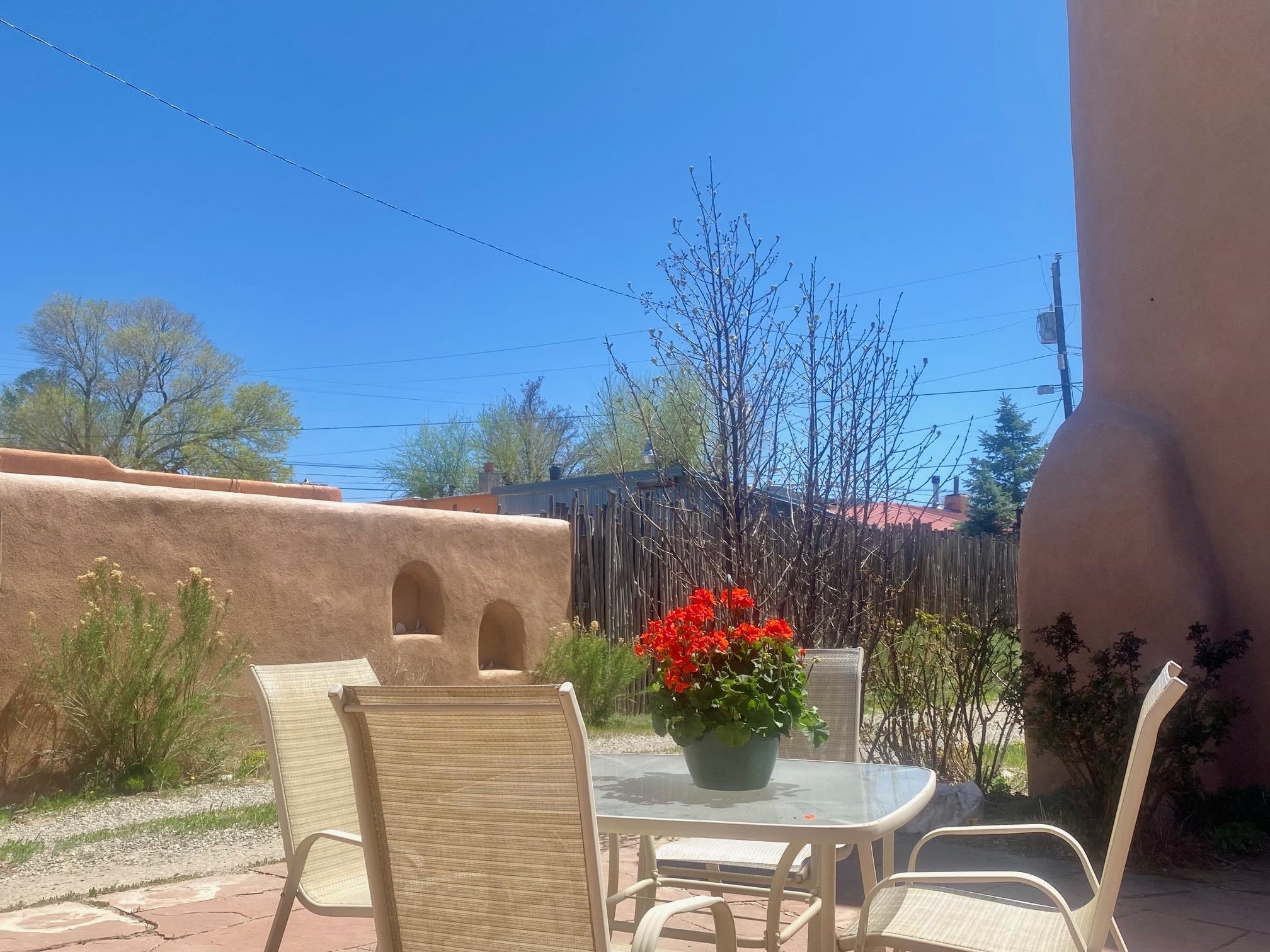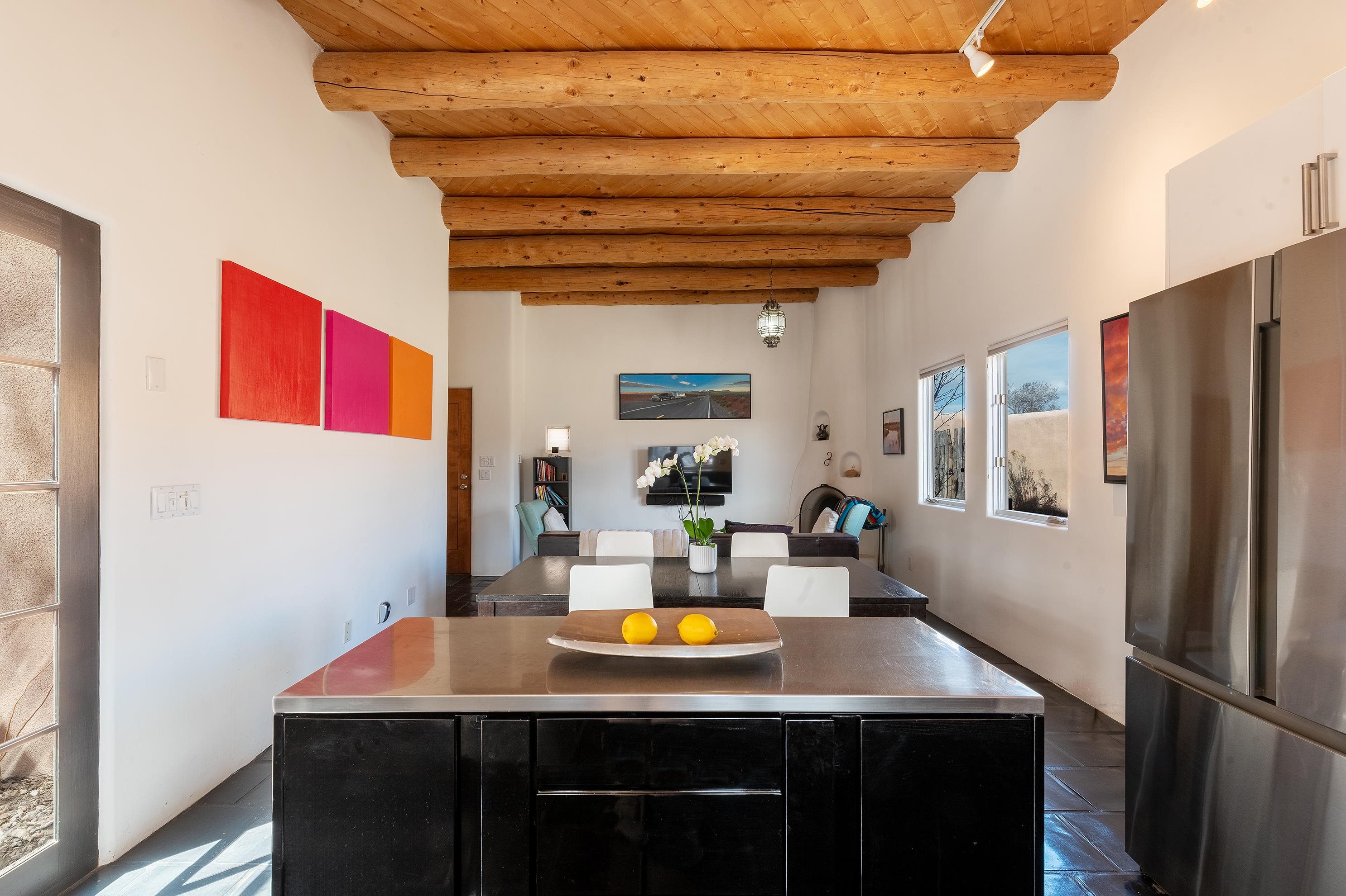 This home is a dream come true if you're looking for an iconic Ranchos adobe! Behind the Blue Door is a walled flagstone patio creating a grand entryway. This 2319 sq ft adobe home has been tastefully renovated and modernized, preserving the original 1930's feel with vigas and tongue and groove ceilings throughout. Saltillo tile floors are warmed by in-floor radiant heat. This home features two distinct living areas. The large, primary living area with wood floors southwestern style fireplace and bancos is currently used as a working artist's studio and gallery with a reception area and private entrance. The other side of the soaring foyer leads to an open living room, warmed by a second fireplace, with dining room and newly renovated kitchen beyond. Double glass doors lead to an enclosed back courtyard ideal for entertaining. The downstairs includes a full bathroom and separate laundry room. Curving wooden stairs adorned with nichos lead to the two bedrooms. The primary bedroom has an attached bathroom and a private deck. A bedroom built-in and a large closet in the hall serve for ample wardrobe space. The third southwestern style fireplace is tucked in the corner of the comfortable guest bedroom. A gated drive-way along the north side of the home takes you to a detached two-car carport and workshop ideal for a second "maker space." all on 0.184 acres