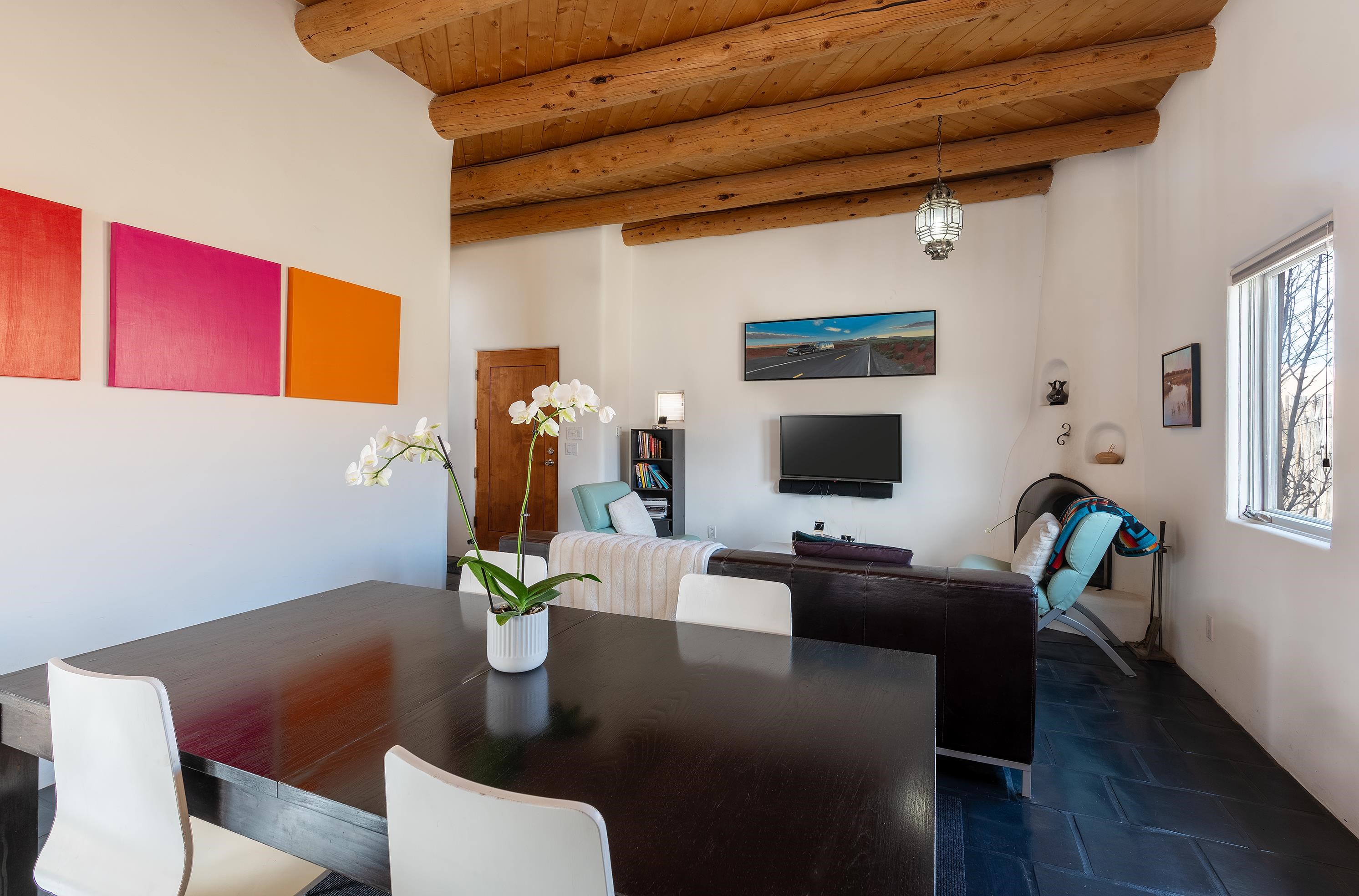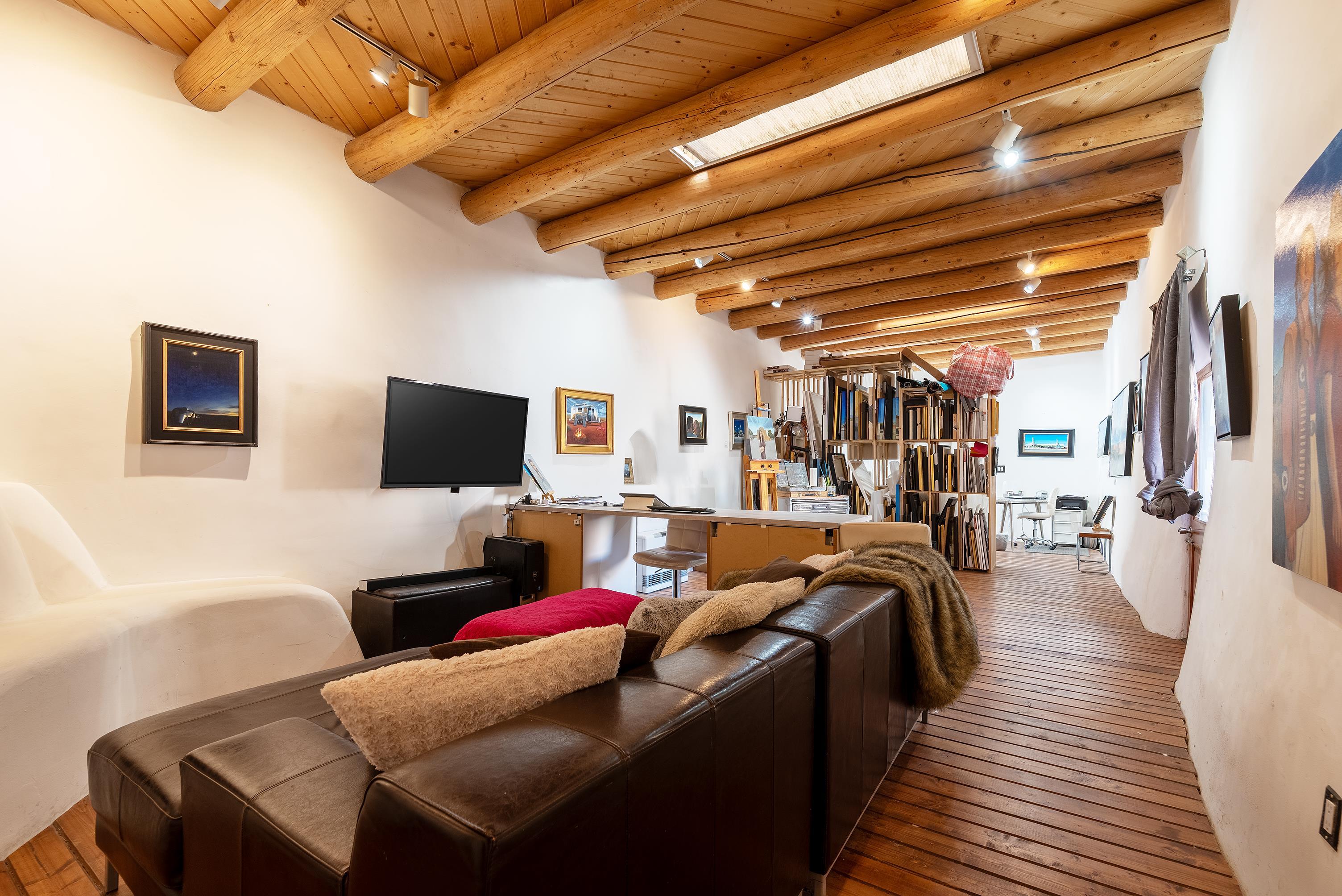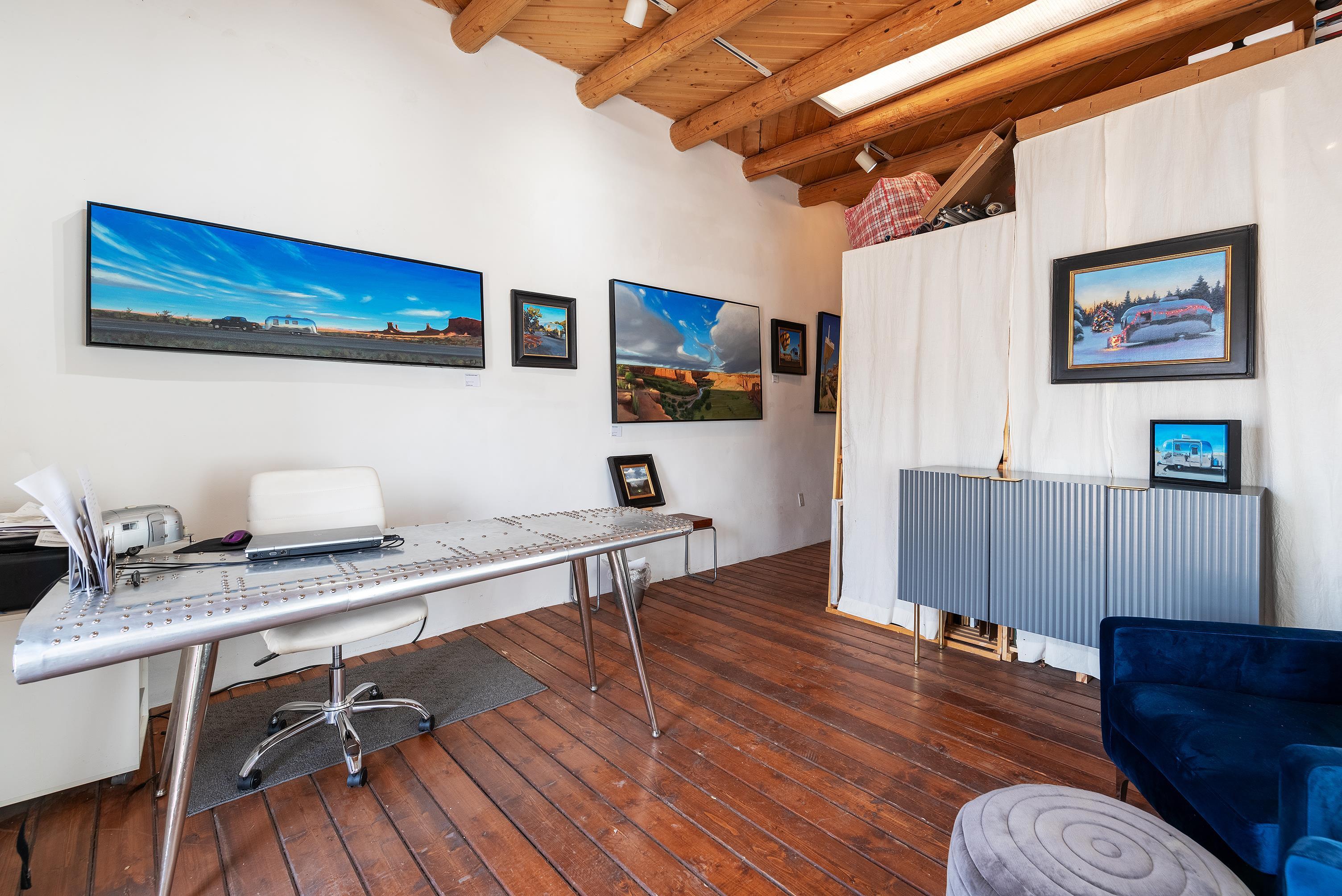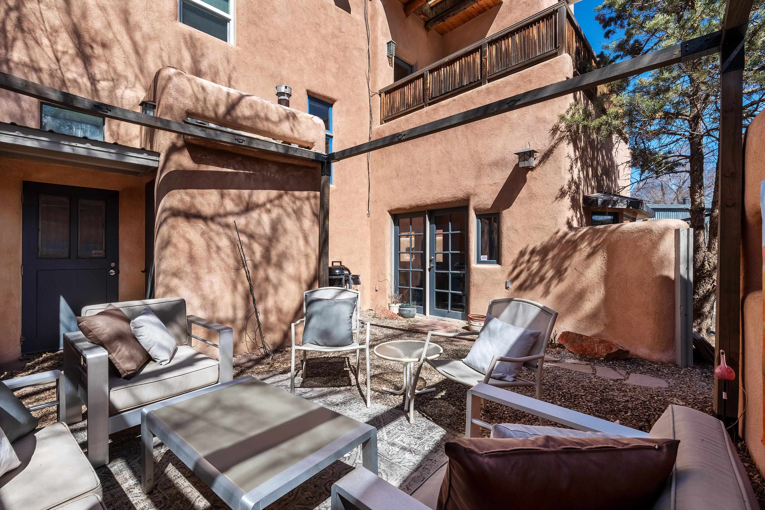 This home is a dream come true if you're looking for an iconic Ranchos adobe! Behind the Blue Door is a walled flagstone patio creating a grand entryway. This 2319 sq ft adobe home has been tastefully renovated and modernized, preserving the original 1930's feel with vigas and tongue and groove ceilings throughout. Saltillo tile floors are warmed by in-floor radiant heat. This home features two distinct living areas. The large, primary living area with wood floors southwestern style fireplace and bancos is currently used as a working artist's studio and gallery with a reception area and private entrance. The other side of the soaring foyer leads to an open living room, warmed by a second fireplace, with dining room and newly renovated kitchen beyond. Double glass doors lead to an enclosed back courtyard ideal for entertaining. The downstairs includes a full bathroom and separate laundry room. Curving wooden stairs adorned with nichos lead to the two bedrooms. The primary bedroom has an attached bathroom and a private deck. A bedroom built-in and a large closet in the hall serve for ample wardrobe space. The third southwestern style fireplace is tucked in the corner of the comfortable guest bedroom. A gated drive-way along the north side of the home takes you to a detached two-car carport and workshop ideal for a second "maker space." all on 0.184 acres