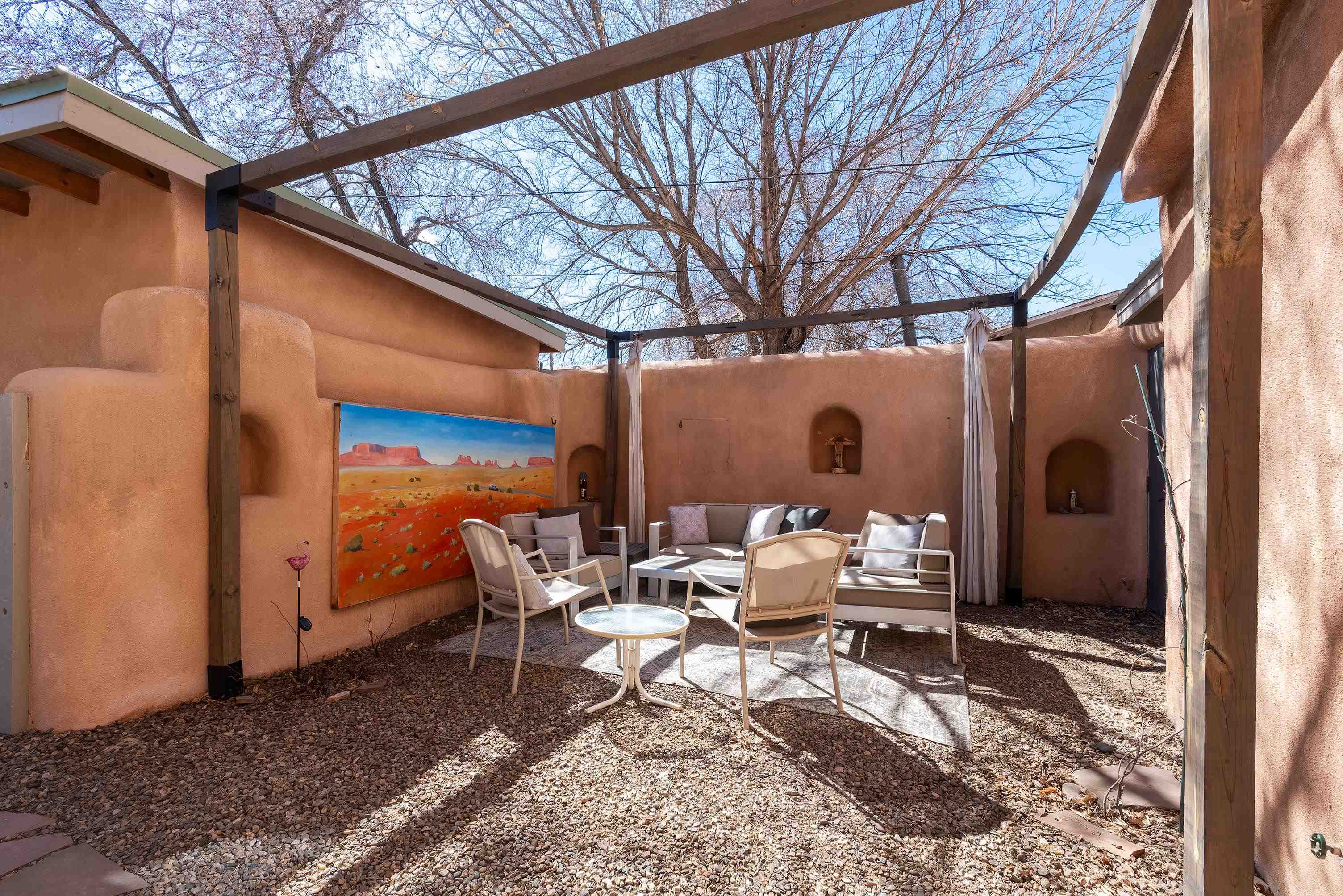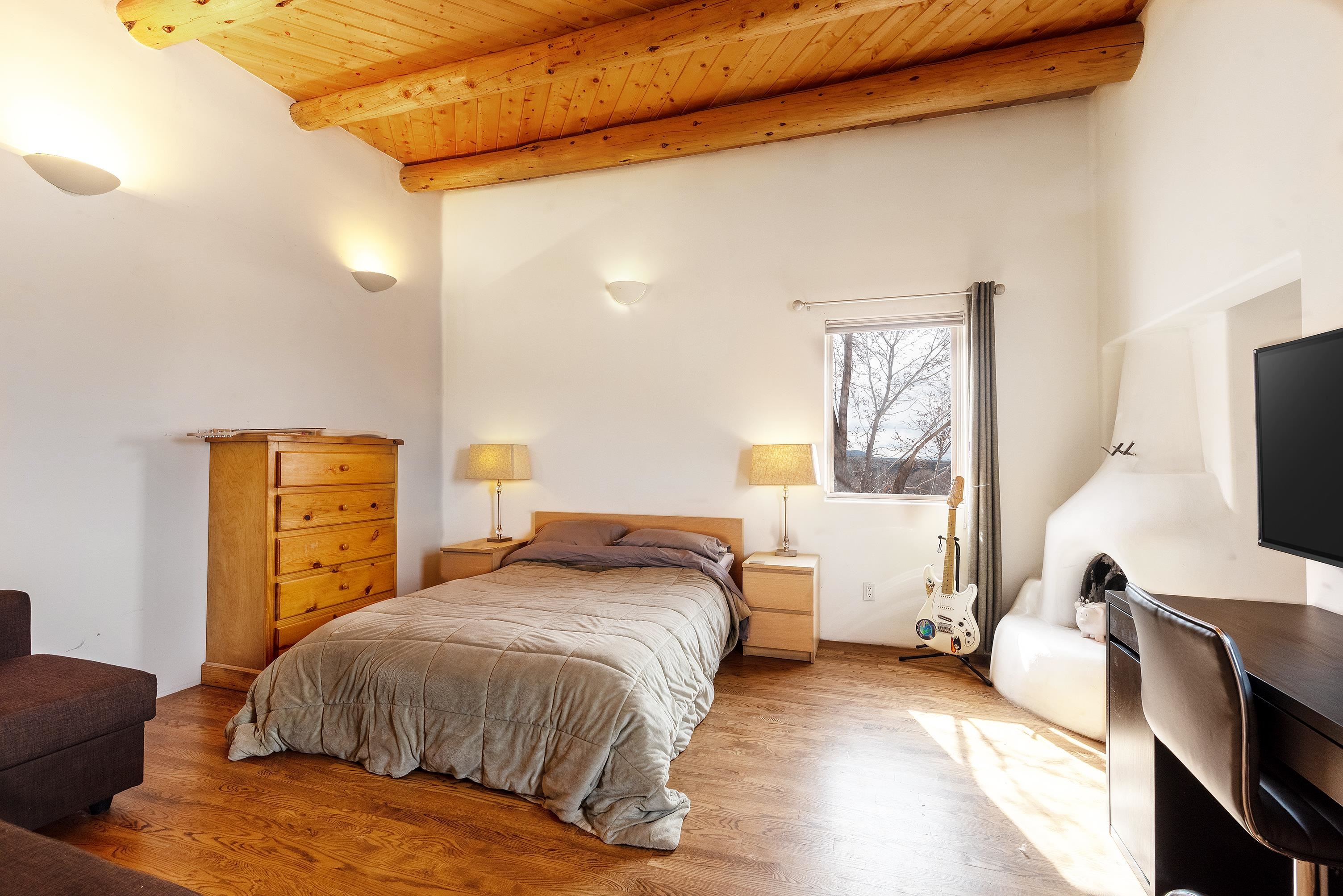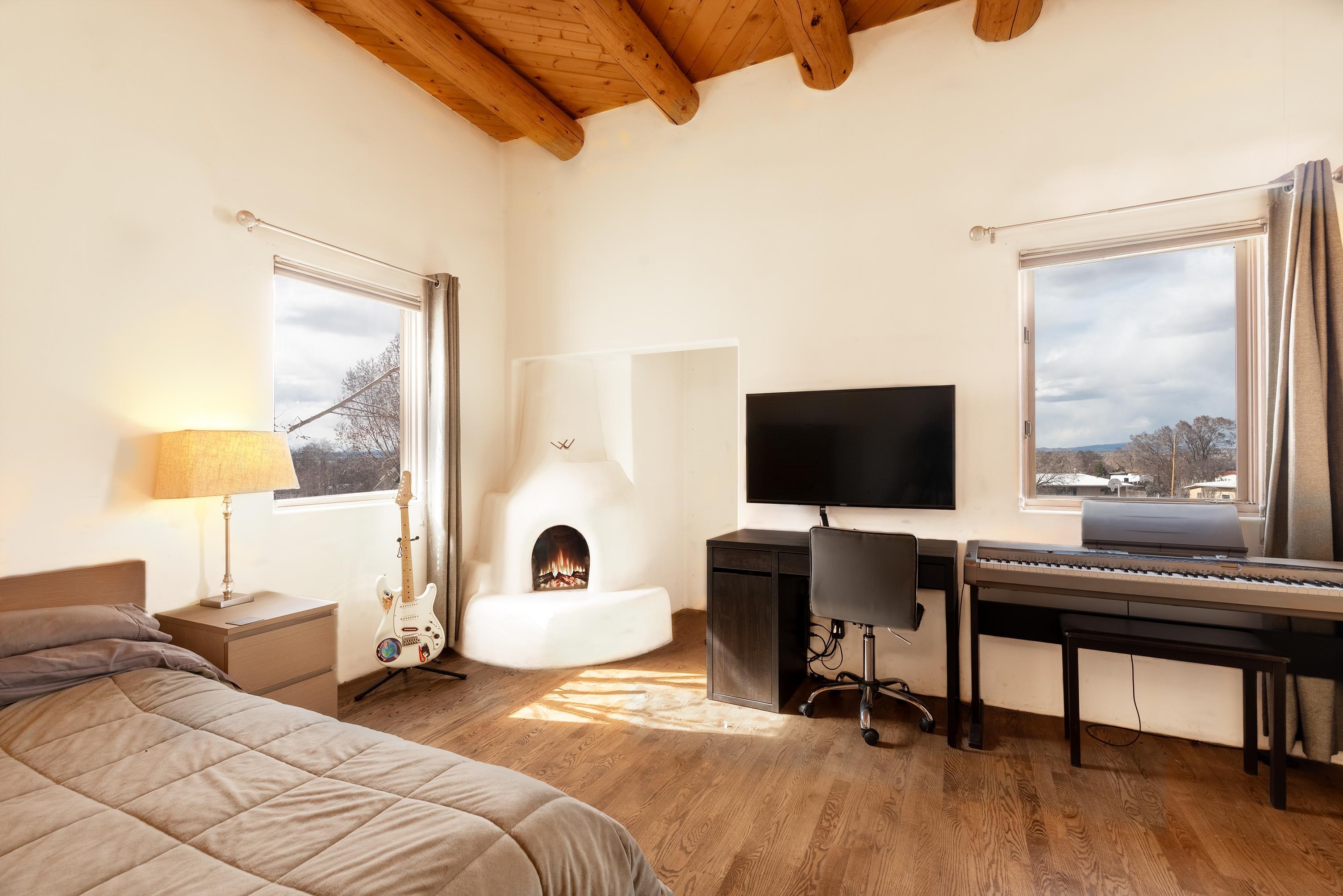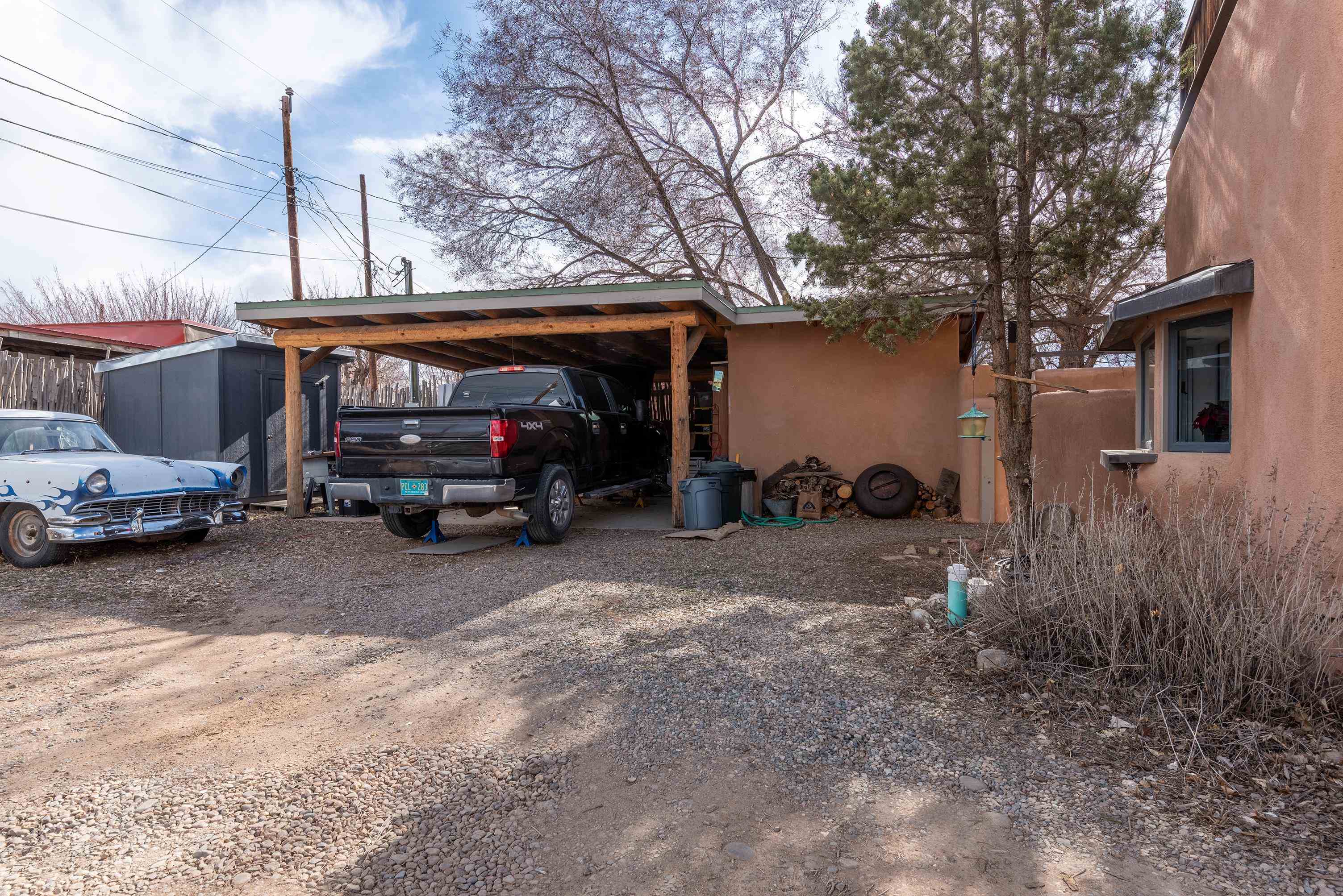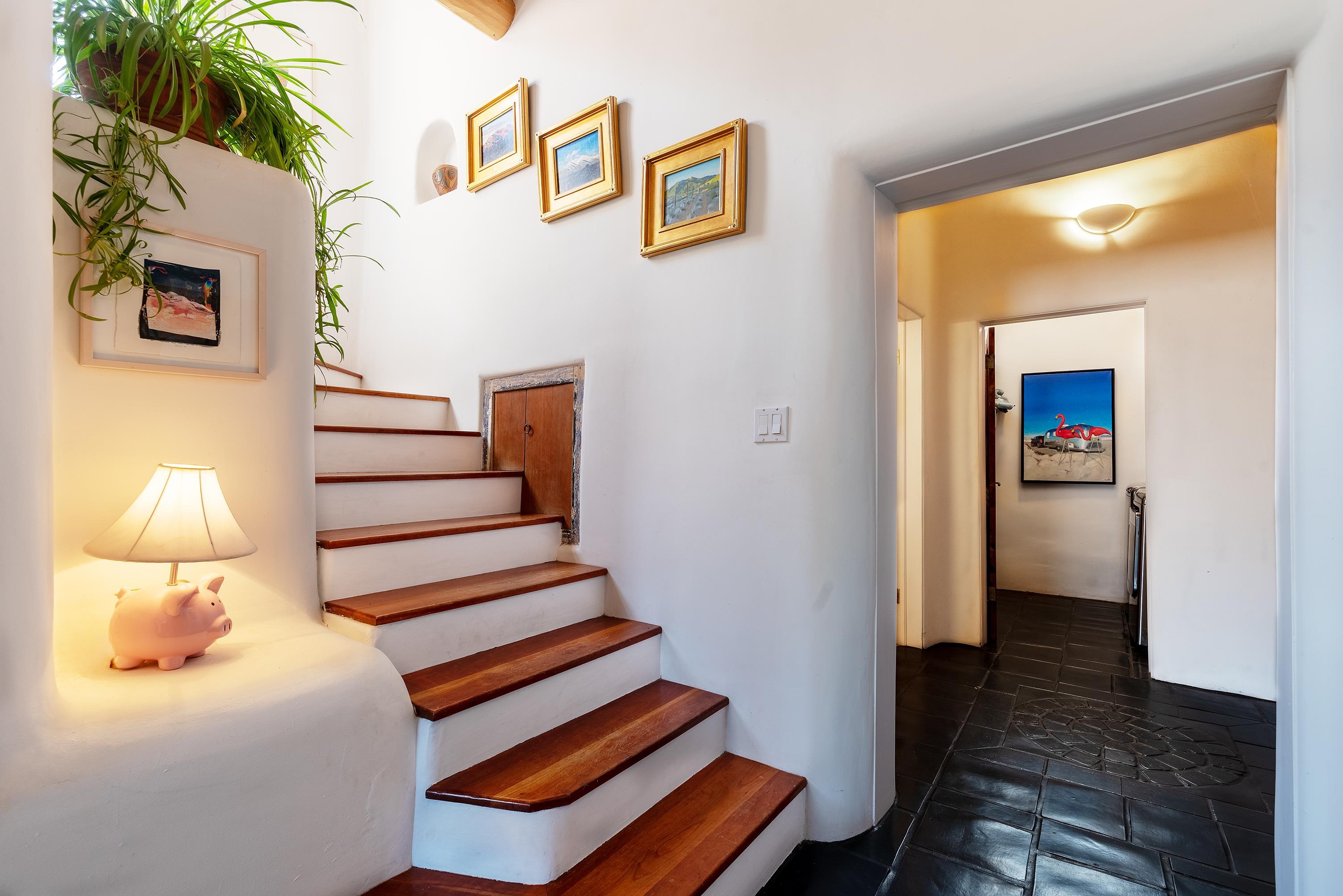 This home is a dream come true if you're looking for an iconic Ranchos adobe! Behind the Blue Door is a walled flagstone patio creating a grand entryway. This 2319 sq ft adobe home has been tastefully renovated and modernized, preserving the original 1930's feel with vigas and tongue and groove ceilings throughout. Saltillo tile floors are warmed by in-floor radiant heat. This home features two distinct living areas. The large, primary living area with wood floors southwestern style fireplace and bancos is currently used as a working artist's studio and gallery with a reception area and private entrance. The other side of the soaring foyer leads to an open living room, warmed by a second fireplace, with dining room and newly renovated kitchen beyond. Double glass doors lead to an enclosed back courtyard ideal for entertaining. The downstairs includes a full bathroom and separate laundry room. Curving wooden stairs adorned with nichos lead to the two bedrooms. The primary bedroom has an attached bathroom and a private deck. A bedroom built-in and a large closet in the hall serve for ample wardrobe space. The third southwestern style fireplace is tucked in the corner of the comfortable guest bedroom. A gated drive-way along the north side of the home takes you to a detached two-car carport and workshop ideal for a second "maker space." all on 0.184 acres