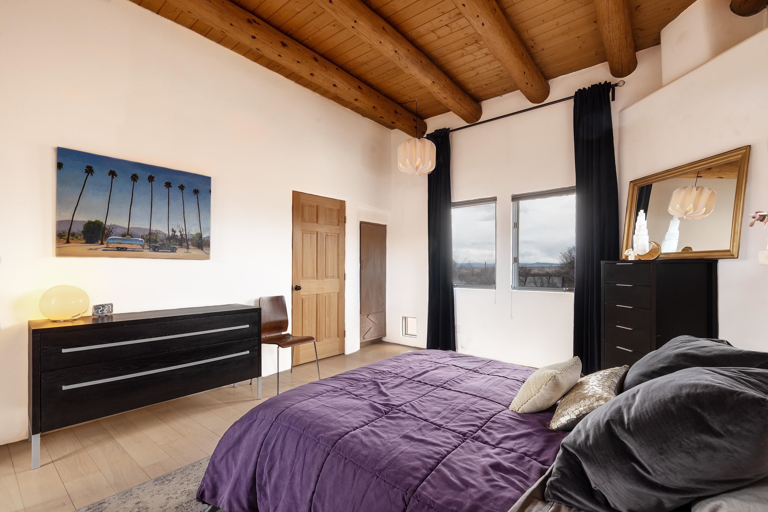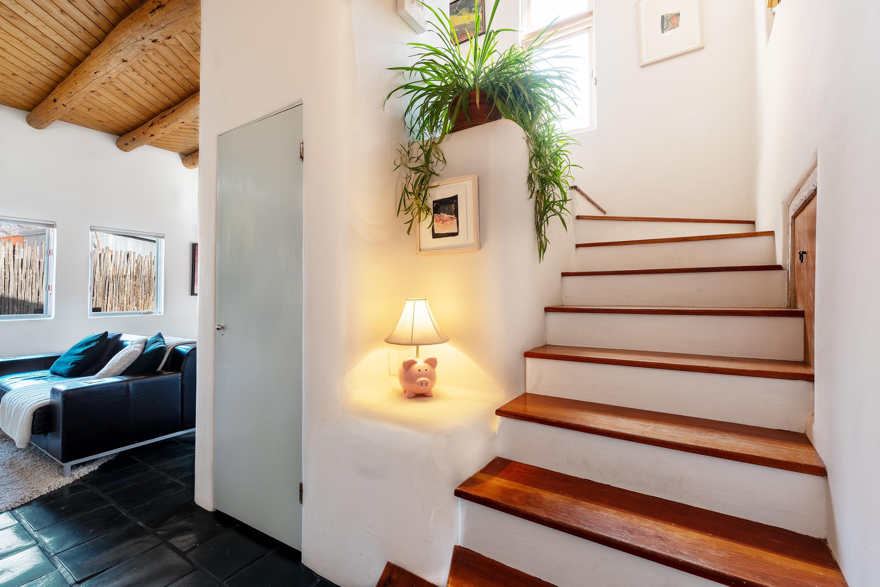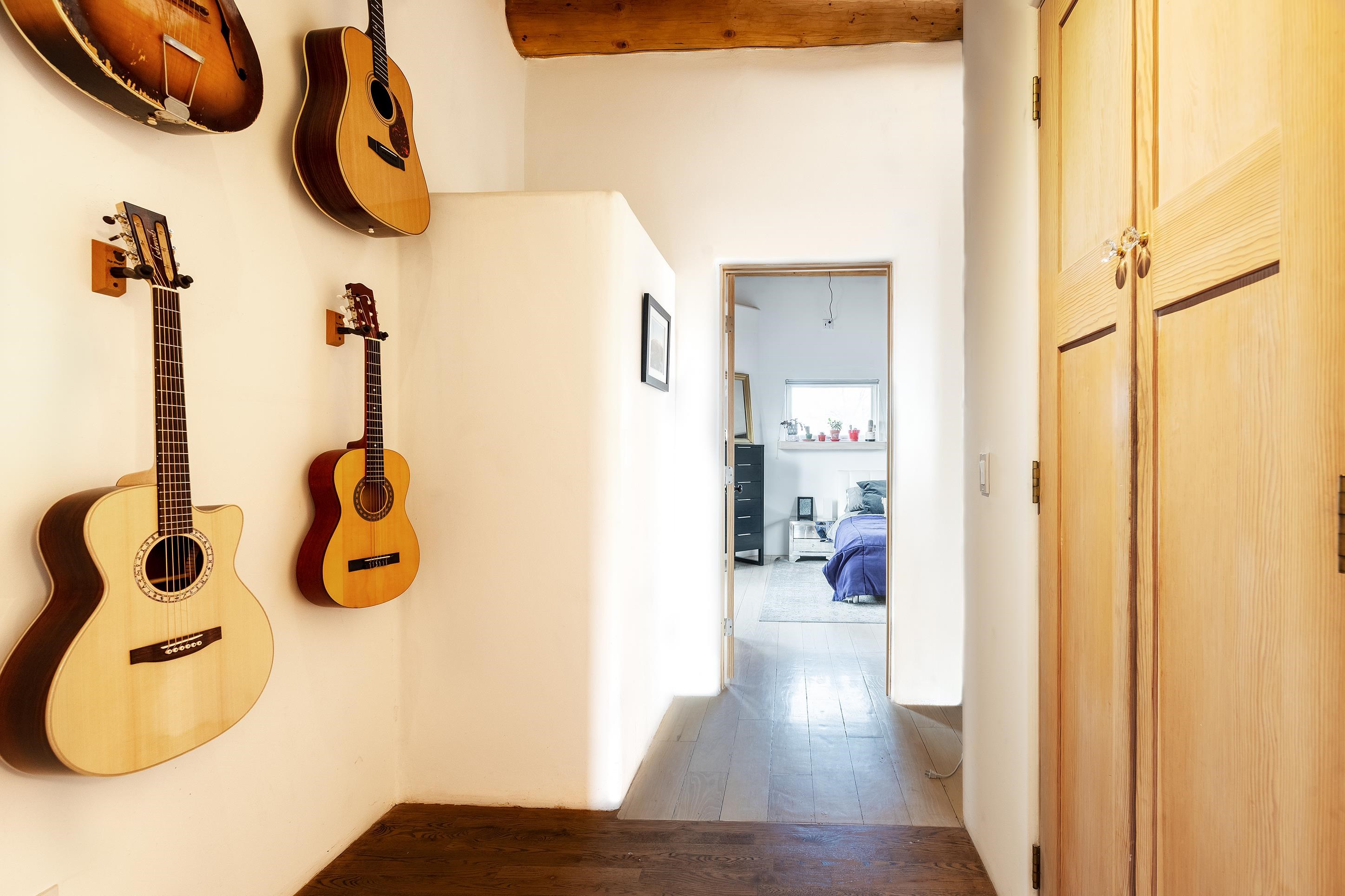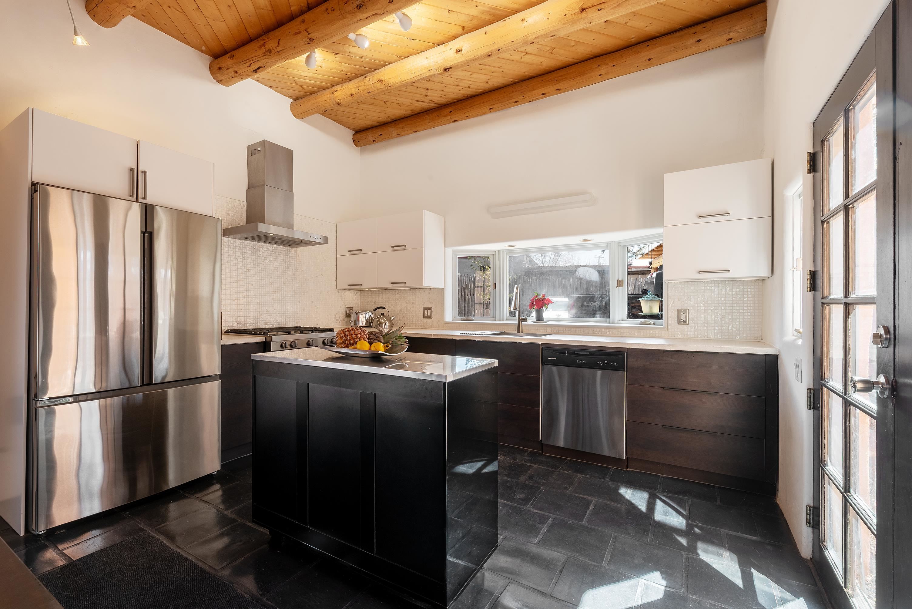 This home is a dream come true if you're looking for an iconic Ranchos adobe! Behind the Blue Door is a walled flagstone patio creating a grand entryway. This 2319 sq ft adobe home has been tastefully renovated and modernized, preserving the original 1930's feel with vigas and tongue and groove ceilings throughout. Saltillo tile floors are warmed by in-floor radiant heat. This home features two distinct living areas. The large, primary living area with wood floors southwestern style fireplace and bancos is currently used as a working artist's studio and gallery with a reception area and private entrance. The other side of the soaring foyer leads to an open living room, warmed by a second fireplace, with dining room and newly renovated kitchen beyond. Double glass doors lead to an enclosed back courtyard ideal for entertaining. The downstairs includes a full bathroom and separate laundry room. Curving wooden stairs adorned with nichos lead to the two bedrooms. The primary bedroom has an attached bathroom and a private deck. A bedroom built-in and a large closet in the hall serve for ample wardrobe space. The third southwestern style fireplace is tucked in the corner of the comfortable guest bedroom. A gated drive-way along the north side of the home takes you to a detached two-car carport and workshop ideal for a second "maker space." all on 0.184 acres