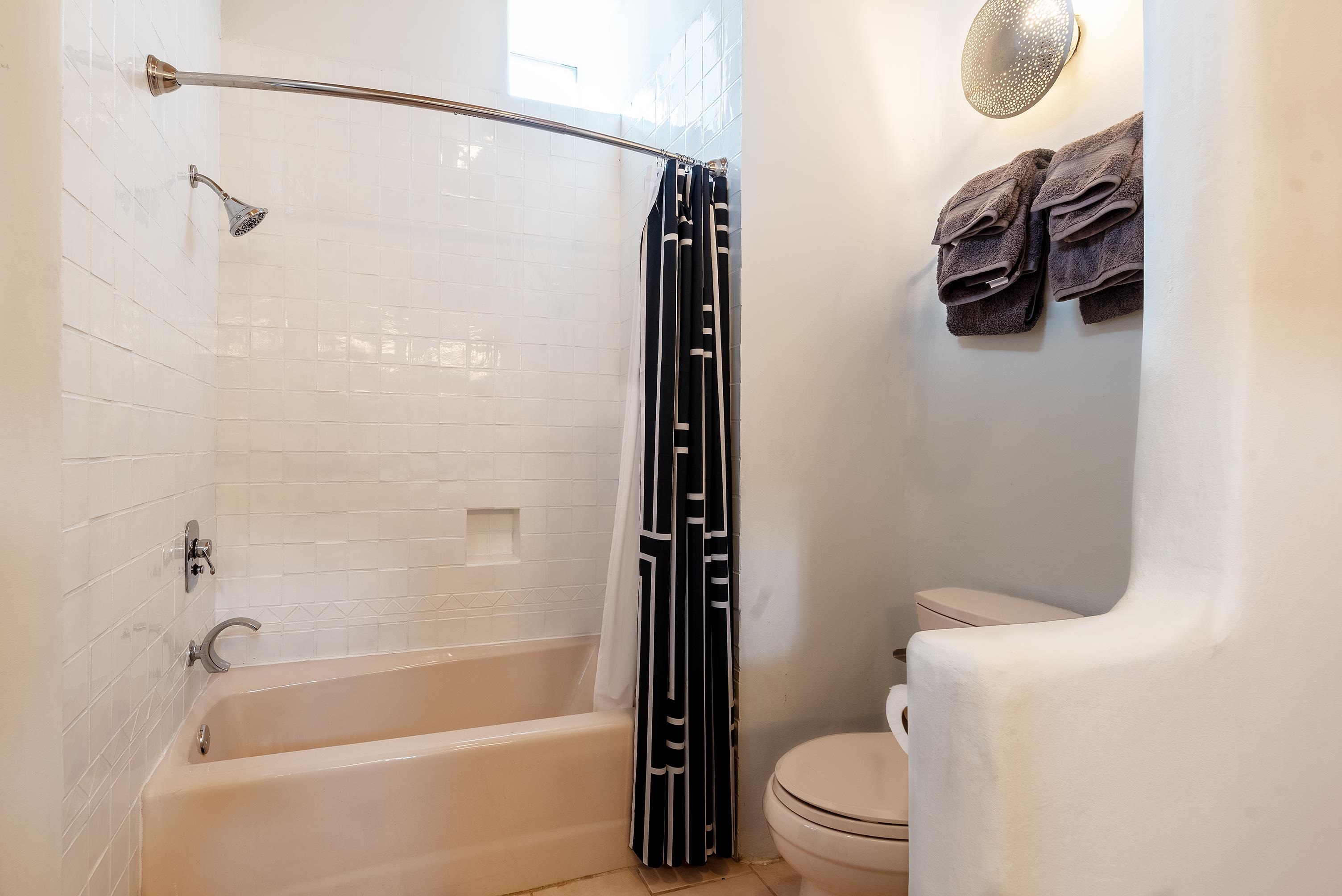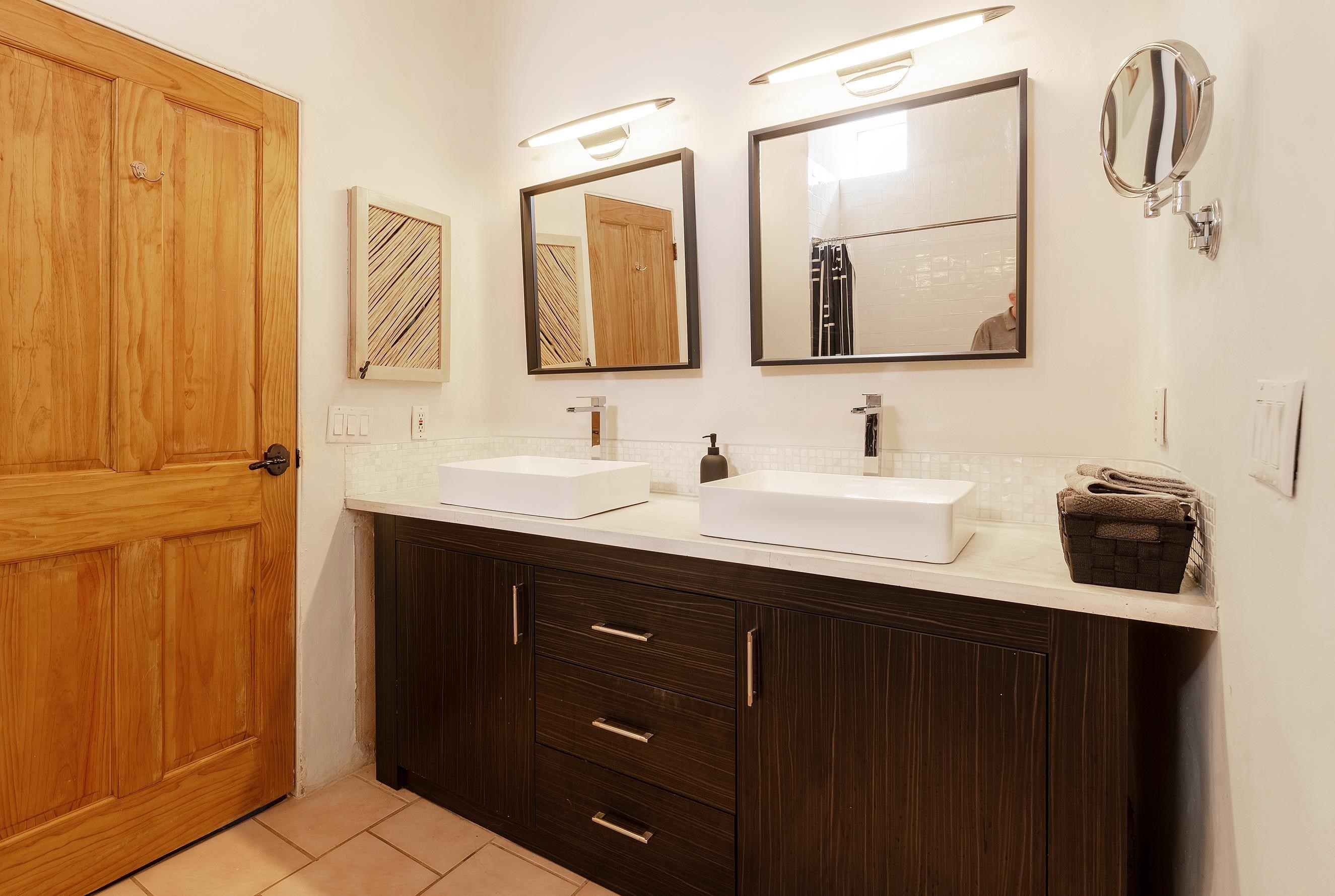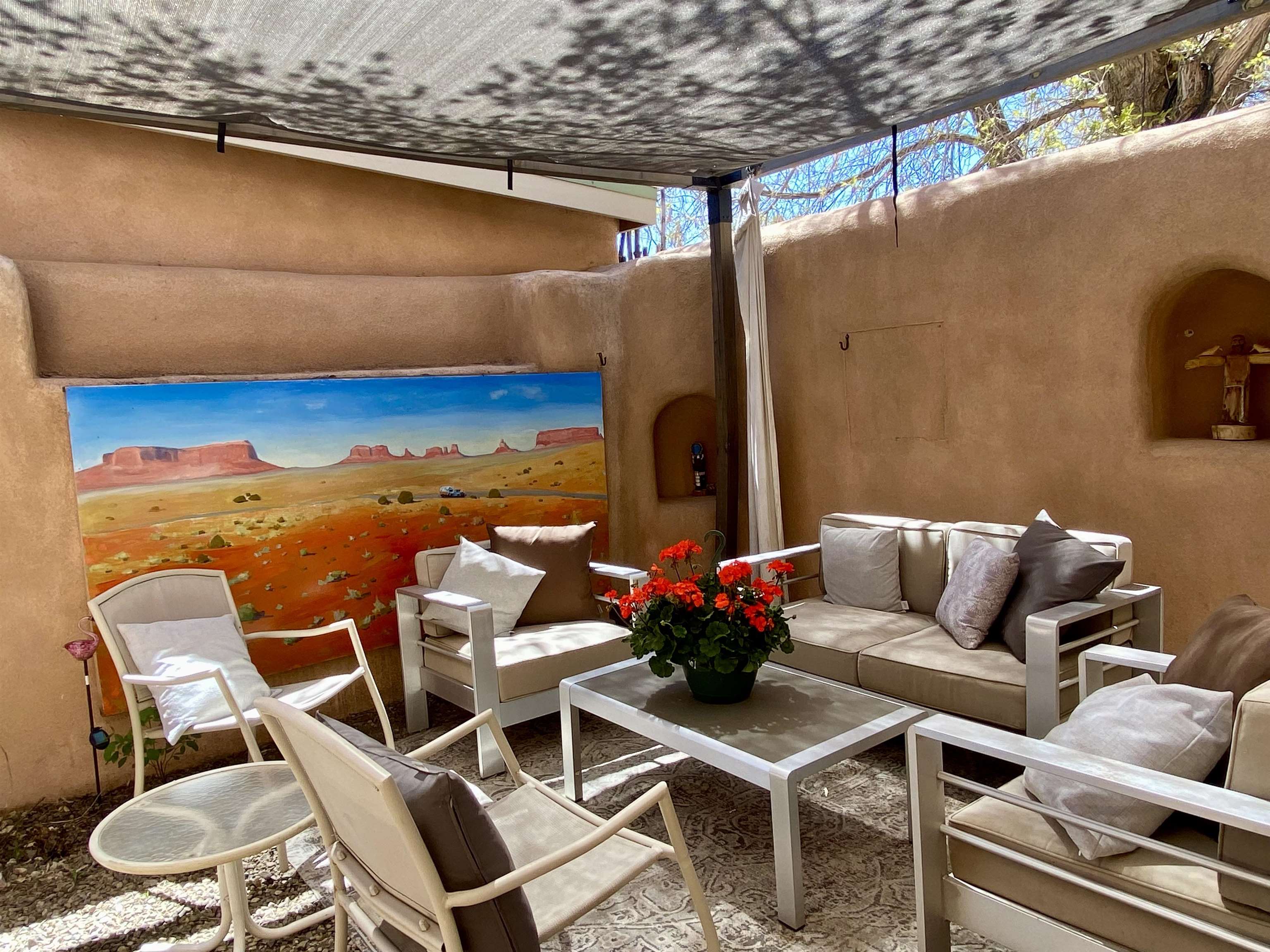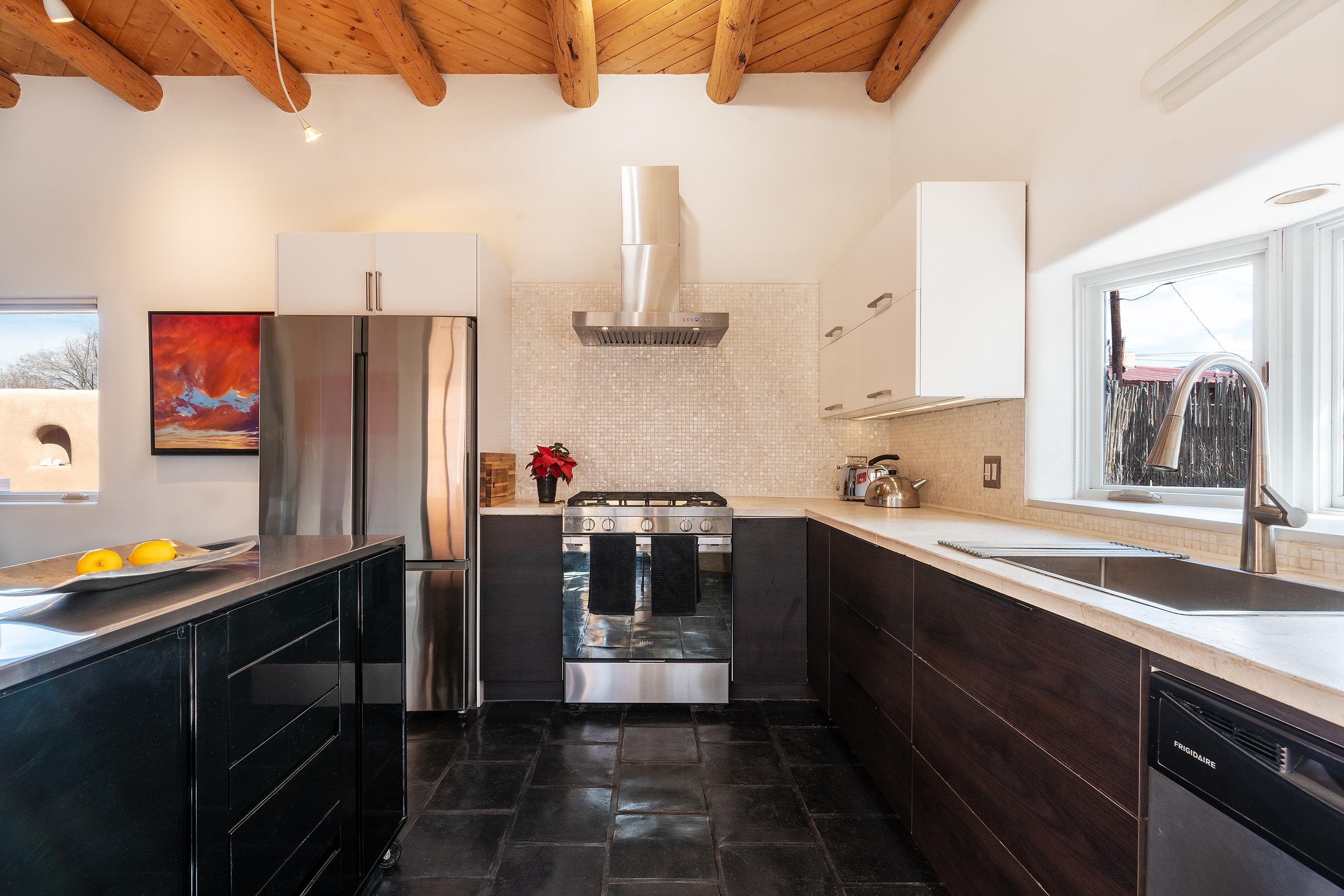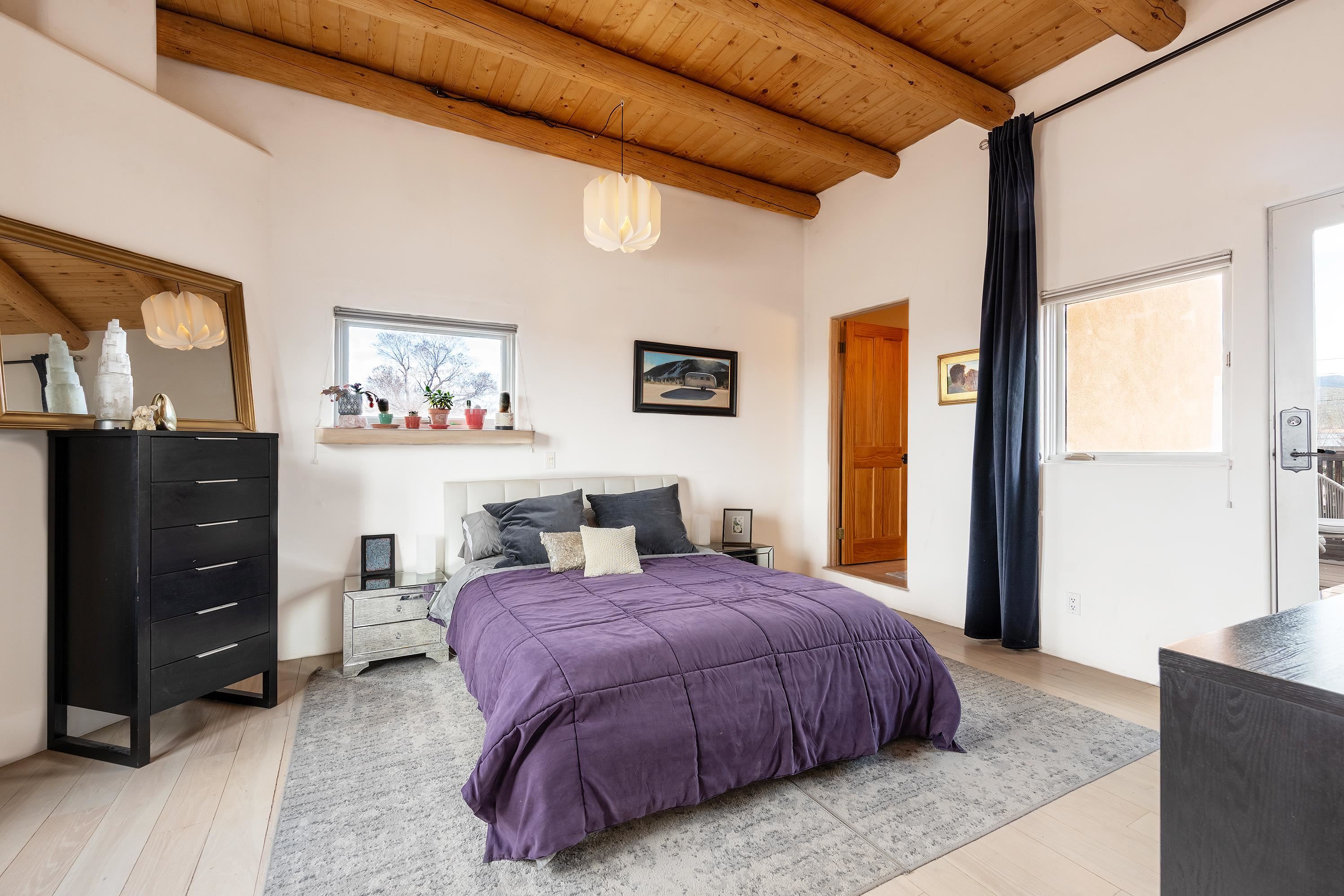 This home is a dream come true if you're looking for an iconic Ranchos adobe! Behind the Blue Door is a walled flagstone patio creating a grand entryway. This 2319 sq ft adobe home has been tastefully renovated and modernized, preserving the original 1930's feel with vigas and tongue and groove ceilings throughout. Saltillo tile floors are warmed by in-floor radiant heat. This home features two distinct living areas. The large, primary living area with wood floors southwestern style fireplace and bancos is currently used as a working artist's studio and gallery with a reception area and private entrance. The other side of the soaring foyer leads to an open living room, warmed by a second fireplace, with dining room and newly renovated kitchen beyond. Double glass doors lead to an enclosed back courtyard ideal for entertaining. The downstairs includes a full bathroom and separate laundry room. Curving wooden stairs adorned with nichos lead to the two bedrooms. The primary bedroom has an attached bathroom and a private deck. A bedroom built-in and a large closet in the hall serve for ample wardrobe space. The third southwestern style fireplace is tucked in the corner of the comfortable guest bedroom. A gated drive-way along the north side of the home takes you to a detached two-car carport and workshop ideal for a second "maker space." all on 0.184 acres