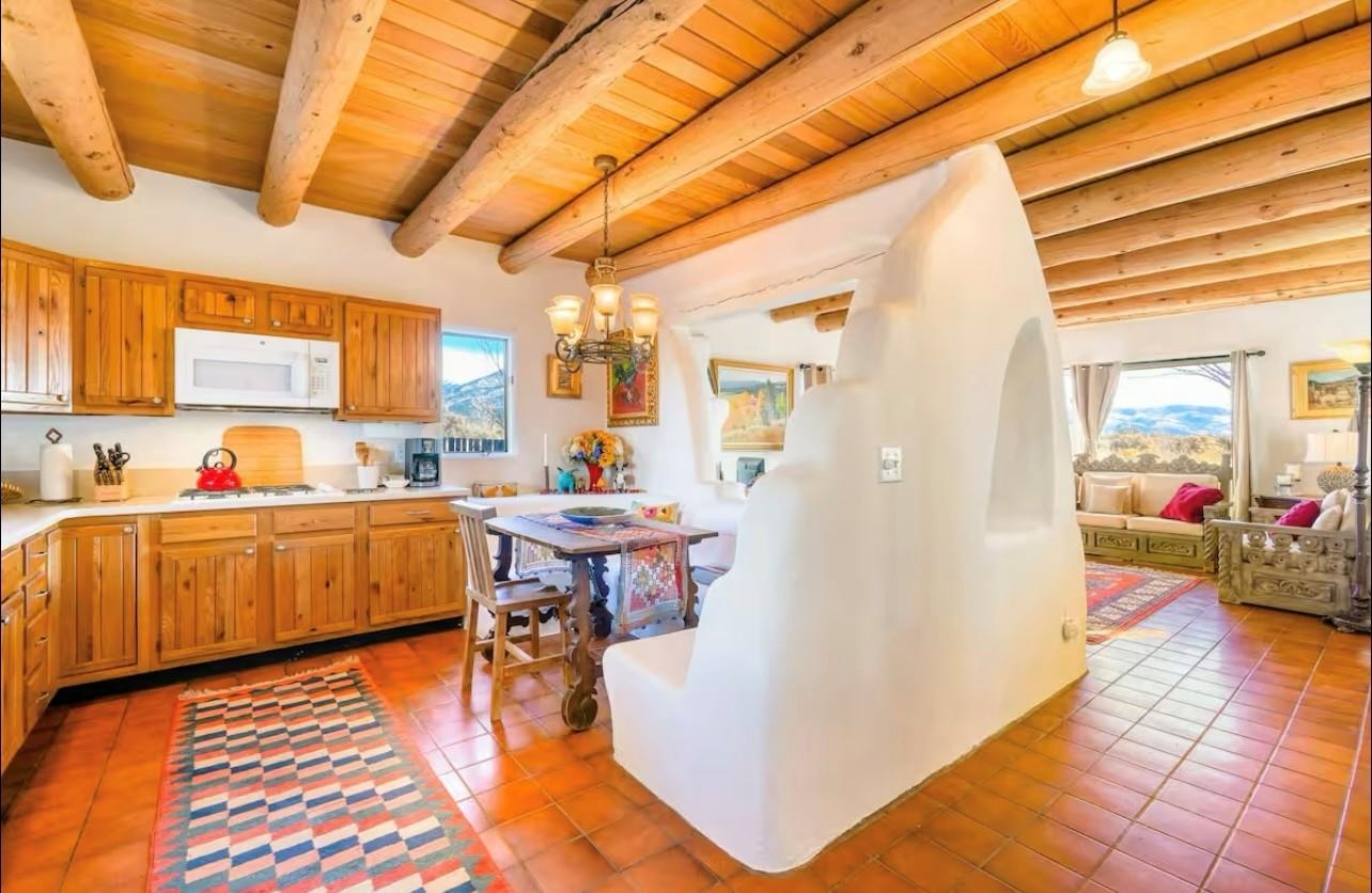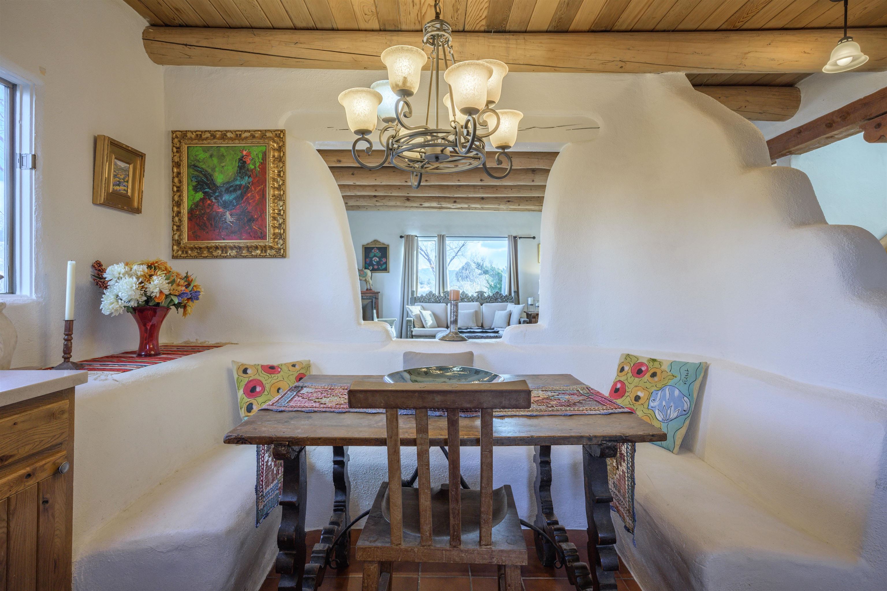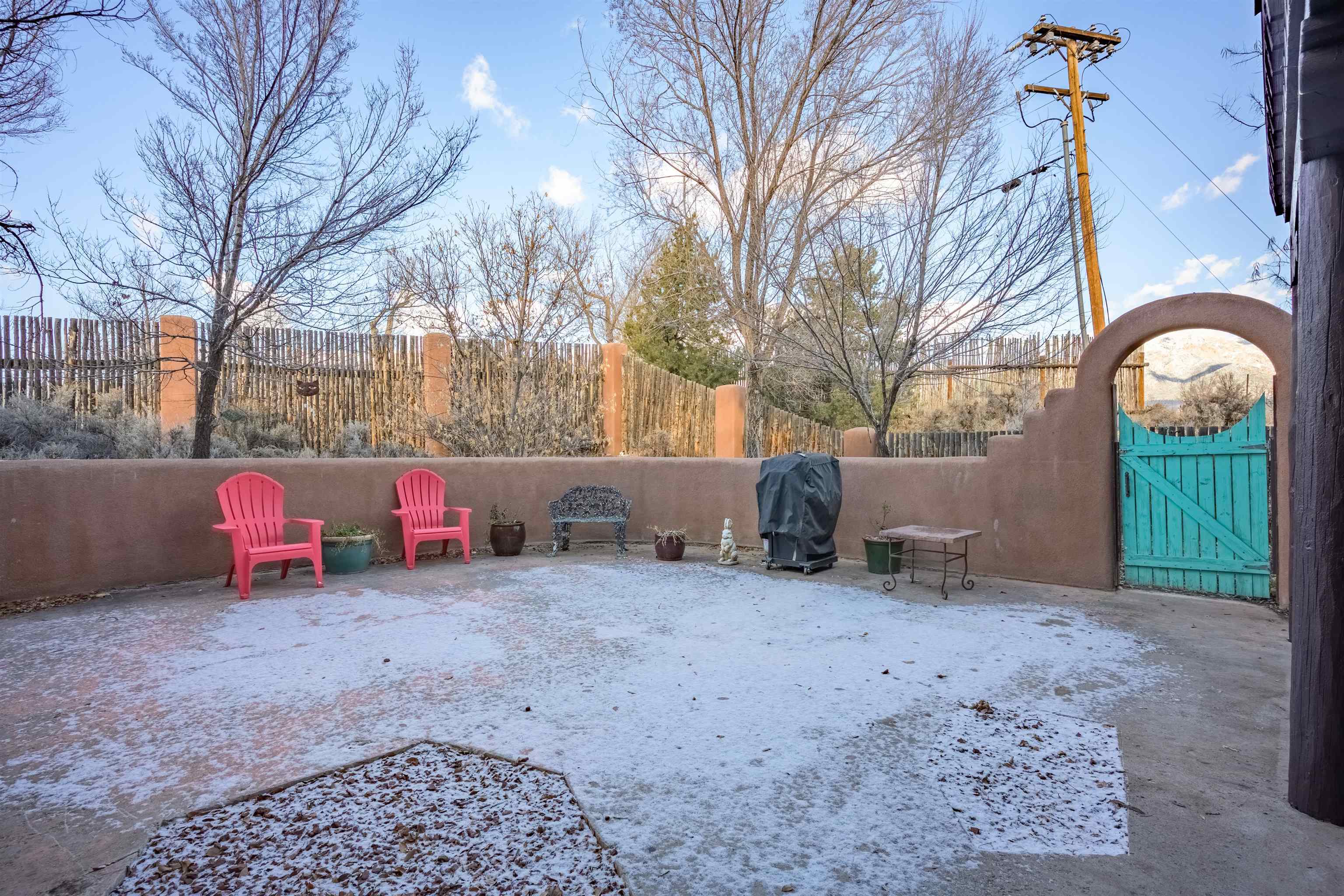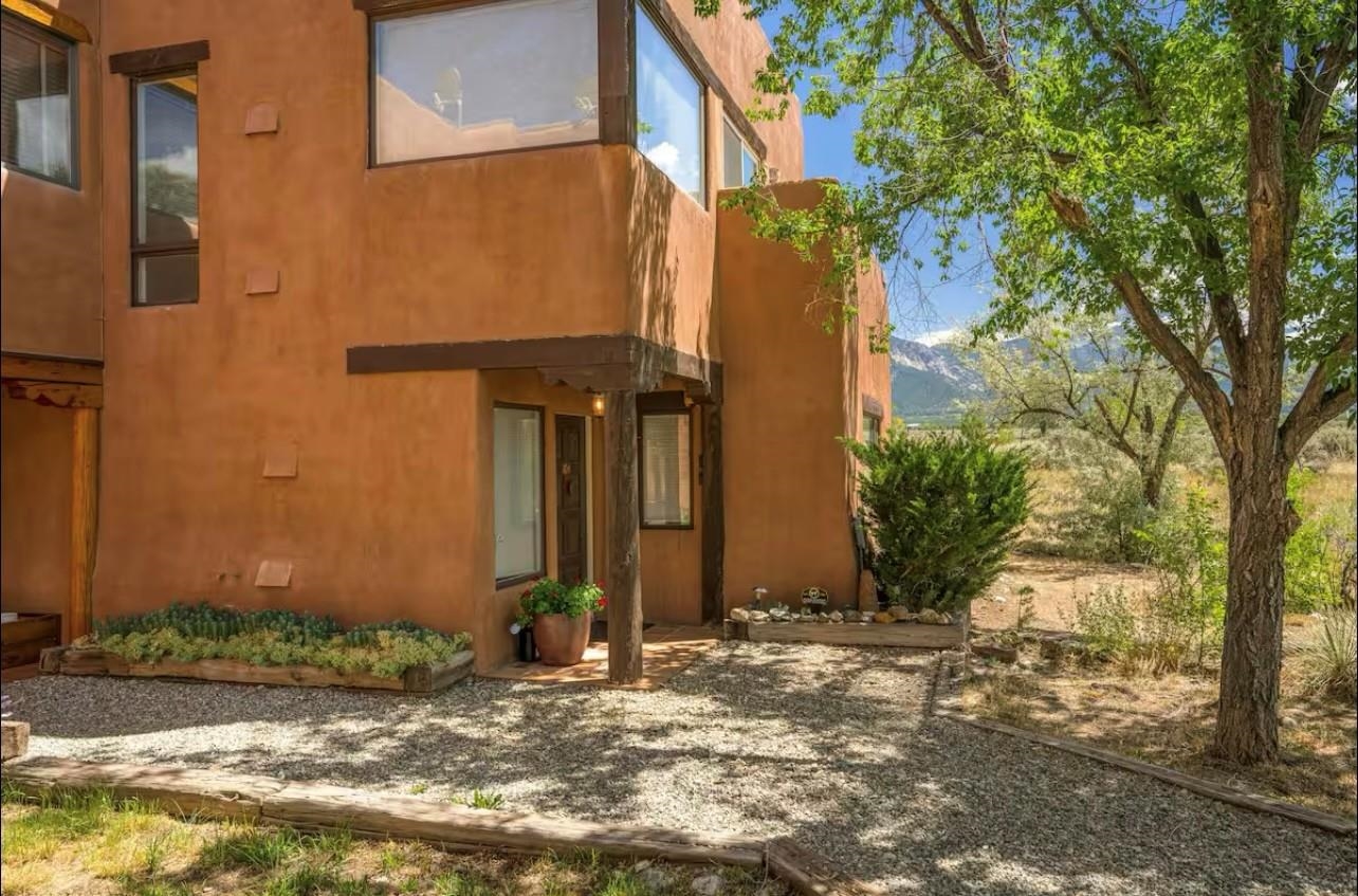 YOUR PLACE IN THE FUN. If your’e looking for a stylish get-a-way or home-sweet-home that’s near Taos Ski Valley and the great outdoors yet convenient to town, then take a look at this find! This 2BR/2BA approx. 1,4016 sq ft townhouse (no HOA fees) has so much to offer. The unbeatable location puts you under 30 min. to TSV and USFS and under 5 min. from the Tennis Ranch for tennis, pickleball, and swimming as well as 6 nearby restaurant/bars.. Picturesque Arroyo Seco is just up the road for shops, galleries, and even a well -stocked grocery. Being an end unit in this small 4 unit complex, there are lots of windows to provide lots of dramatic mountain views and lots of natural light. The living room has or an airy feel and the vigas, Mexican tile floors, bancos, and a nicho create a warm, Southwest ambience. The ample kitchen functions perfectly for a couple or a small crowd and boasts a built-in banco for in-kitchen seating. An artistic “keyhole†design separates the area and echoes traditional pueblo architecture. Out the kitchen door is an expansive, private walled patio to extend living area in the warmer months. Pets? A fenced dog run is possible. Completing the downstairs is a full bath with a washer/dryer convenient to all. Upstairs is the spacious primary bedroom with a sunny nook ideal for an office ( if you must), or relaxing with a good book or some good music. The 2nd bedroom offers more mountain views with a deck with space to chill, take in the views, or sip a cerveza. A large second bath with dual Talavera sinks completes the upper level. You’ll love the tranquility yet you have easy year-round access to the historic Town of Taos, colorful Arroyo Seco, TSV, USFS, Rio Grande Nat’l Monument, so hiking, biking, skiing, boarding, fishing, golf, and horseback riding are all available when you want to play. Isn’t it time to “Live a Little?†(Note: this is a townhouse, not a condo)