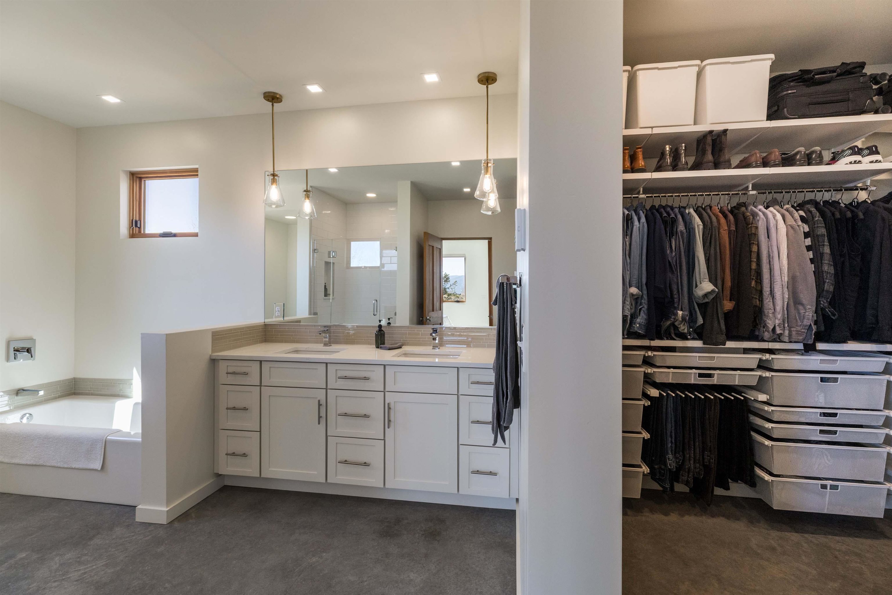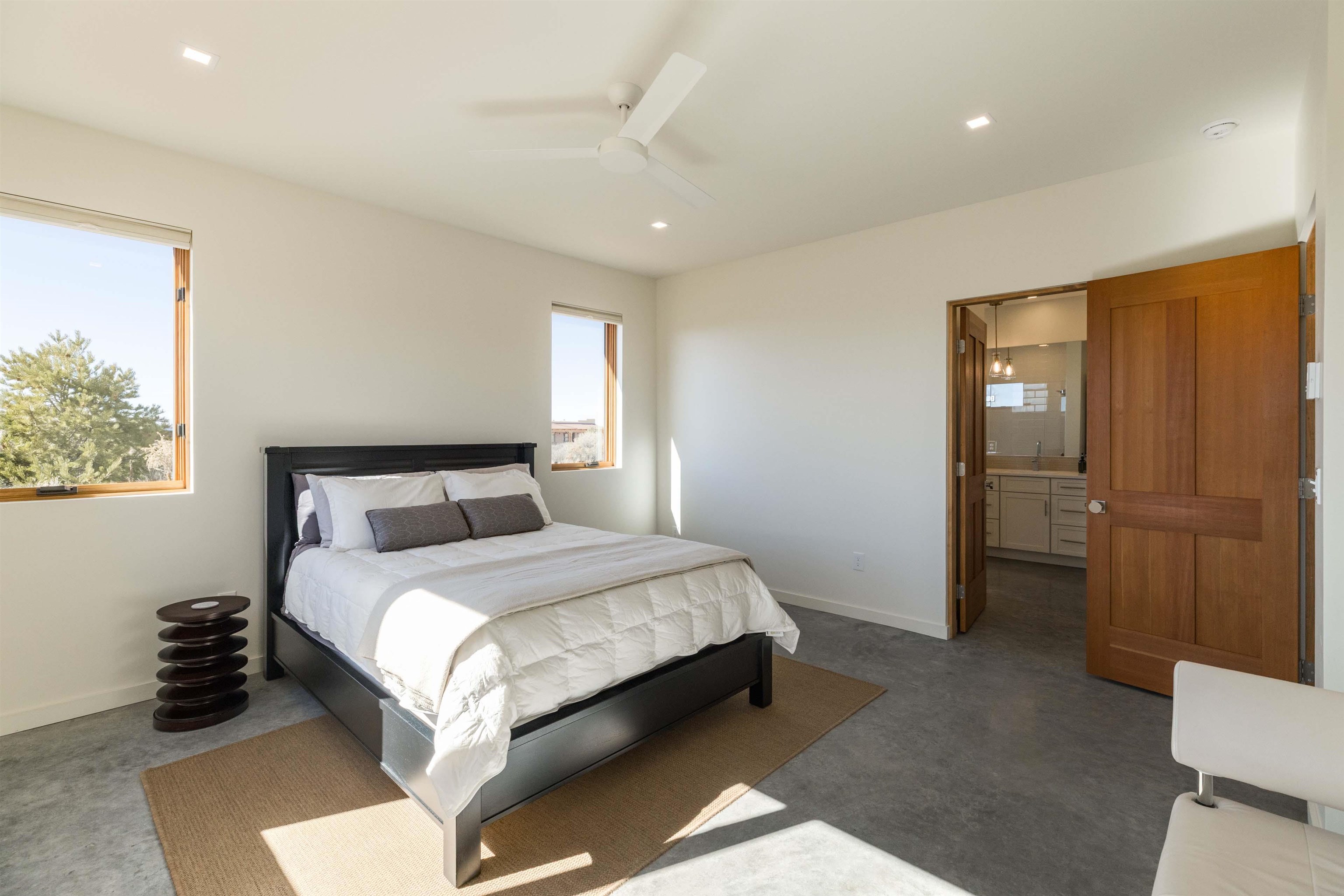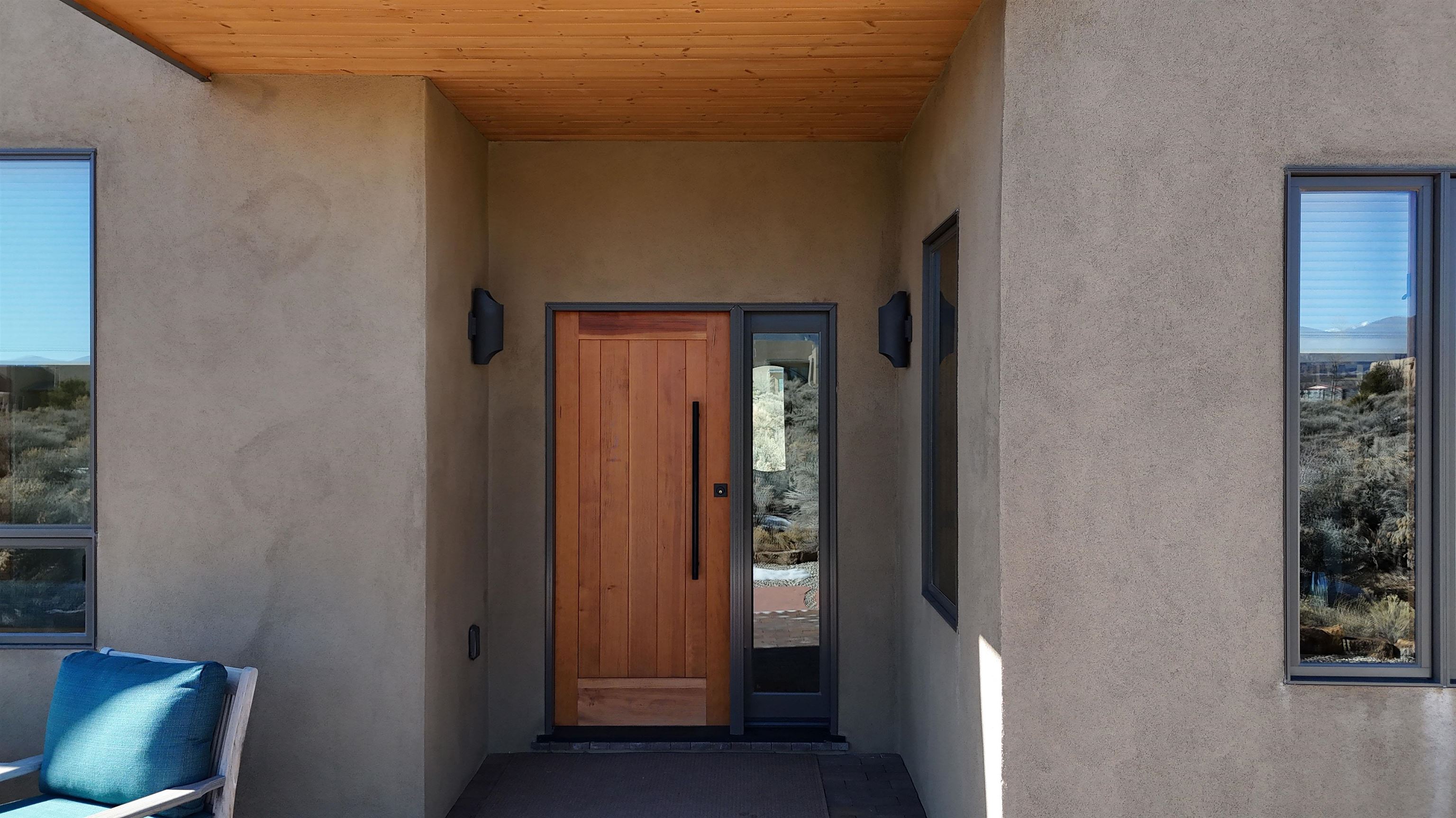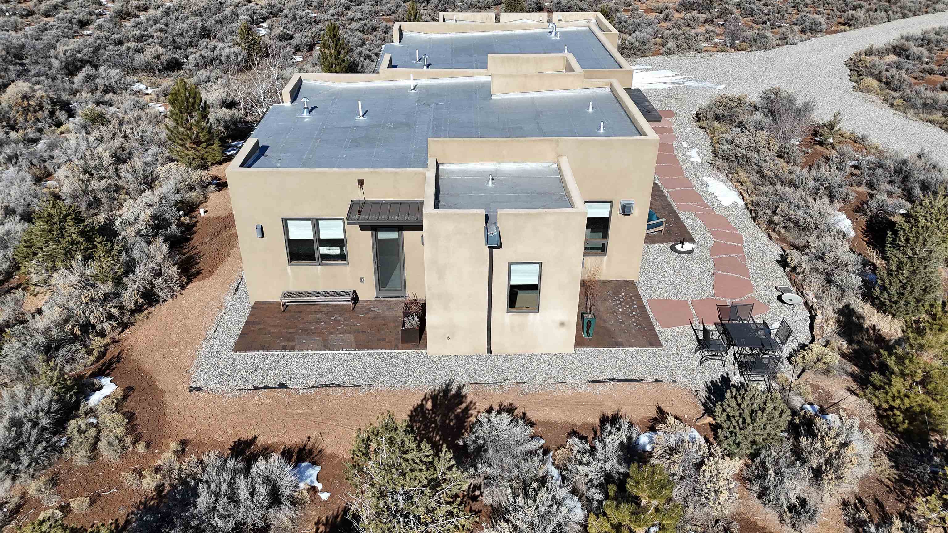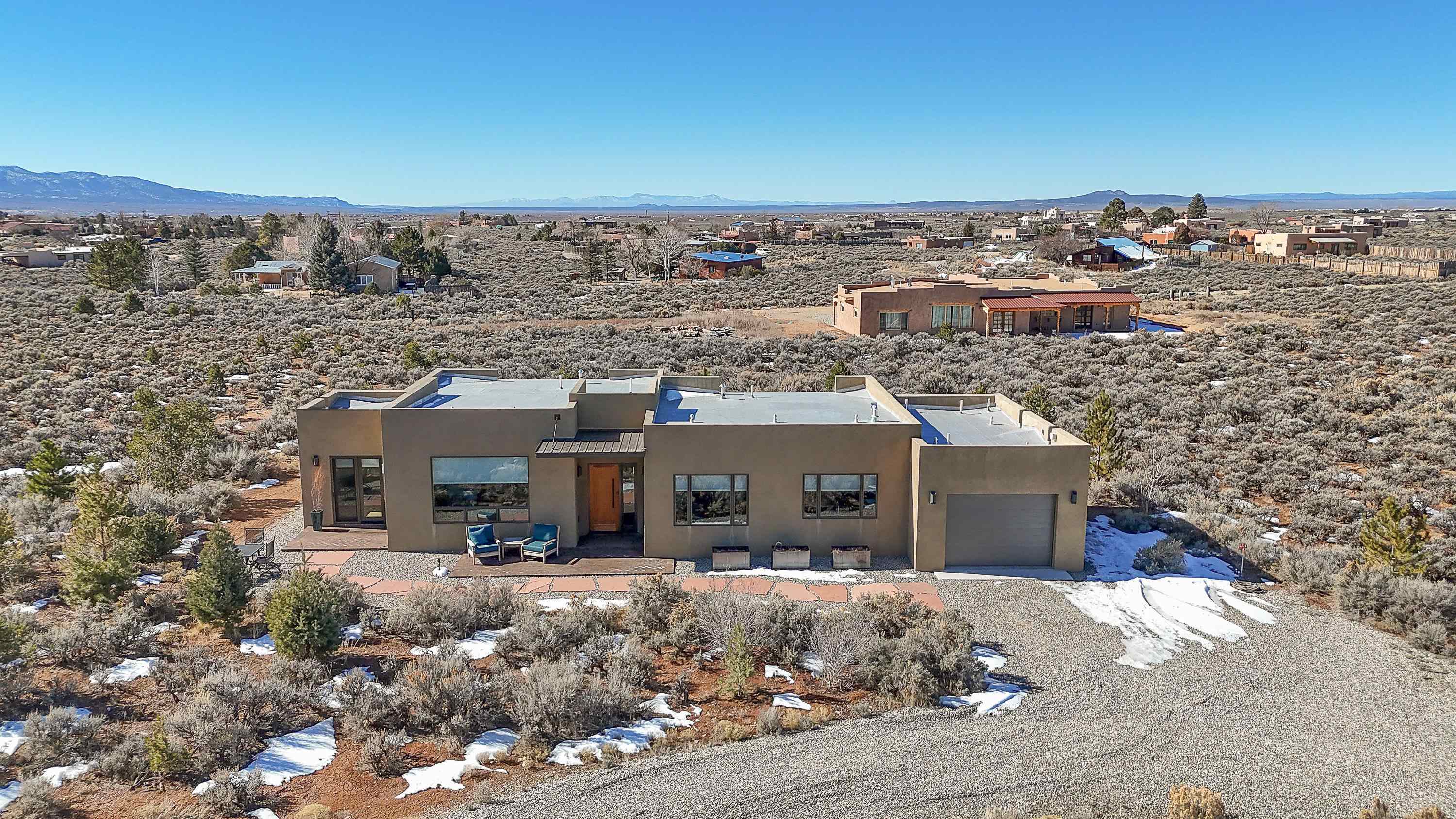 At the quiet end of a dead-end road, where the land opens into protected beauty and the sky feels endless, this contemporary Southwest residence offers a rare harmony of privacy, design, and place. Thoughtfully built just five years ago and maintained to the highest standard, the two-bedroom, two-bath home lives like new—radiant floor heat beneath your feet, a glowing gas Jotul fireplace anchoring the living space, and expansive windows framing the ever-changing drama of the Sangre de Cristo Mountains. Natural light moves effortlessly through the interiors, illuminating clean lines and warm, organic textures. The kitchen is exceptional—abundant custom storage, top-of-the-line Frigidaire Professional appliances, double wall ovens (convection), a convection microwave/oven combo, Zepher hood, 6 burner 36" Thor gas Range top, a large custom-built island and a gracious layout designed for both intimate evenings and inspired entertaining. Every detail feels intentional. Every finish, timeless. There are custom details throughout and all systems are thoughtful and efficient including: water softener, reverse osmosis drinking system, on demand hot water heater, instant hot water for taps, multi zone radiant heating, including garage, dimmable LED lighting inside and out, fiber optic high speed internet with ethernet wall outlets, adjustable Elfa closet systems, automatic drip irrigation and a hot tub hookup. The Primary bedroom is bathed in natural light and graced with a spa-like bath and large walk-in closet and a sublime view of Pedernal on the horizon through the West facing windows. The guest bedroom is currently used as a fantastic Artist studio. A flexible bonus room offers the perfect setting for a private office, studio, or creative sanctuary. The attached heated garage adds everyday ease, while the home’s position contiguous to a conservation easement ensures lasting tranquility and gorgeous walks just out the front door. Step outside to miles of walking trails through open sage , where the landscape is preserved and the silence is sacred. Ideally located off the north end of Blueberry Hill, this property is perfectly poised between the cultural heartbeat of Taos and the alpine exhilaration of Taos Ski Valley. World-class skiing, rafting, biking, and hiking are all within effortless reach—yet home remains a peaceful retreat. Offered fully furnished with beautifully curated pieces that complement the architecture and light, this is more than a home. It is a turnkey expression of modern Southwest living—romantic, refined, and ready to be lived in beautifully.