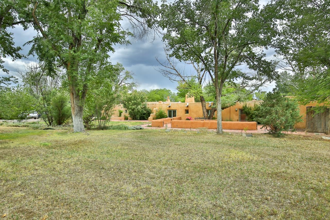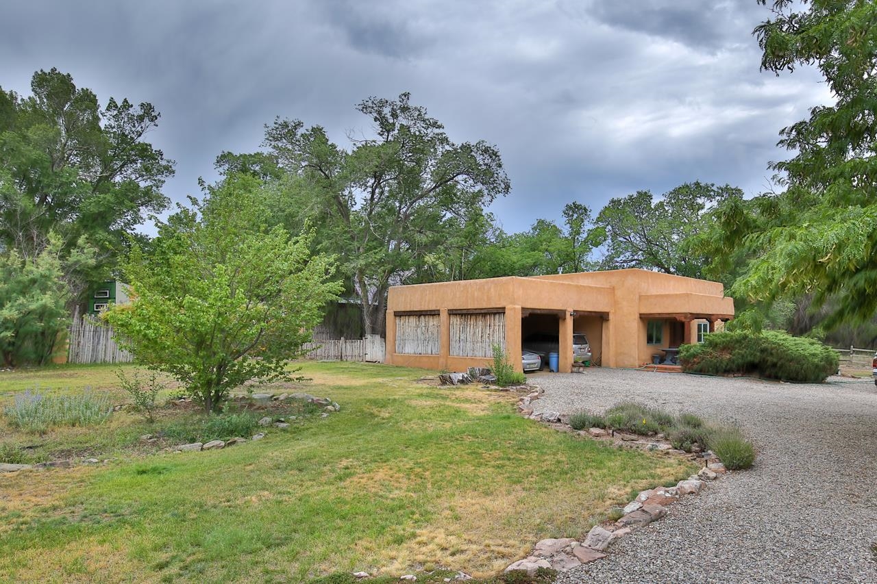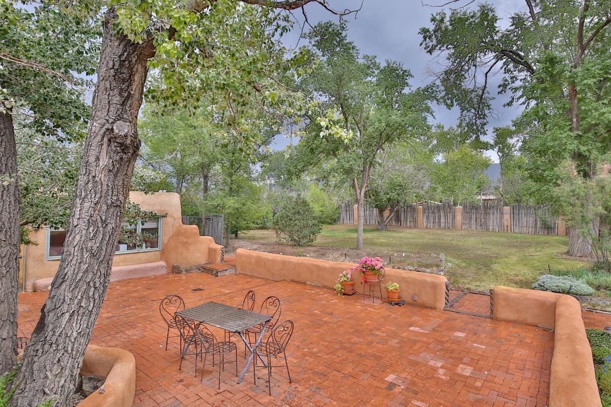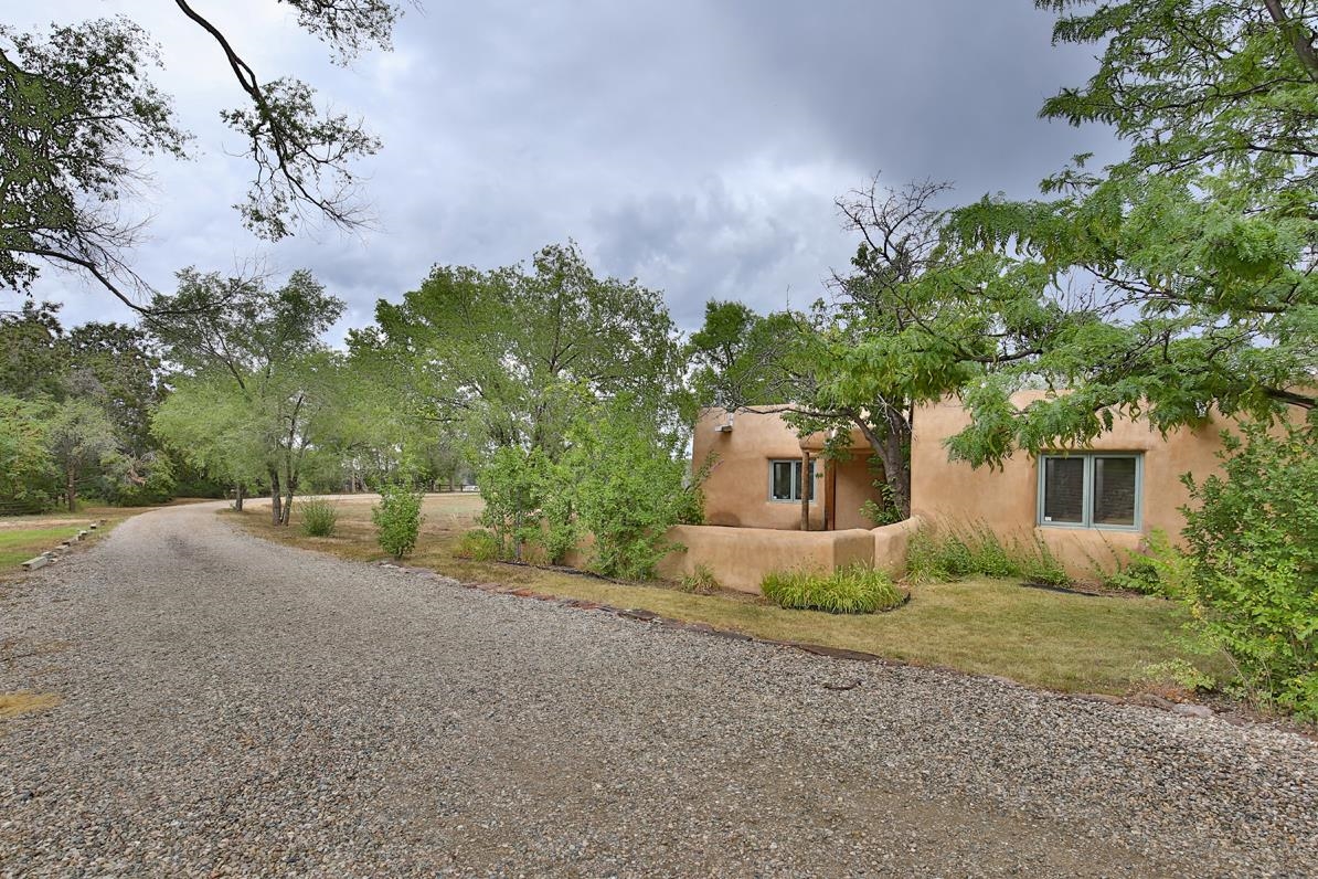 Privately set on 5.33 irrigated acres at the south end of Taos, this rare over-100-year-old, double-thick adobe estate offers enduring craftsmanship, warmth, and authenticity that cannot be replicated. Originally built in 1928, the substantial adobe walls provide exceptional insulation, quiet, and structural presence—hallmarks of true historic Taos construction. The home features seven traditional kiva fireplaces, creating warmth, character, and ambiance throughout multiple living spaces. A gracious central hallway serves as a gallery-style entrance, ideal for art display, and connects spacious rooms that flow naturally for both everyday living and entertaining. The kitchen, breakfast nook, formal dining room, library, and office provide a flexible and functional layout with room to gather or retreat. With four bedrooms, three with ensuite baths, the home offers comfort and privacy for residents and guests. An attached art studio with a two-car carport adds versatility and presents an excellent opportunity for conversion into a guest casita, creative studio, or private retreat. The expansive acreage and irrigated land create a true compound setting, offering ample room for future improvements such as additional guest structures, gardens, or recreational spaces (subject to approvals). Rich in history, substance, and potential, this distinctive adobe property represents a rare opportunity to own an authentic Taos estate with room to grow.