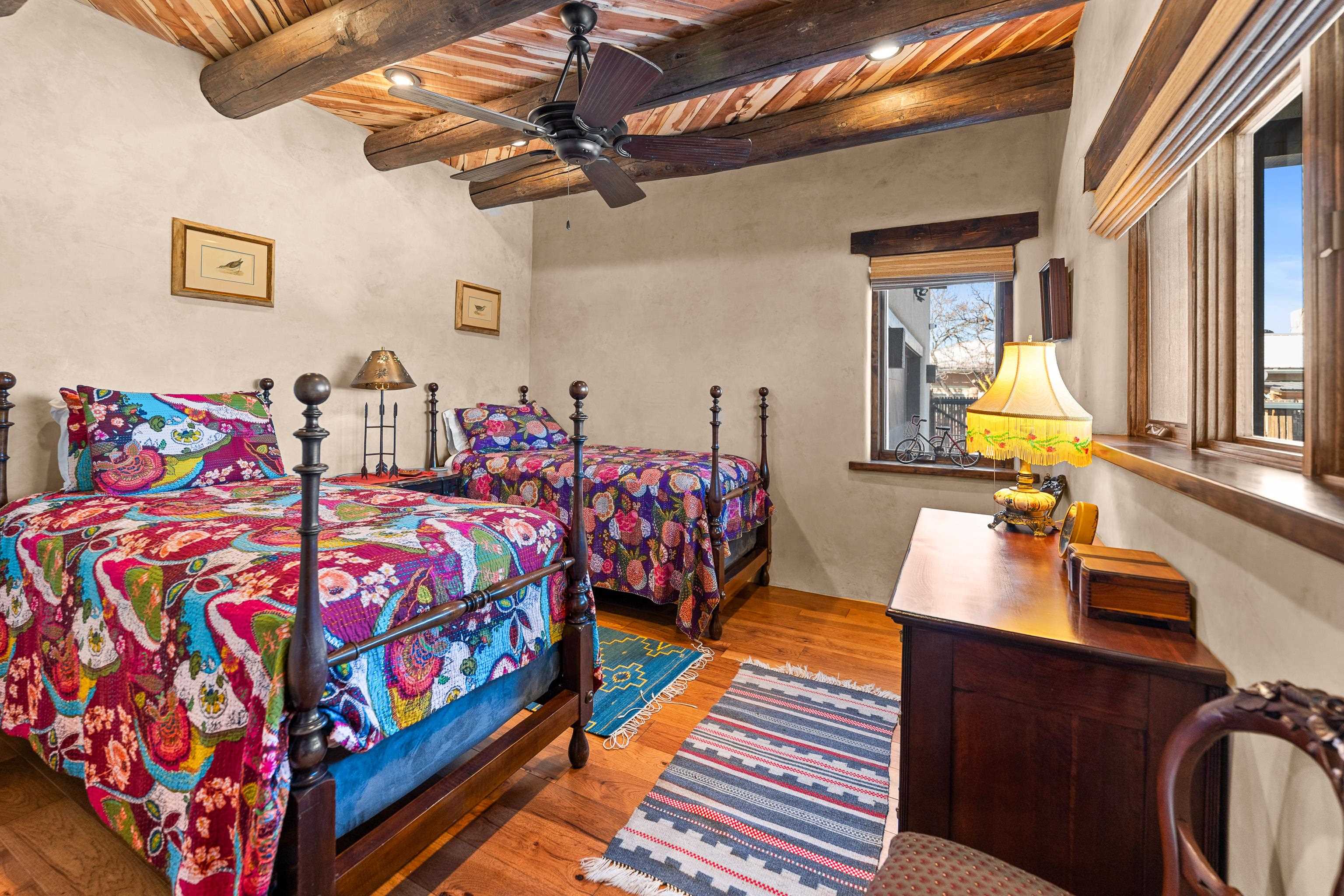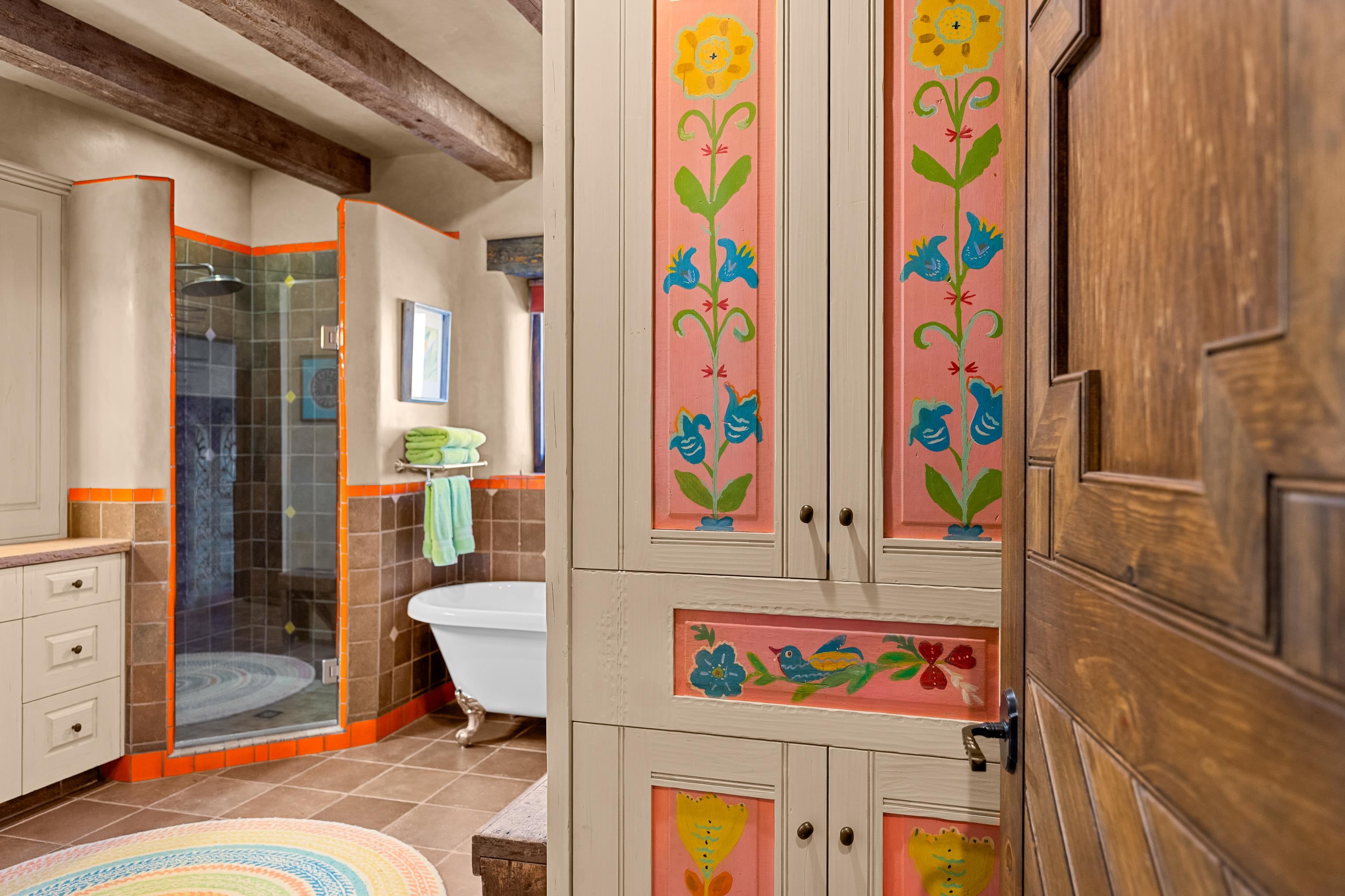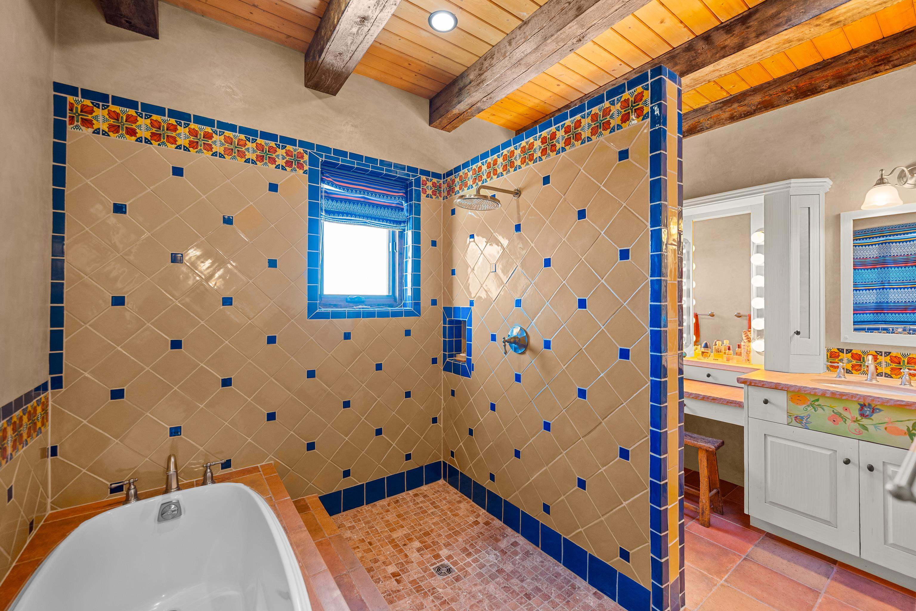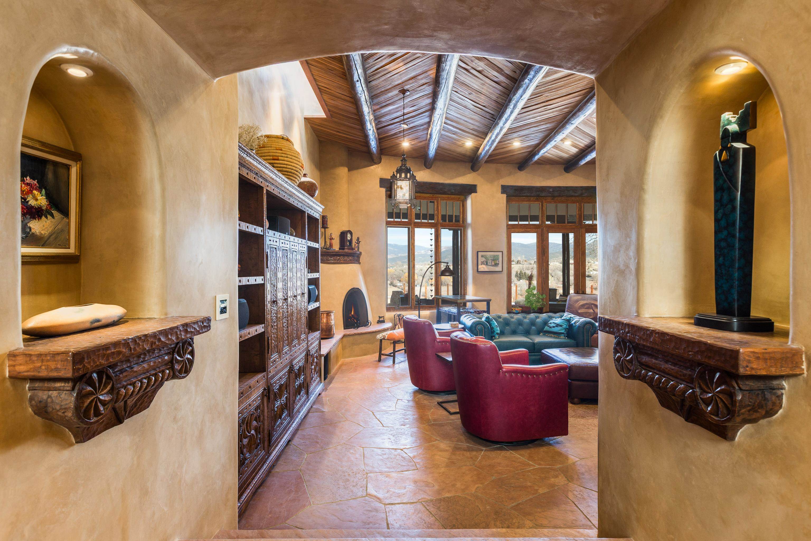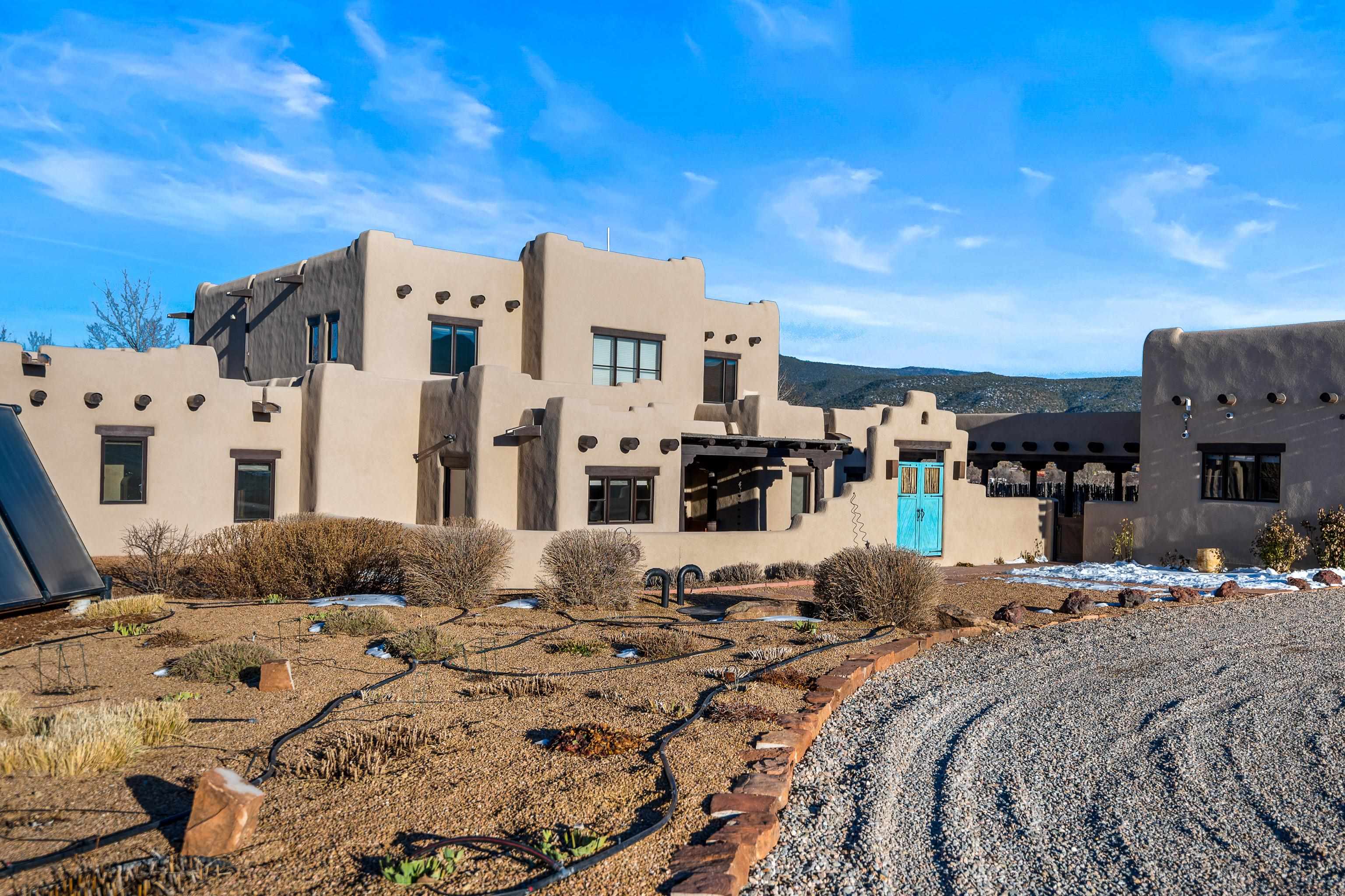 Hacienda de Suenos is a luxury Taos estate and custom adobe-style residence showcasing classic Southwestern architecture, 4 bedrooms, 3 full baths, and 2 half baths, offering approximately 5,995 square feet of living space on 2.05 fully fenced acres in Ranchos de Taos overlooking the Talpa Valley. The property captures expansive views of Taos Mountain, El Salto, and the lush Talpa Valley while maintaining privacy, security, and convenient access to town amenities. A hand-carved front door opens to a grand entry with soaring ceilings, vigas, abundant natural light, and interiors designed to honor traditional New Mexican craftsmanship. The home includes four well positioned bedrooms, including two primary suites with private outdoor seating areas and mountain views. Bathrooms feature hand-painted cabinetry and colorful tile reflecting artisan detail and regional character. The kitchen and pantry are designed for both daily living and entertaining, featuring premium appliances, generous workspace, and easy flow to adjacent living areas. An elegant dining room with banco seating and hand-carved wood details provides a distinctive setting for intimate dinners and larger gatherings. A comfortable family room with a daybed connects seamlessly to the main living areas. Three fireplaces, two wood-burning and one gas, provide warmth, architectural interest, and year-round comfort. Designed for the Taos lifestyle, the property emphasizes seamless indoor-outdoor living. Exterior features include an outdoor kitchen, multiple covered and open seating areas, and a hot tub positioned to enjoy open skies, valley views, and evening sunsets. Established perennial and vegetable gardens, mature fruit trees, and thoughtfully landscaped grounds enhance the sense of a private valley retreat. Infrastructure reflects long-term planning and energy efficiency. The home incorporates passive and active solar design, radiant floor heating for consistent comfort throughout the colder months, and an extensive solar hot water heating system that maximizes efficiency and energy savings. A whole-home generator powered by natural gas provides uninterrupted electrical service during outages. A security system and private gated entrances further support privacy and peace of mind. The 2.05-acre parcel provides open space, panoramic views, and access to the road below for quiet walks. Water rights to the Acequia del Finado Francisco Martinez convey with the property, an increasingly valuable asset in Northern New Mexico. Additional acreage is available separately and includes approximately 4.35 acres of pasture, a round pen, and barns with water and electricity, along with water rights to two additional acequias. This offering supports equestrian use and provides expanded flexibility for buyers seeking a Taos equestrian property or extended estate configuration. Hacienda de Suenos combines authentic Southwestern architectural detail, custom craftsmanship, solar infrastructure, water rights, privacy, security, and optional equestrian expansion in a desirable Ranchos de Taos setting overlooking the lush Talpa Valley, minutes from Taos Plaza, the Taos Country Club Golf Course, and Taos Ski Valley.