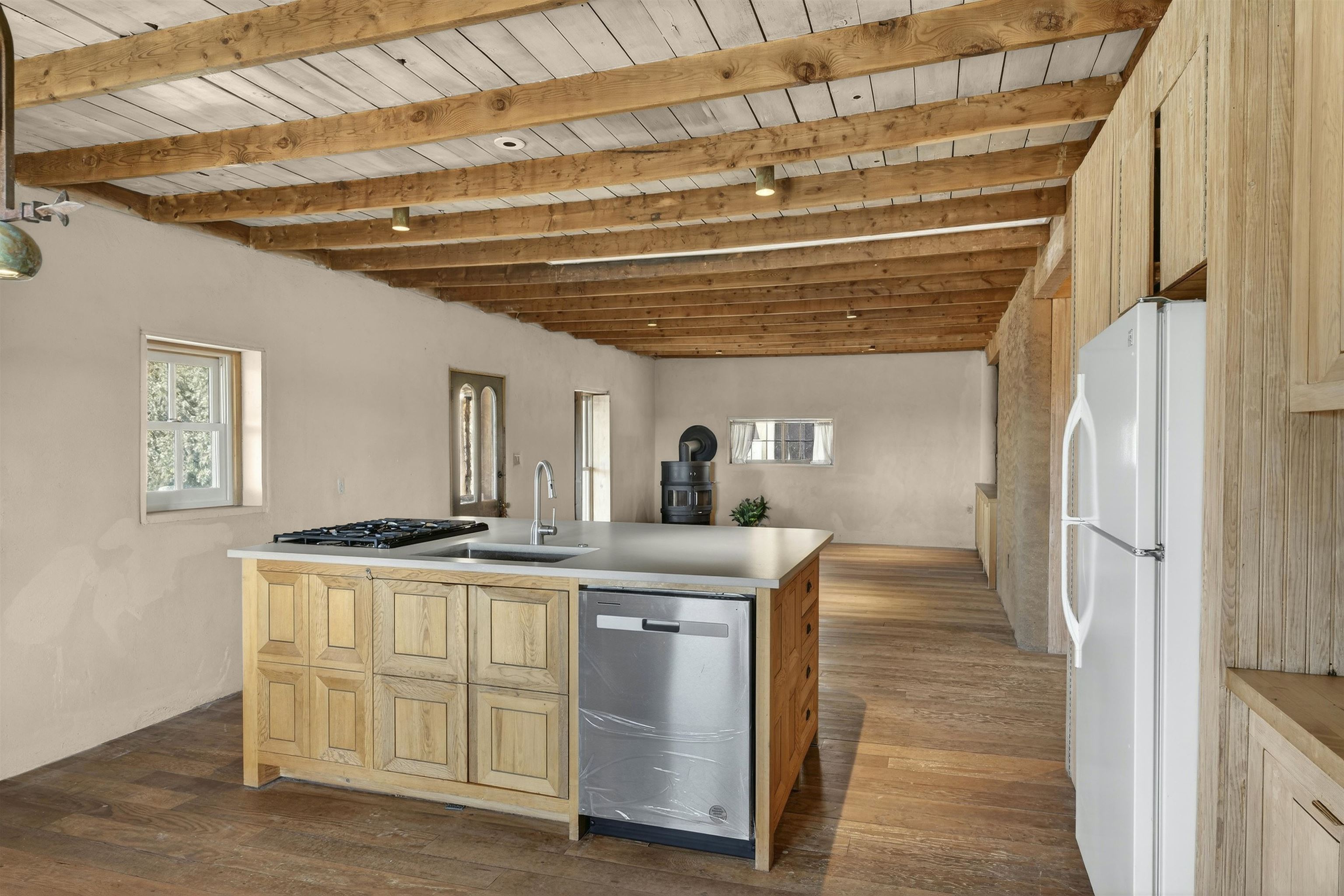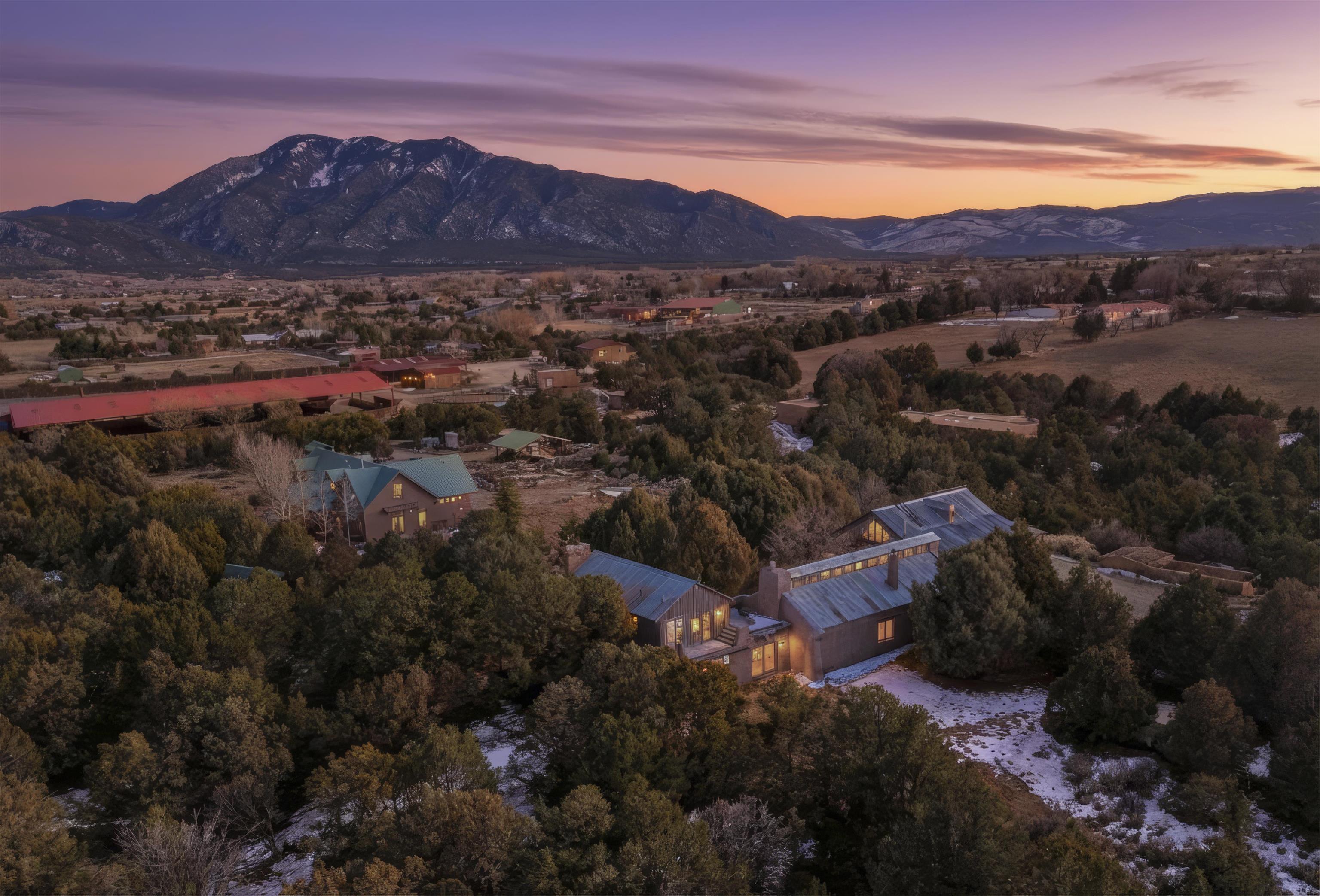 Tucked into the foothills of Arroyo Seco, this distinctive residential compound offers privacy, character, and classic Northern New Mexico charm. Set on approximately 1.5 acres at the end of a quiet road, the property includes a two-story main residence, a separate guest house, and a traditional root cellar, all surrounded by mature trees, native landscaping, and sweeping mountain views. The main 2-story home features 2 bedrooms and 2 bathrooms, with an open, light-filled floor plan showcasing soaring ceilings, custom built-ins, multiple fireplaces, and radiant in-floor heating throughout. A well-appointed cook’s kitchen flows seamlessly into the living and dining areas, creating an inviting space for both everyday living and entertaining. The guest house offers 2 bedrooms and 1.5 bathrooms, with generously sized rooms, a wood-burning stove, and forced-air heating—ideal for guests, extended living, or flexible use. Outdoors, the property unfolds into a serene landscape with natural wildflowers, established trees, and peaceful outdoor spaces, all framed by the Sangre de Cristo Mountains. A rare opportunity to own a one-of-a-kind property with multiple dwellings, privacy, and authentic New Mexico appeal—just minutes from Arroyo Seco and Taos.