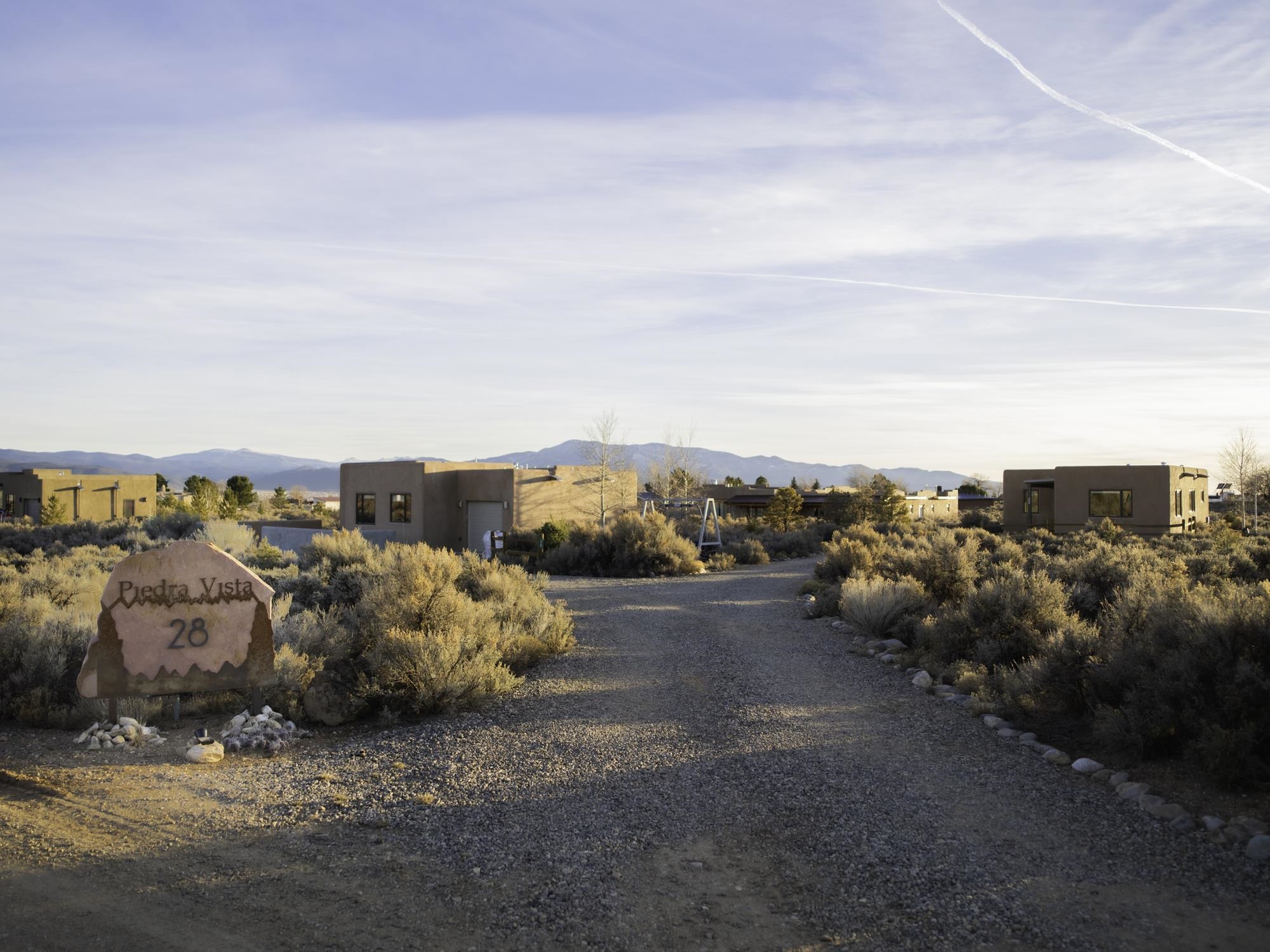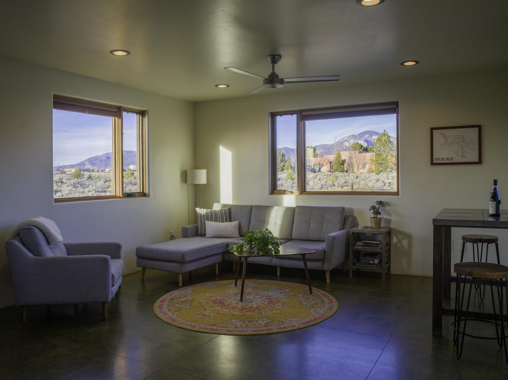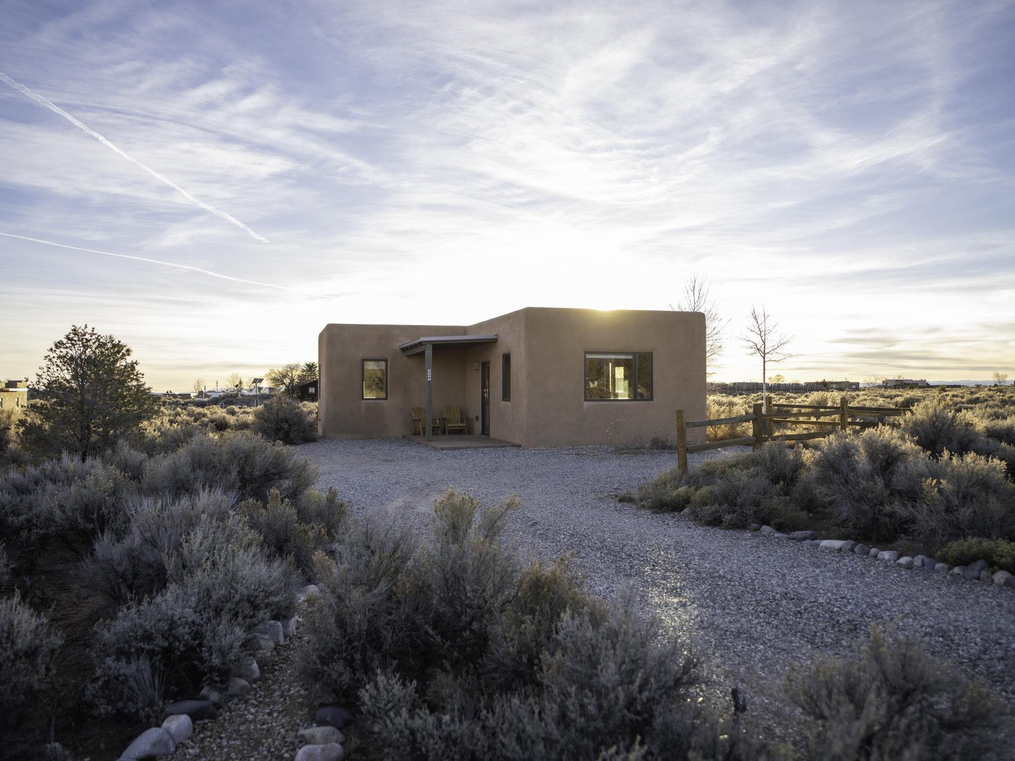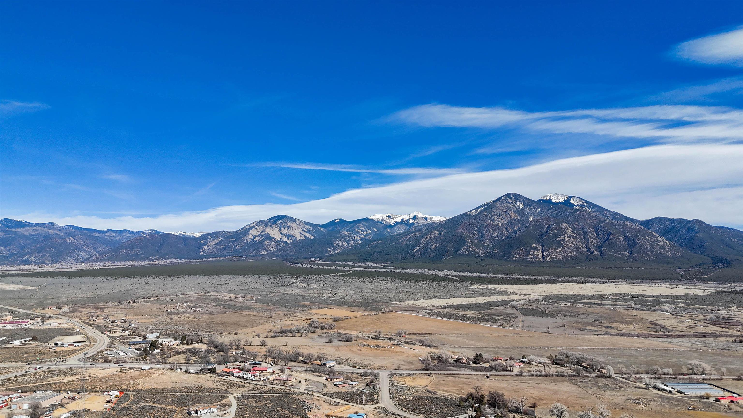 Framed by unobstructed views of Taos Mountain and set in one of El Prado’s most desirable locations, this 2018-built residence reflects a thoughtful, modern approach to high-desert living. The architecture is clean and restrained, allowing light, proportion, and landscape to take the lead. Just 10 minutes from the Plaza in Taos and 20 minutes from Taos Ski Valley, the setting offers both quiet and connection, perfect for supporting a range of living and income possibilities. The 1,748 sq ft main home features 2 bedrooms and 2 baths beneath soaring ceilings, with radiant-heated concrete floors grounding the interiors in warmth and subtle texture. Open living spaces are intentionally oriented toward the mountain, creating a seamless dialogue with the indoors. Finishes are contemporary and refined, with an emphasis on clean lines, natural light, and livable simplicity. An attached heated garage integrates convenience without interrupting the home’s aesthetic clarity. A completely separate 740 sq ft guest house — 1 bedroom, 1 bath — mirrors the same design sensibility. Bright, efficient, and beautifully proportioned, perfect for a private retreat, studio, or income-producing space with a strong short-term rental history available for review. Well-sited on its acre, modern in execution, and quietly architectural in presence, this is a home where design and landscape are in balance.